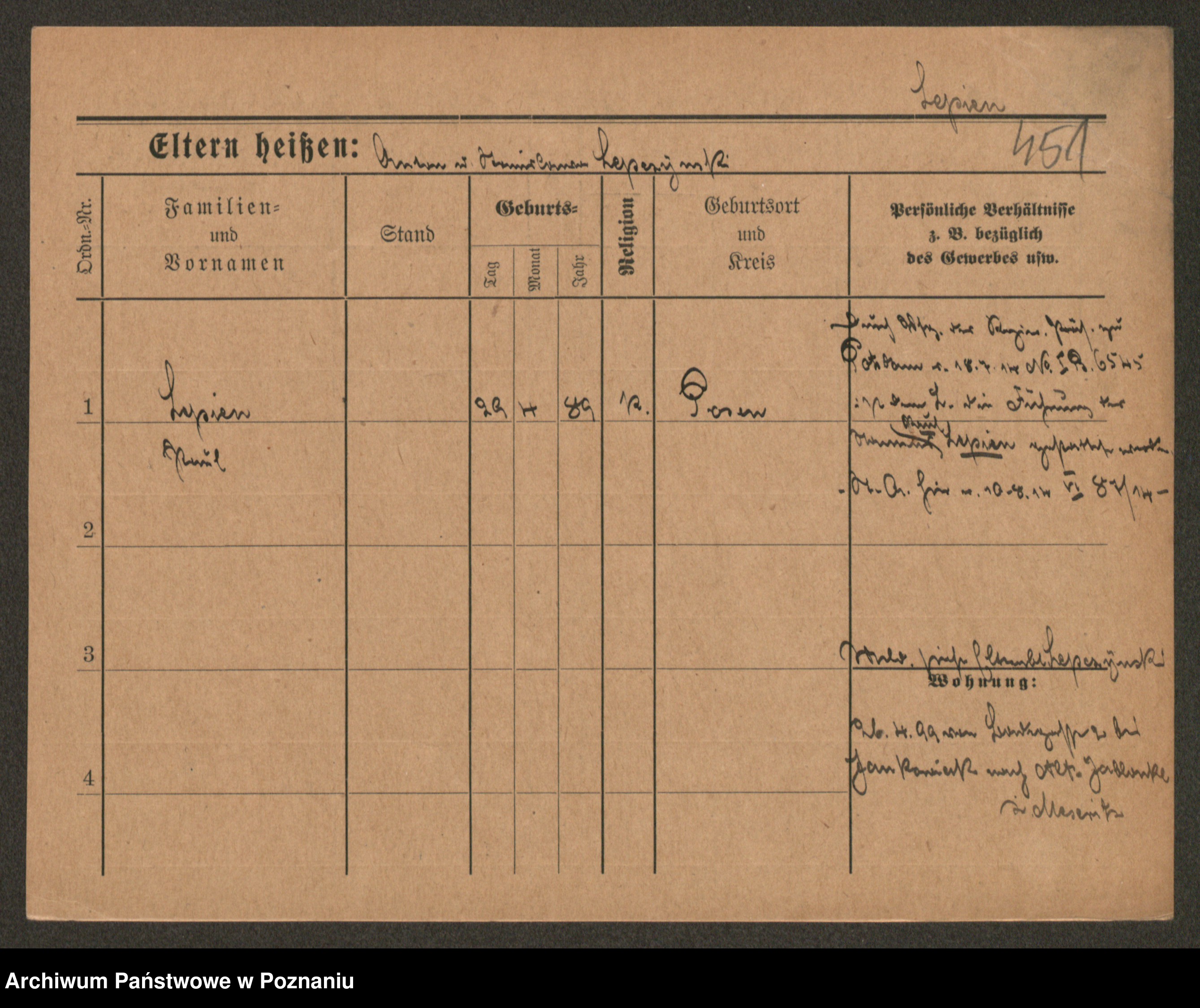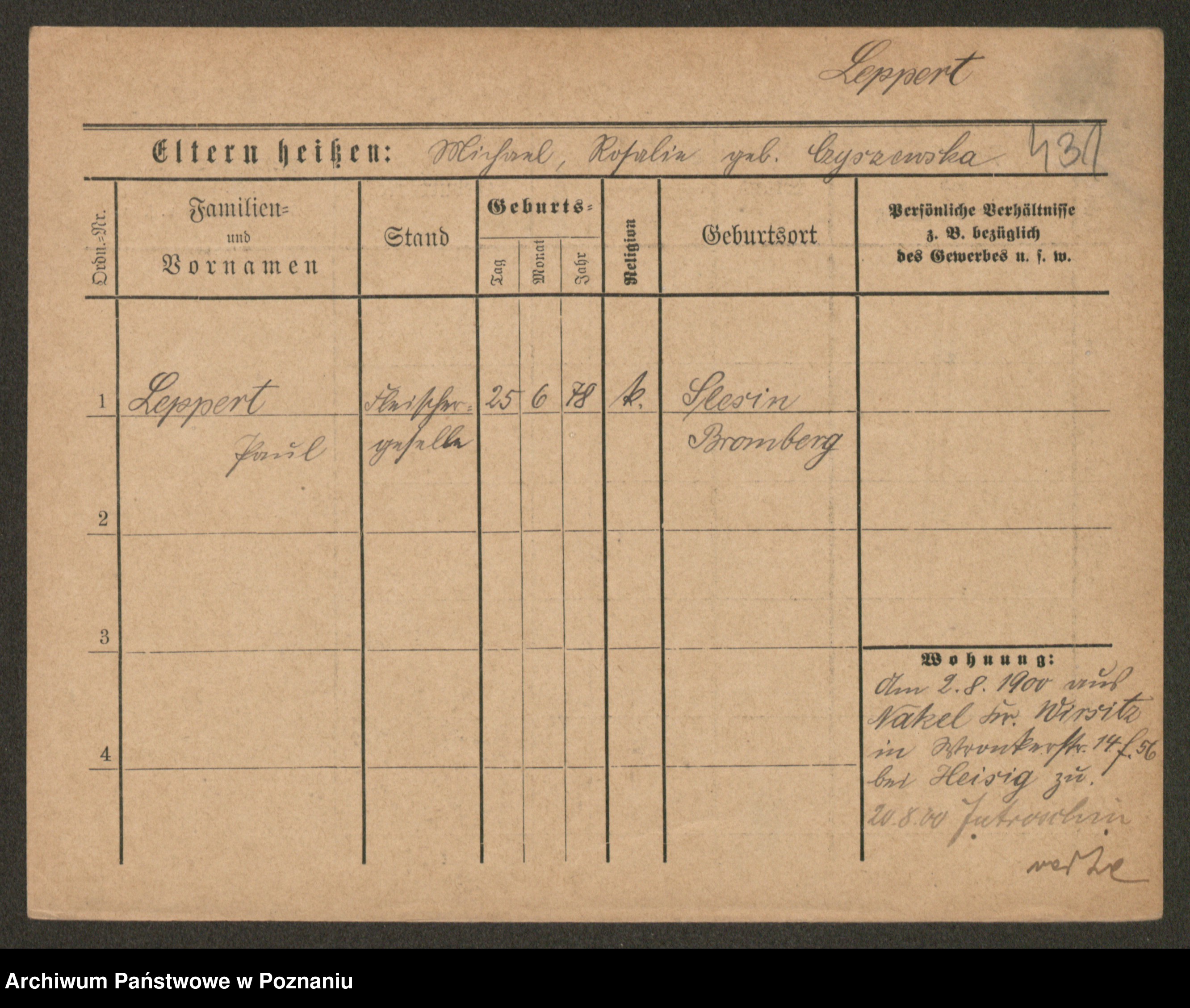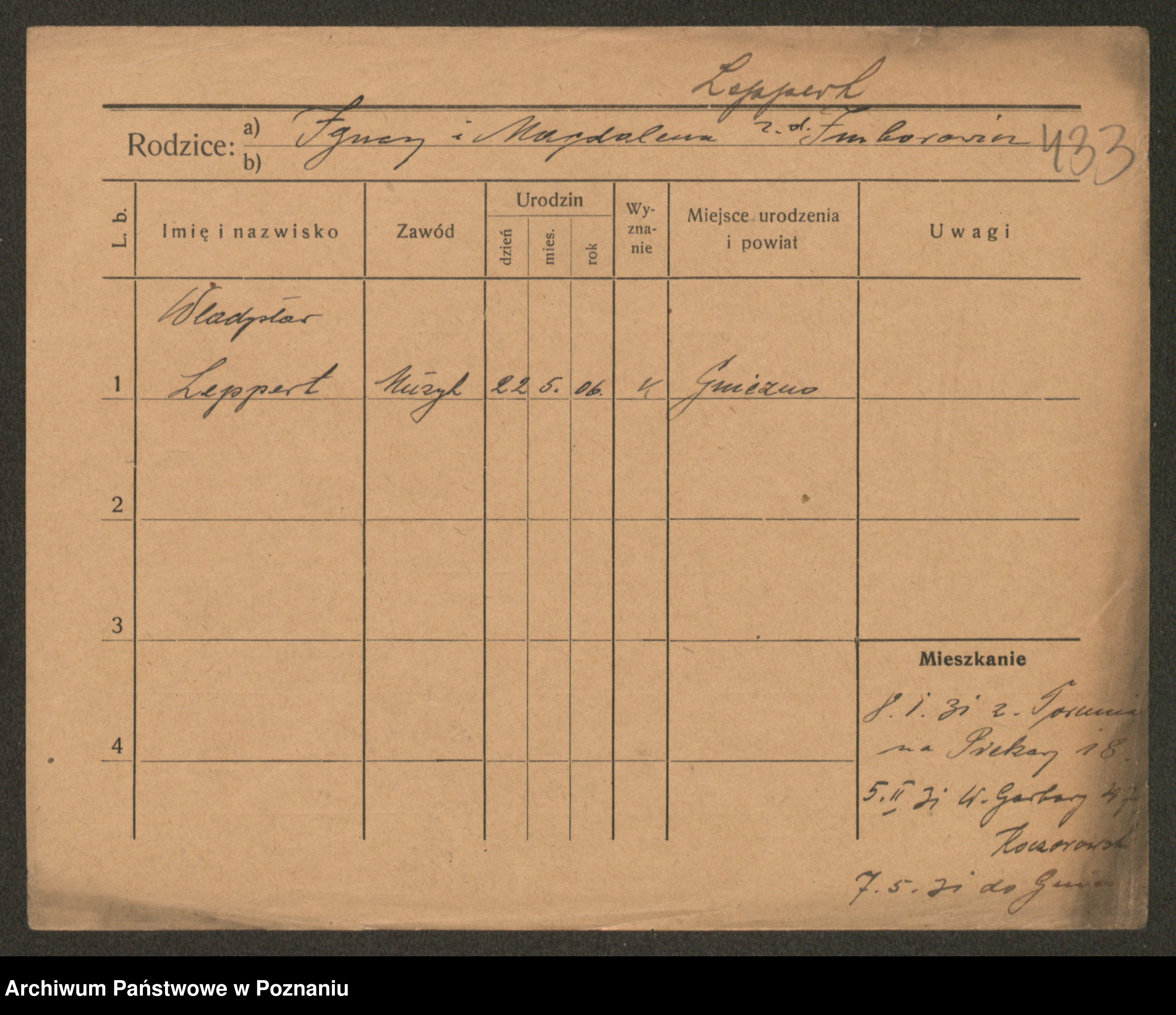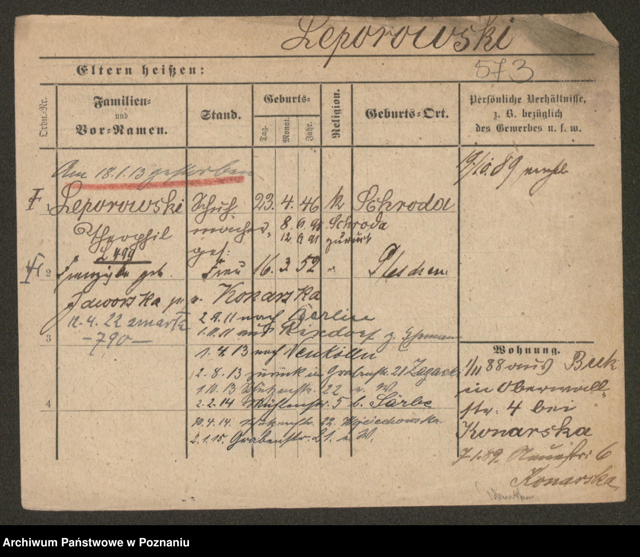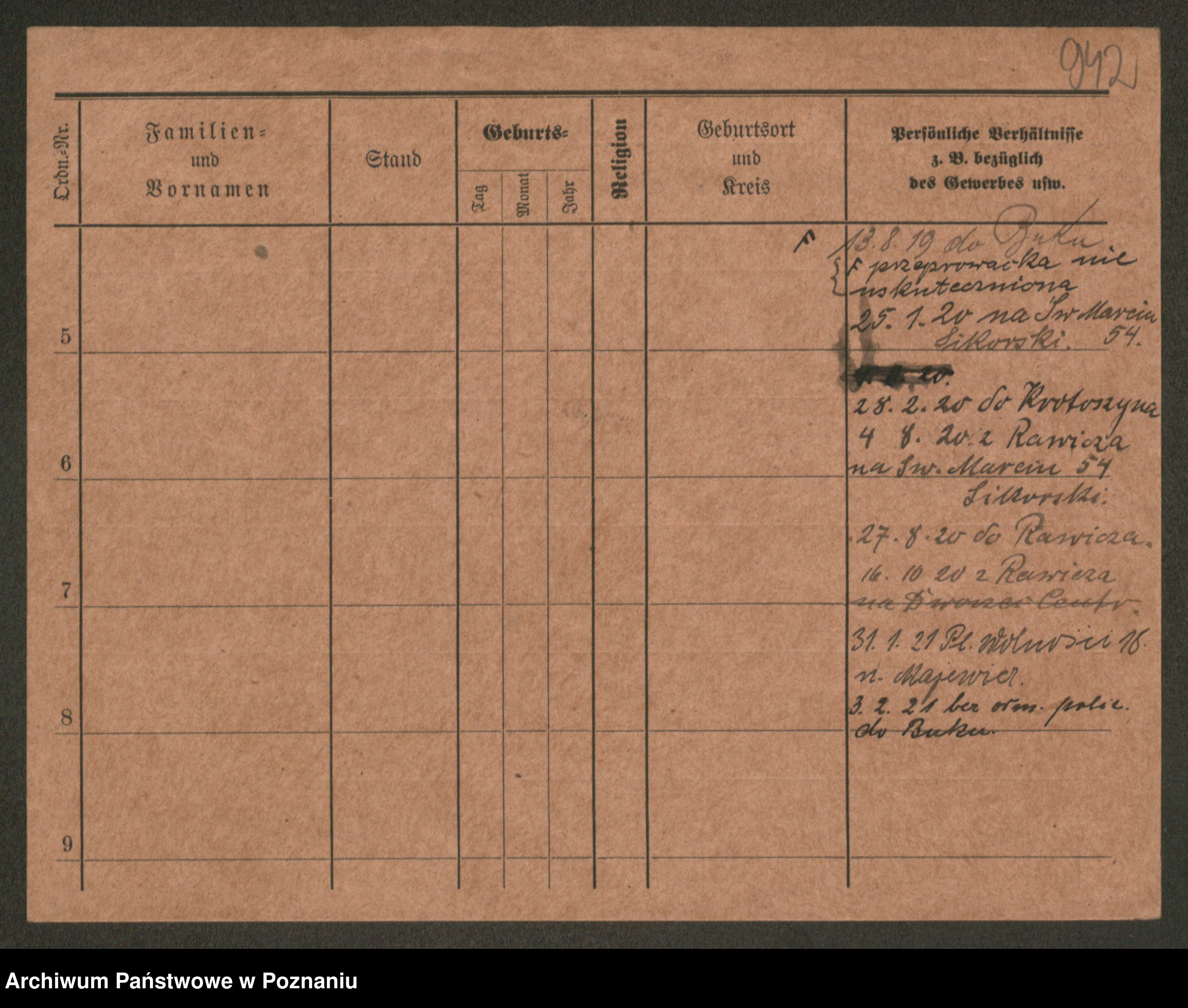 Podgląd karty osobowej dostępny jest po kliknięciu na nazwisko lub ikonkę karty. Można dokonywać powiększenia (ikony na górze) lub przechodzić między kolejnymi skanami (strzałki po bokach).