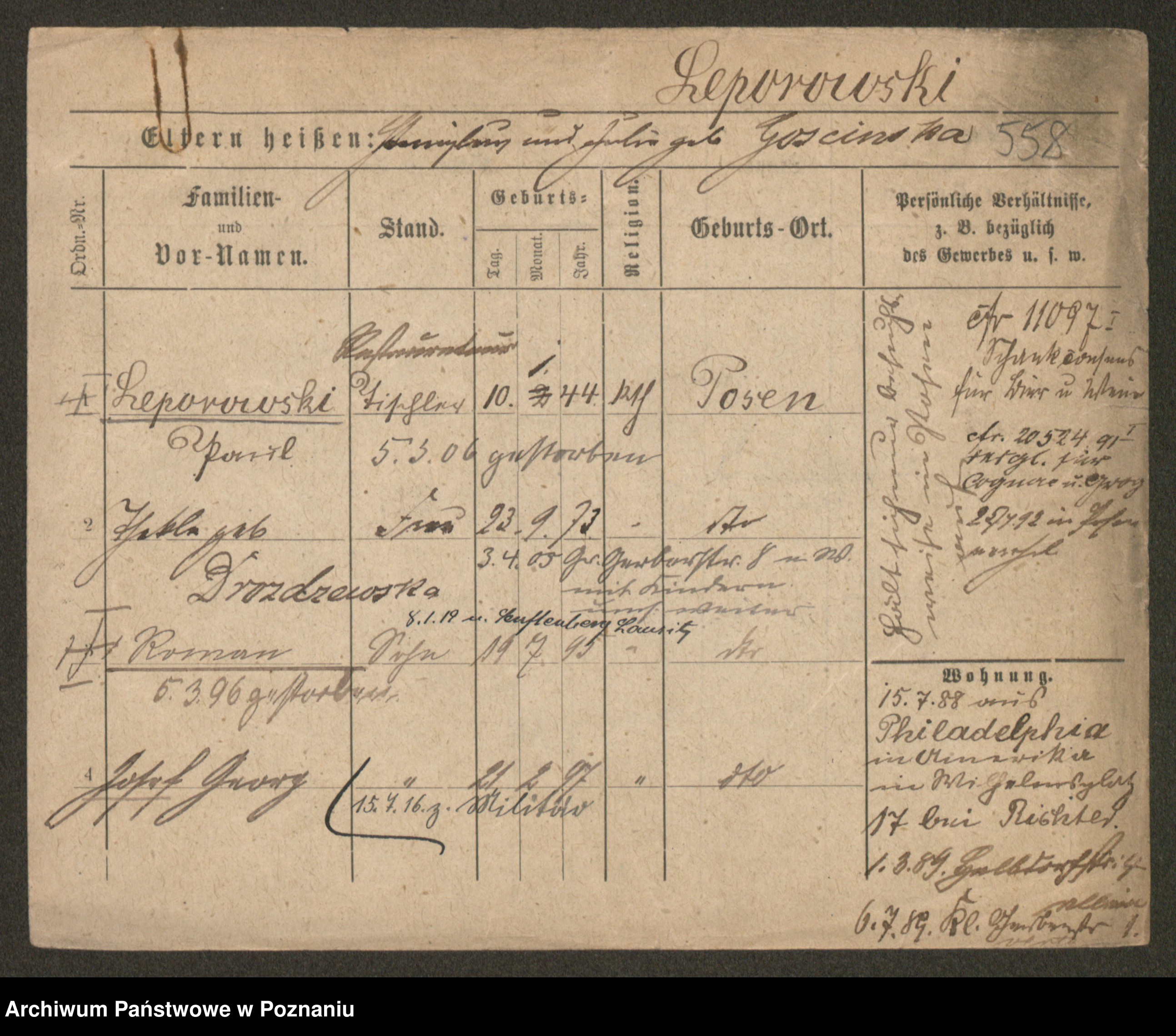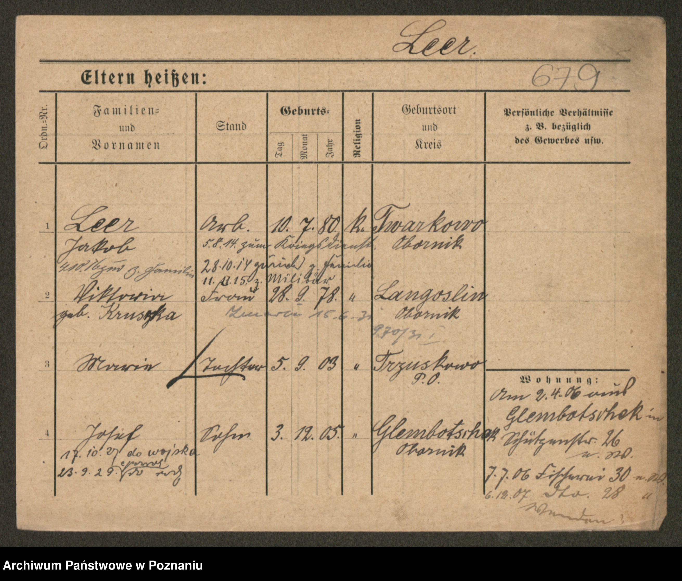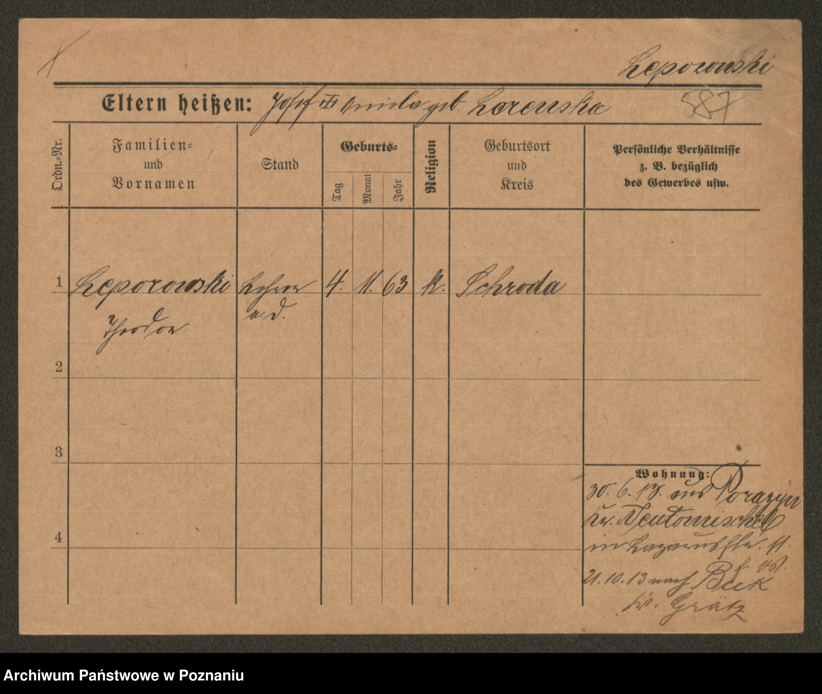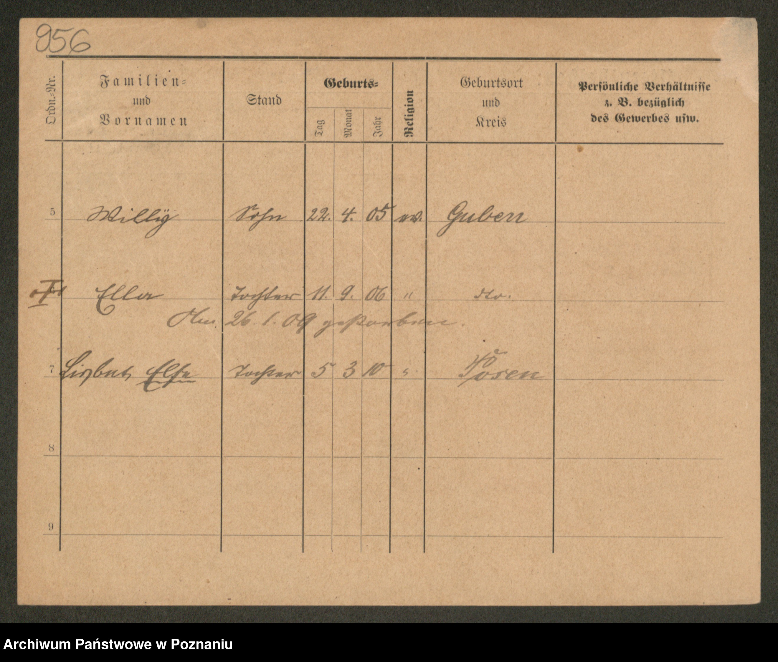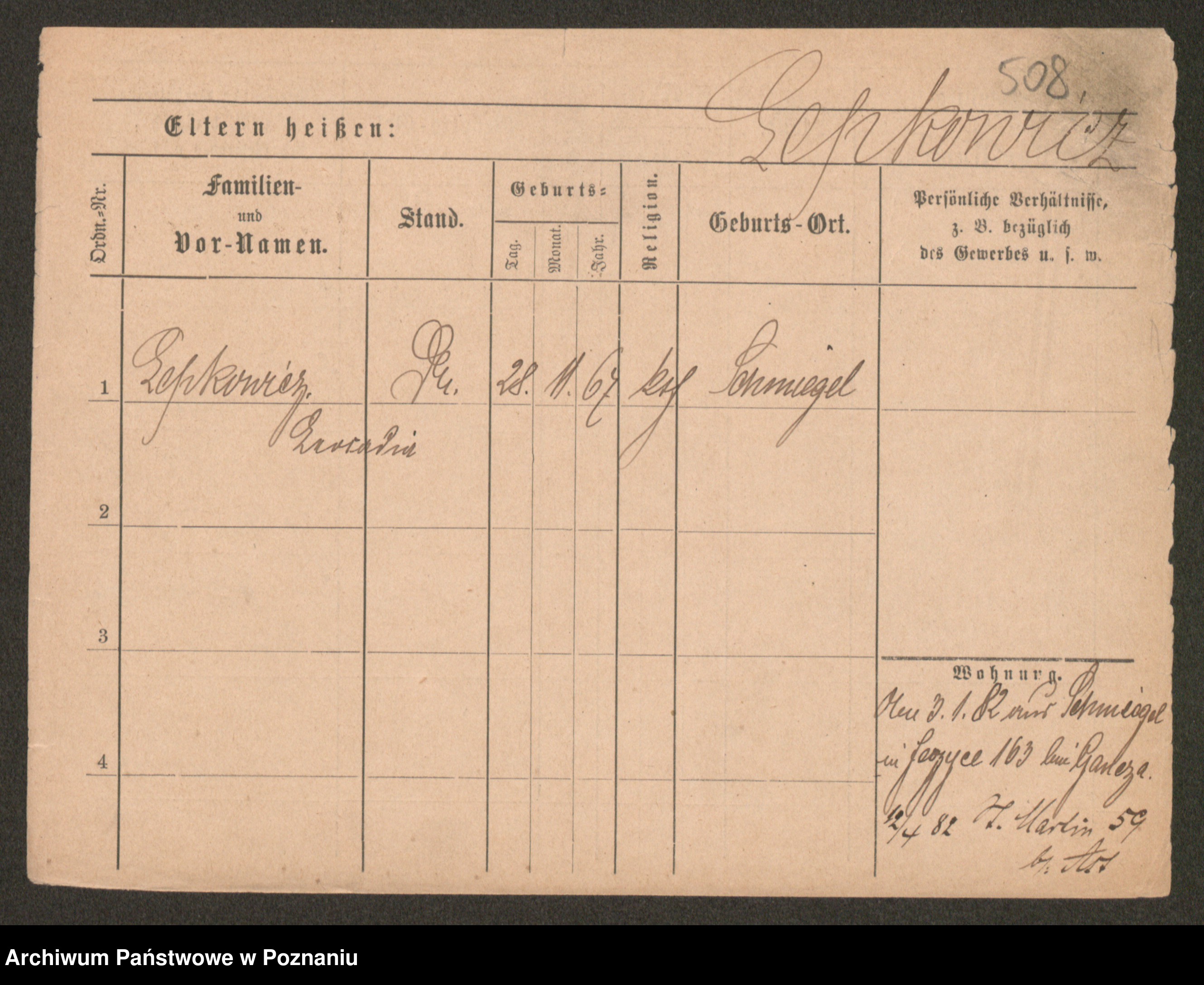 Podgląd karty osobowej dostępny jest po kliknięciu na nazwisko lub ikonkę karty. Można dokonywać powiększenia (ikony na górze) lub przechodzić między kolejnymi skanami (strzałki po bokach).