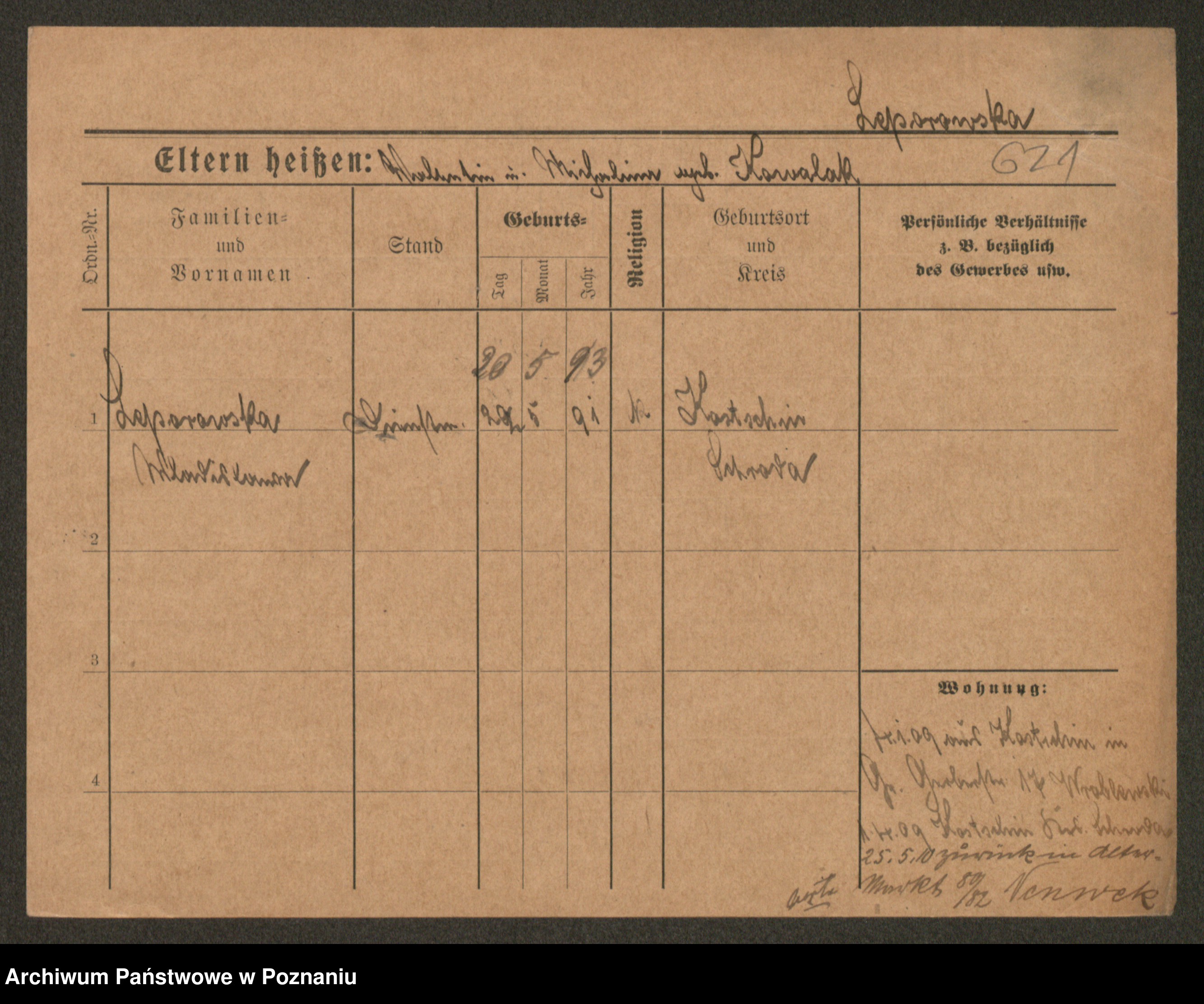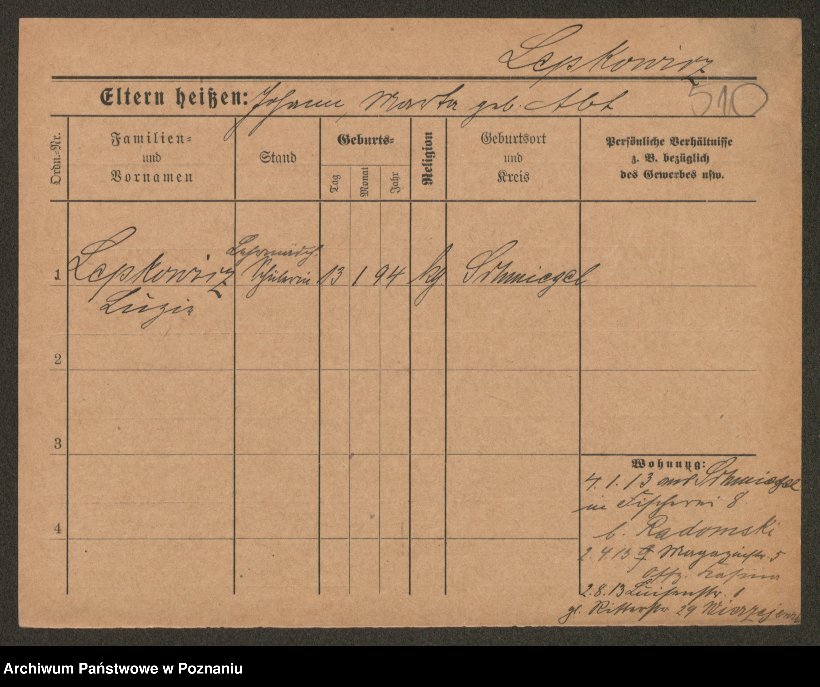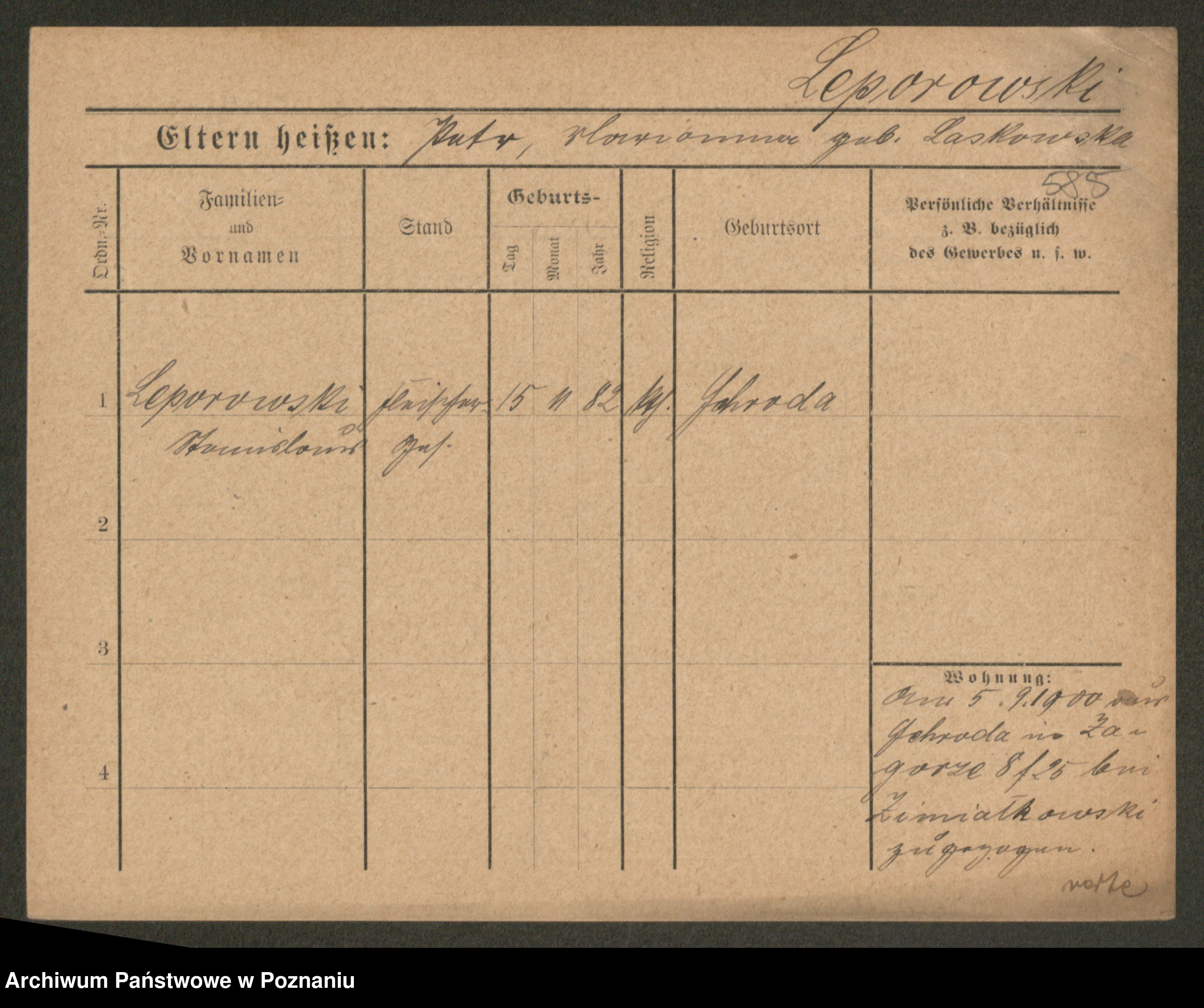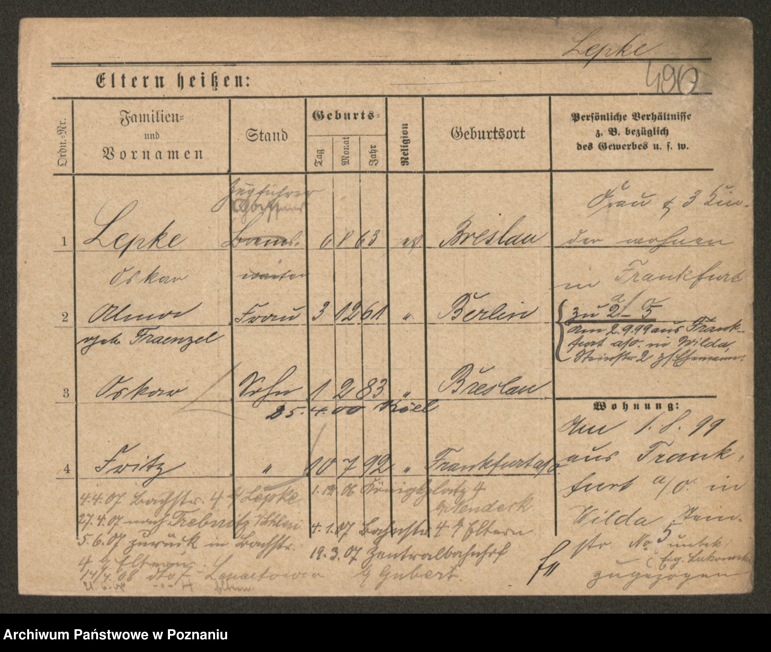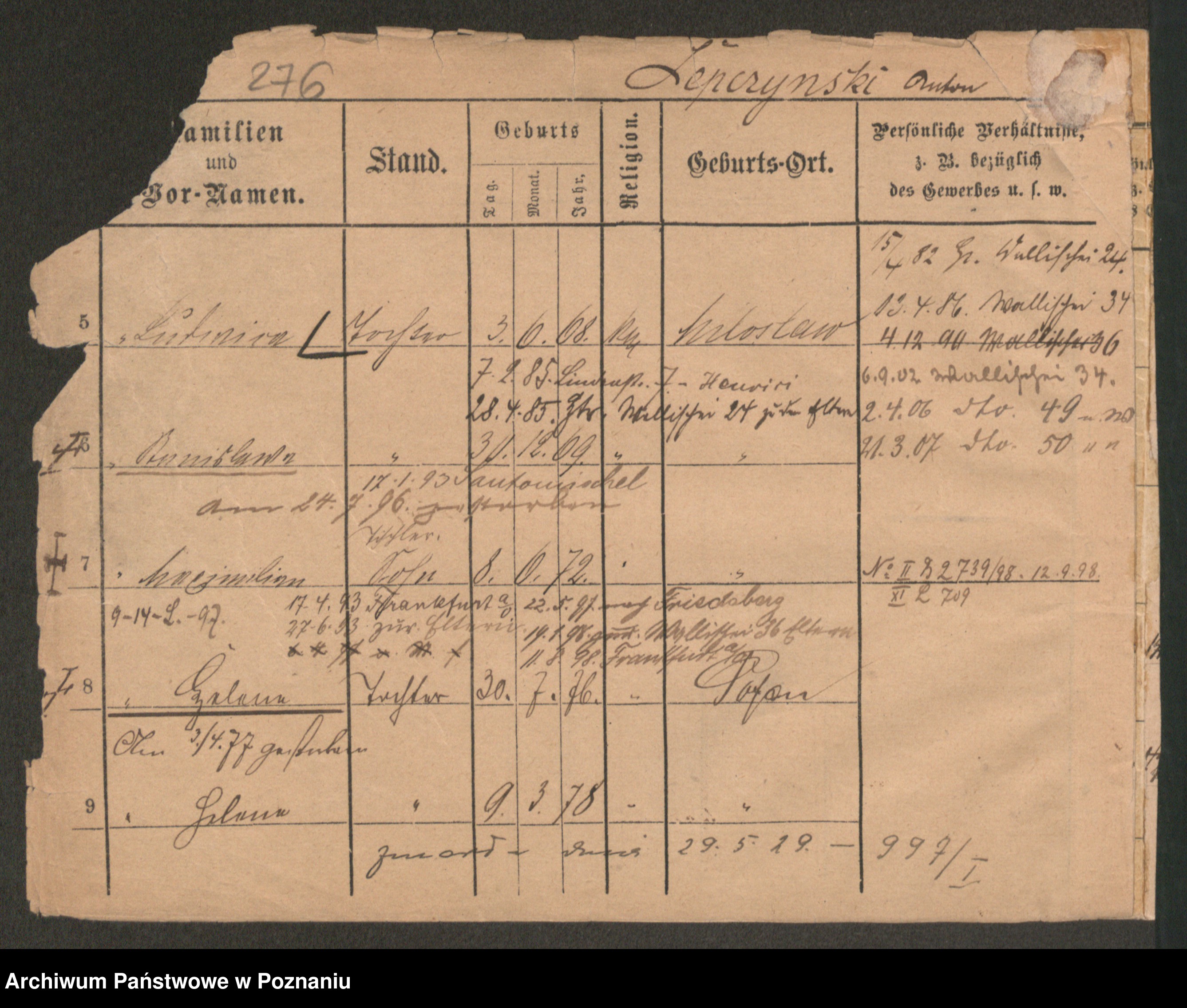 Podgląd karty osobowej dostępny jest po kliknięciu na nazwisko lub ikonkę karty. Można dokonywać powiększenia (ikony na górze) lub przechodzić między kolejnymi skanami (strzałki po bokach).