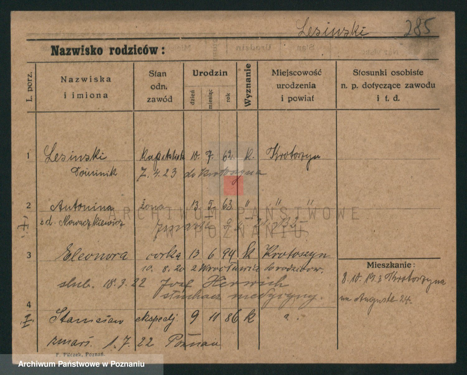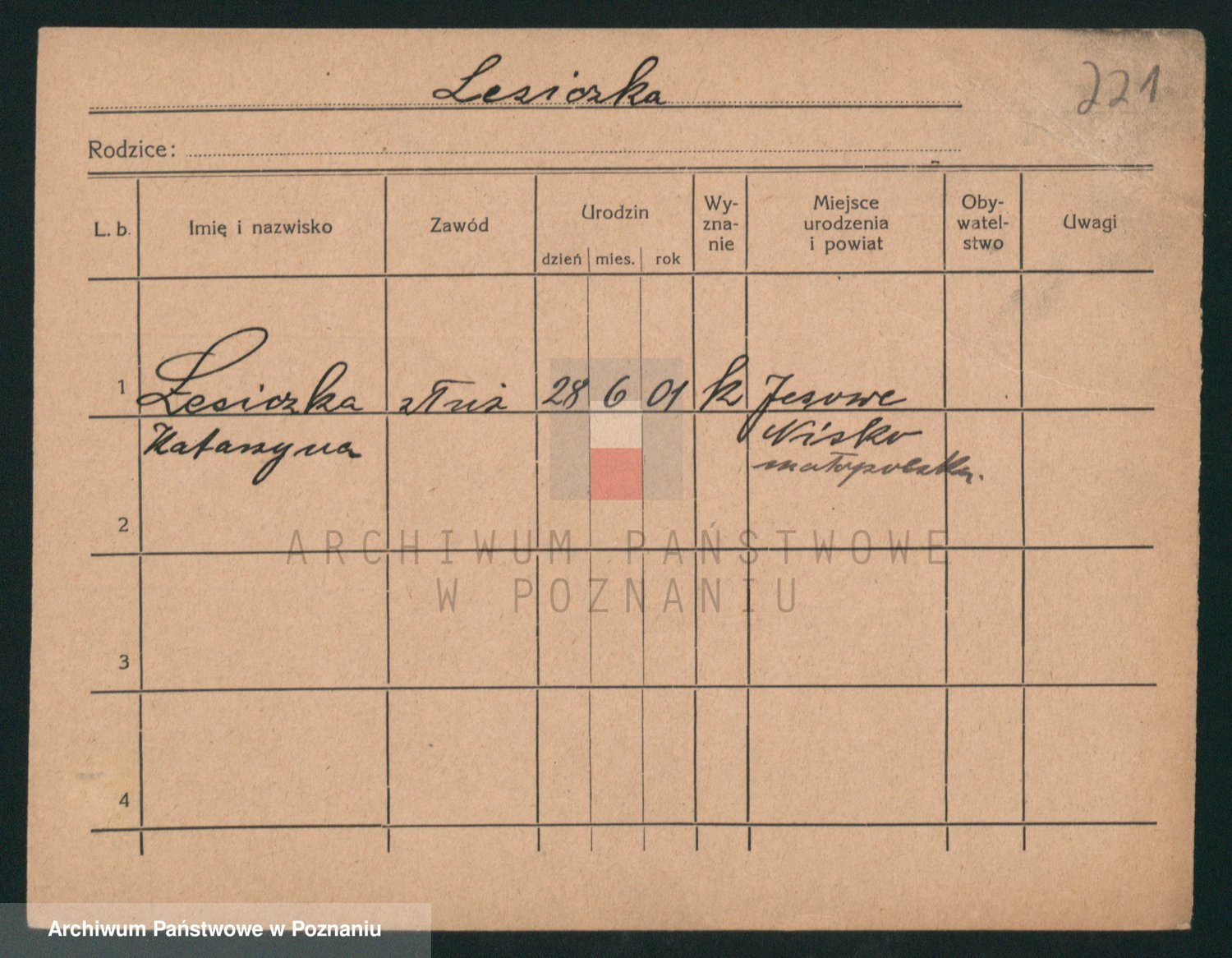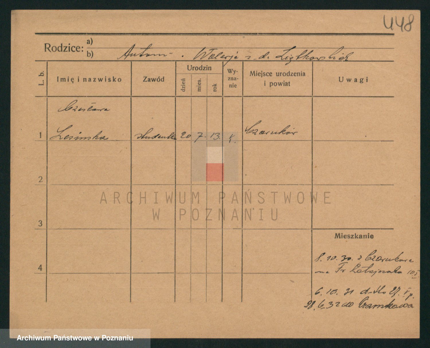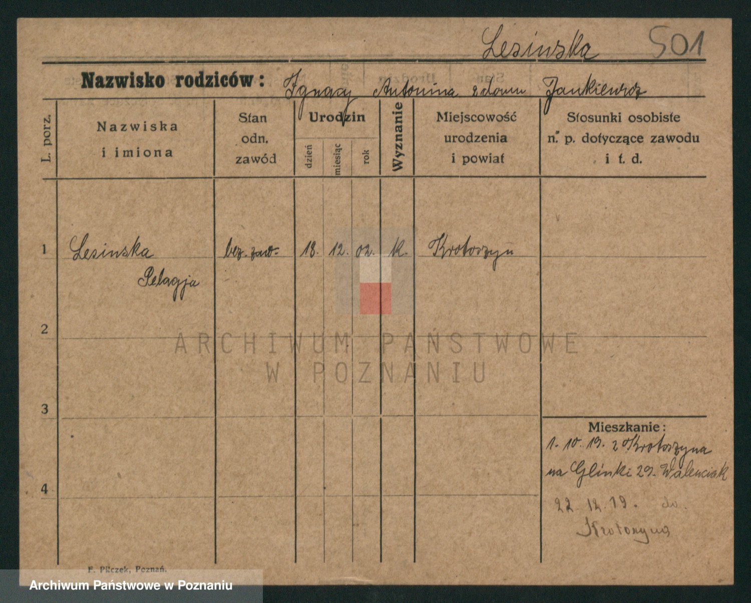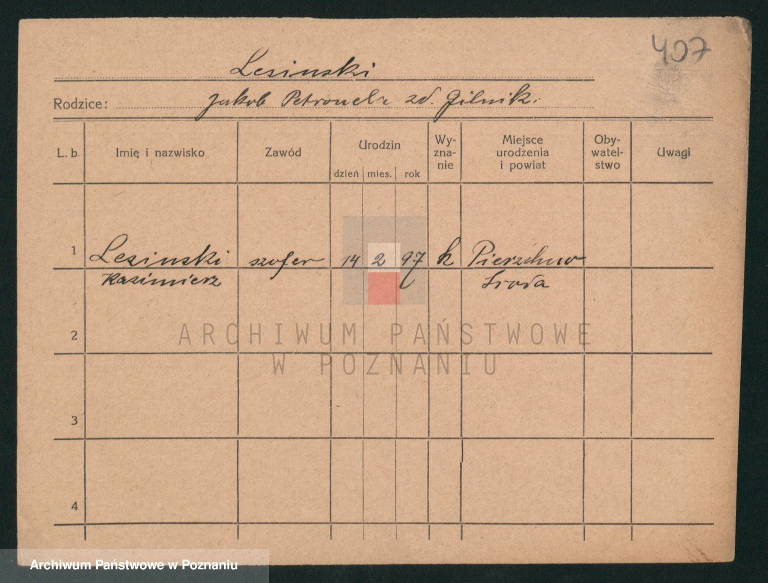 Podgląd karty osobowej dostępny jest po kliknięciu na nazwisko lub ikonkę karty. Można dokonywać powiększenia (ikony na górze) lub przechodzić między kolejnymi skanami (strzałki po bokach).