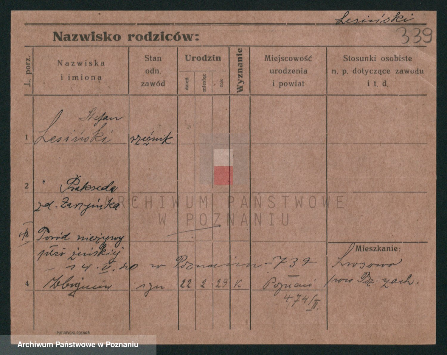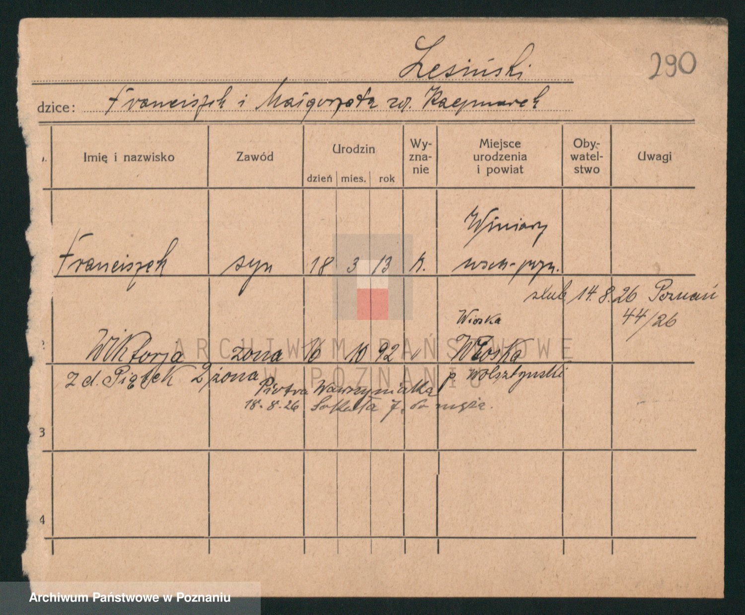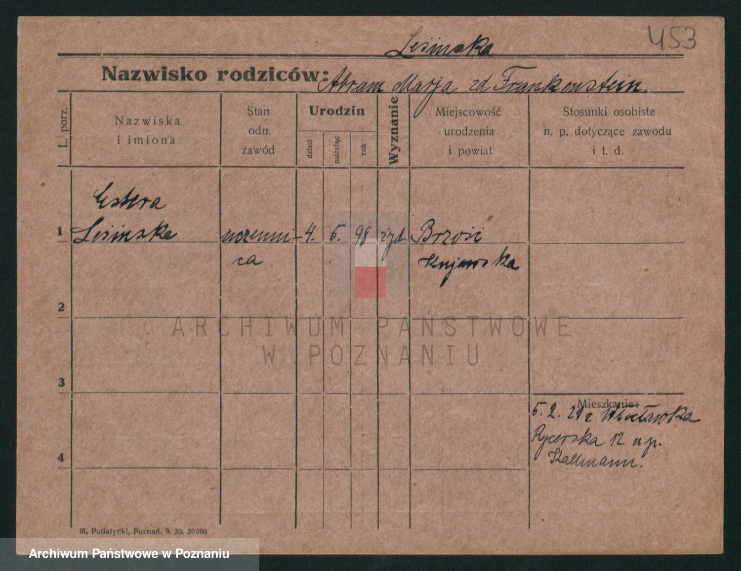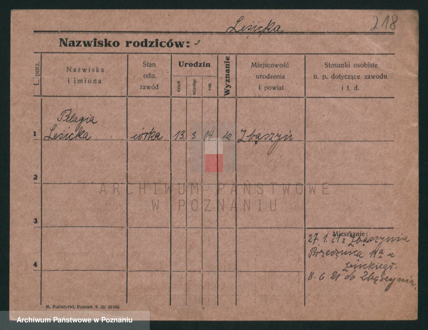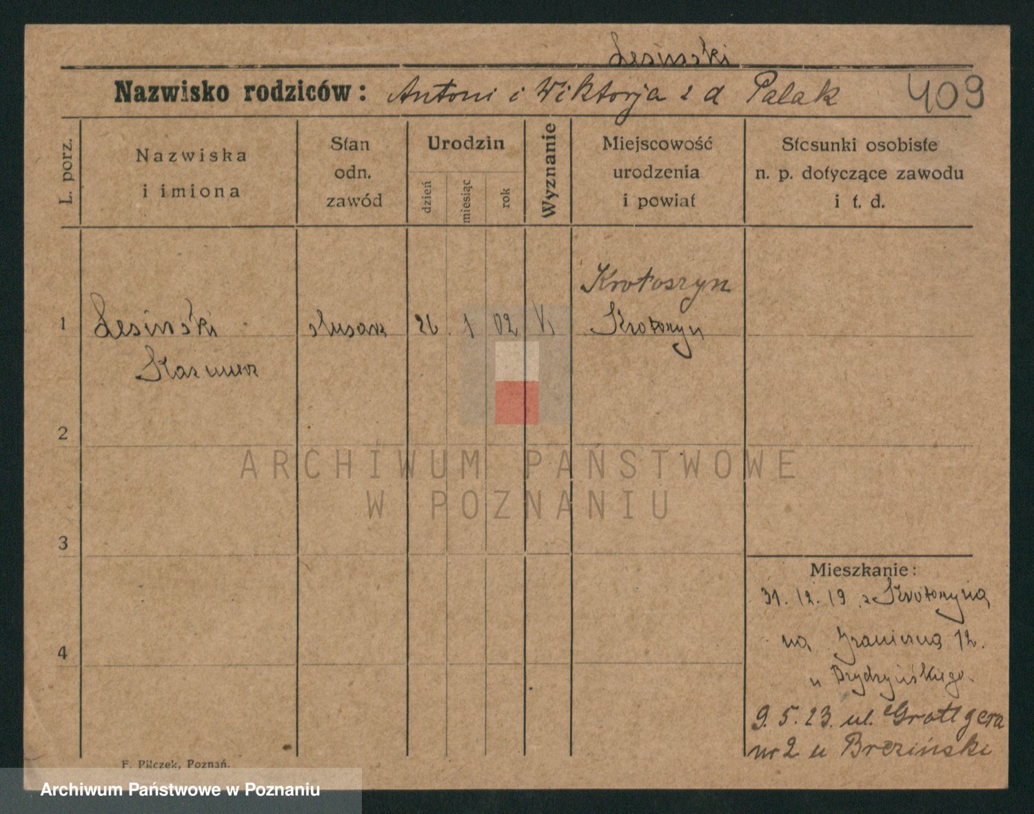 Podgląd karty osobowej dostępny jest po kliknięciu na nazwisko lub ikonkę karty. Można dokonywać powiększenia (ikony na górze) lub przechodzić między kolejnymi skanami (strzałki po bokach).