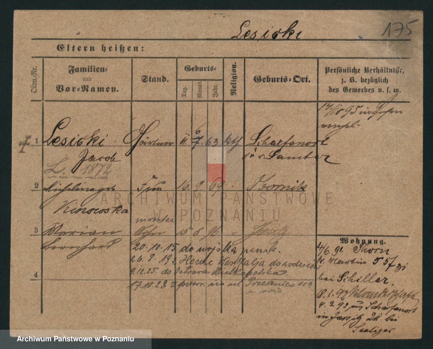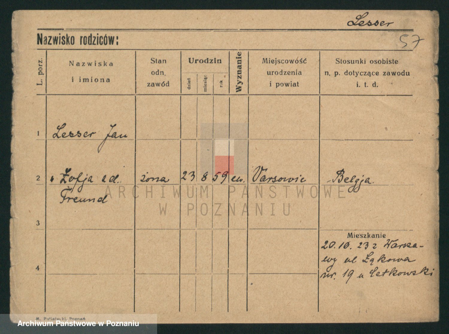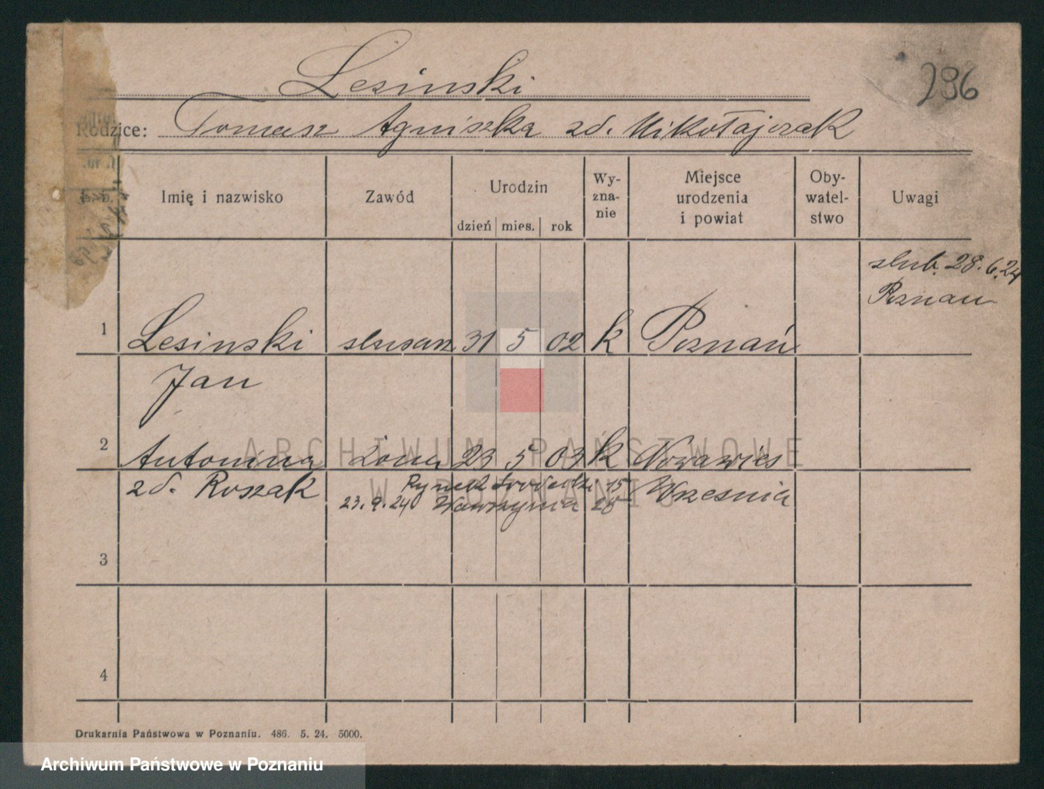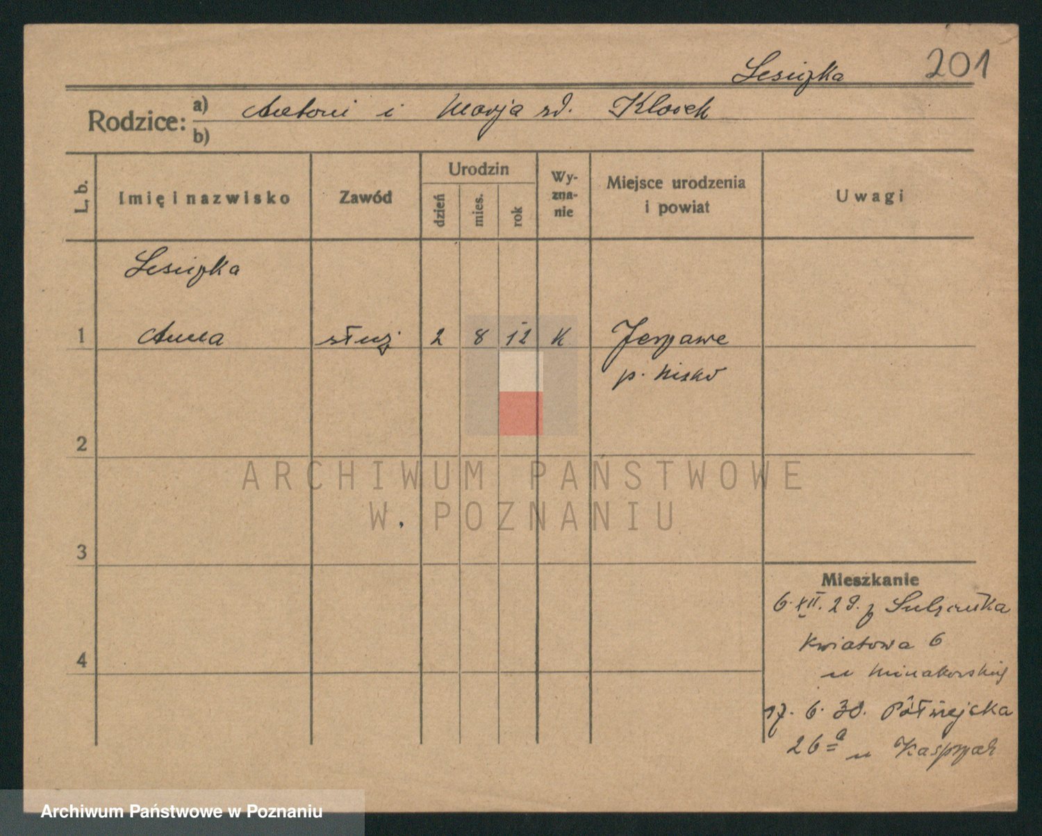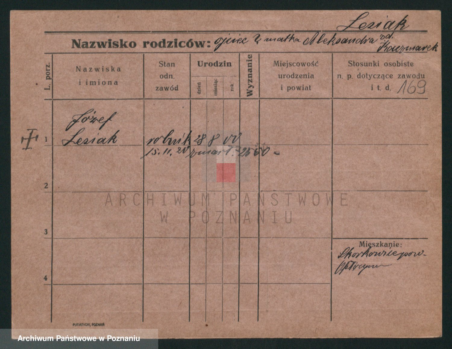 Podgląd karty osobowej dostępny jest po kliknięciu na nazwisko lub ikonkę karty. Można dokonywać powiększenia (ikony na górze) lub przechodzić między kolejnymi skanami (strzałki po bokach).