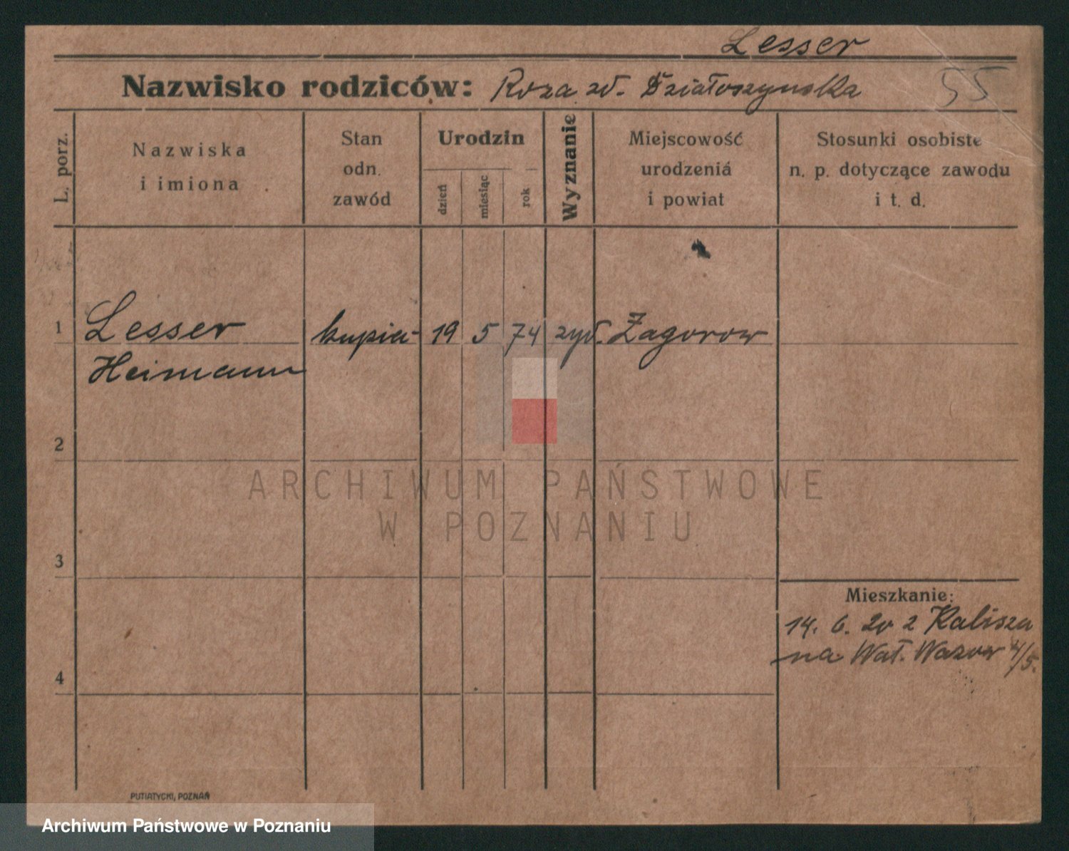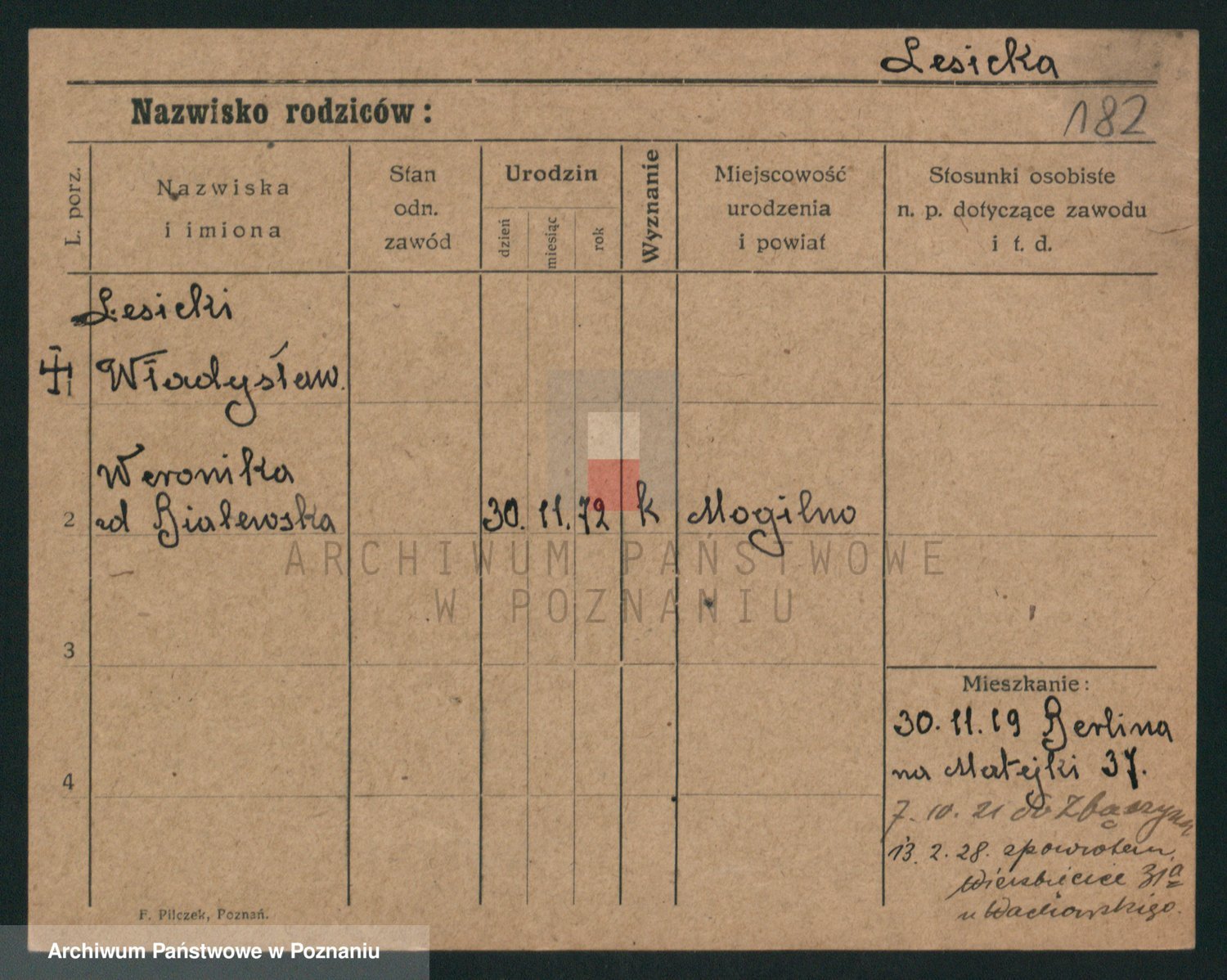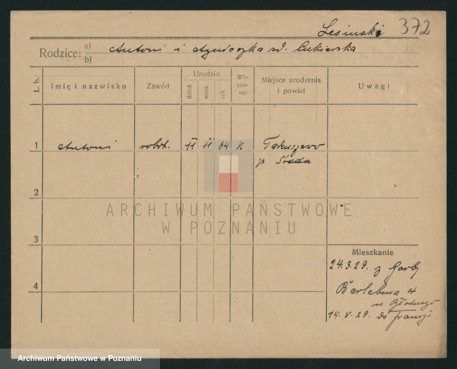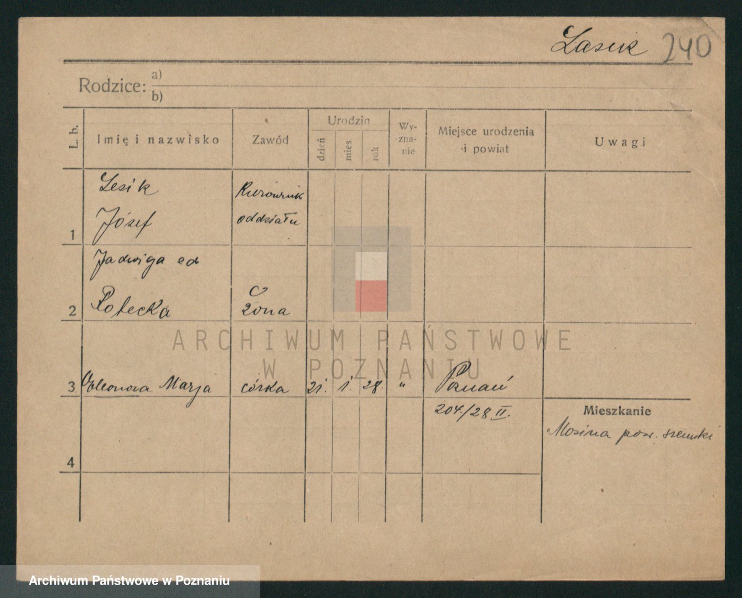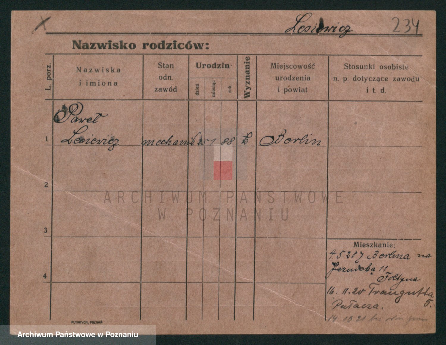 Podgląd karty osobowej dostępny jest po kliknięciu na nazwisko lub ikonkę karty. Można dokonywać powiększenia (ikony na górze) lub przechodzić między kolejnymi skanami (strzałki po bokach).