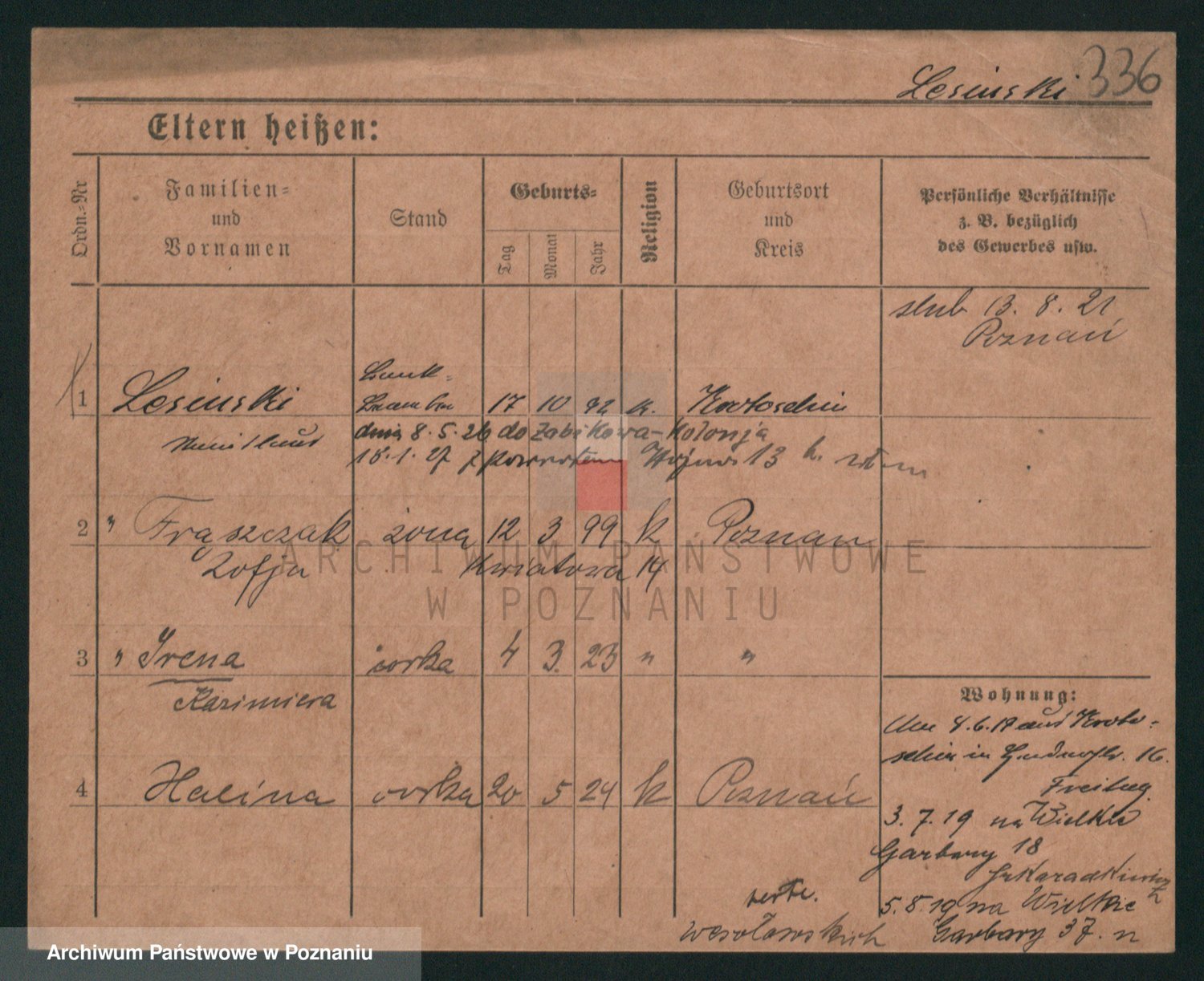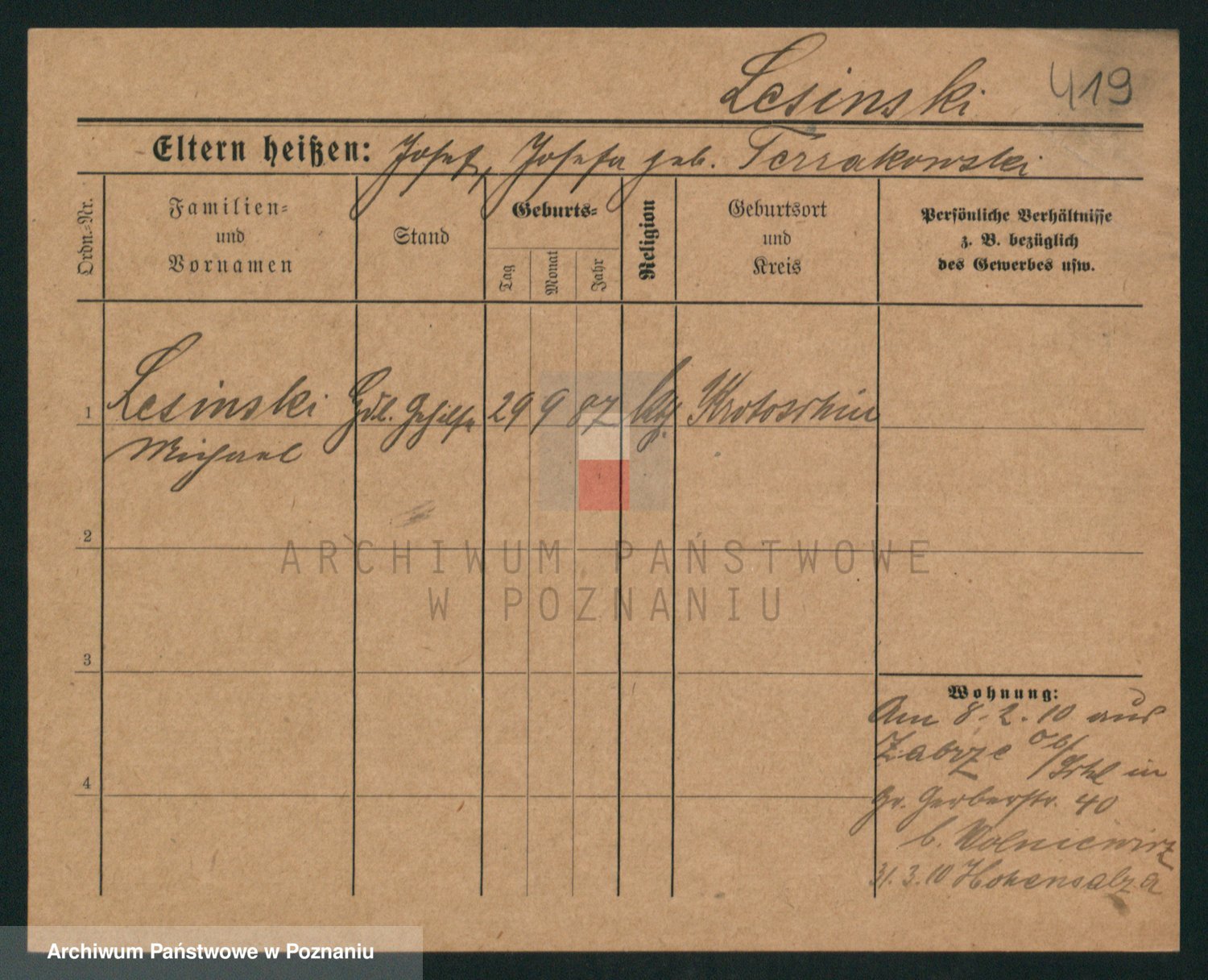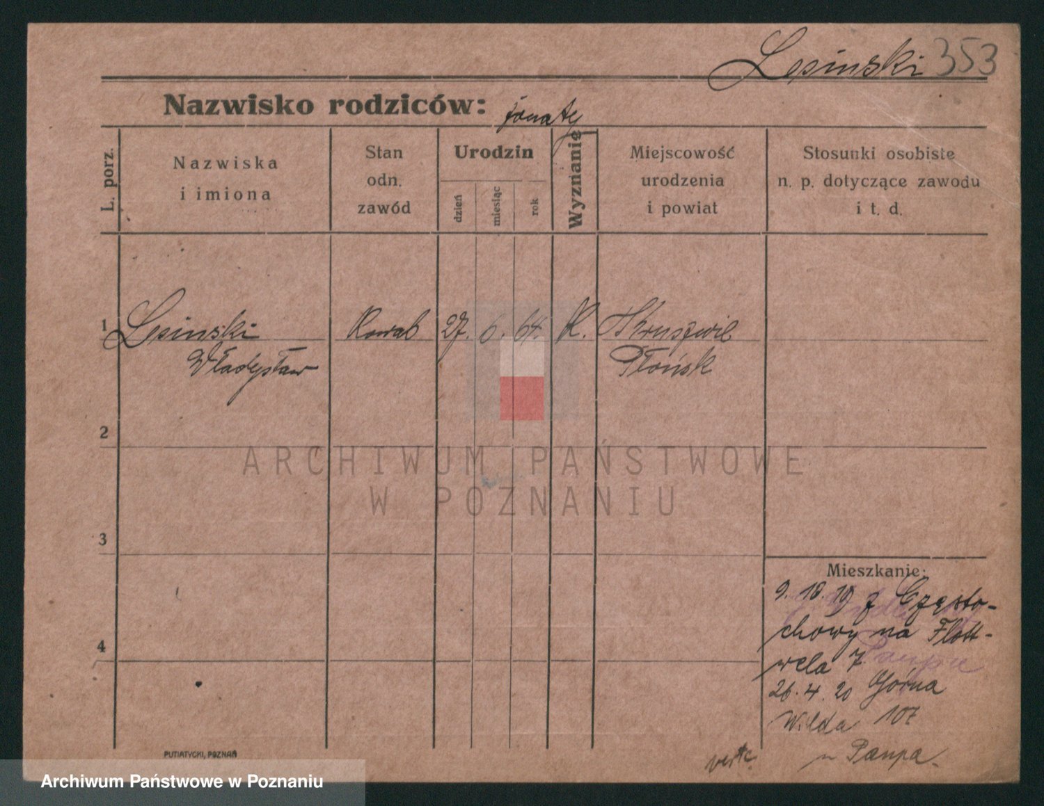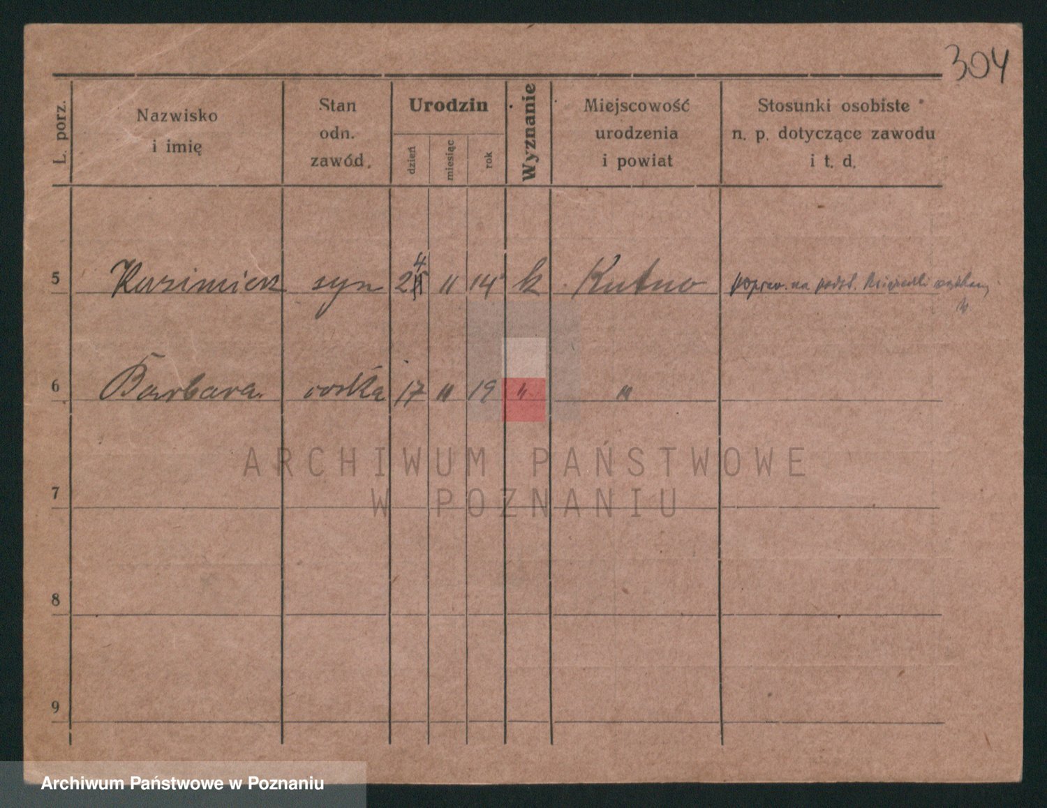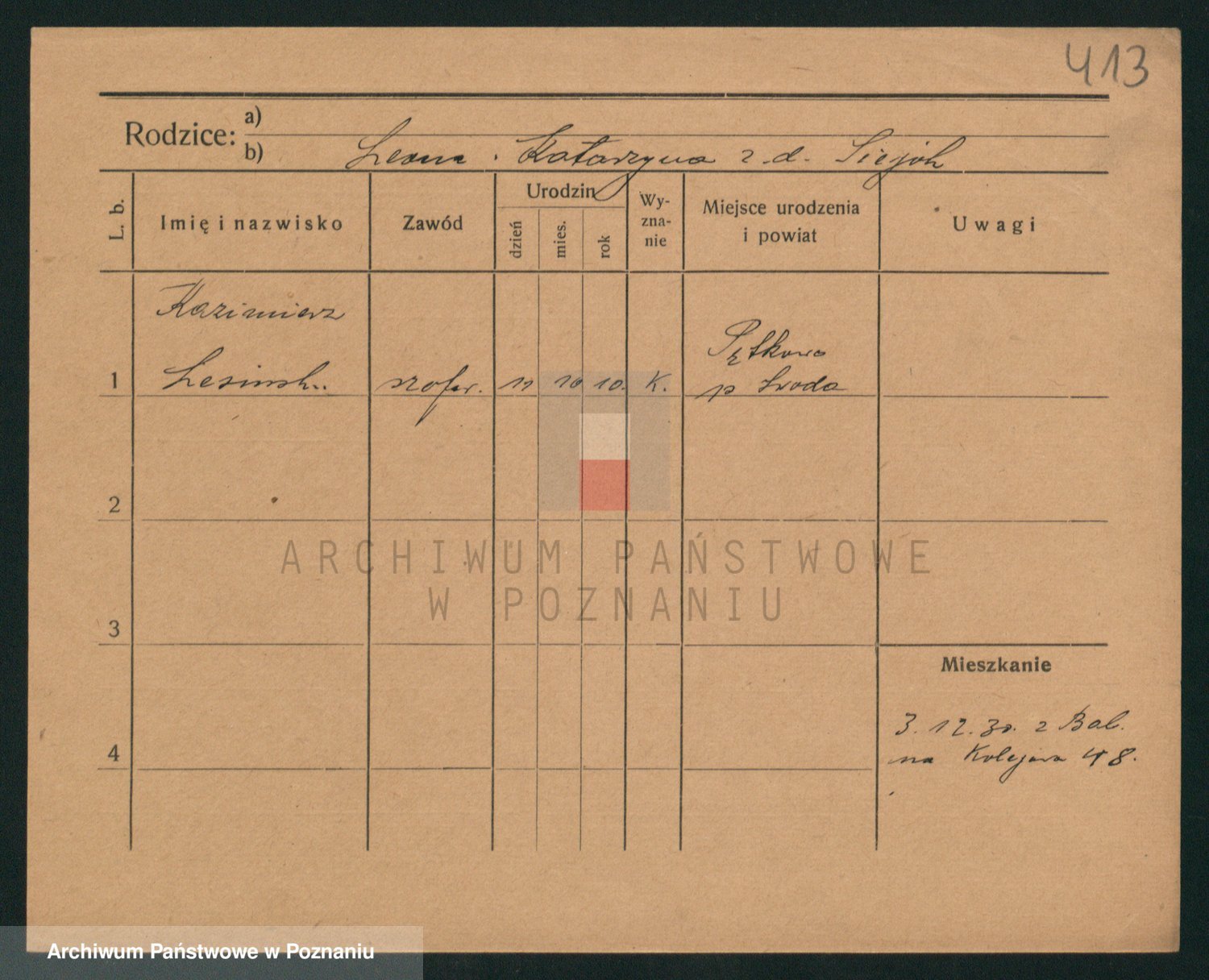 Podgląd karty osobowej dostępny jest po kliknięciu na nazwisko lub ikonkę karty. Można dokonywać powiększenia (ikony na górze) lub przechodzić między kolejnymi skanami (strzałki po bokach).