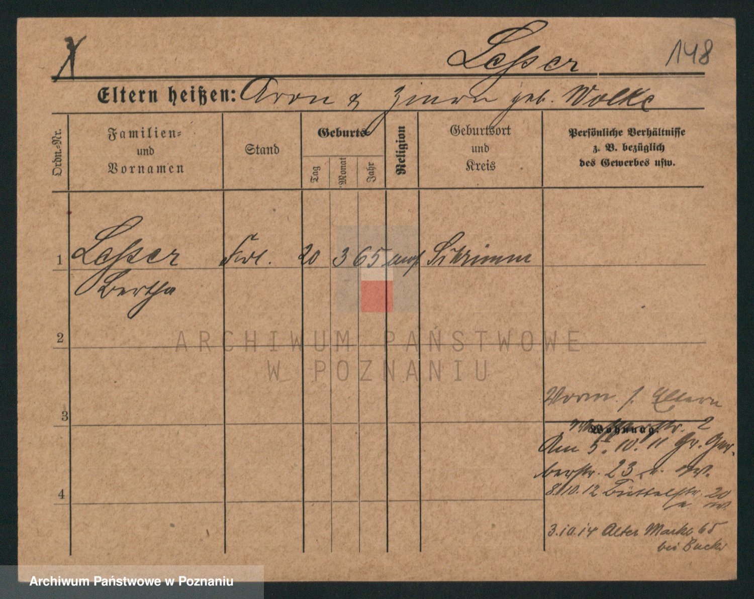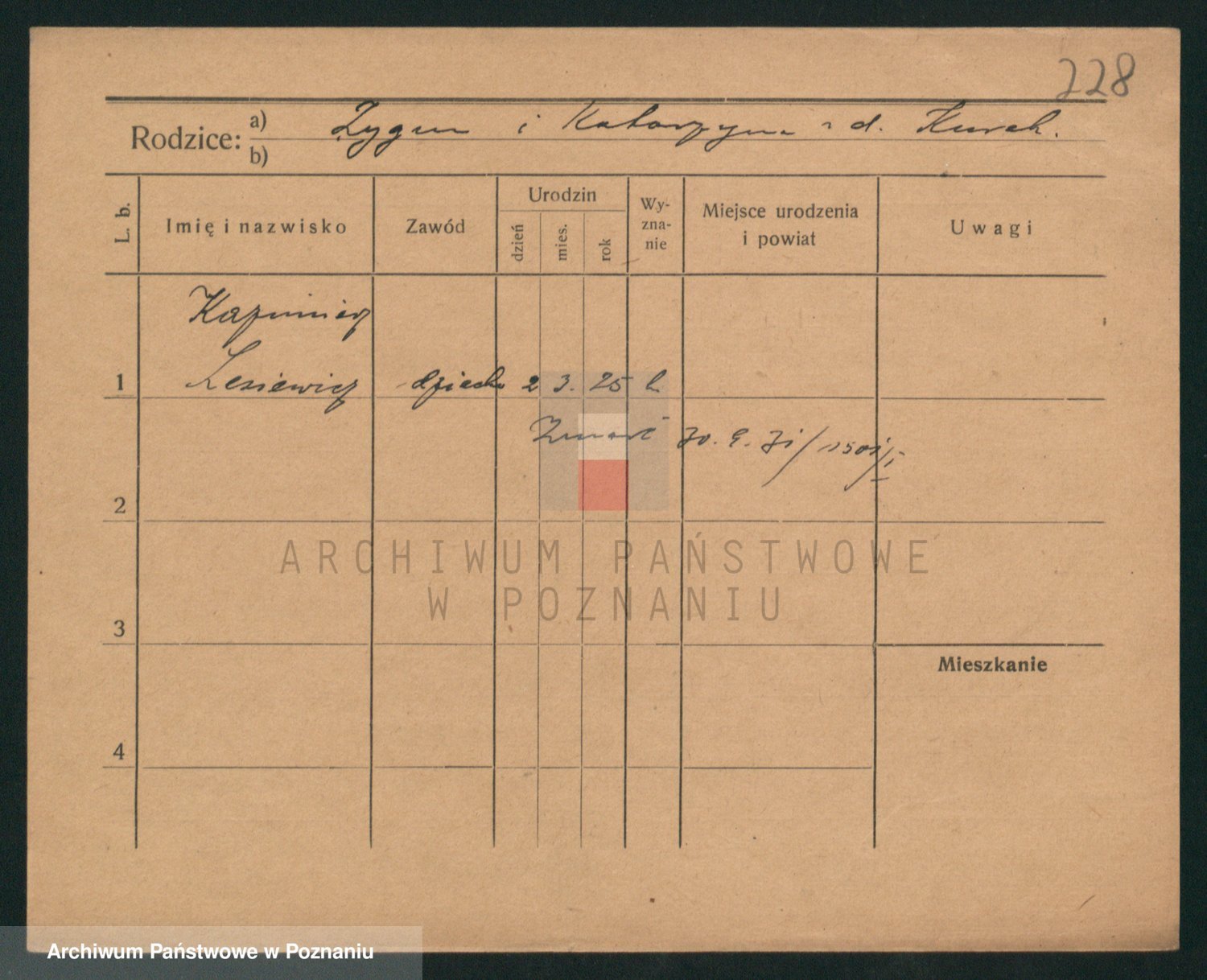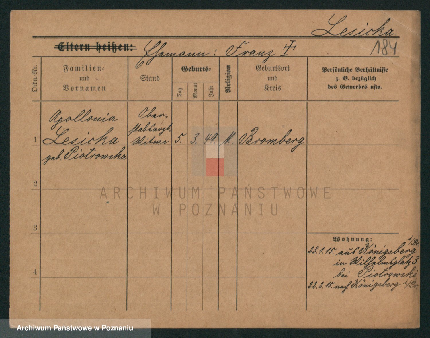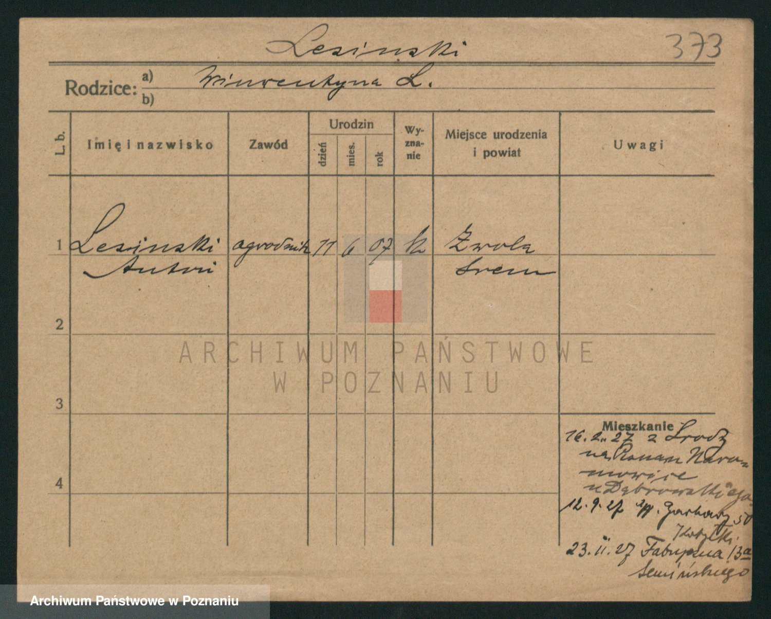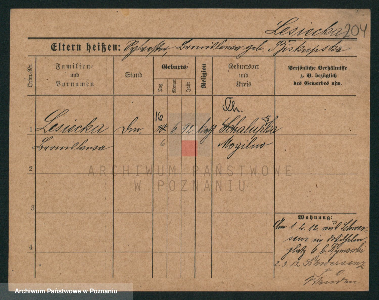 Podgląd karty osobowej dostępny jest po kliknięciu na nazwisko lub ikonkę karty. Można dokonywać powiększenia (ikony na górze) lub przechodzić między kolejnymi skanami (strzałki po bokach).