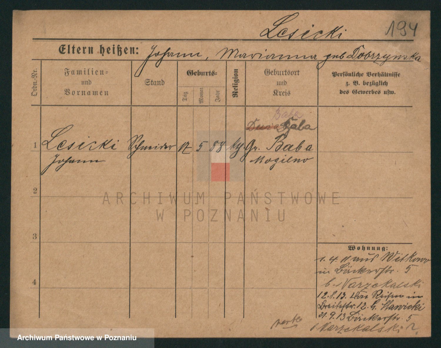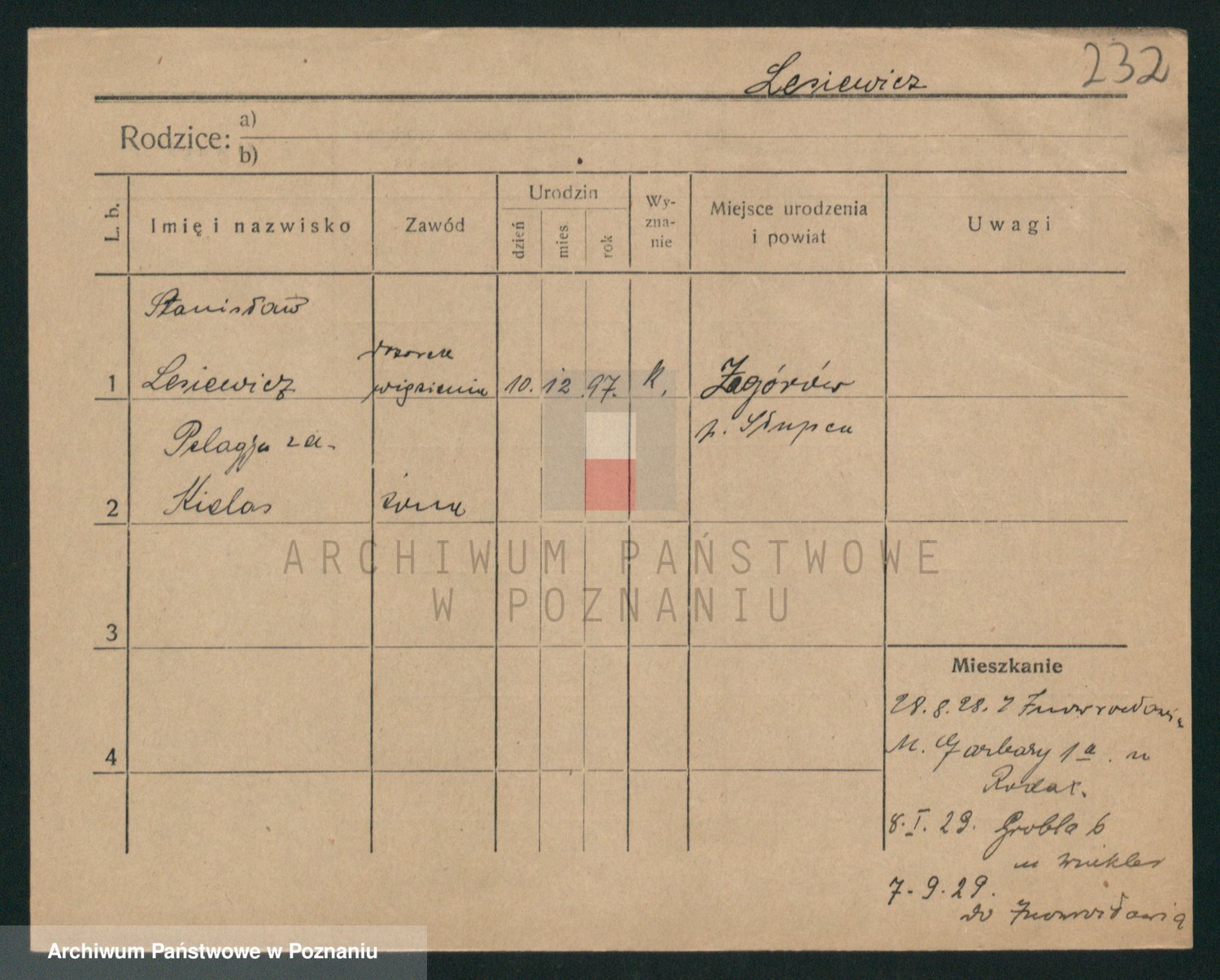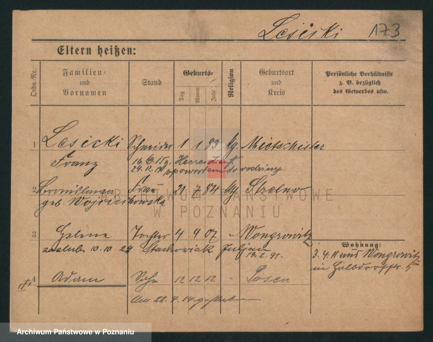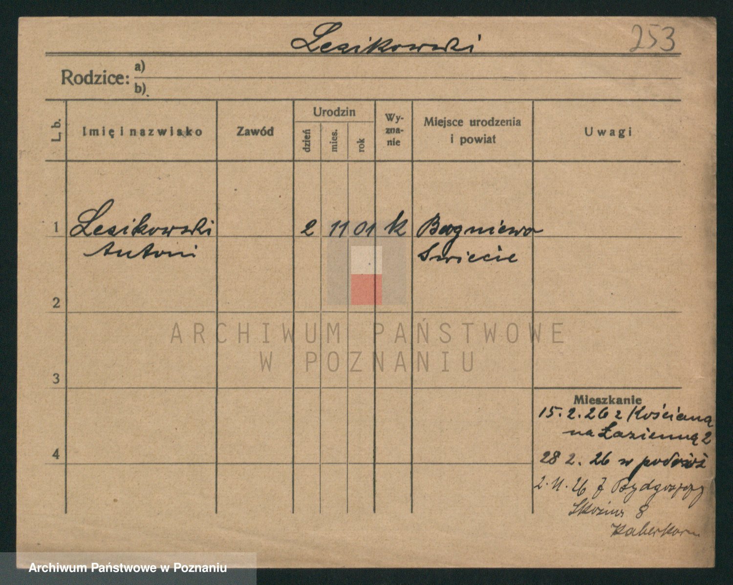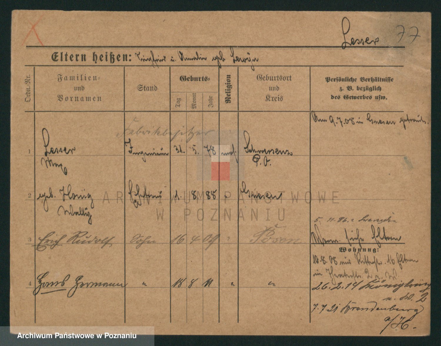 Podgląd karty osobowej dostępny jest po kliknięciu na nazwisko lub ikonkę karty. Można dokonywać powiększenia (ikony na górze) lub przechodzić między kolejnymi skanami (strzałki po bokach).