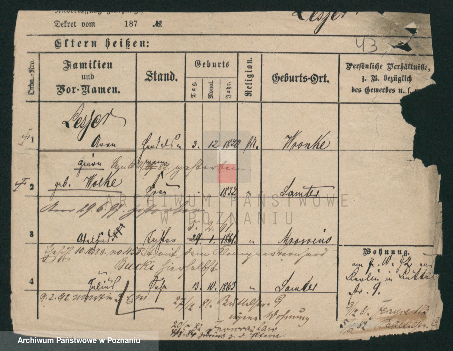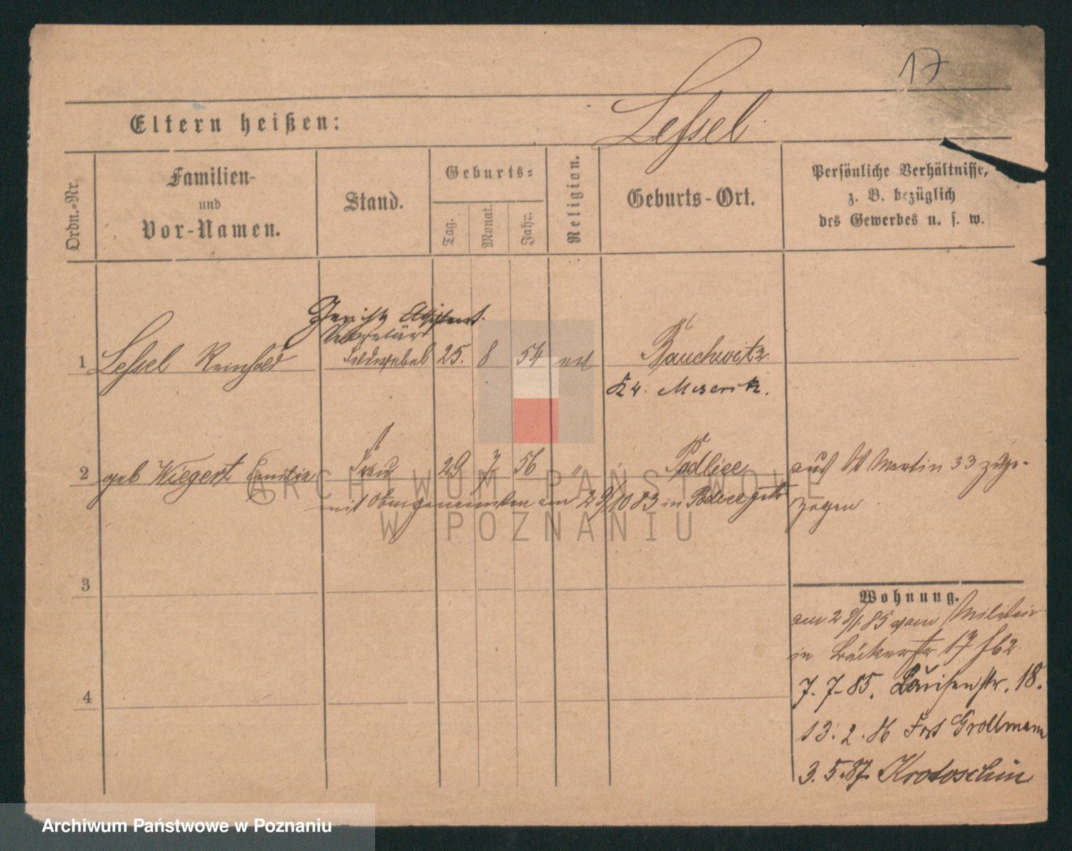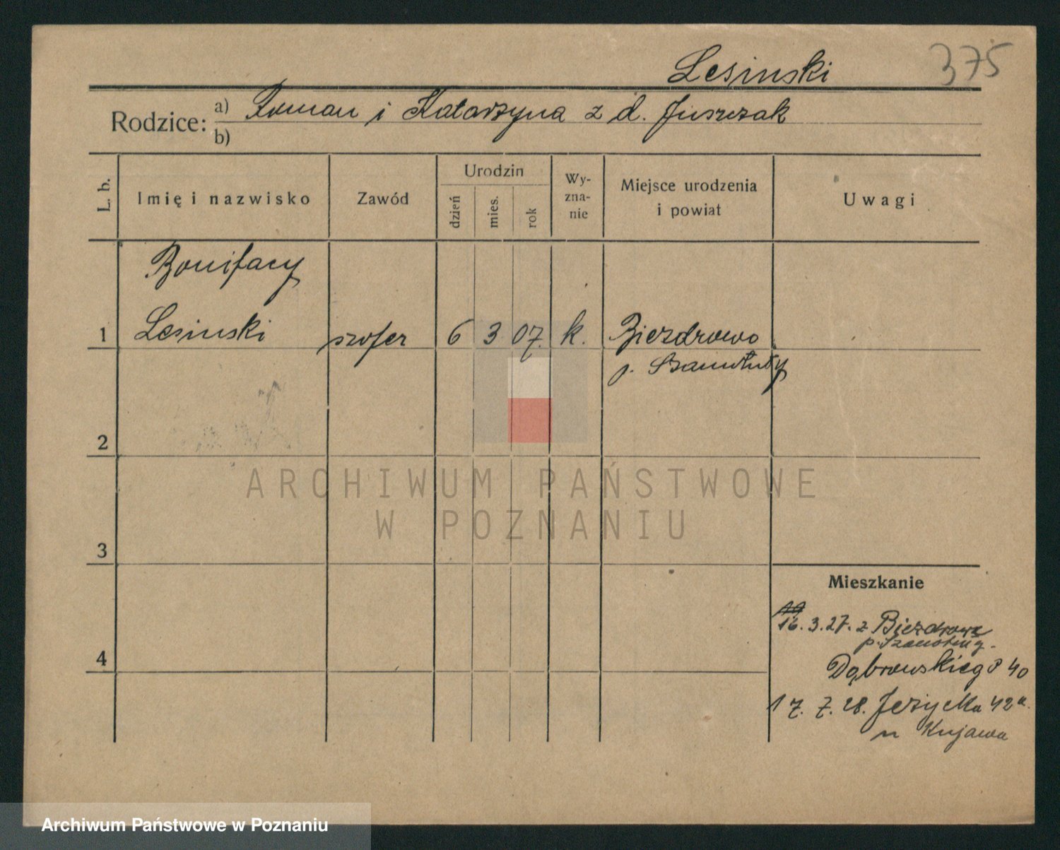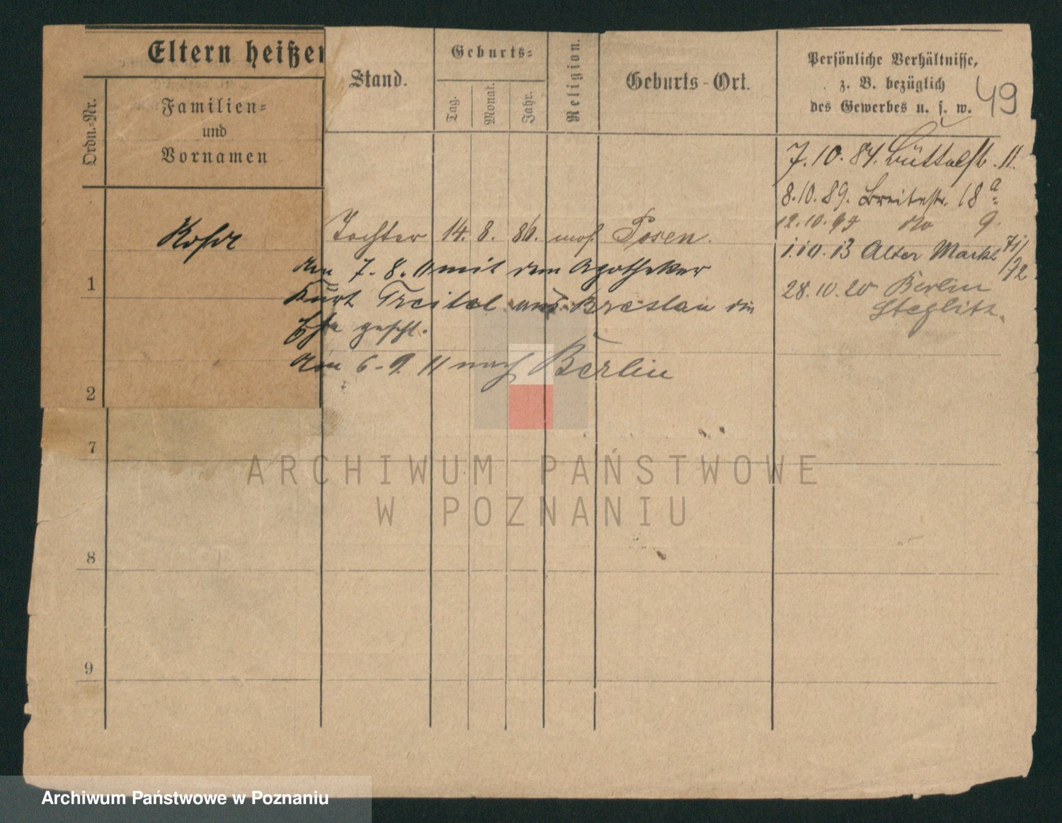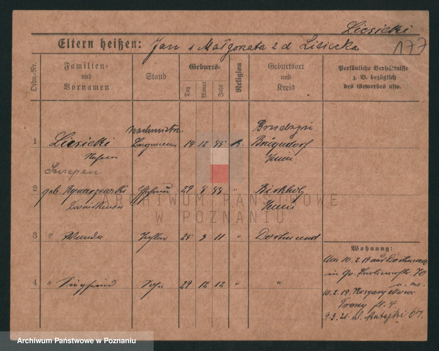 Podgląd karty osobowej dostępny jest po kliknięciu na nazwisko lub ikonkę karty. Można dokonywać powiększenia (ikony na górze) lub przechodzić między kolejnymi skanami (strzałki po bokach).