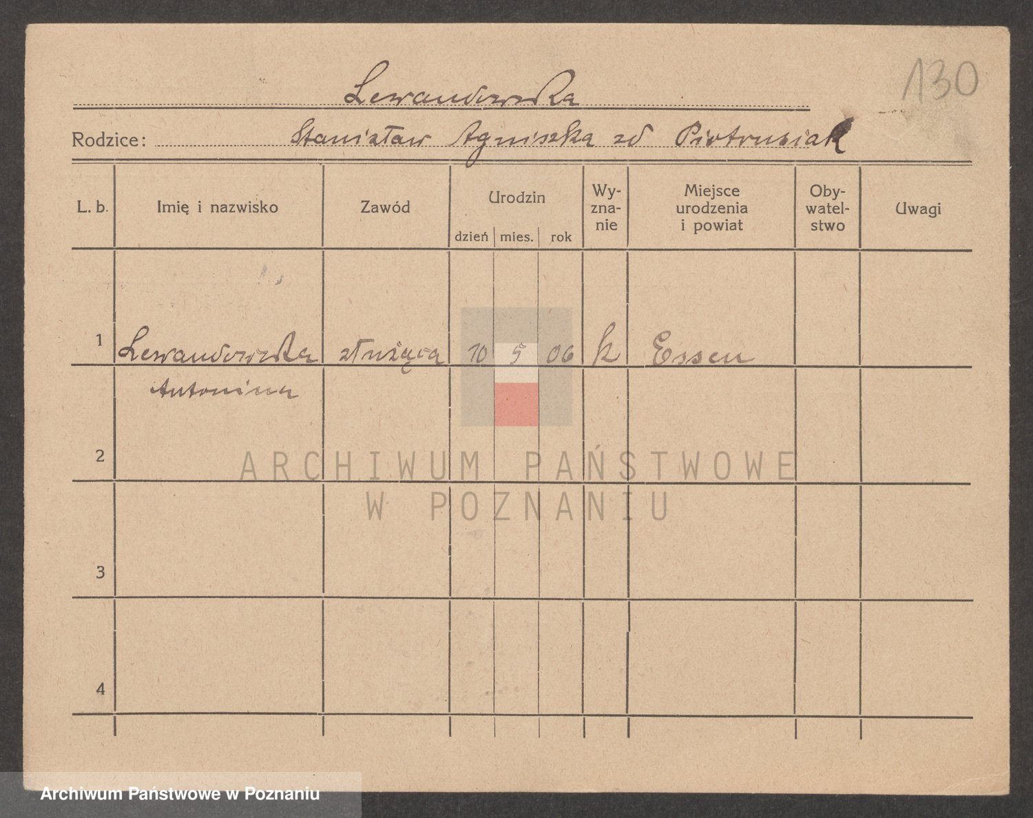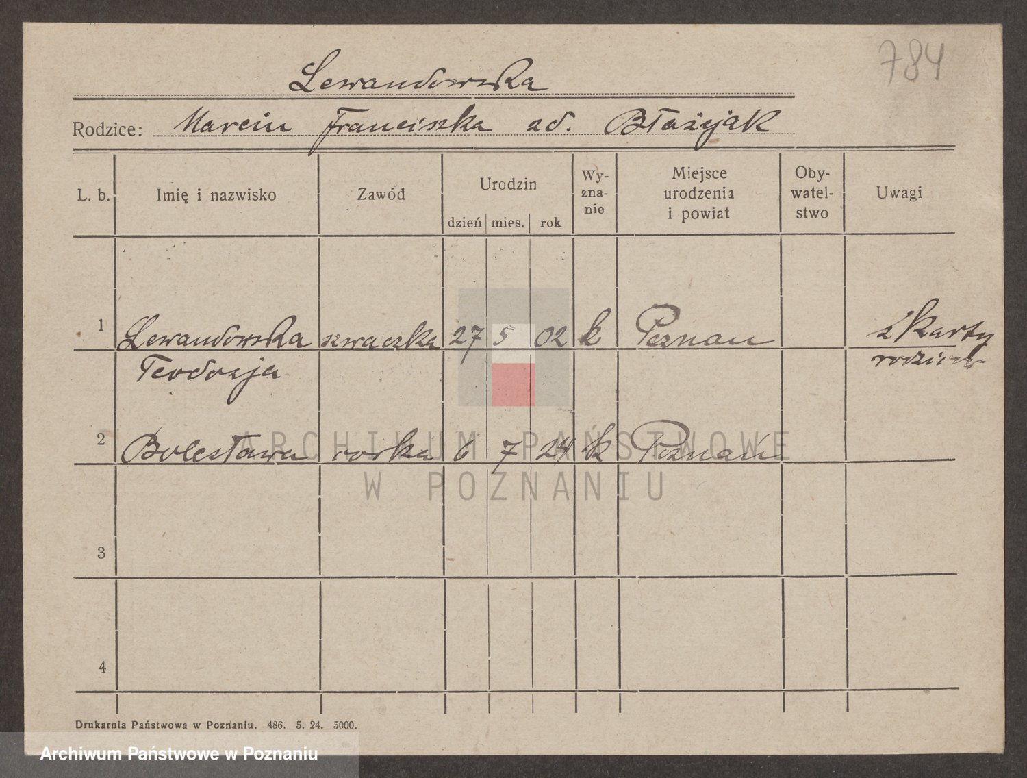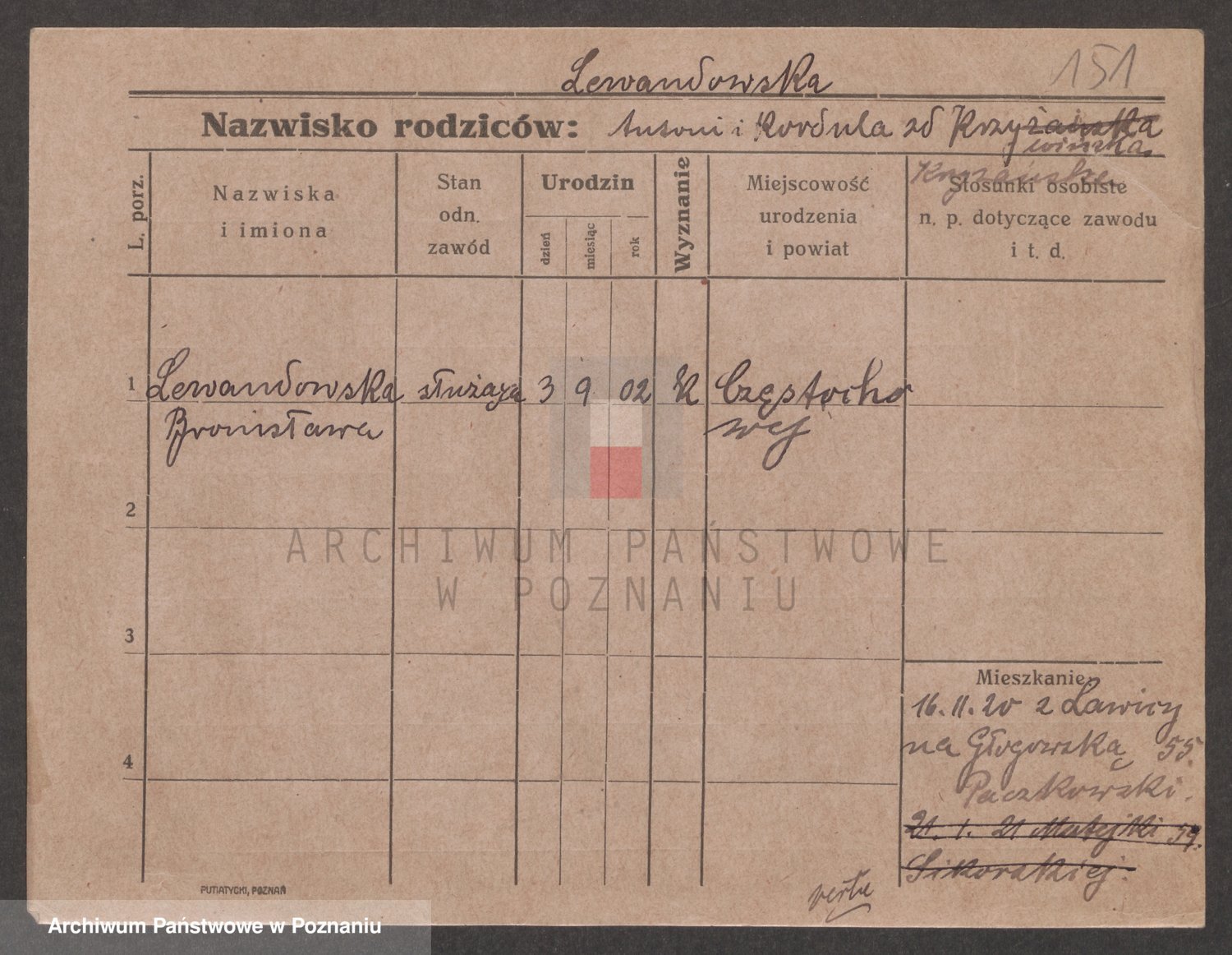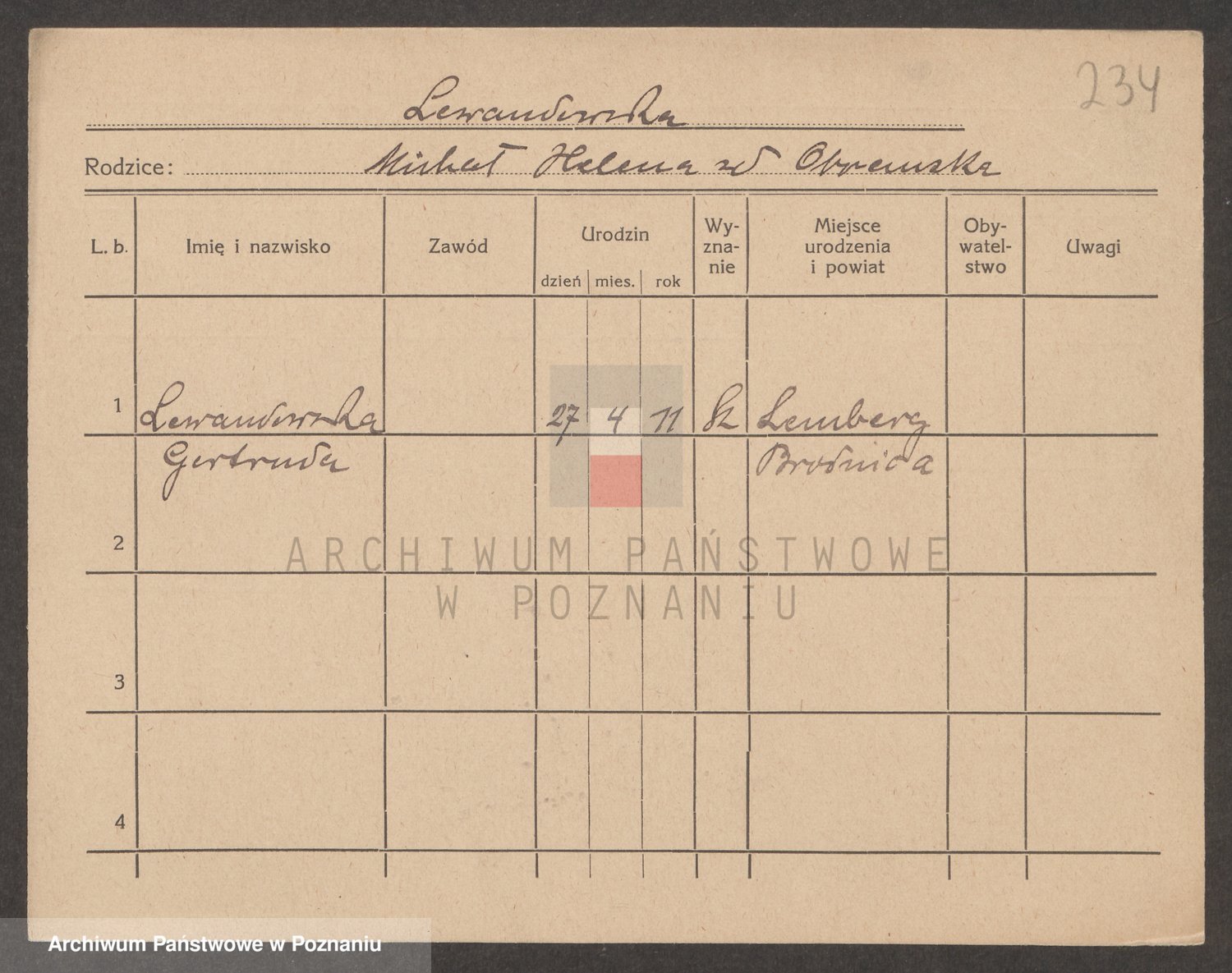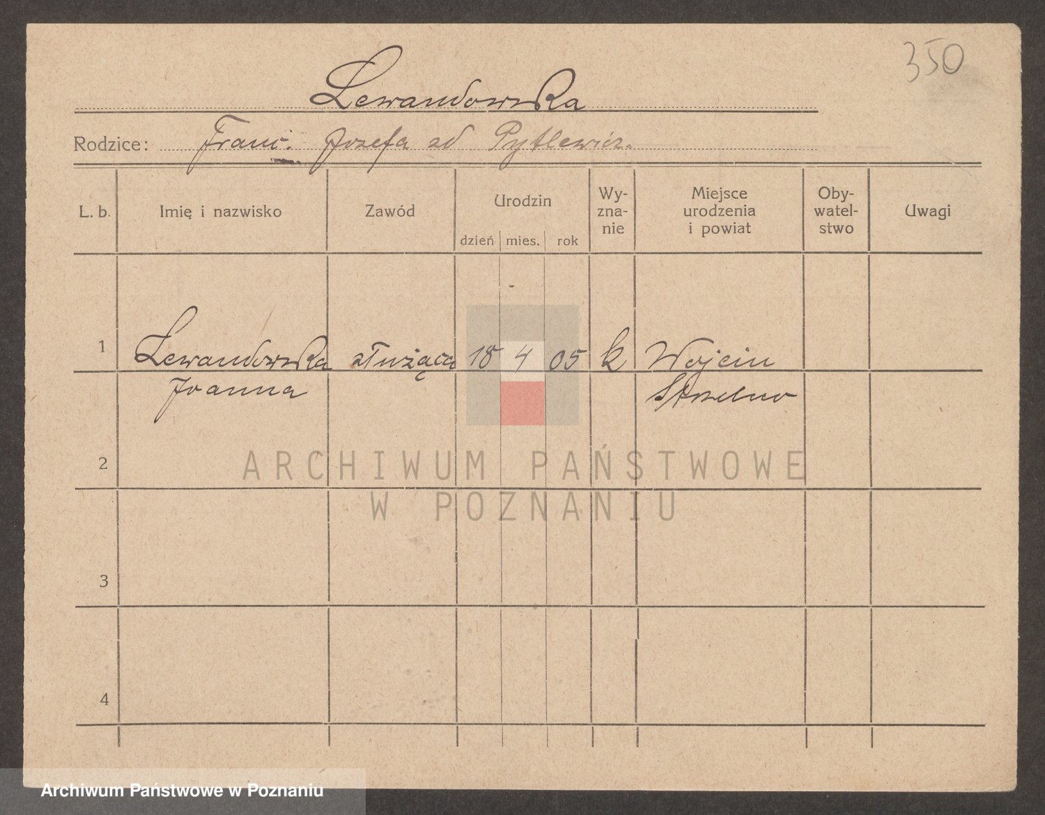 Podgląd karty osobowej dostępny jest po kliknięciu na nazwisko lub ikonkę karty. Można dokonywać powiększenia (ikony na górze) lub przechodzić między kolejnymi skanami (strzałki po bokach).