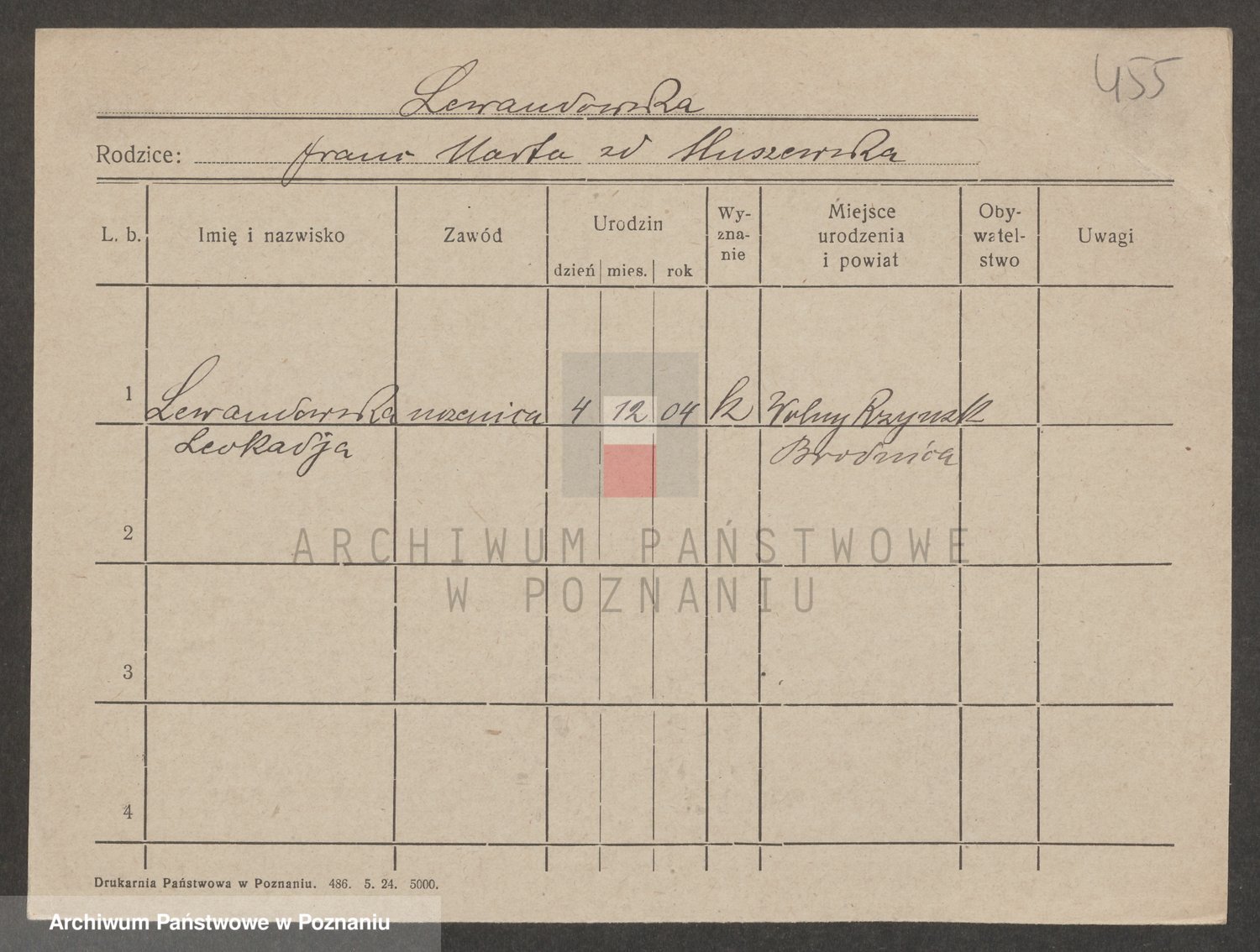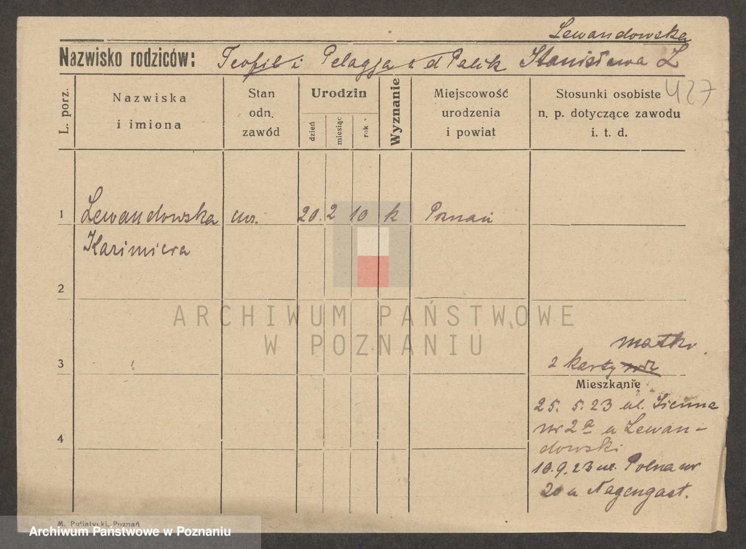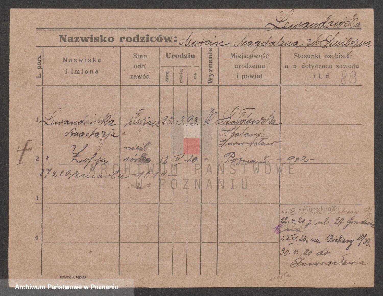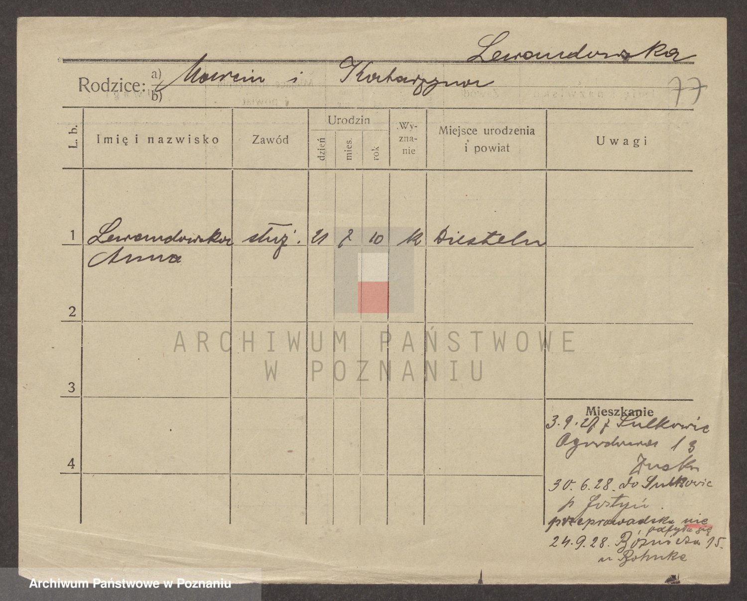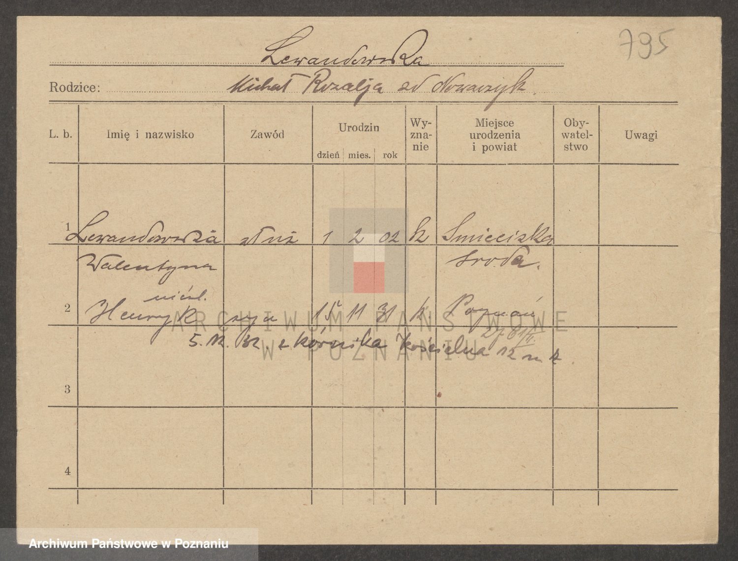 Podgląd karty osobowej dostępny jest po kliknięciu na nazwisko lub ikonkę karty. Można dokonywać powiększenia (ikony na górze) lub przechodzić między kolejnymi skanami (strzałki po bokach).
