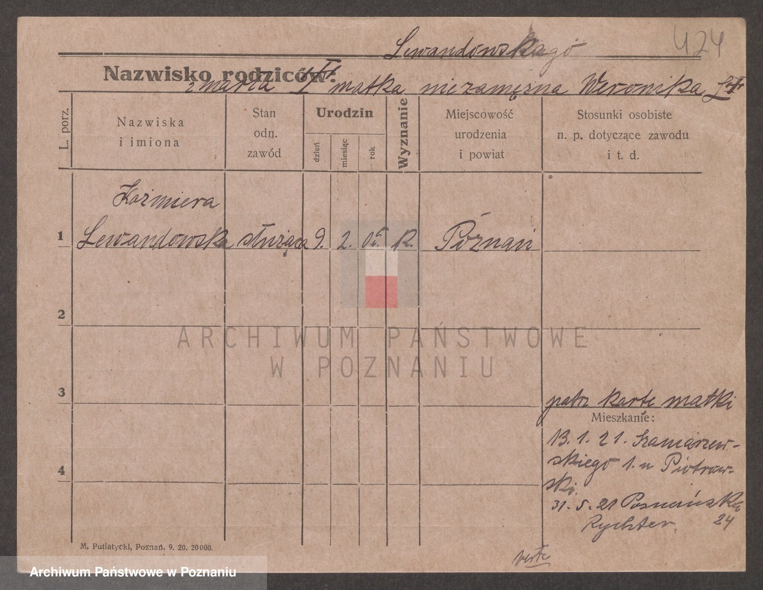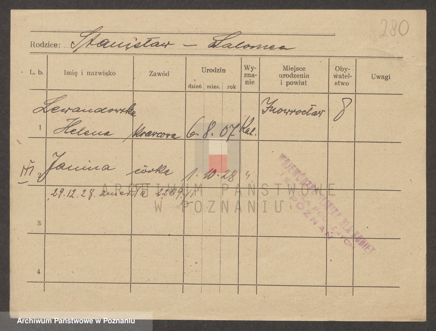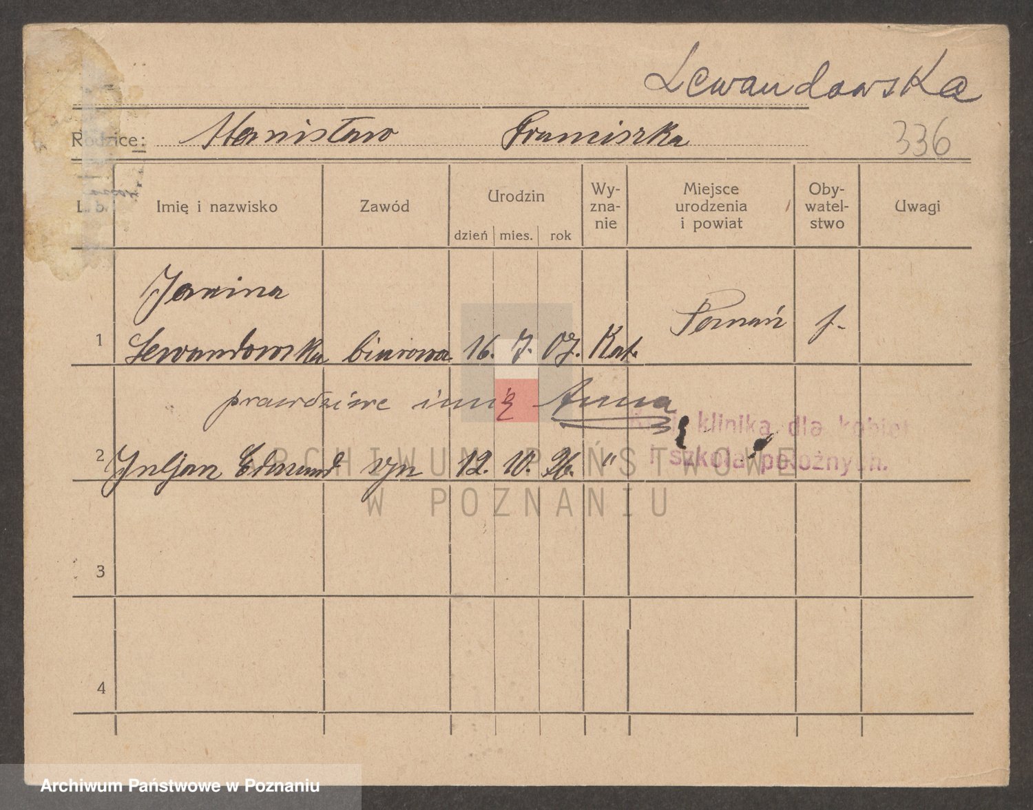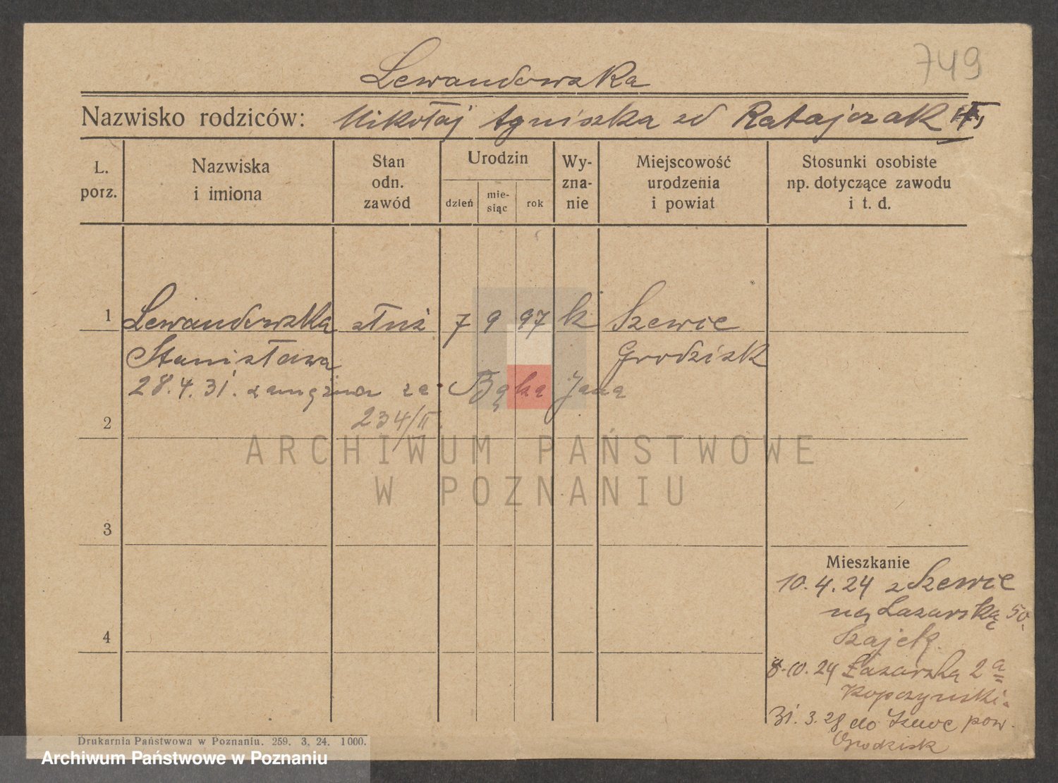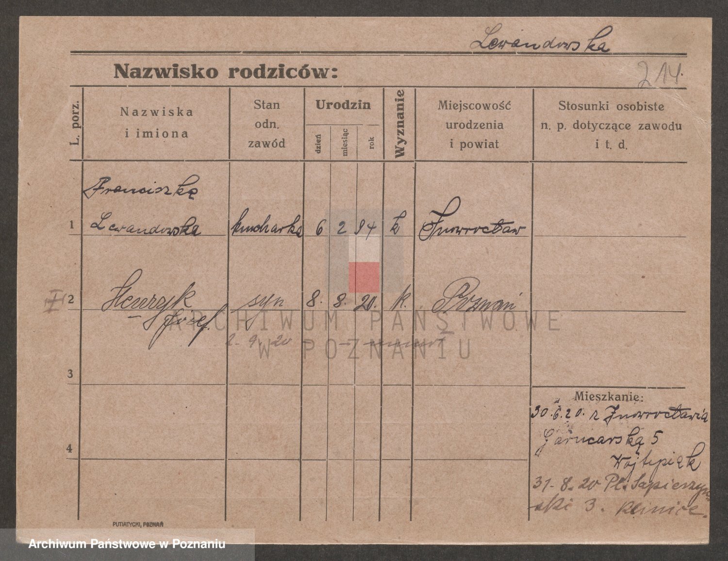 Podgląd karty osobowej dostępny jest po kliknięciu na nazwisko lub ikonkę karty. Można dokonywać powiększenia (ikony na górze) lub przechodzić między kolejnymi skanami (strzałki po bokach).