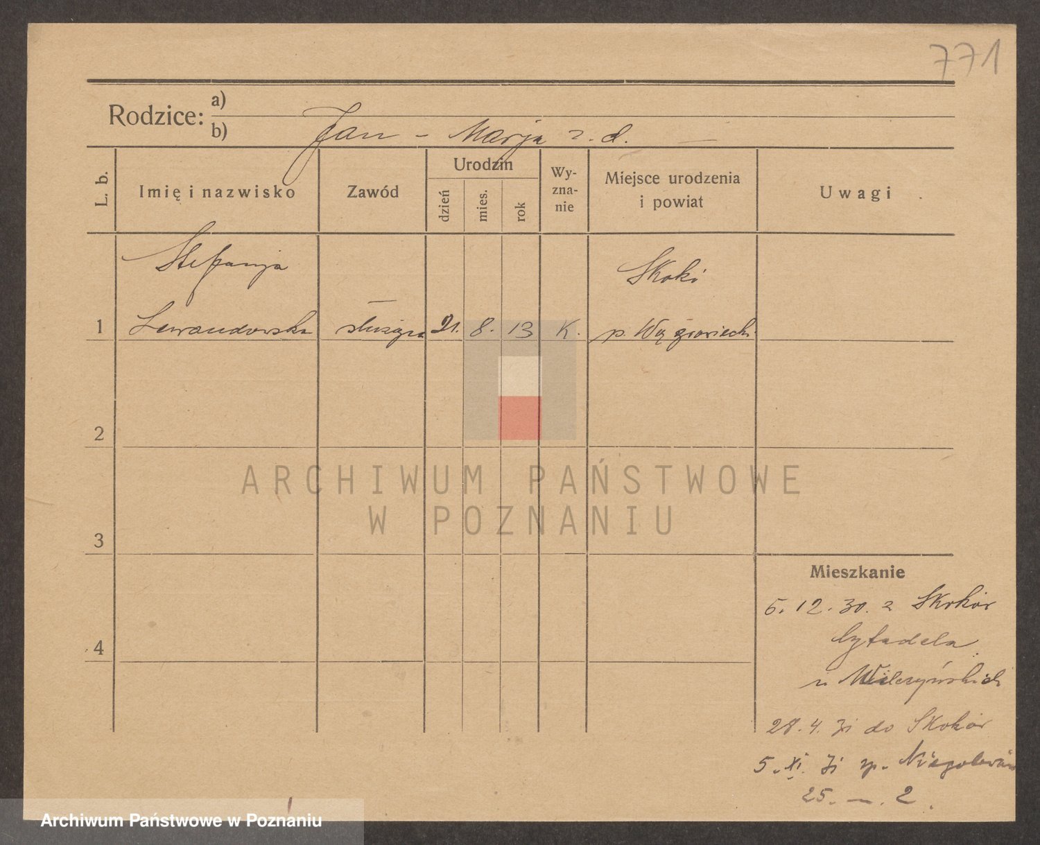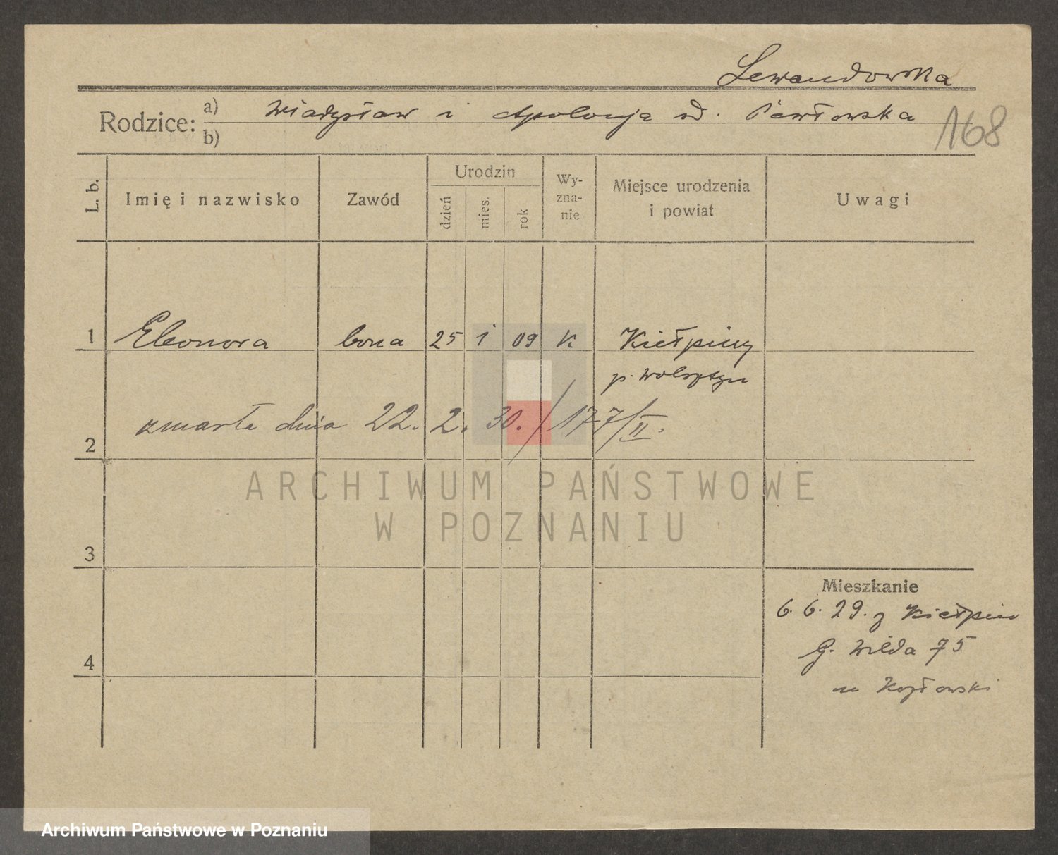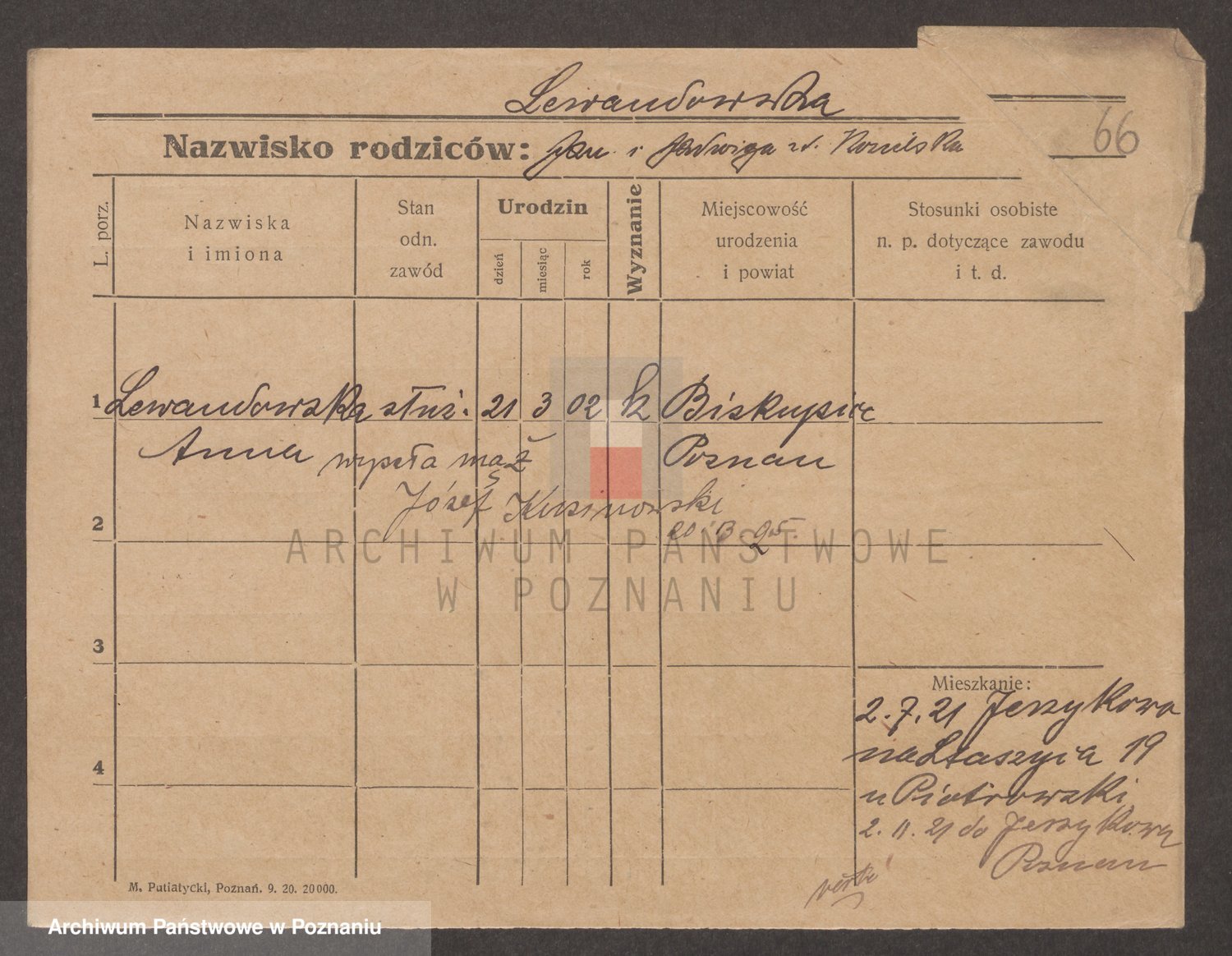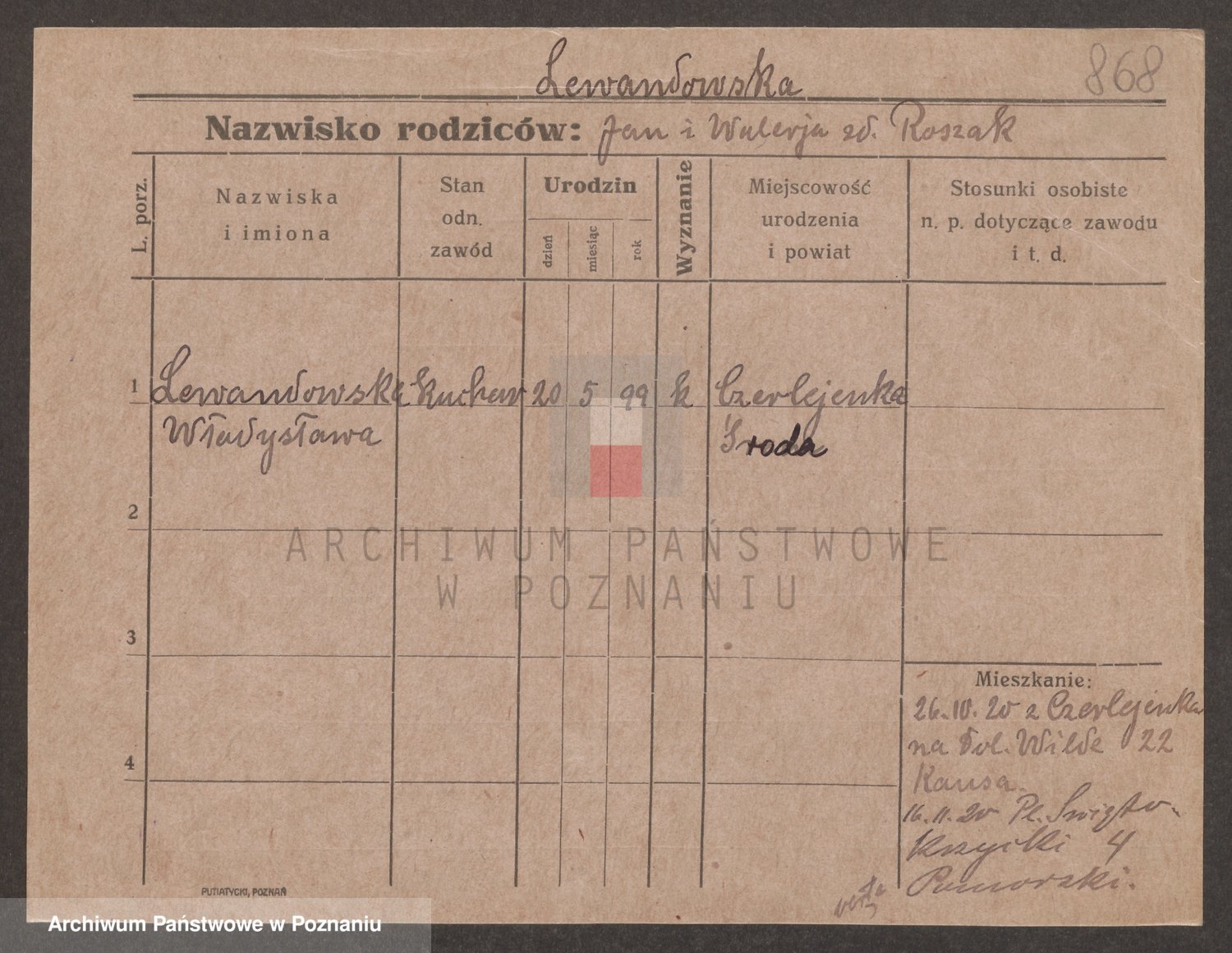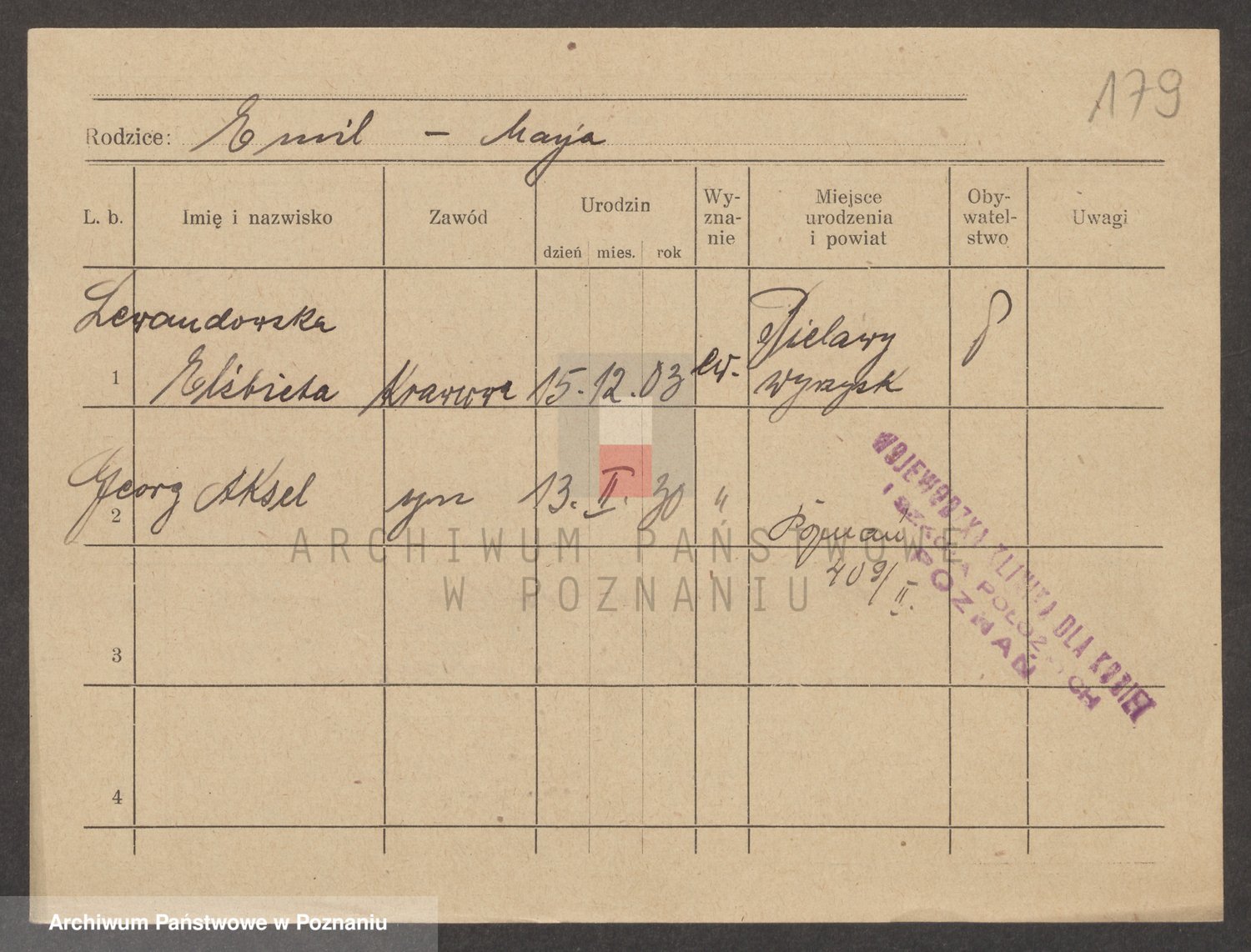 Podgląd karty osobowej dostępny jest po kliknięciu na nazwisko lub ikonkę karty. Można dokonywać powiększenia (ikony na górze) lub przechodzić między kolejnymi skanami (strzałki po bokach).