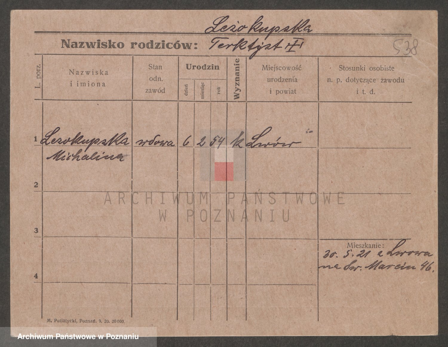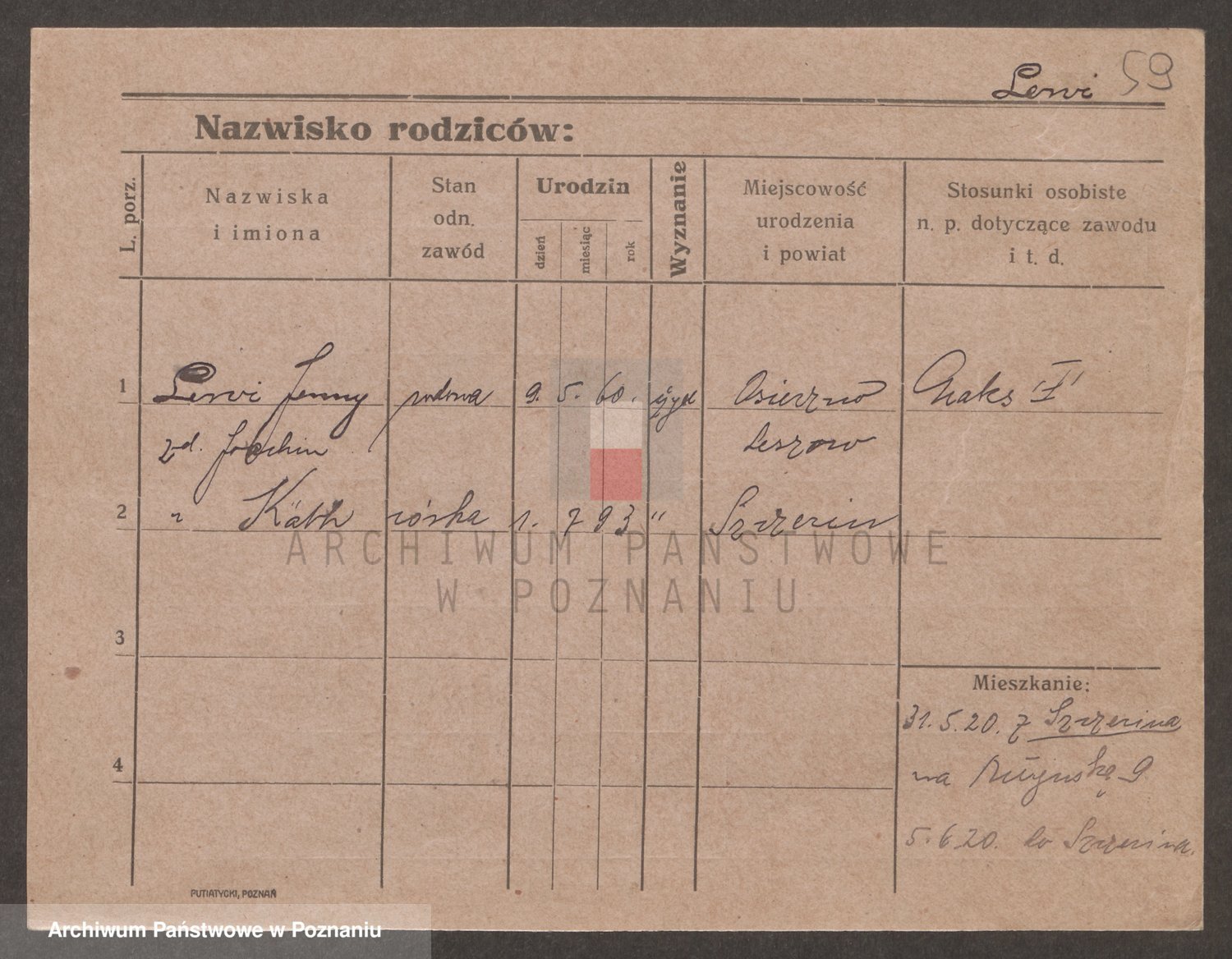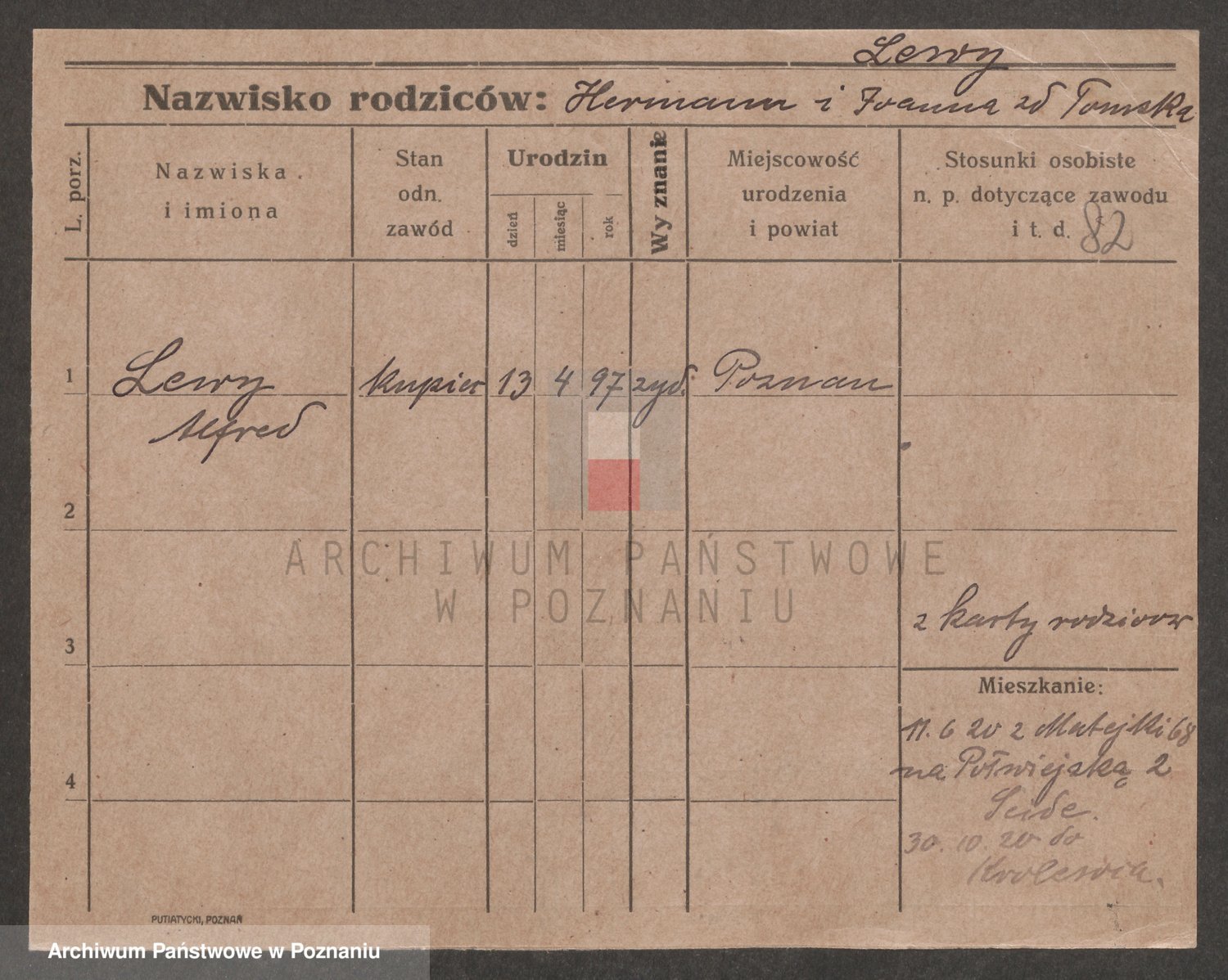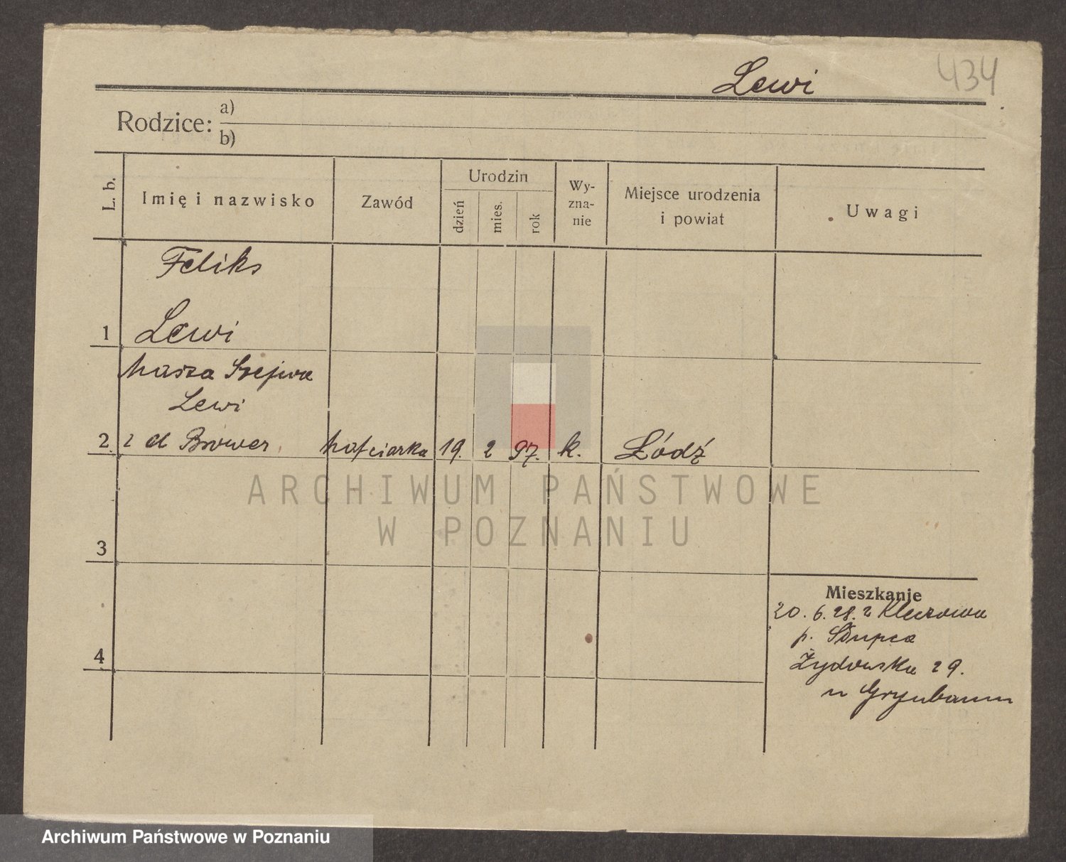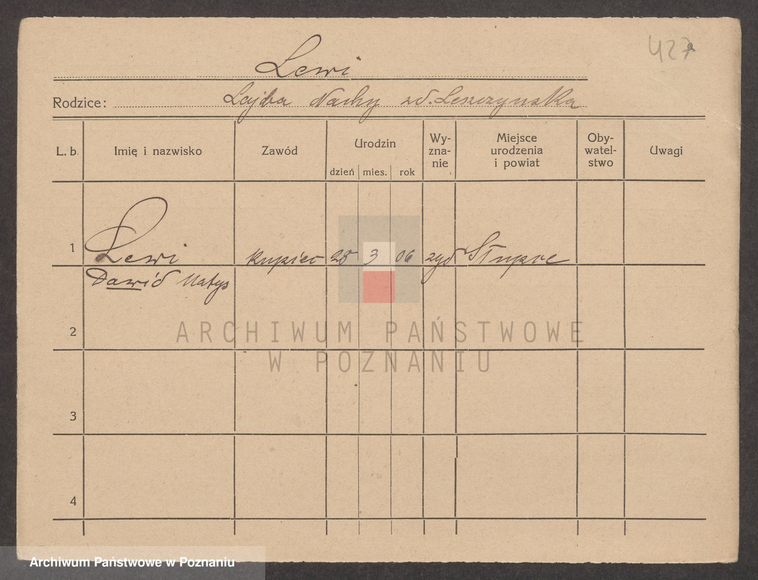 Podgląd karty osobowej dostępny jest po kliknięciu na nazwisko lub ikonkę karty. Można dokonywać powiększenia (ikony na górze) lub przechodzić między kolejnymi skanami (strzałki po bokach).