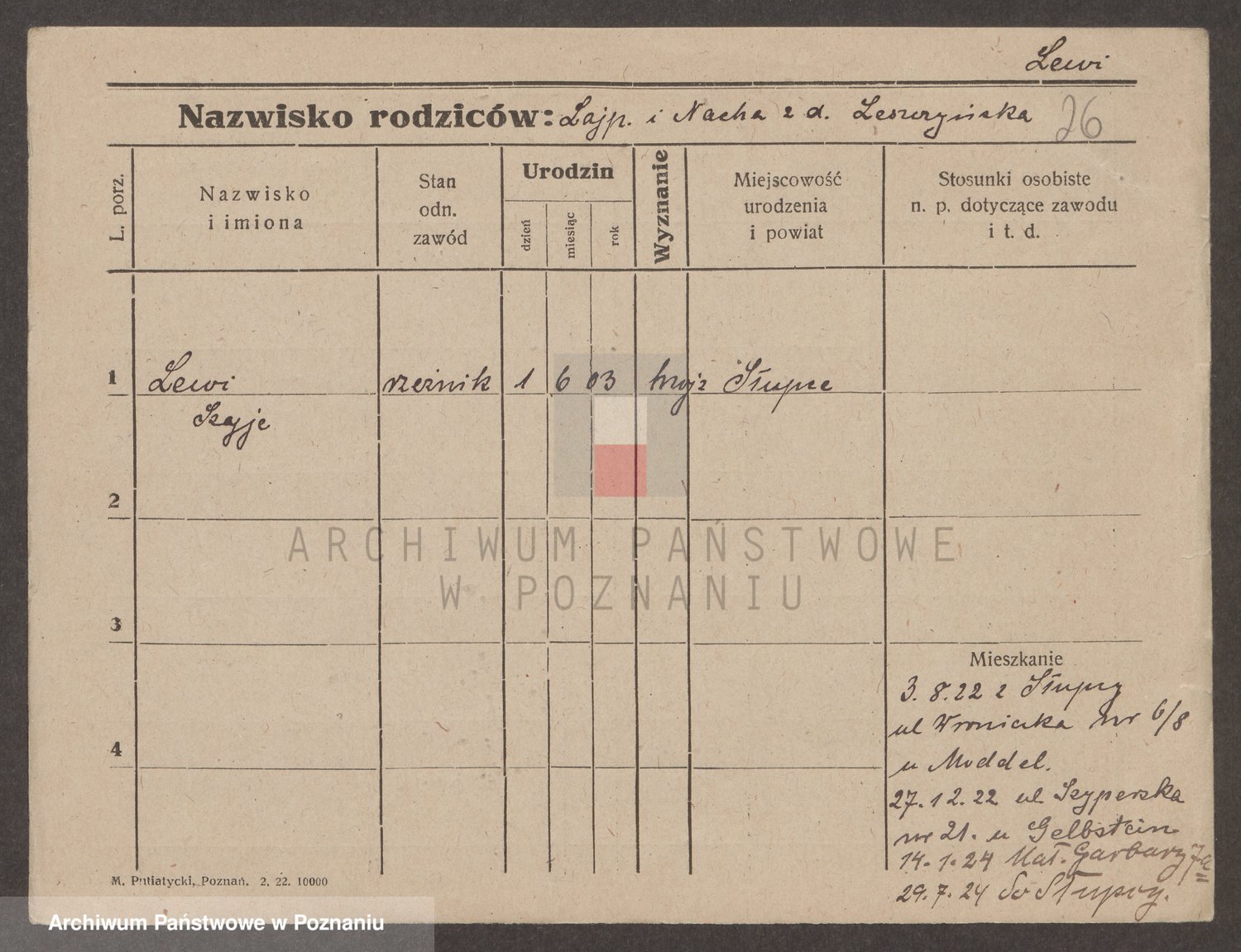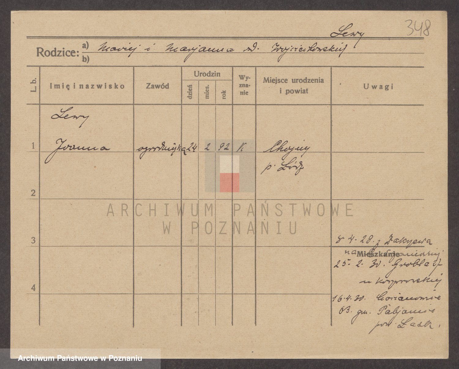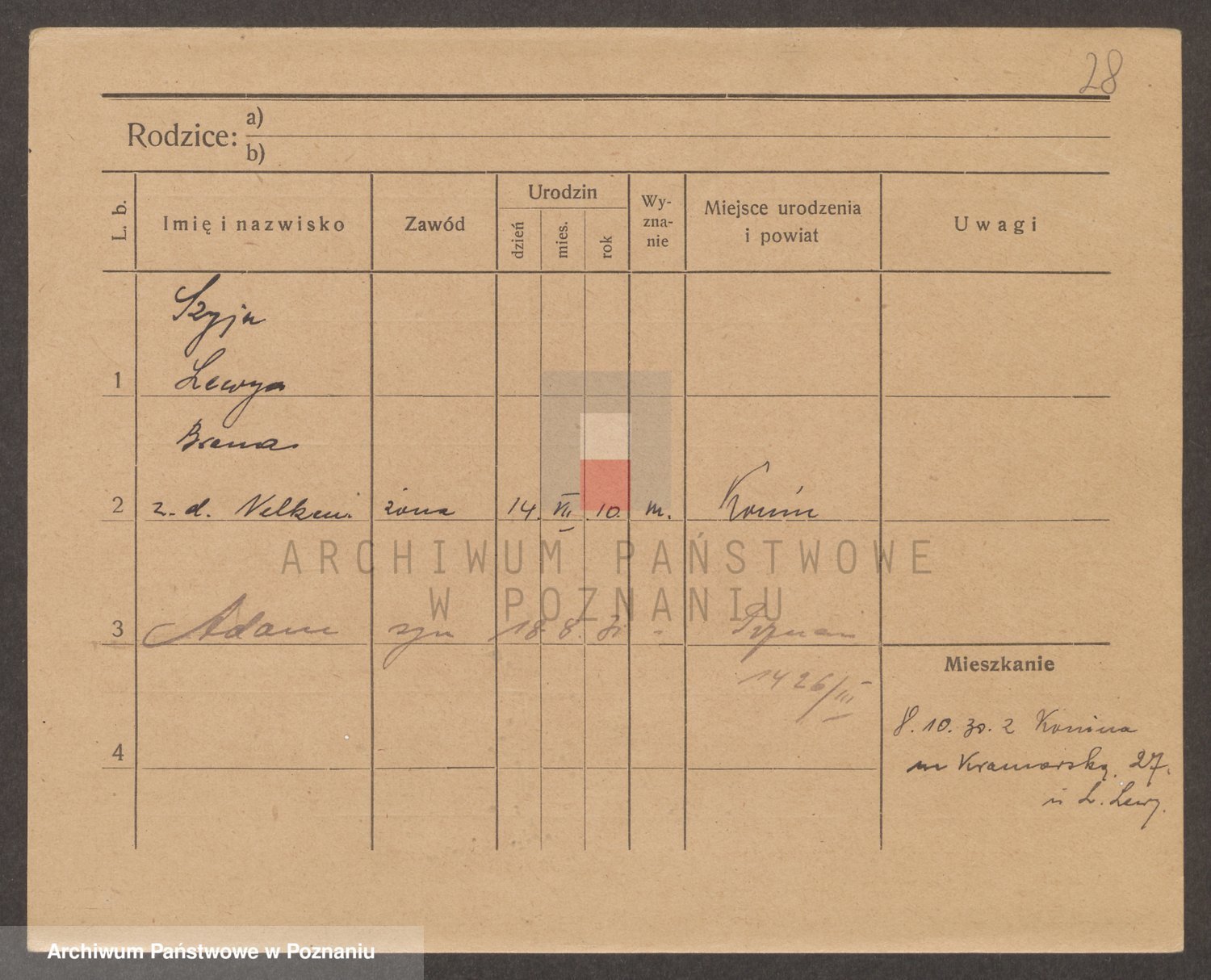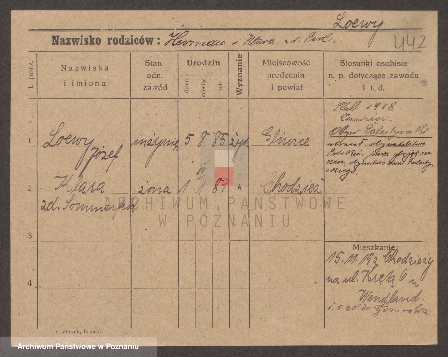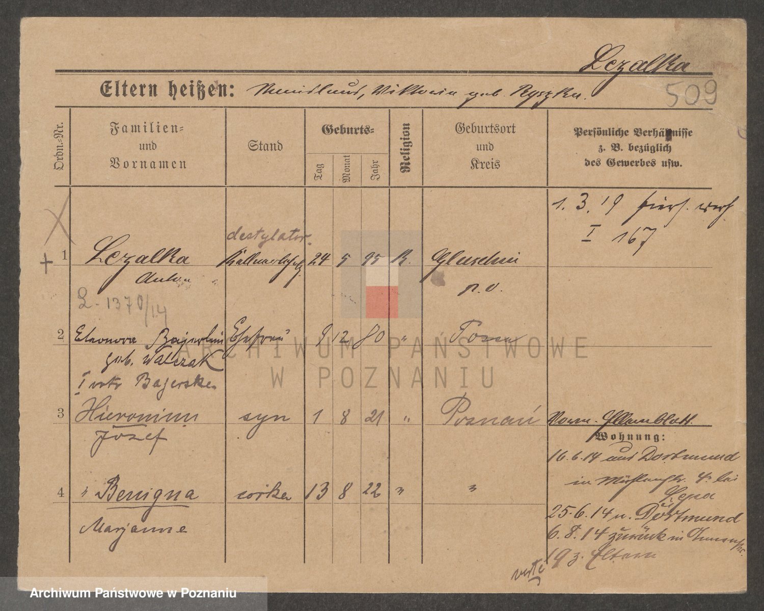 Podgląd karty osobowej dostępny jest po kliknięciu na nazwisko lub ikonkę karty. Można dokonywać powiększenia (ikony na górze) lub przechodzić między kolejnymi skanami (strzałki po bokach).