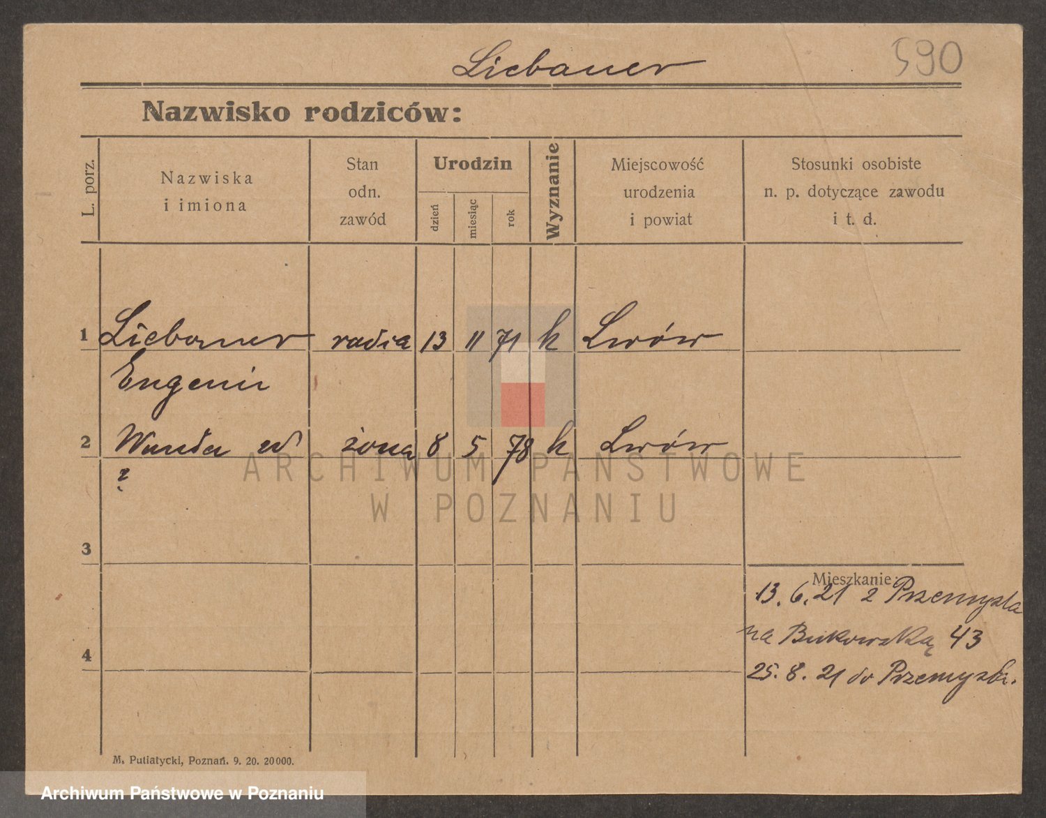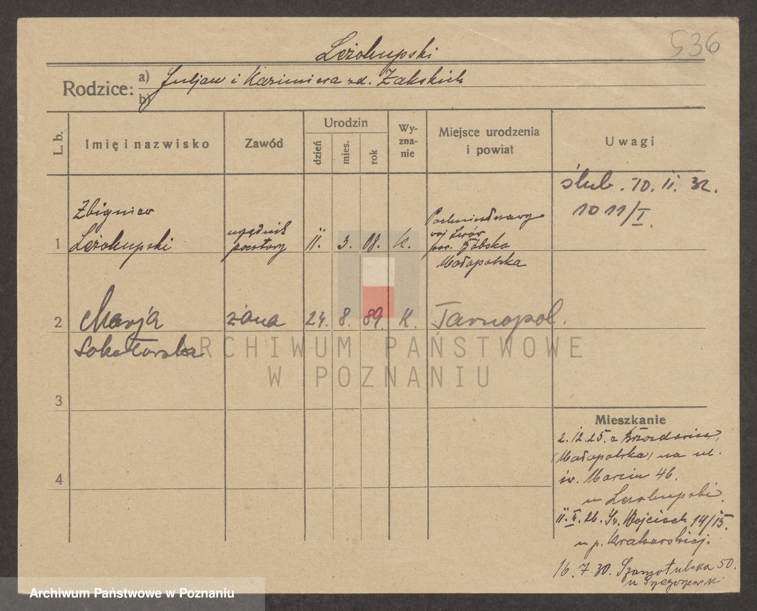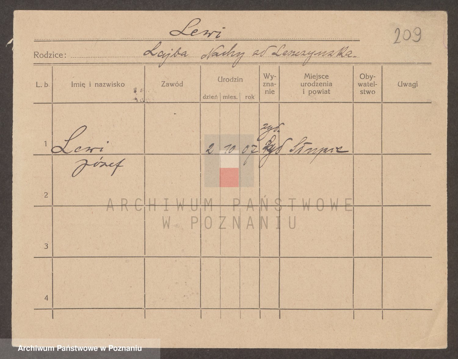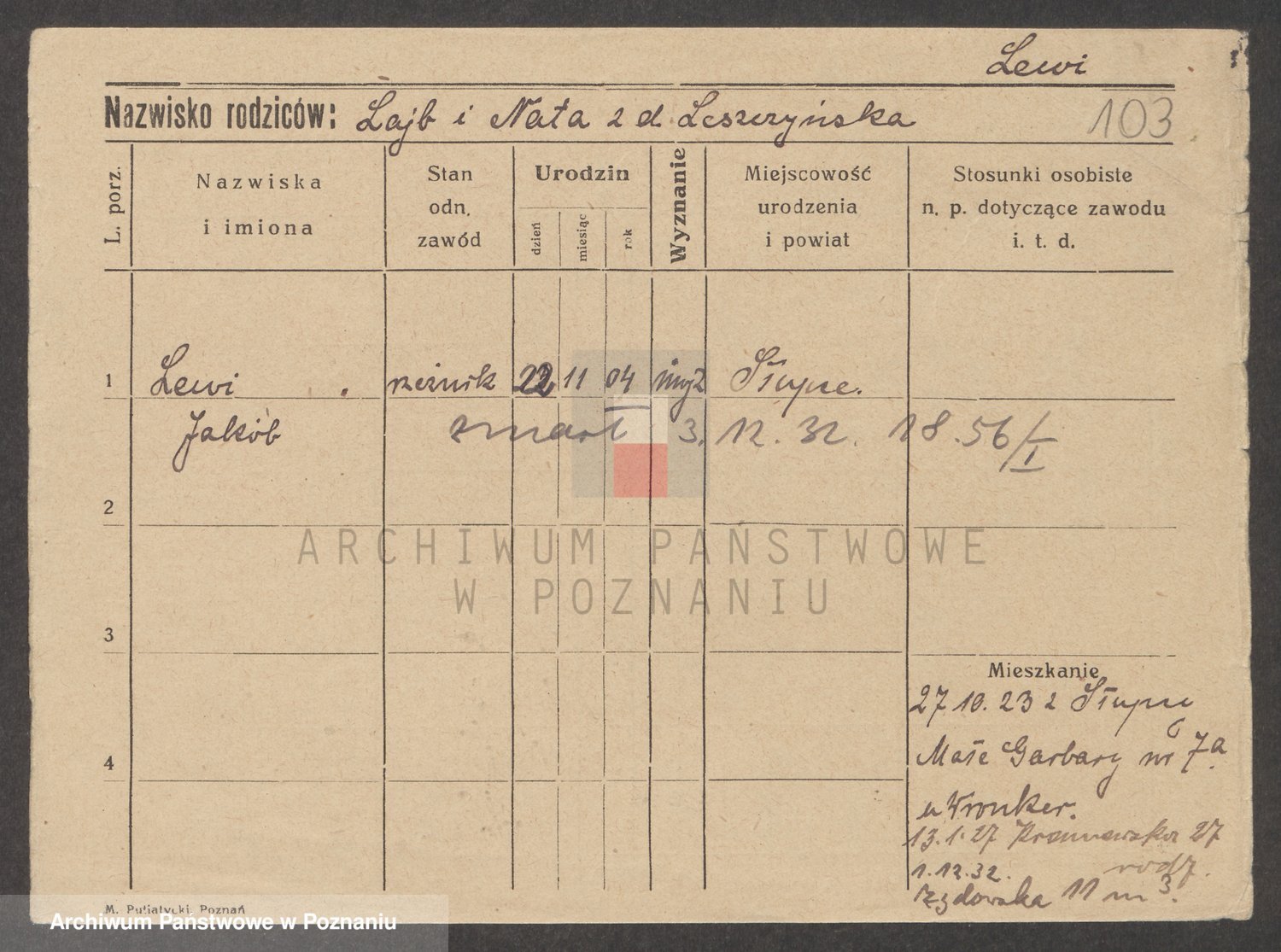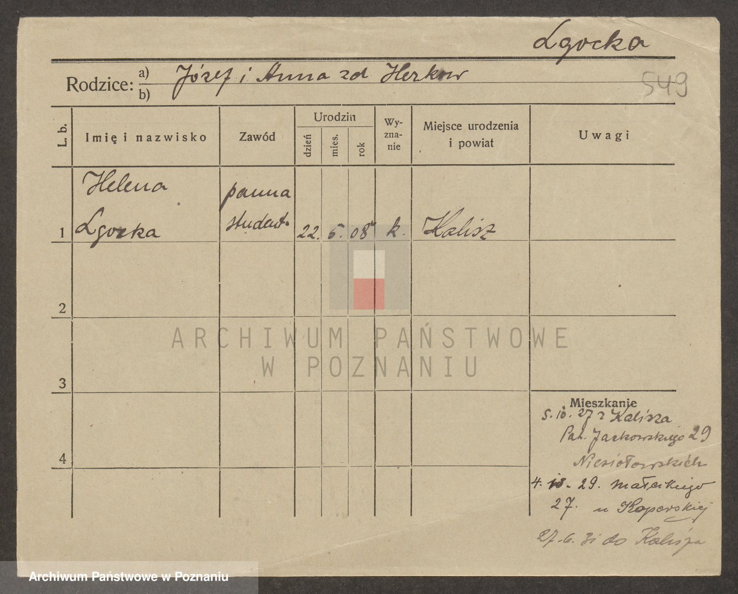 Podgląd karty osobowej dostępny jest po kliknięciu na nazwisko lub ikonkę karty. Można dokonywać powiększenia (ikony na górze) lub przechodzić między kolejnymi skanami (strzałki po bokach).