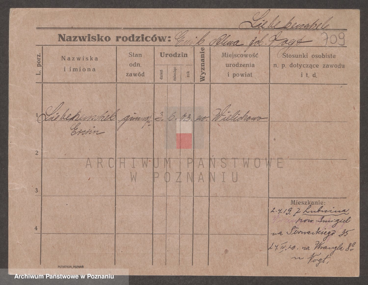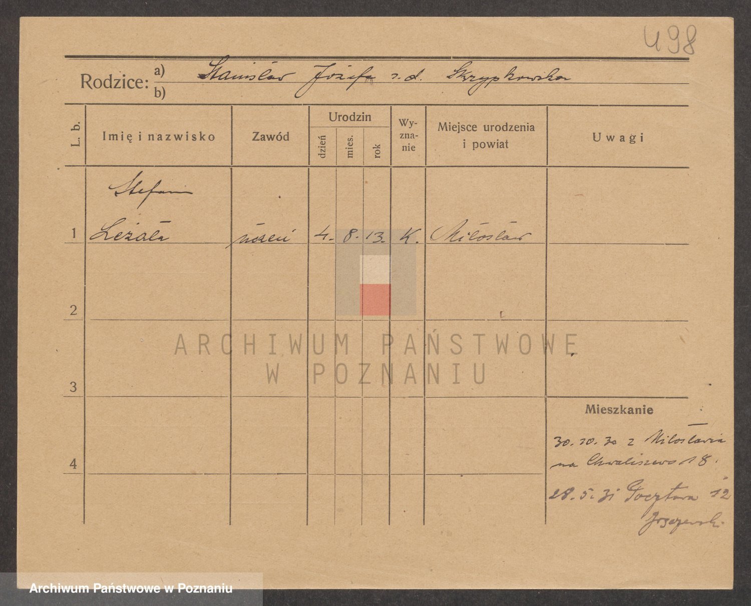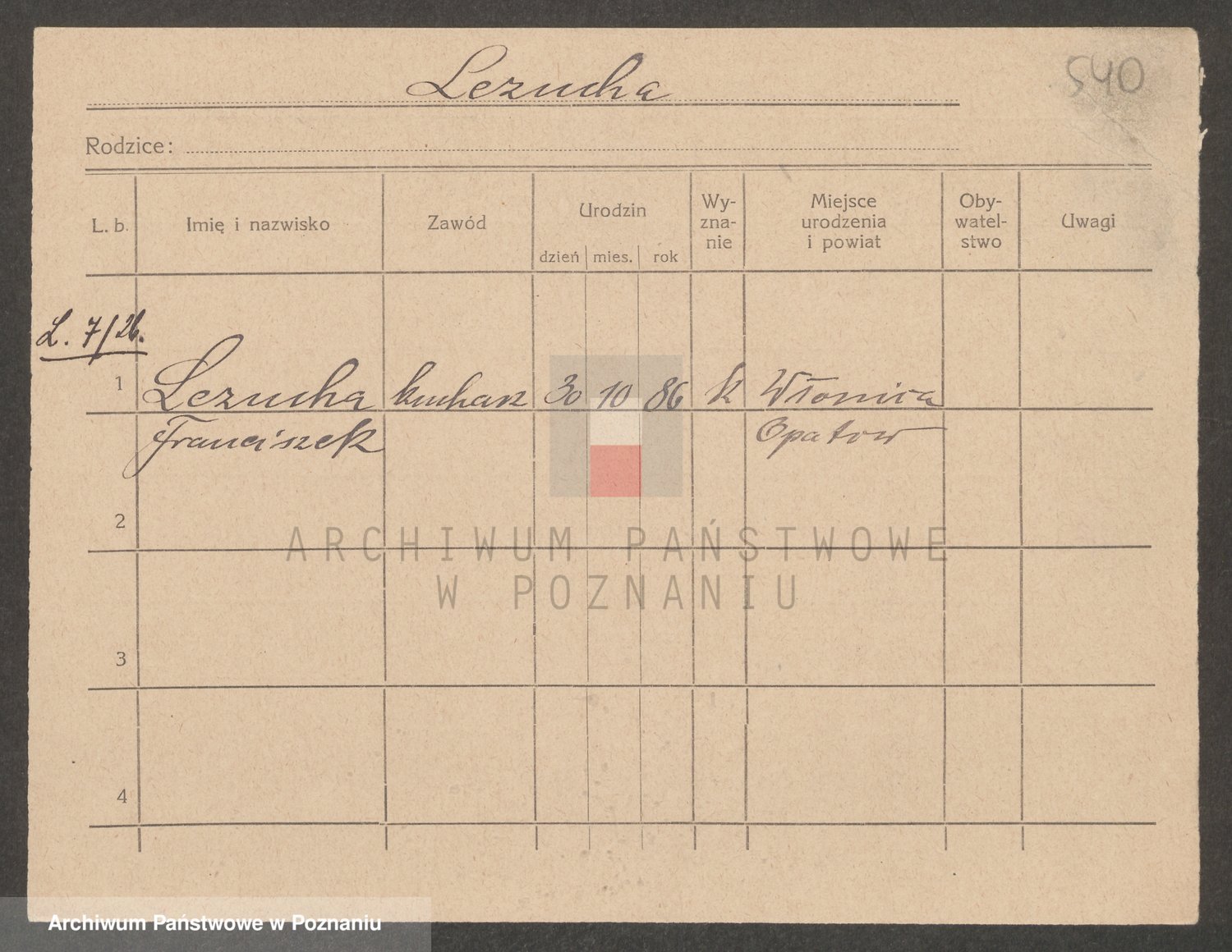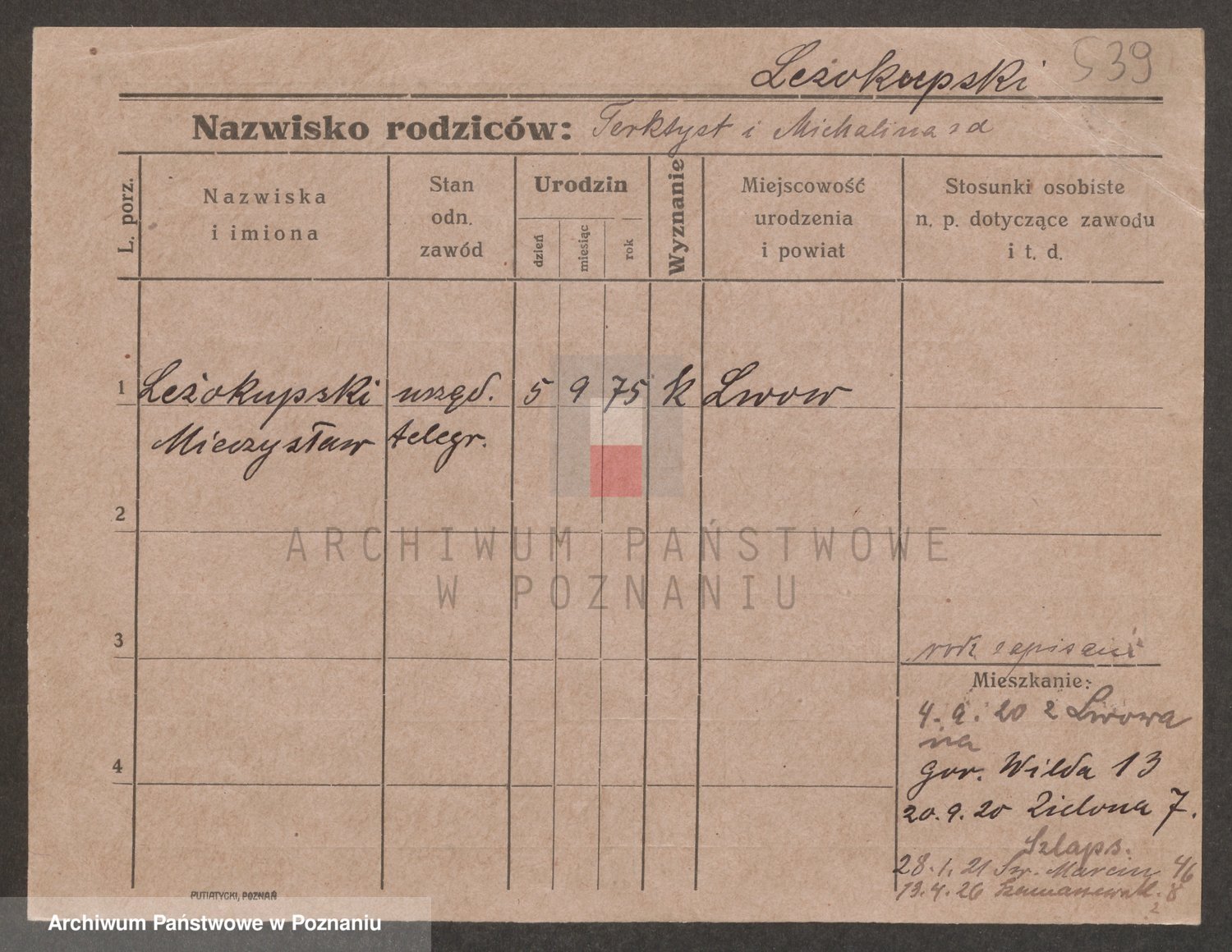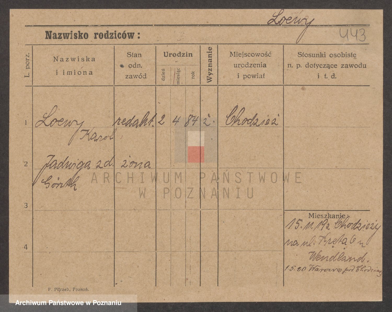 Podgląd karty osobowej dostępny jest po kliknięciu na nazwisko lub ikonkę karty. Można dokonywać powiększenia (ikony na górze) lub przechodzić między kolejnymi skanami (strzałki po bokach).