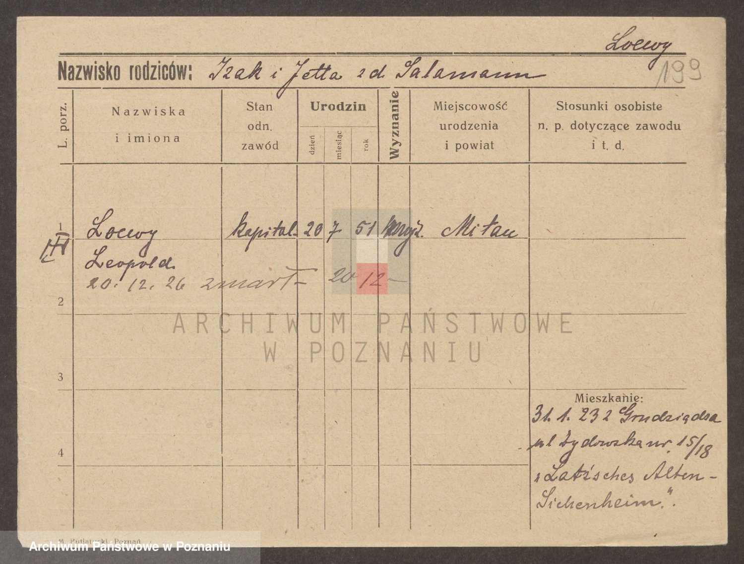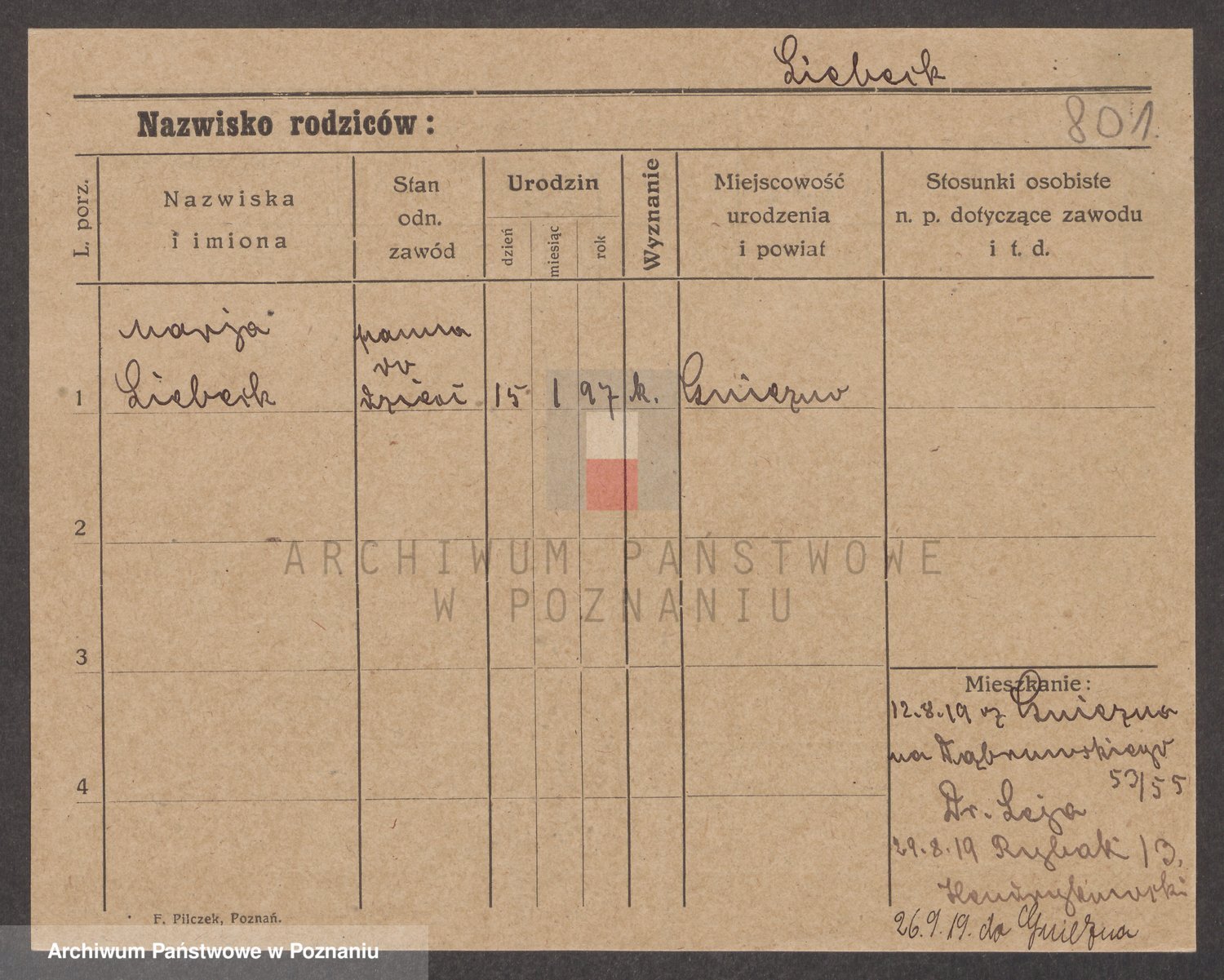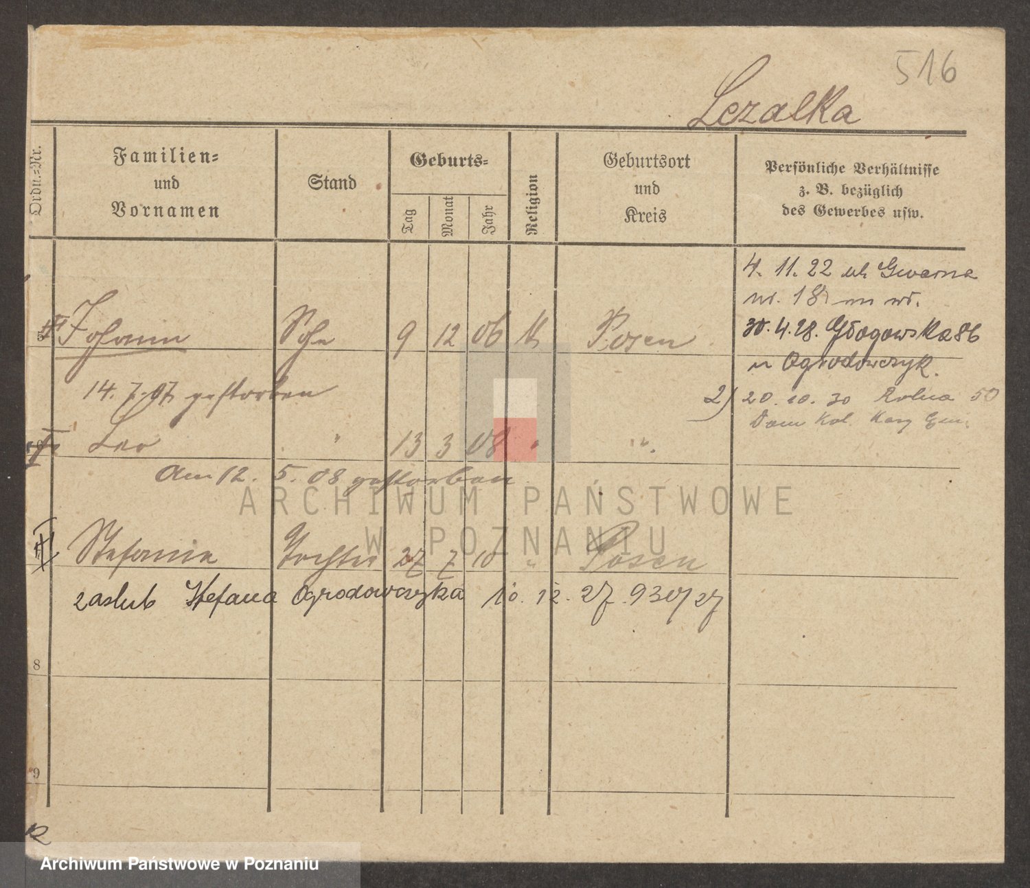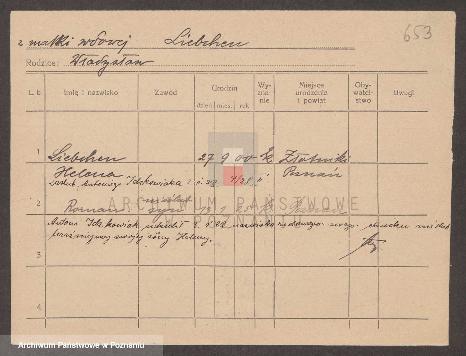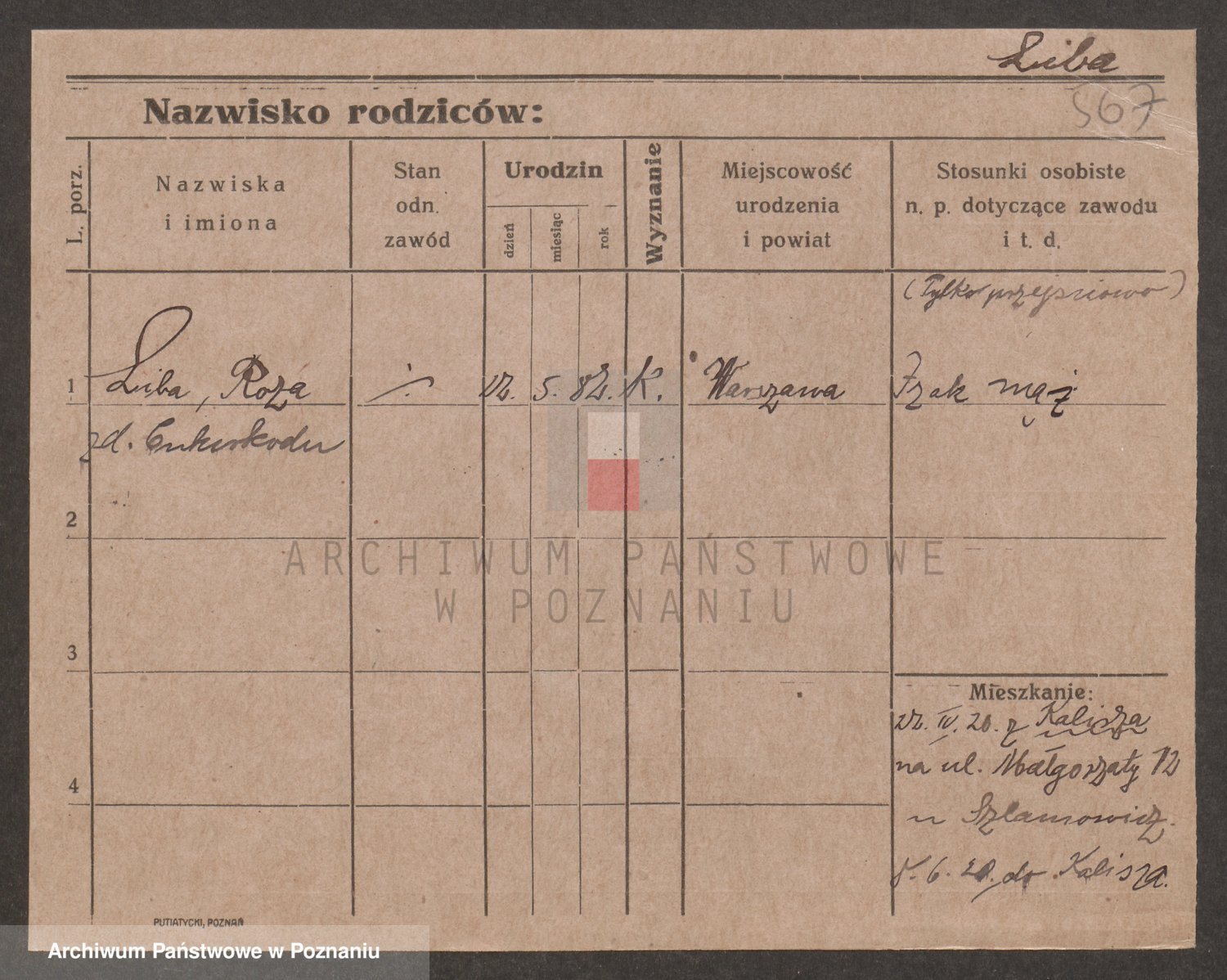 Podgląd karty osobowej dostępny jest po kliknięciu na nazwisko lub ikonkę karty. Można dokonywać powiększenia (ikony na górze) lub przechodzić między kolejnymi skanami (strzałki po bokach).