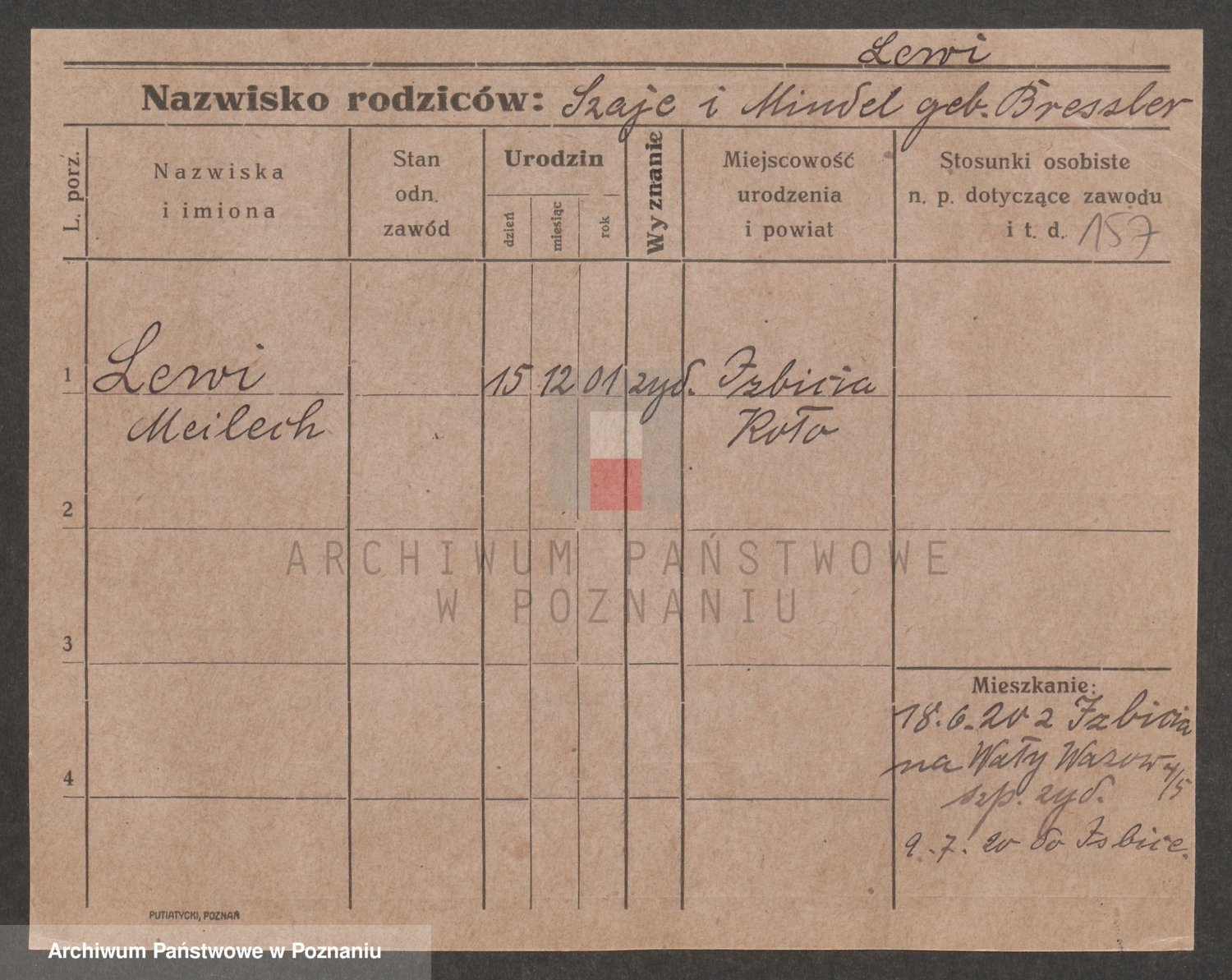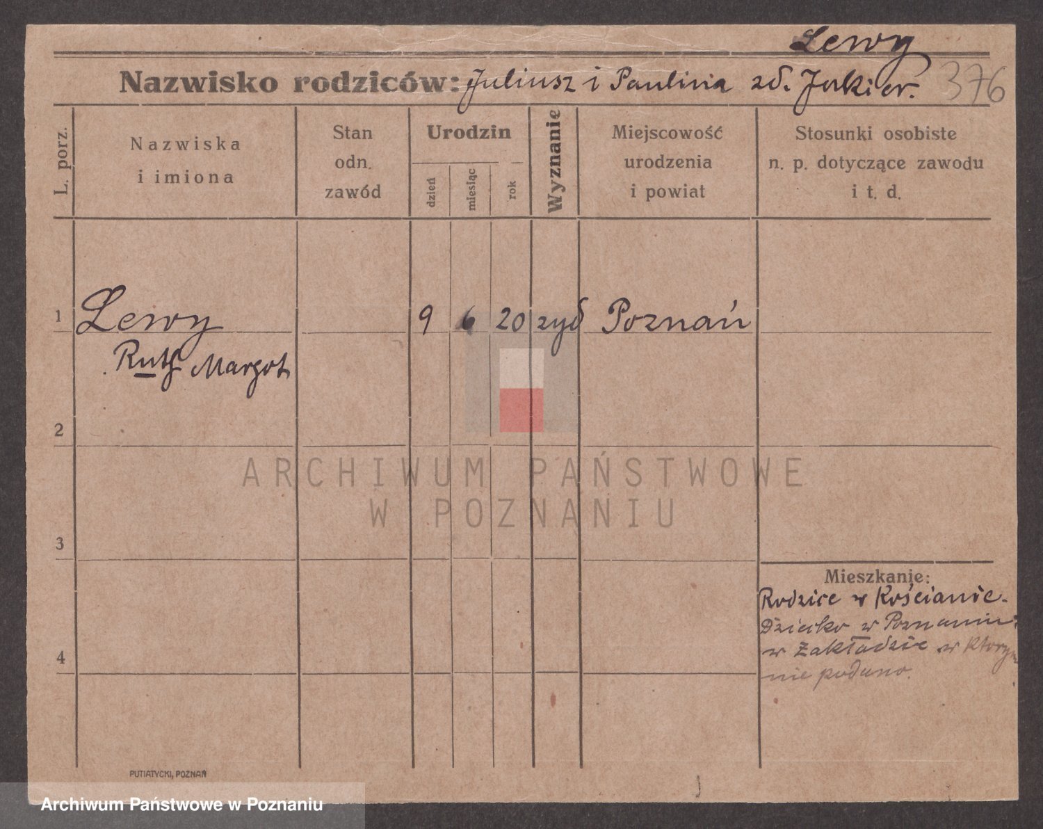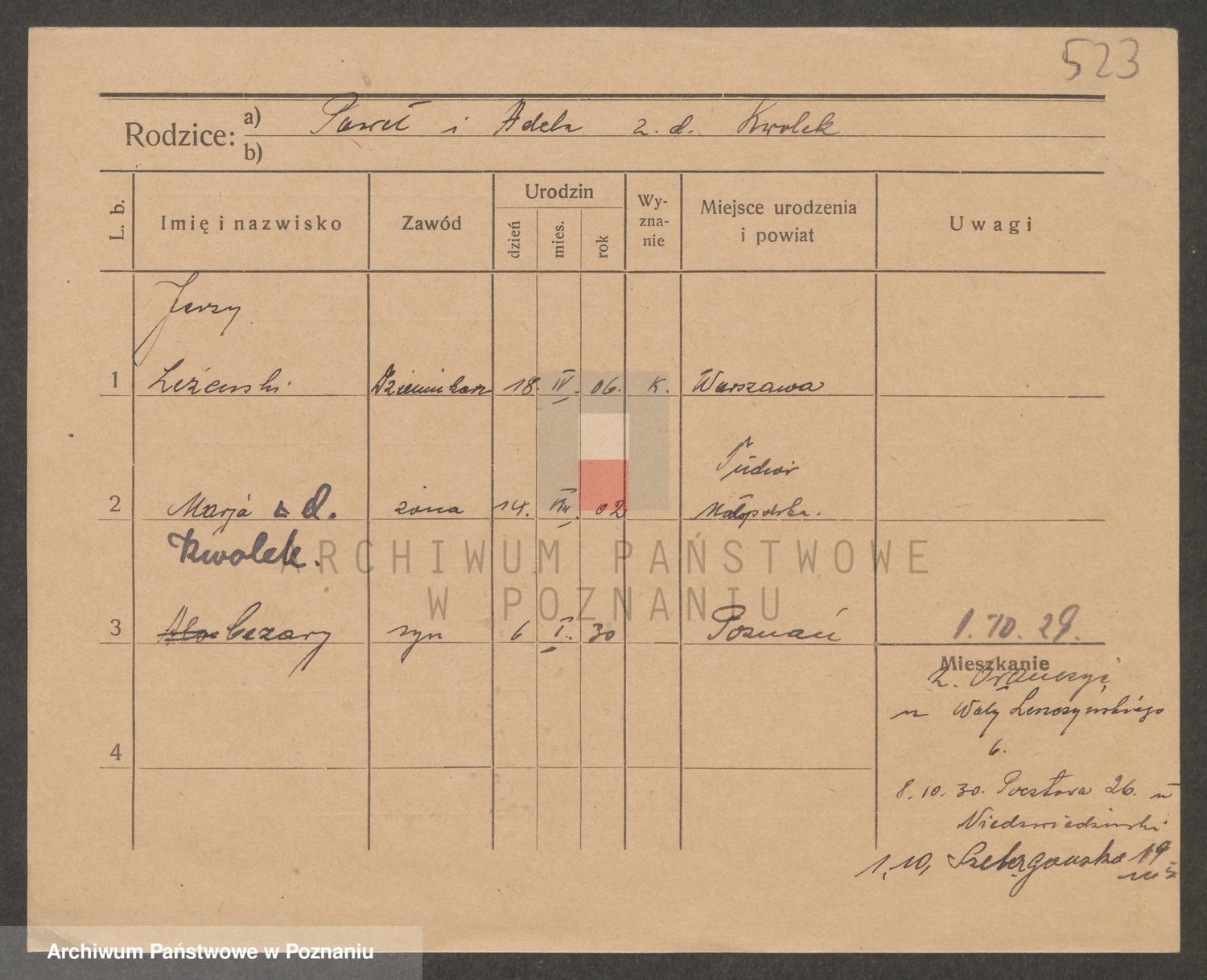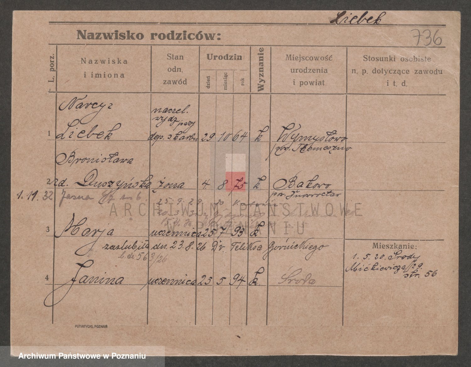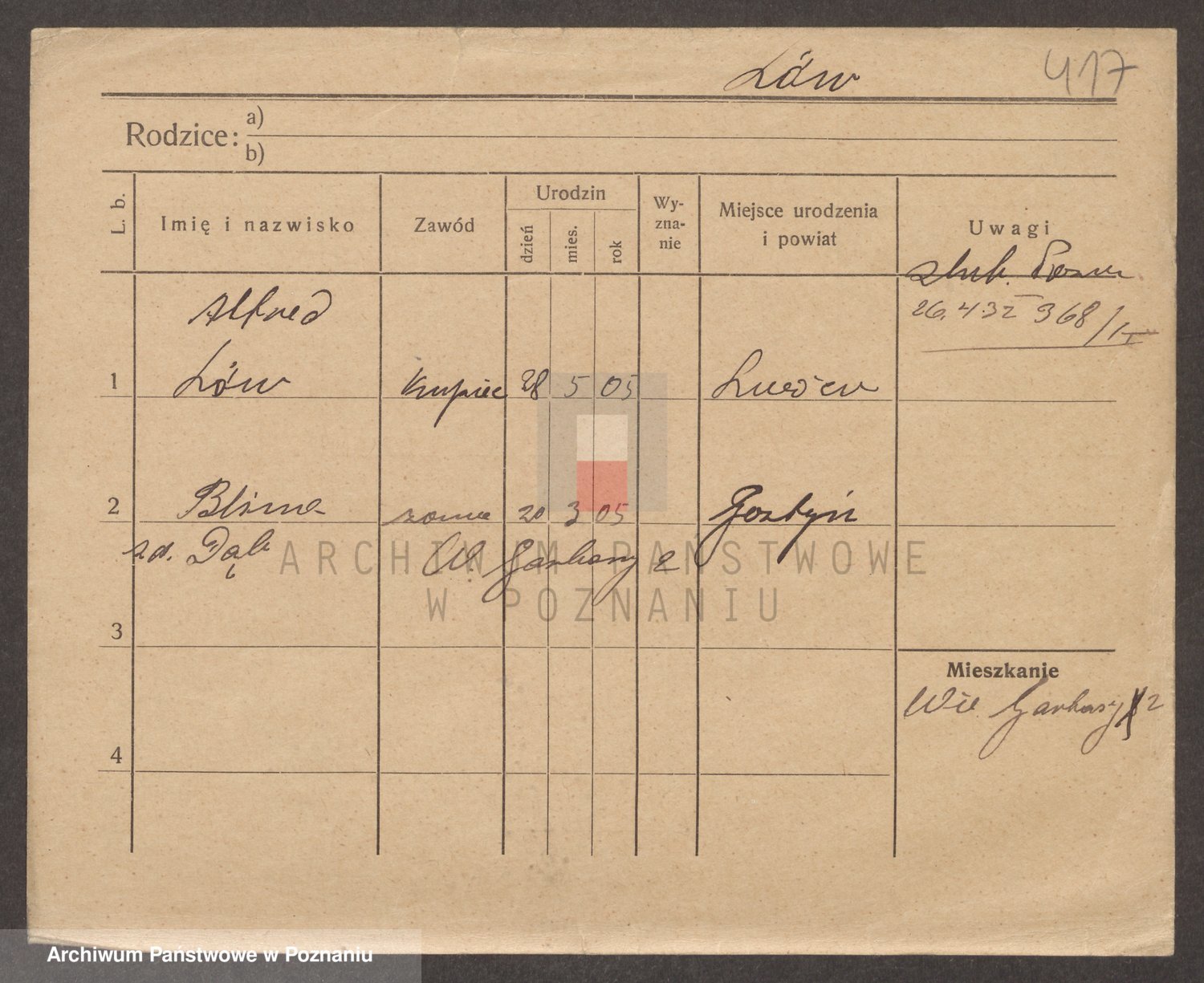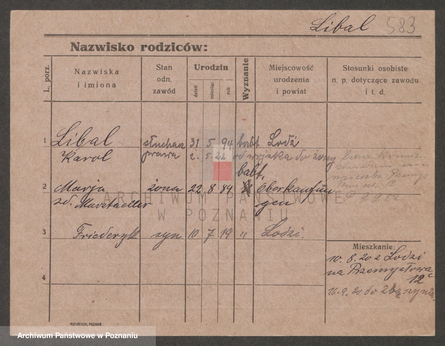 Podgląd karty osobowej dostępny jest po kliknięciu na nazwisko lub ikonkę karty. Można dokonywać powiększenia (ikony na górze) lub przechodzić między kolejnymi skanami (strzałki po bokach).