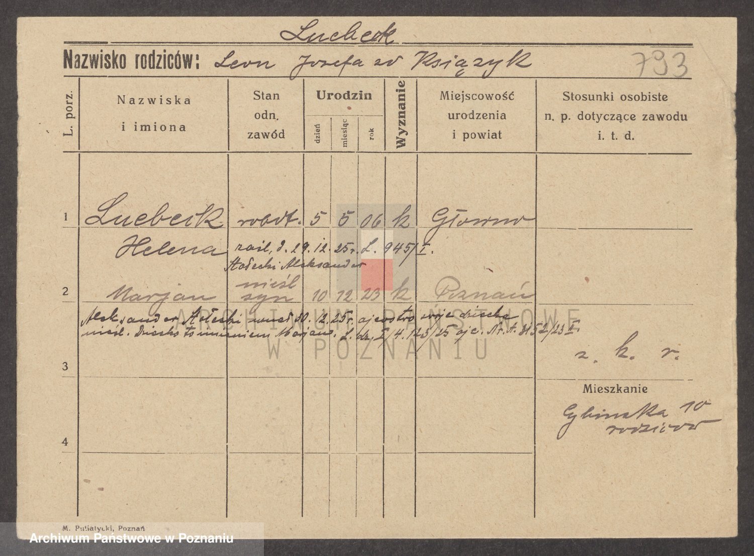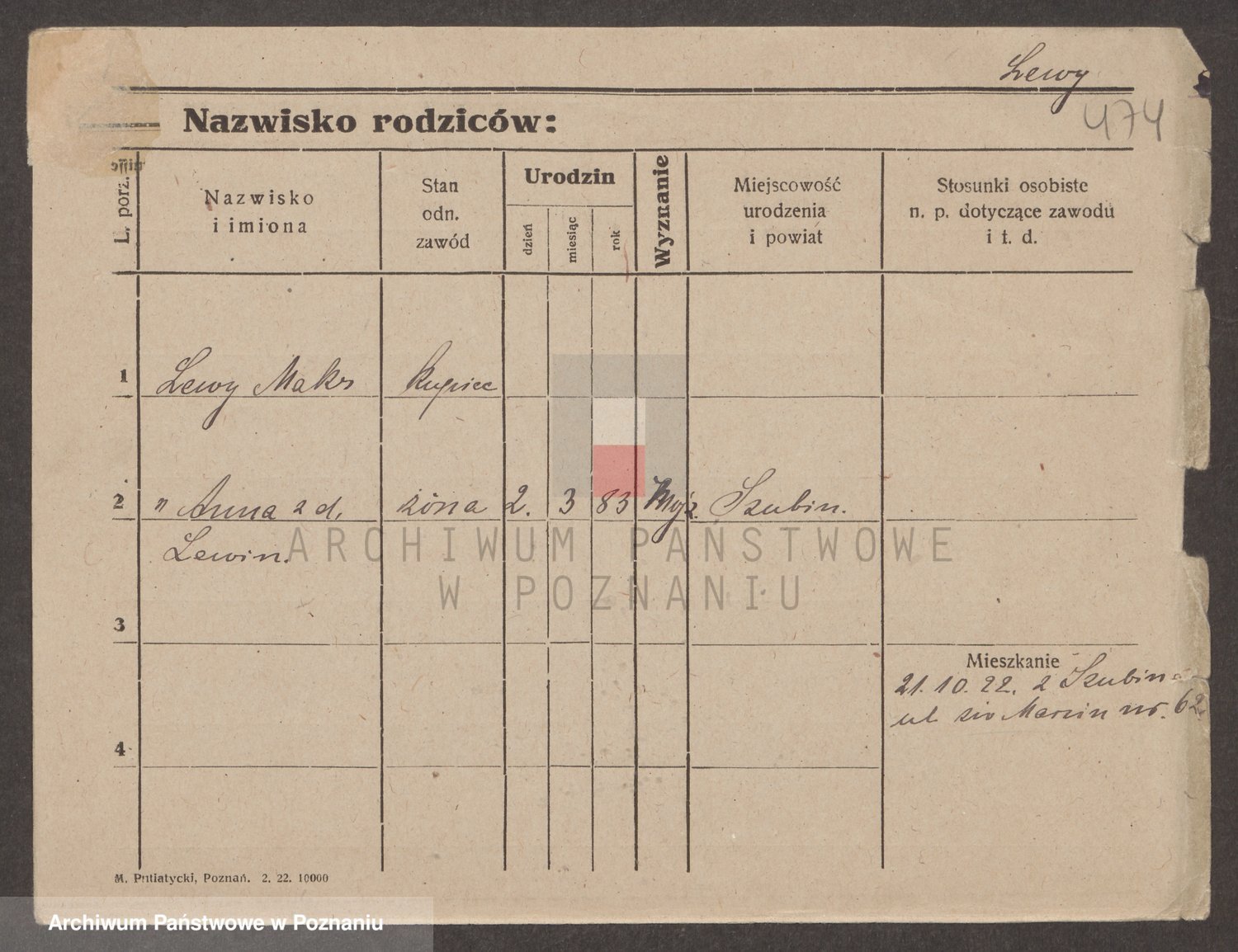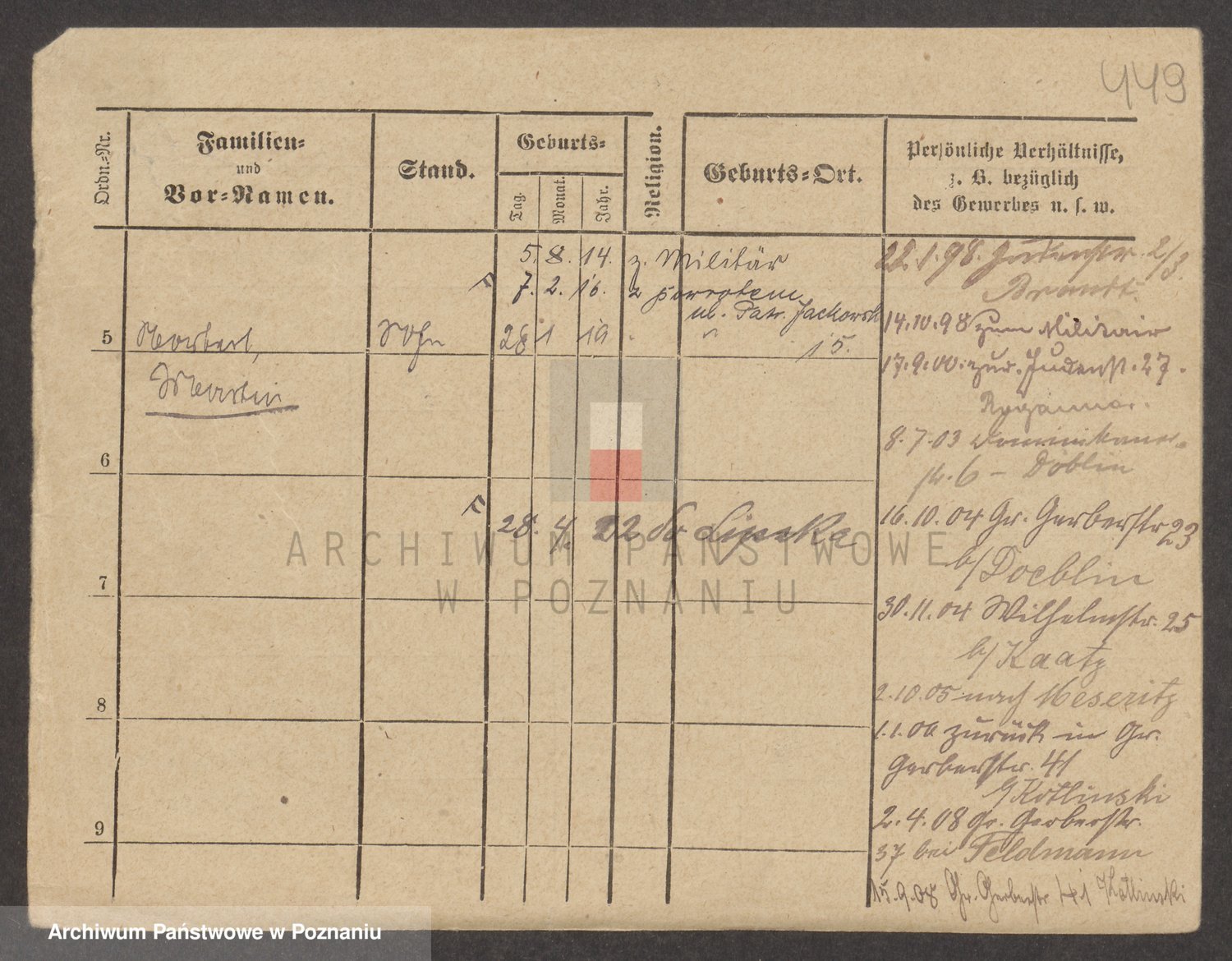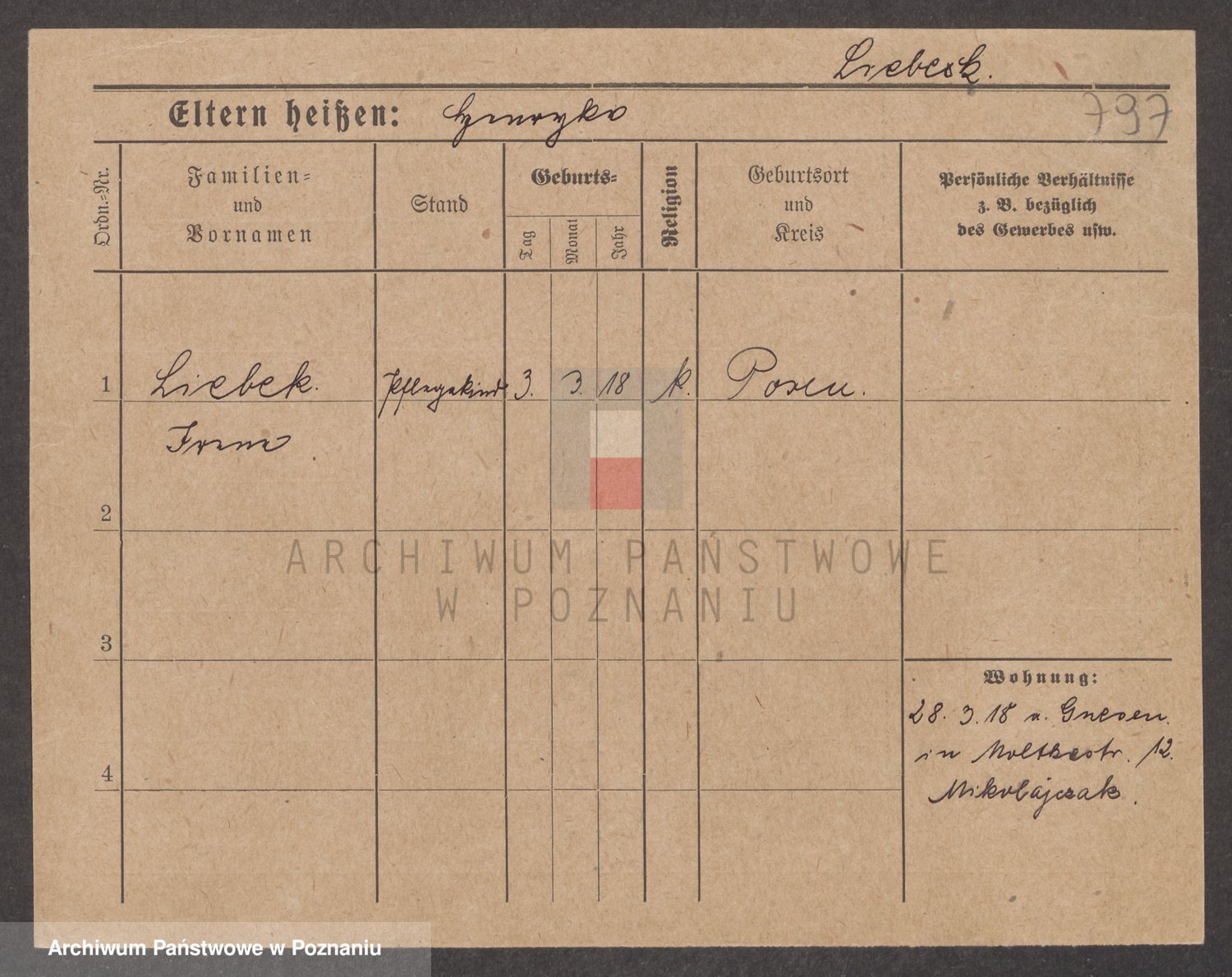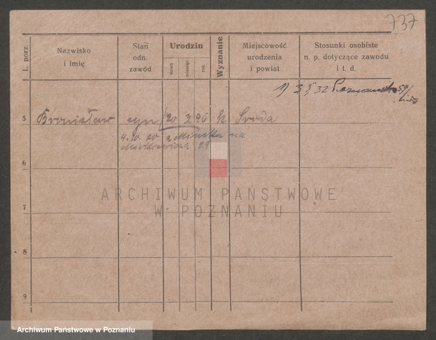 Podgląd karty osobowej dostępny jest po kliknięciu na nazwisko lub ikonkę karty. Można dokonywać powiększenia (ikony na górze) lub przechodzić między kolejnymi skanami (strzałki po bokach).