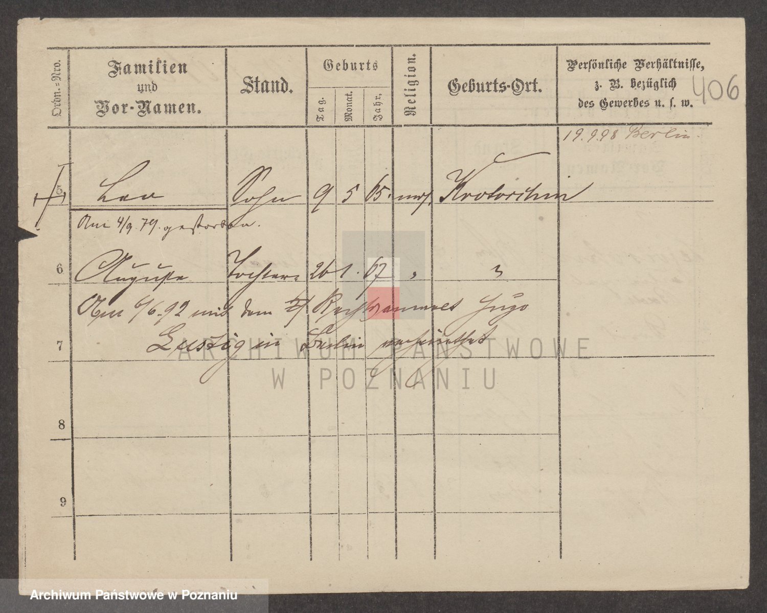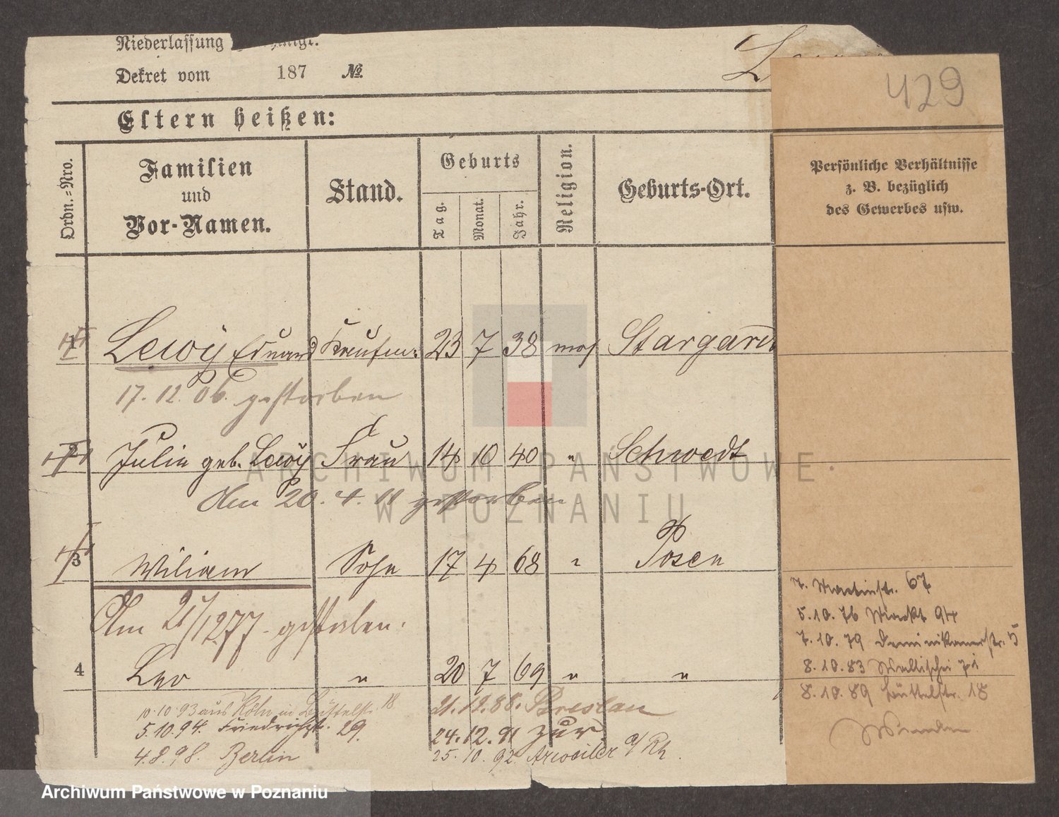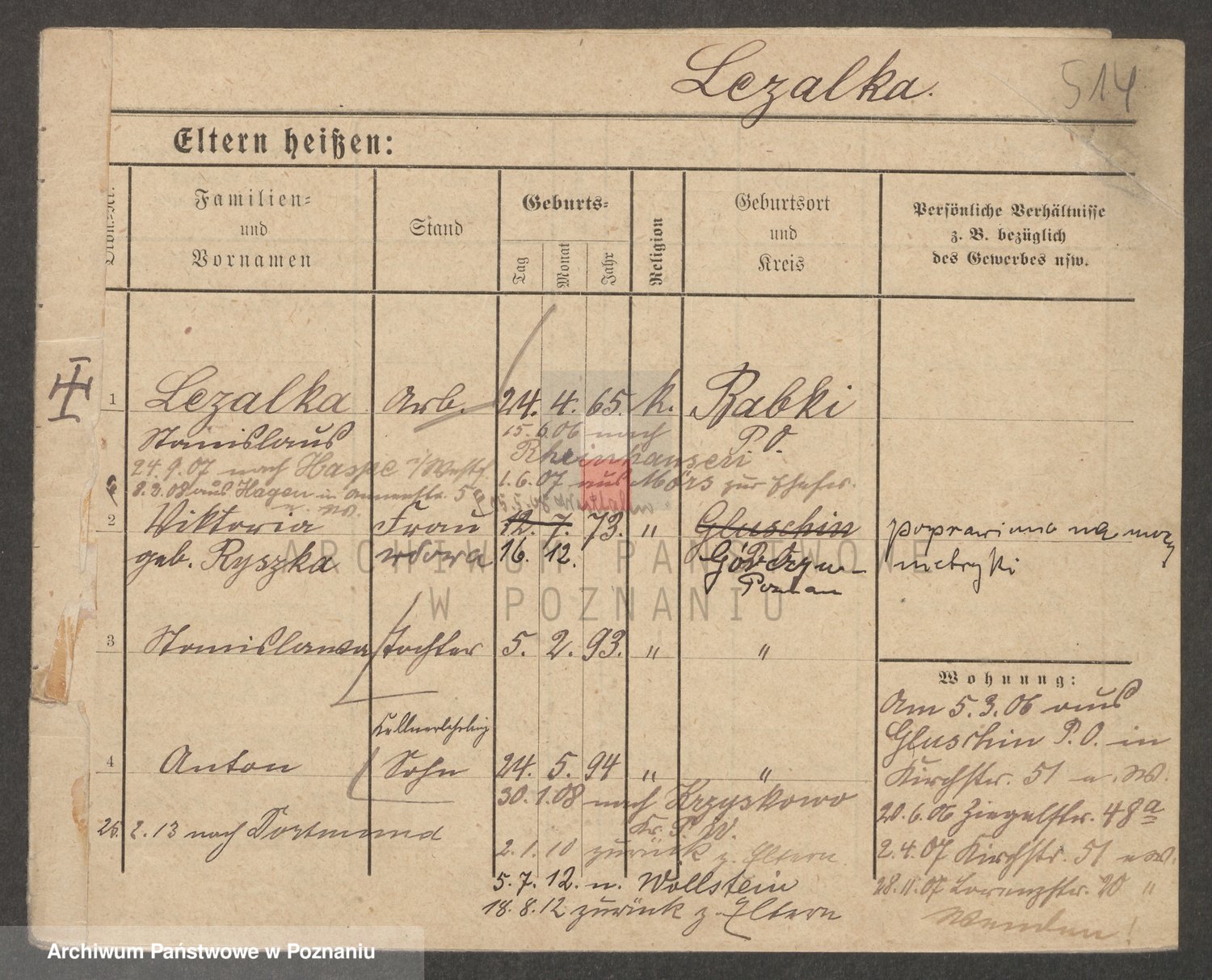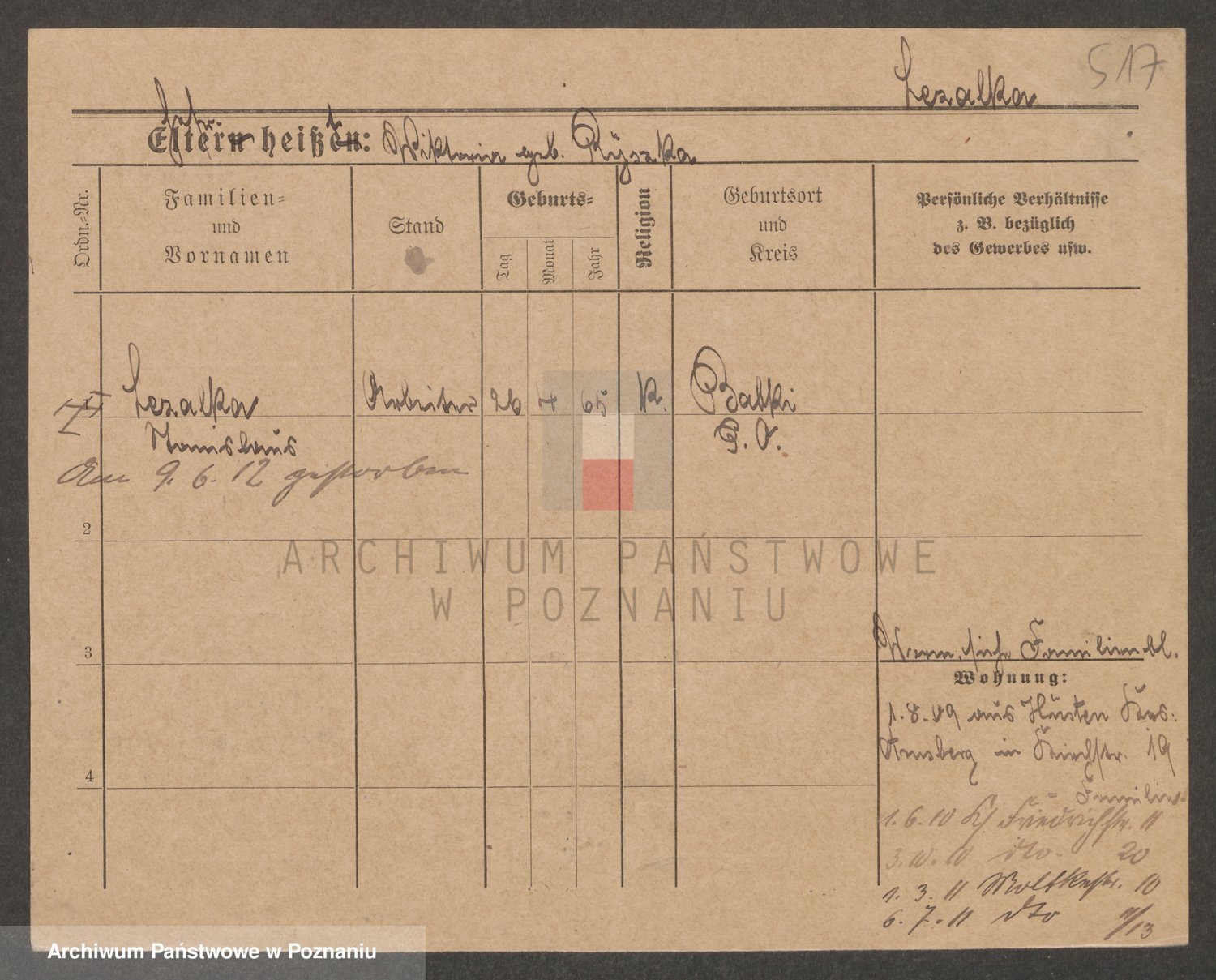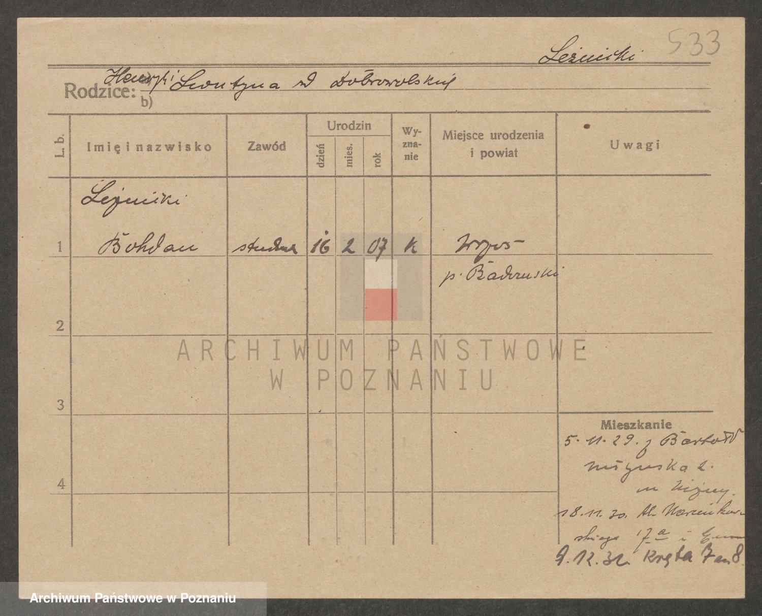 Podgląd karty osobowej dostępny jest po kliknięciu na nazwisko lub ikonkę karty. Można dokonywać powiększenia (ikony na górze) lub przechodzić między kolejnymi skanami (strzałki po bokach).