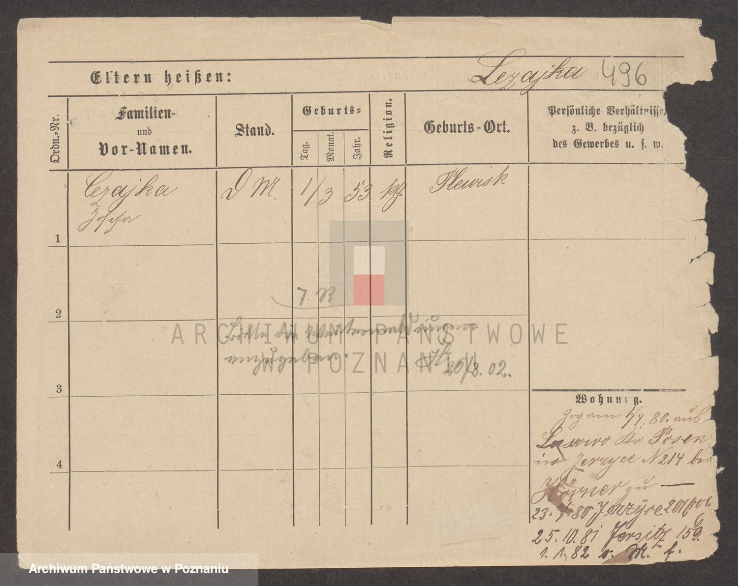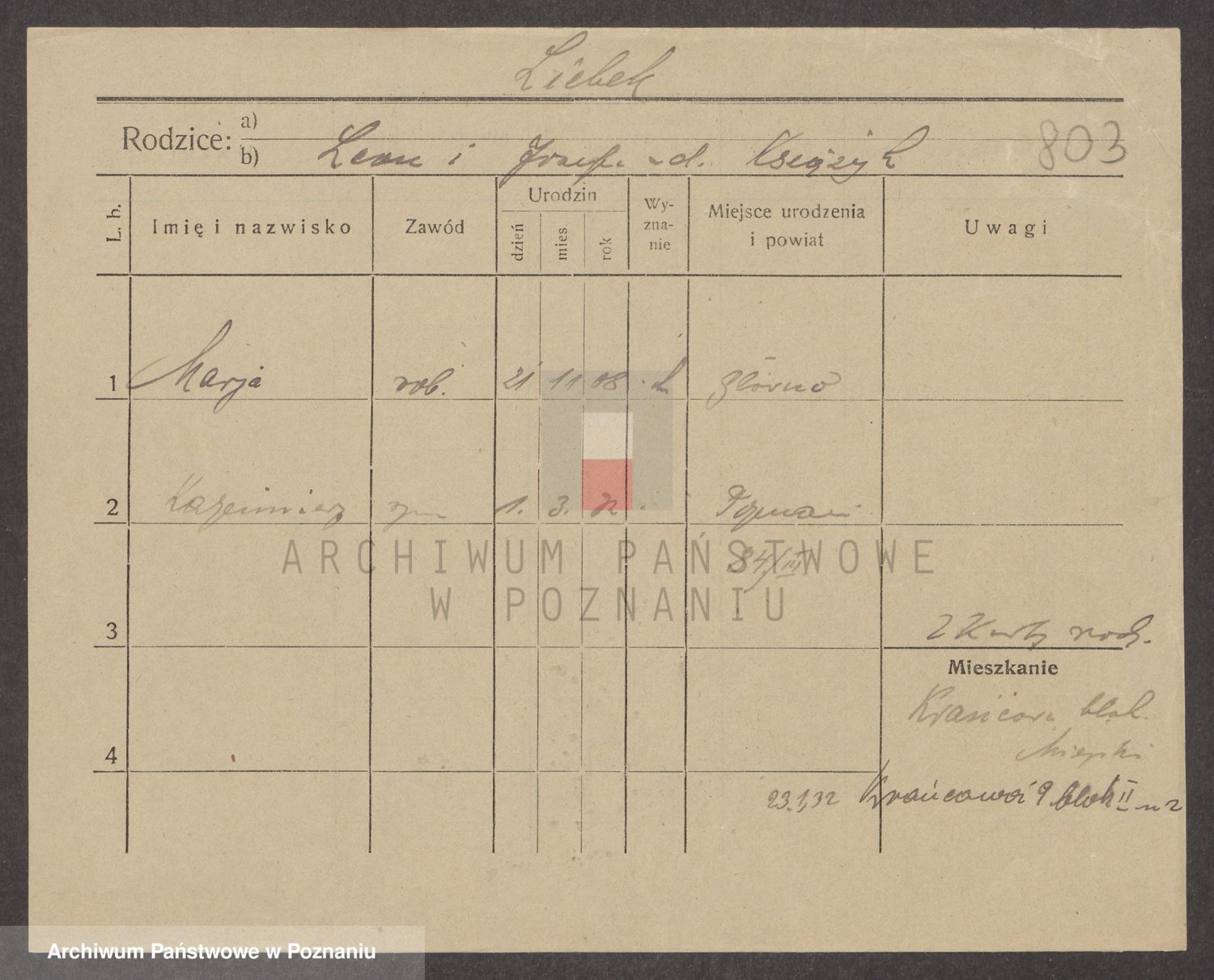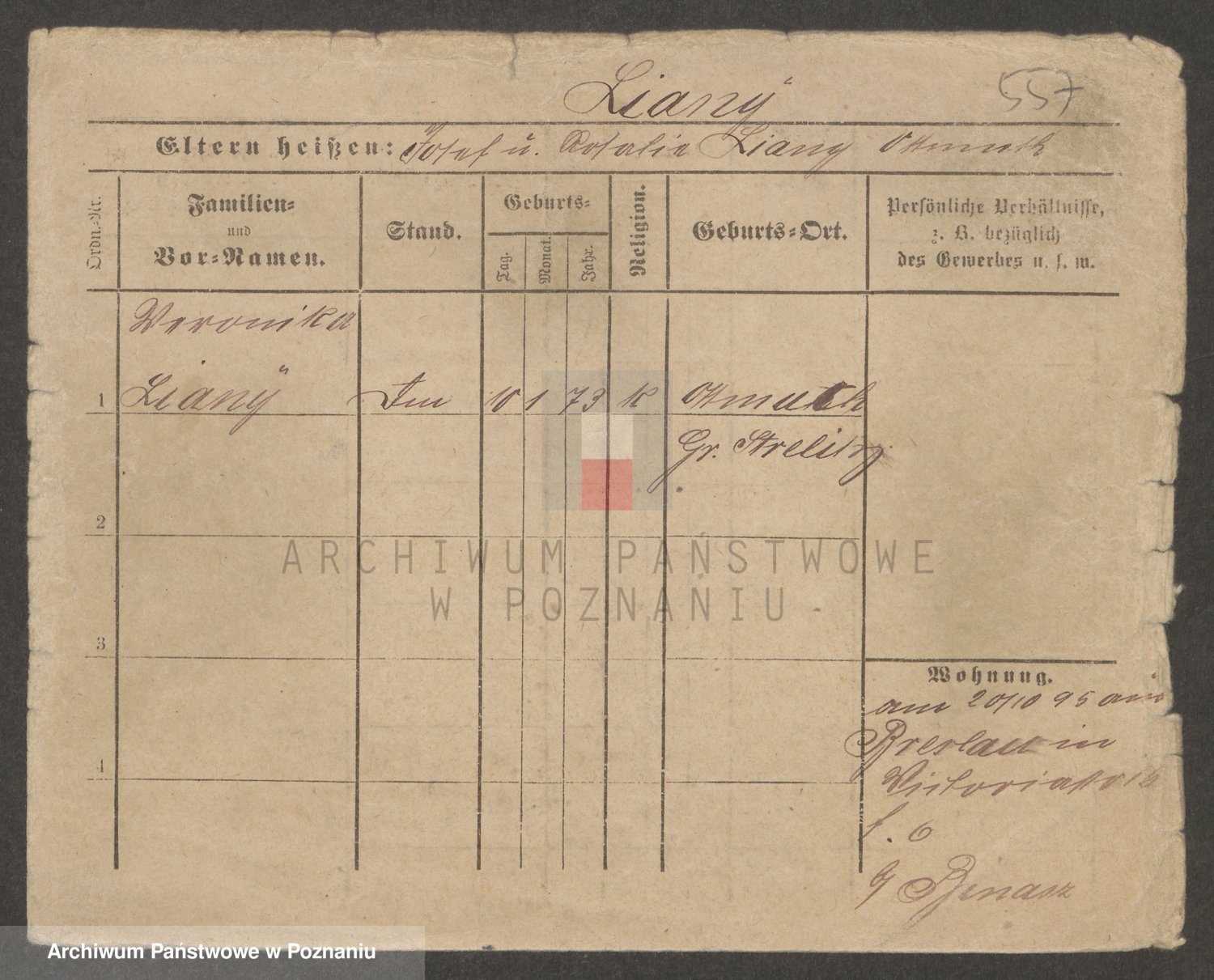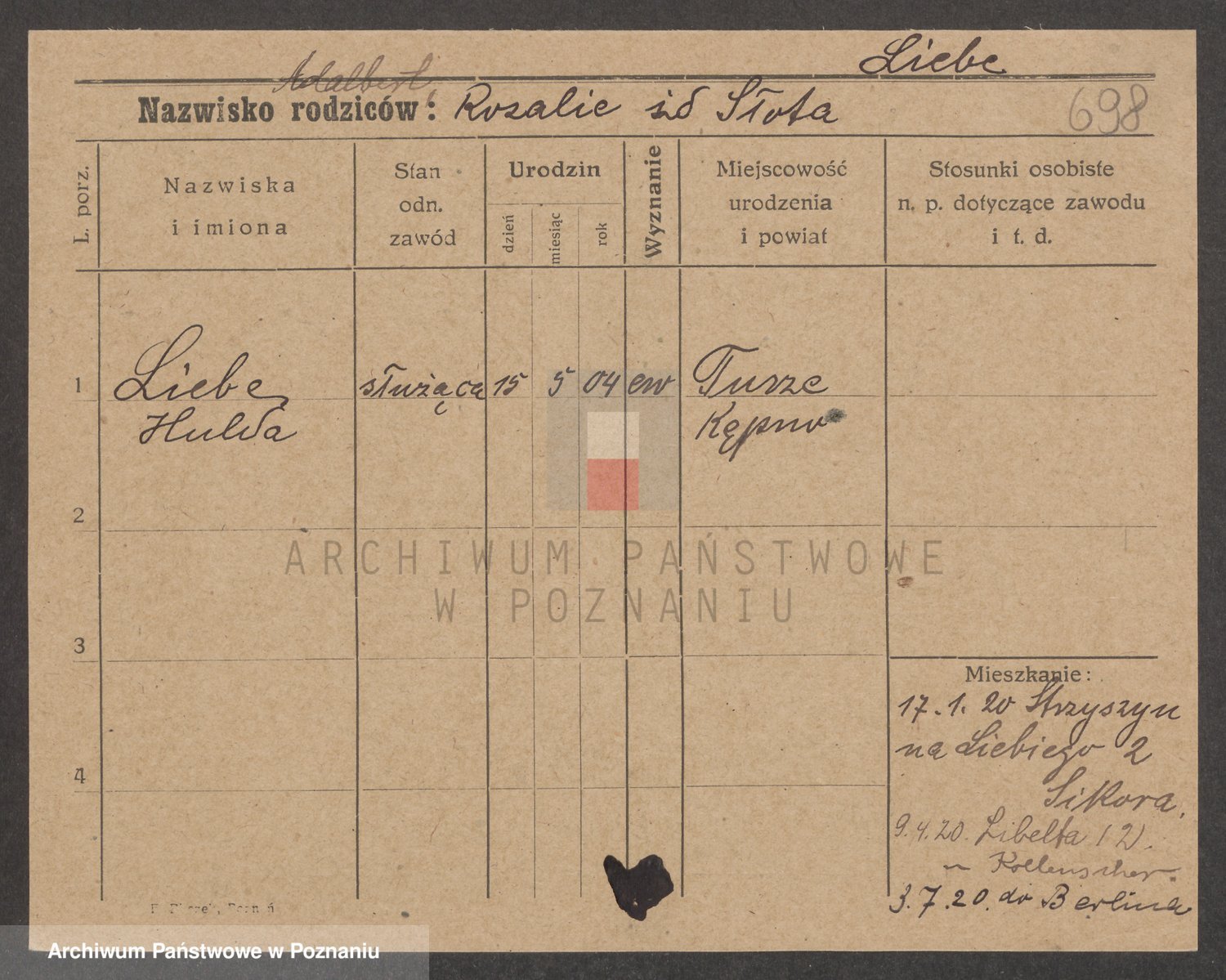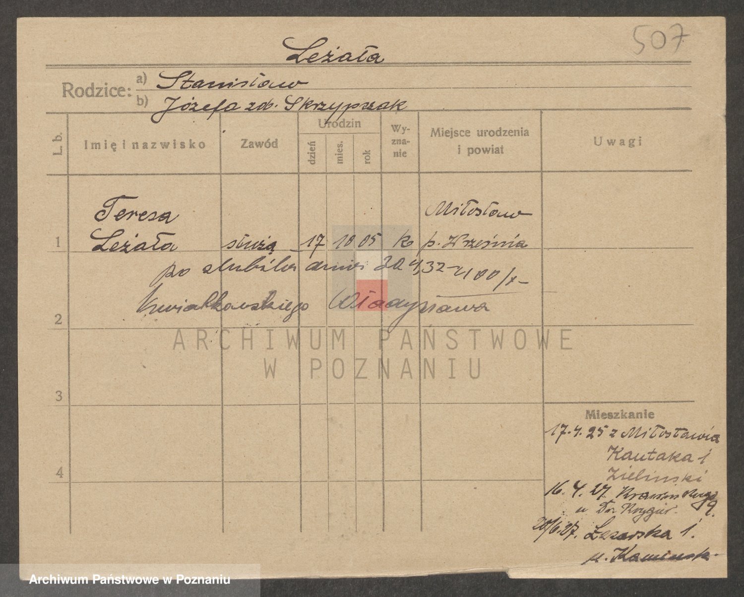 Podgląd karty osobowej dostępny jest po kliknięciu na nazwisko lub ikonkę karty. Można dokonywać powiększenia (ikony na górze) lub przechodzić między kolejnymi skanami (strzałki po bokach).