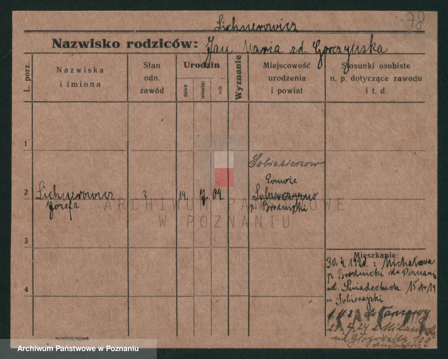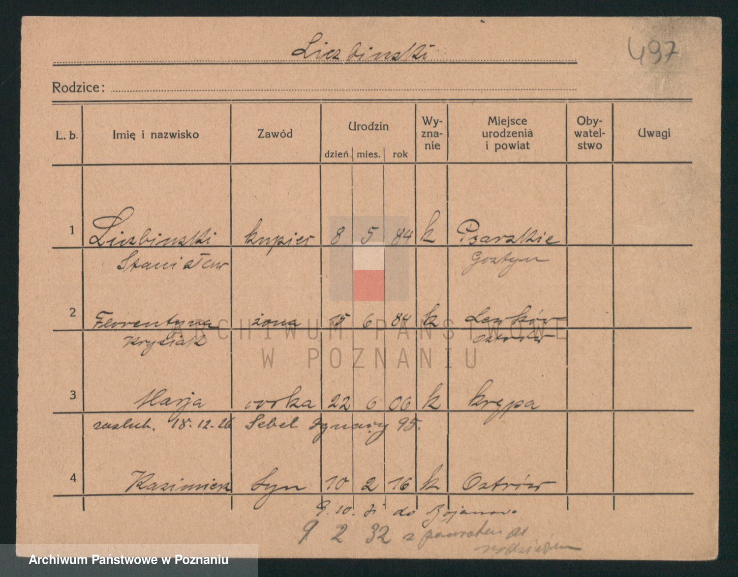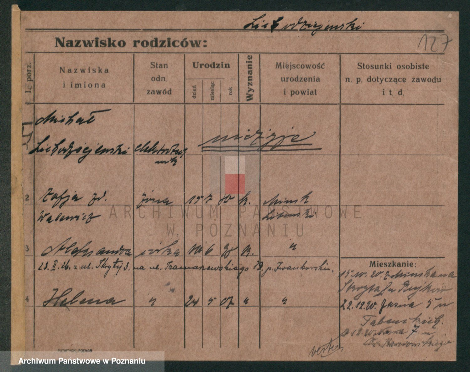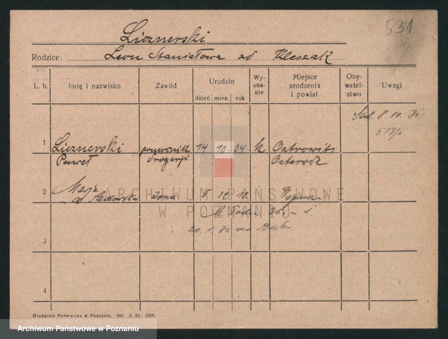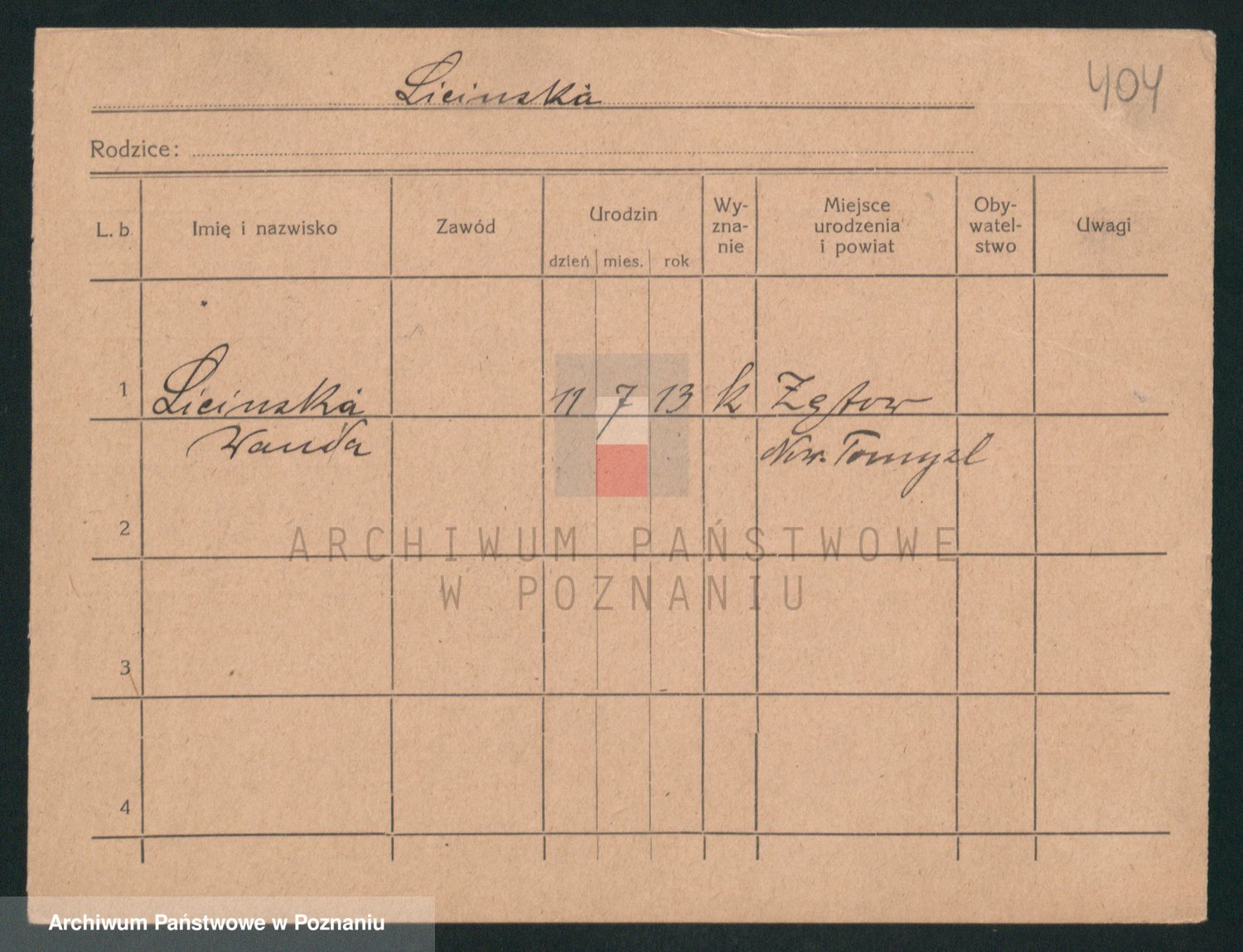 Podgląd karty osobowej dostępny jest po kliknięciu na nazwisko lub ikonkę karty. Można dokonywać powiększenia (ikony na górze) lub przechodzić między kolejnymi skanami (strzałki po bokach).