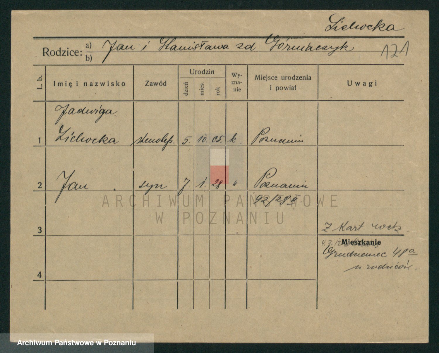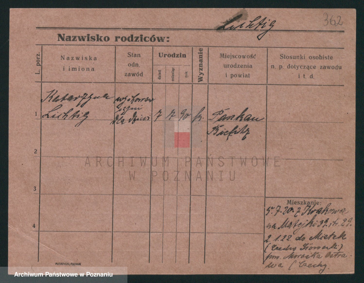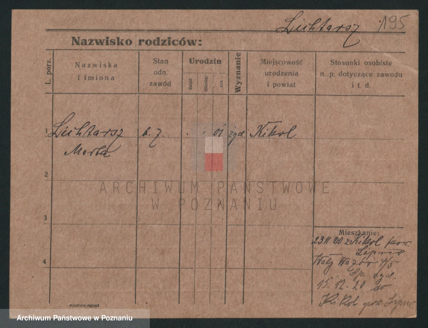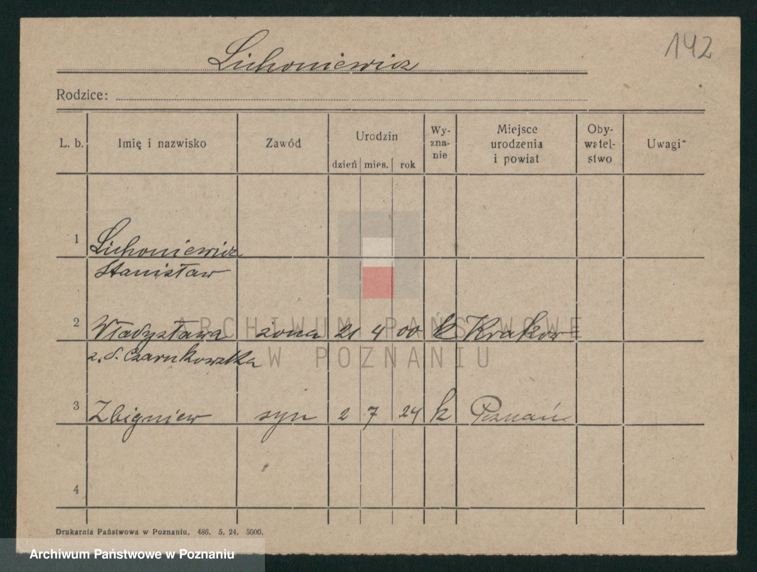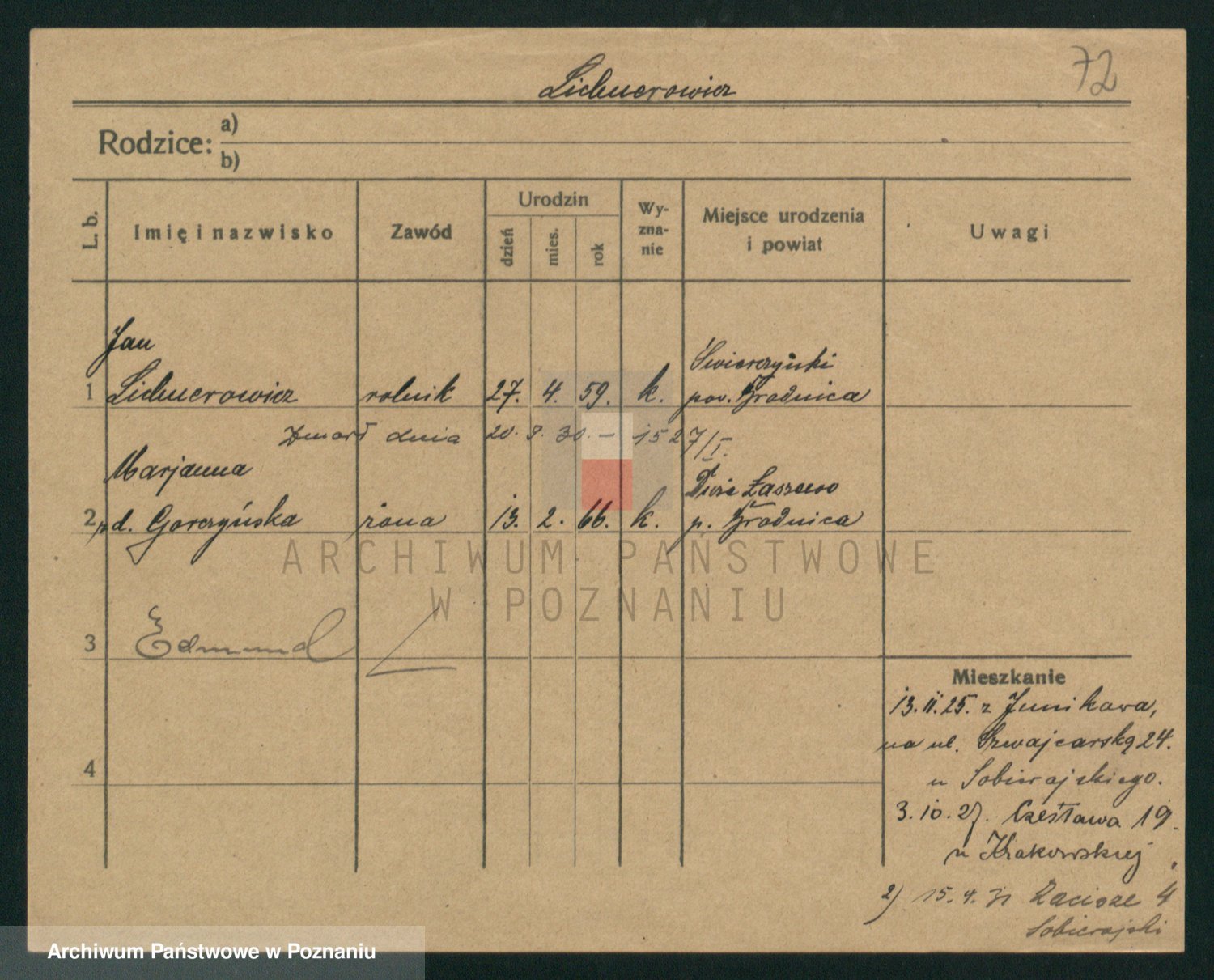 Podgląd karty osobowej dostępny jest po kliknięciu na nazwisko lub ikonkę karty. Można dokonywać powiększenia (ikony na górze) lub przechodzić między kolejnymi skanami (strzałki po bokach).