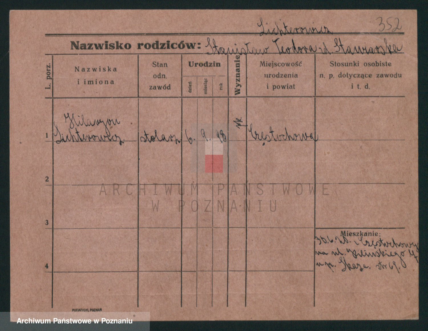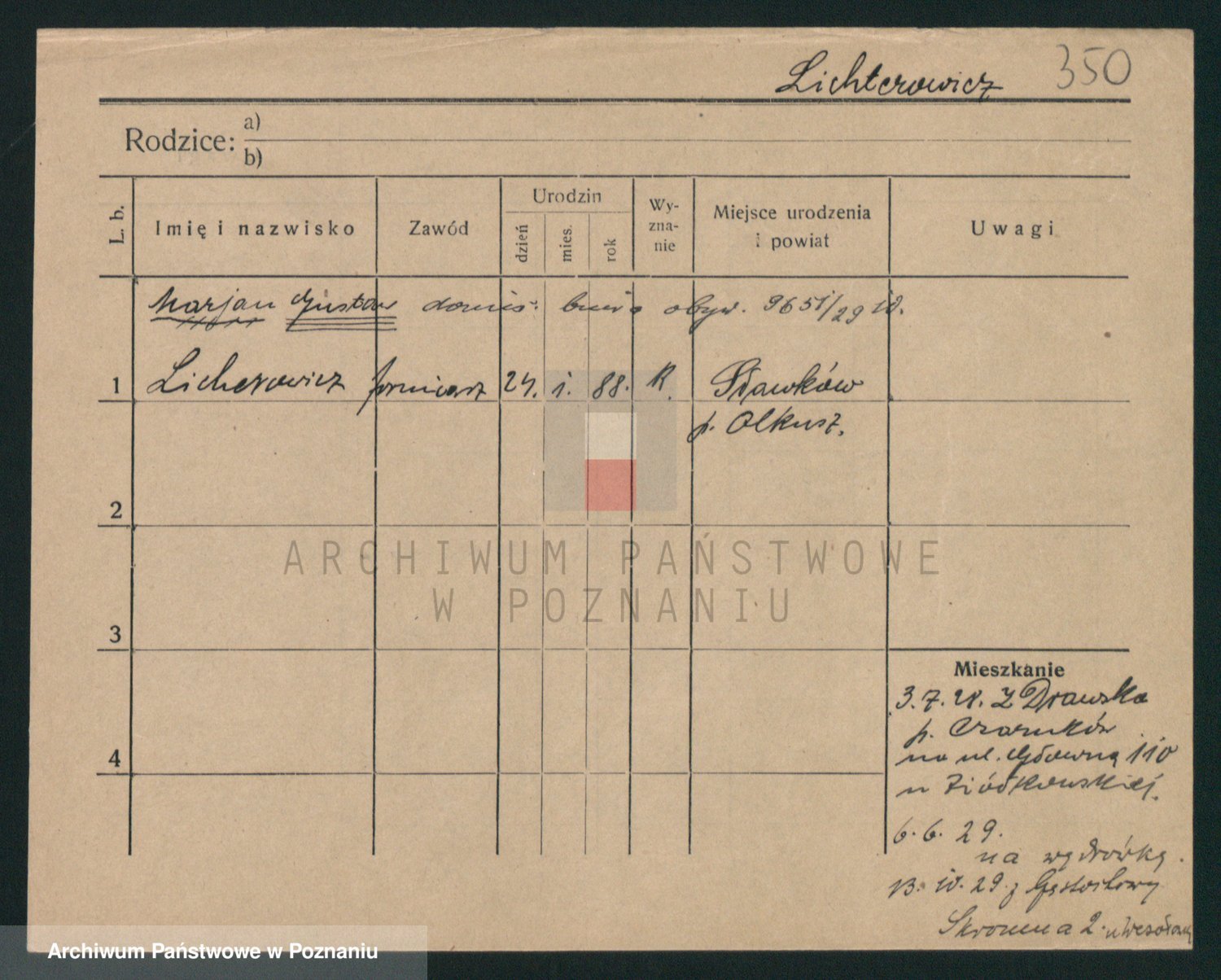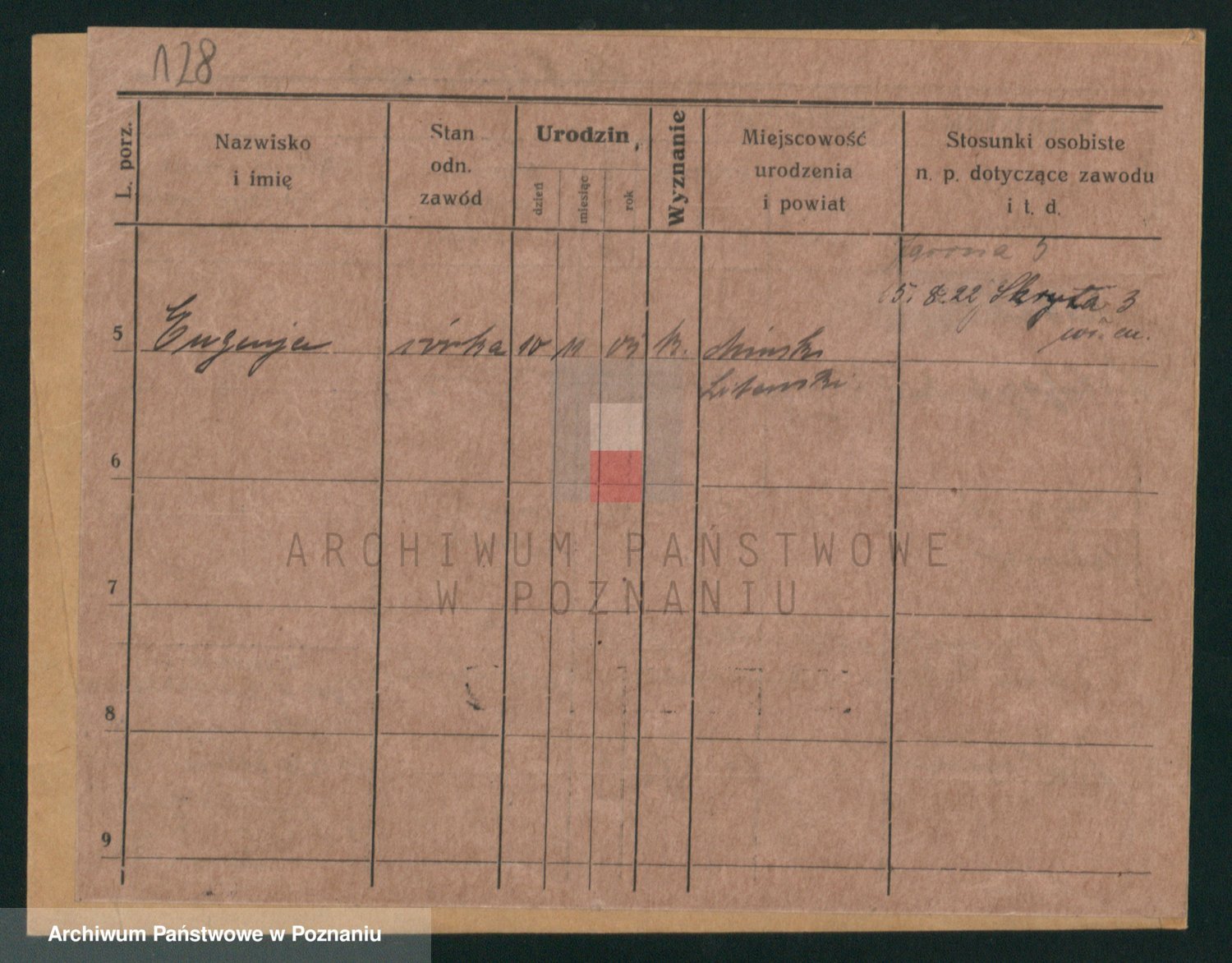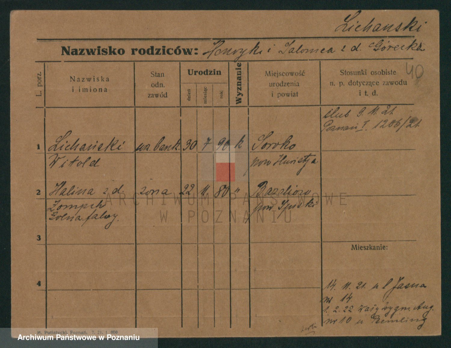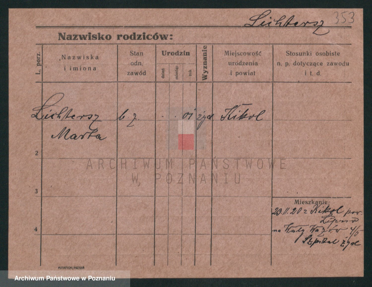 Podgląd karty osobowej dostępny jest po kliknięciu na nazwisko lub ikonkę karty. Można dokonywać powiększenia (ikony na górze) lub przechodzić między kolejnymi skanami (strzałki po bokach).