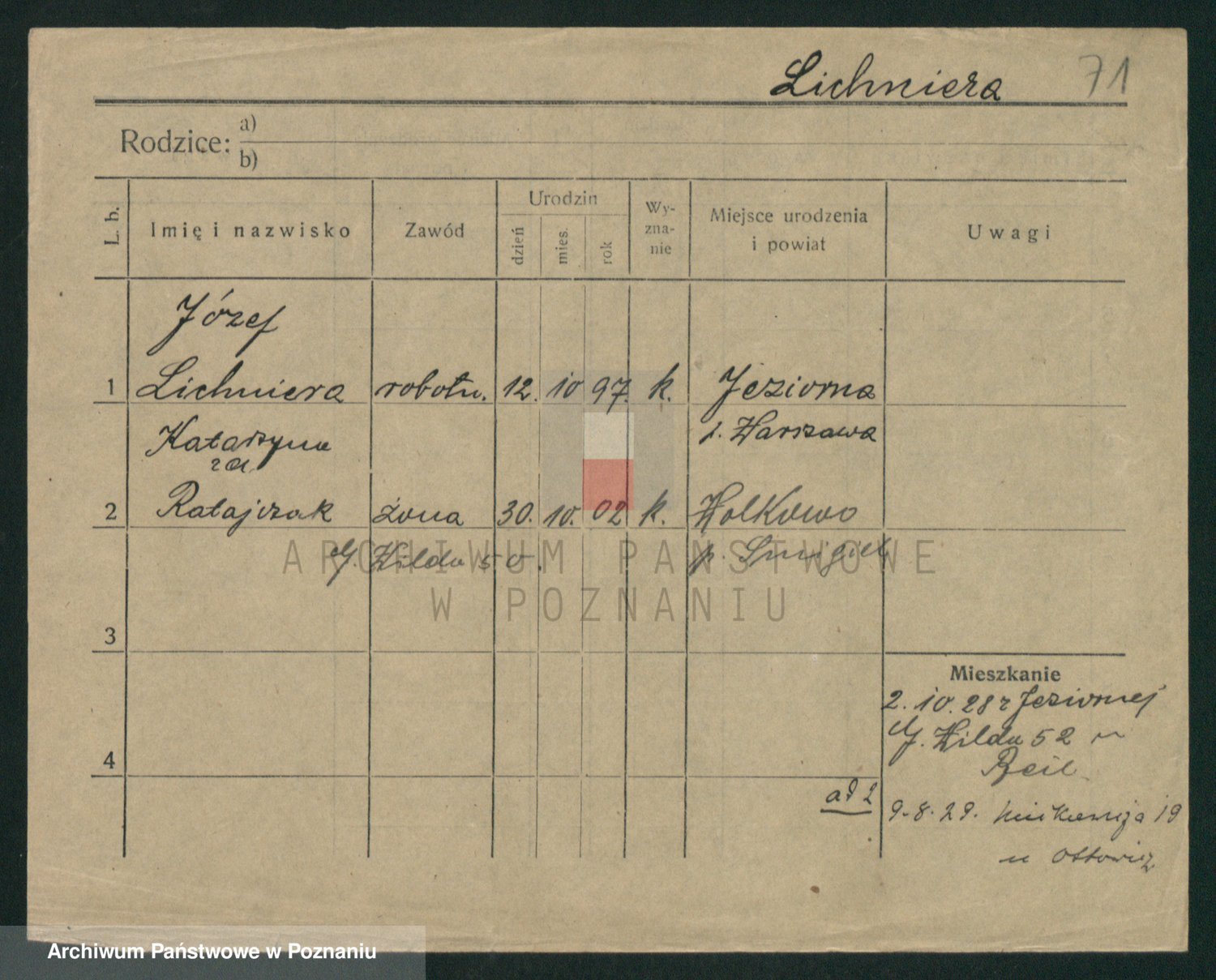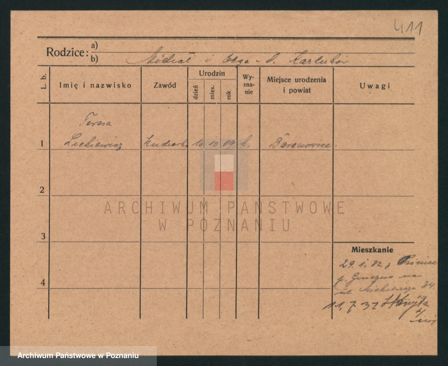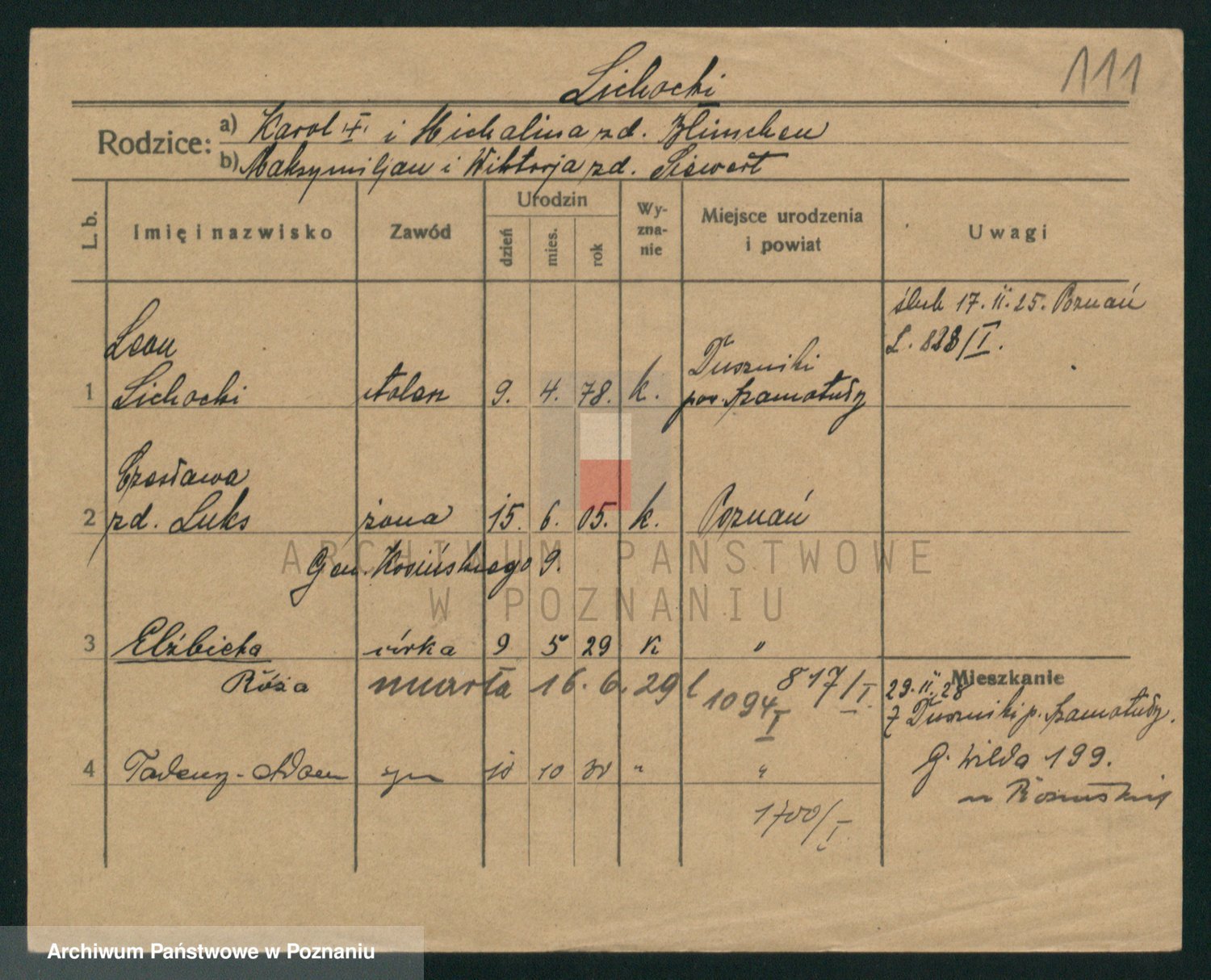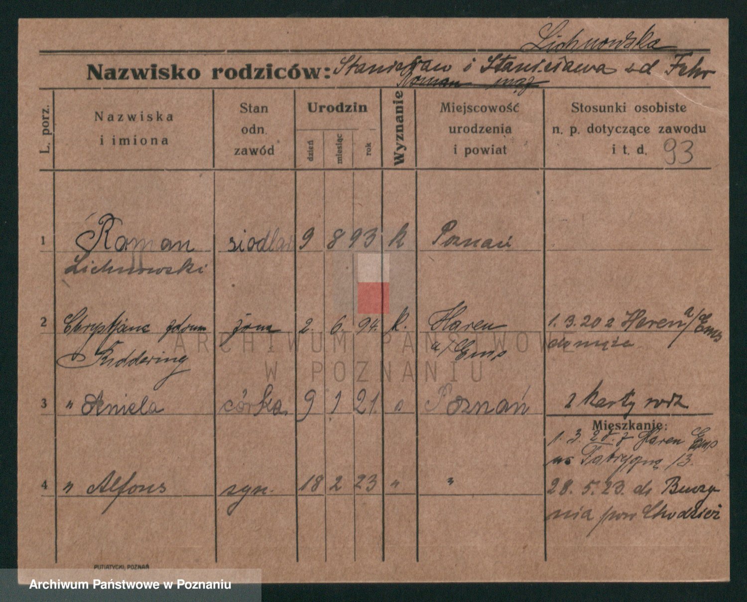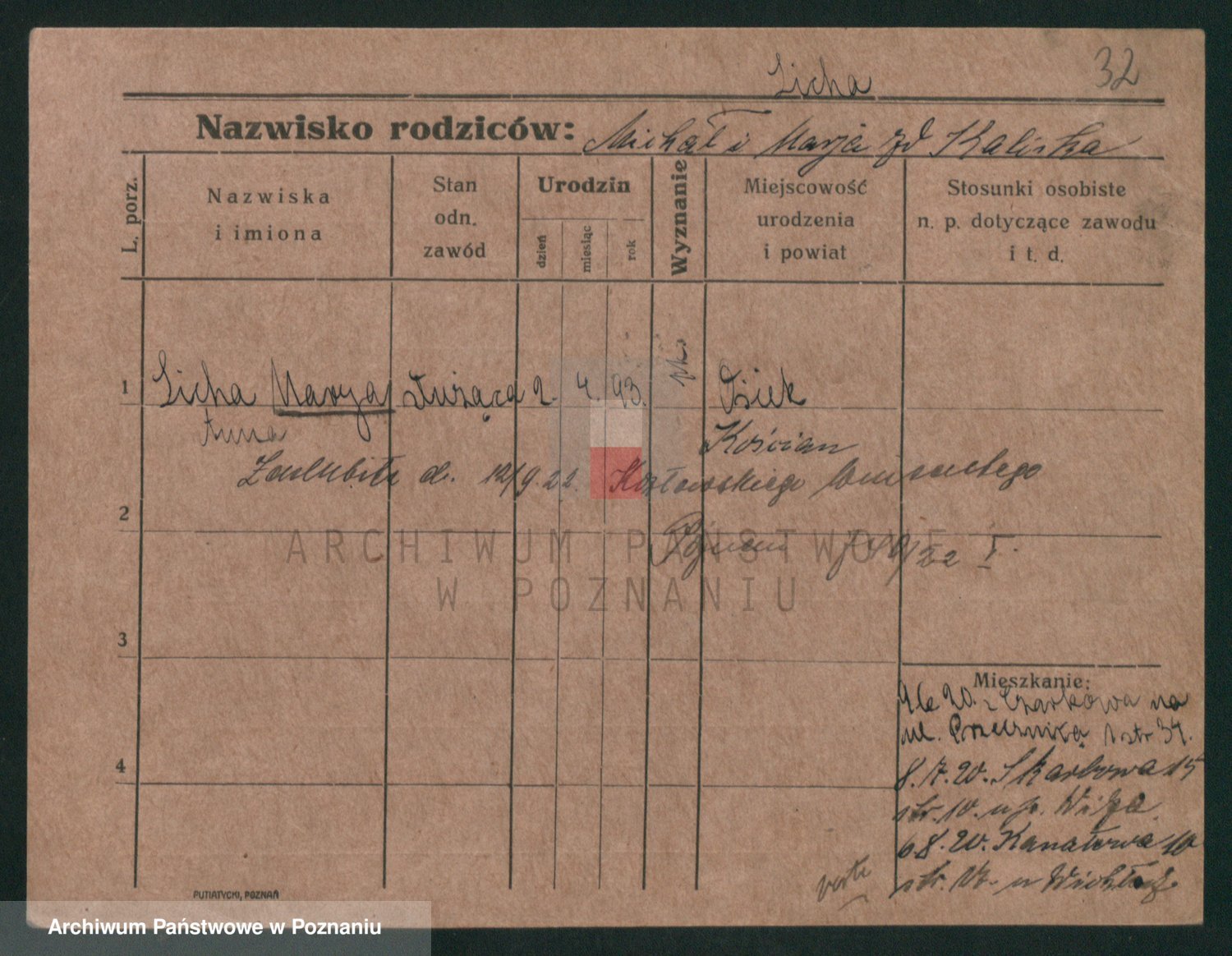 Podgląd karty osobowej dostępny jest po kliknięciu na nazwisko lub ikonkę karty. Można dokonywać powiększenia (ikony na górze) lub przechodzić między kolejnymi skanami (strzałki po bokach).