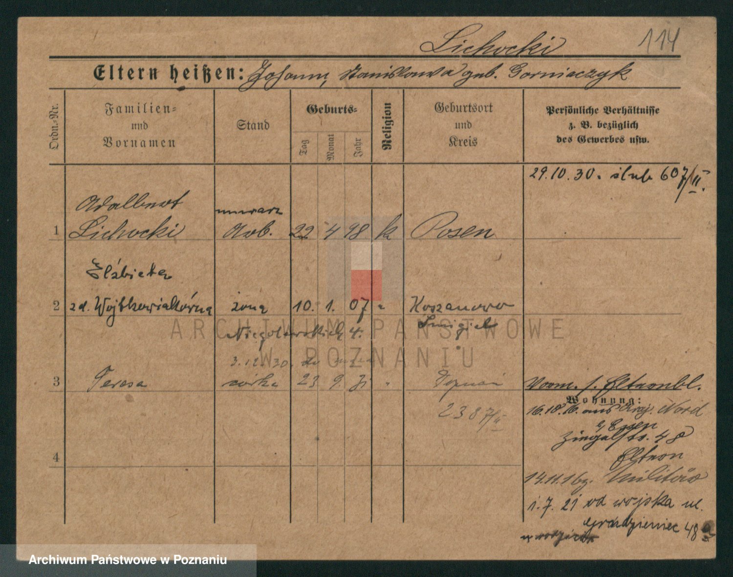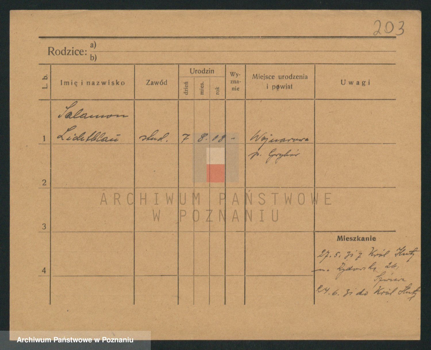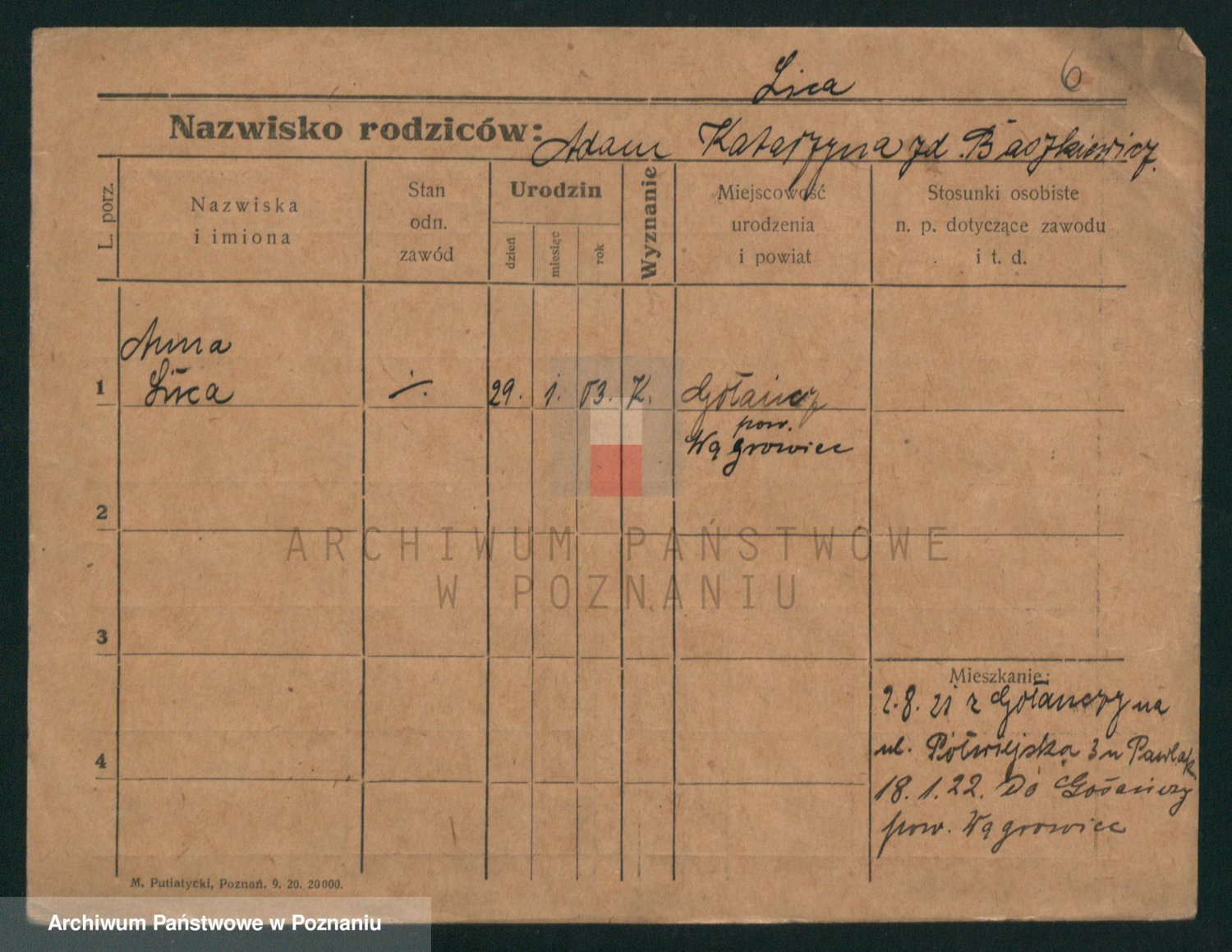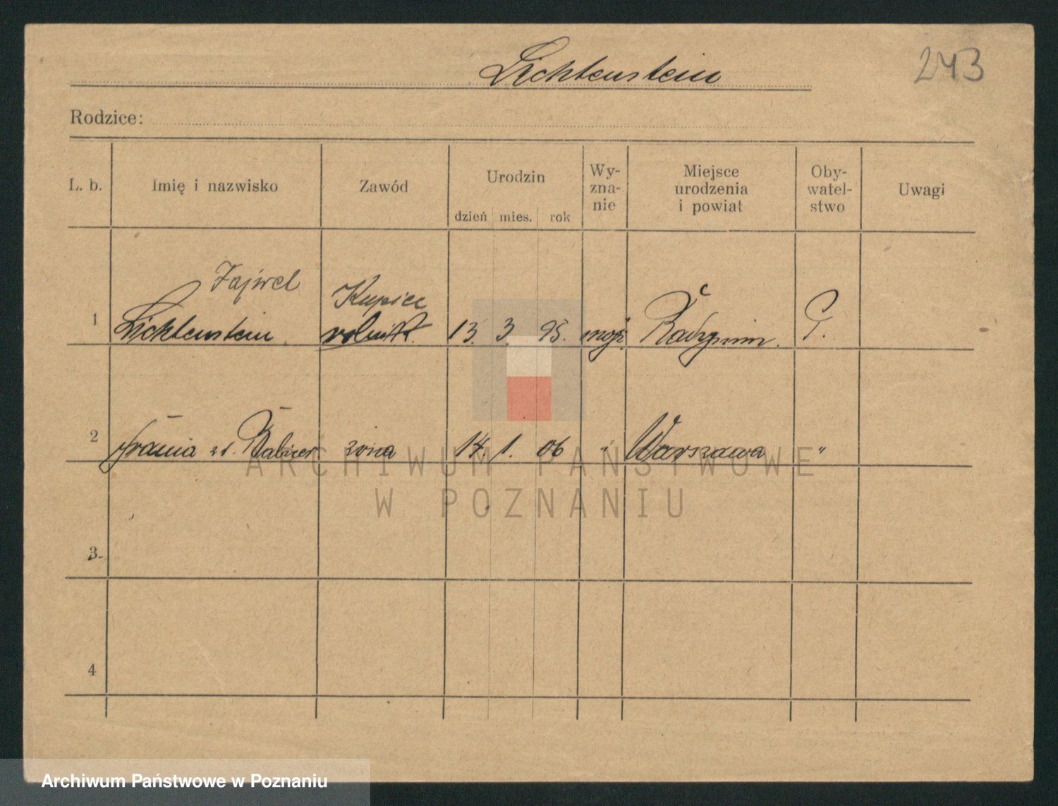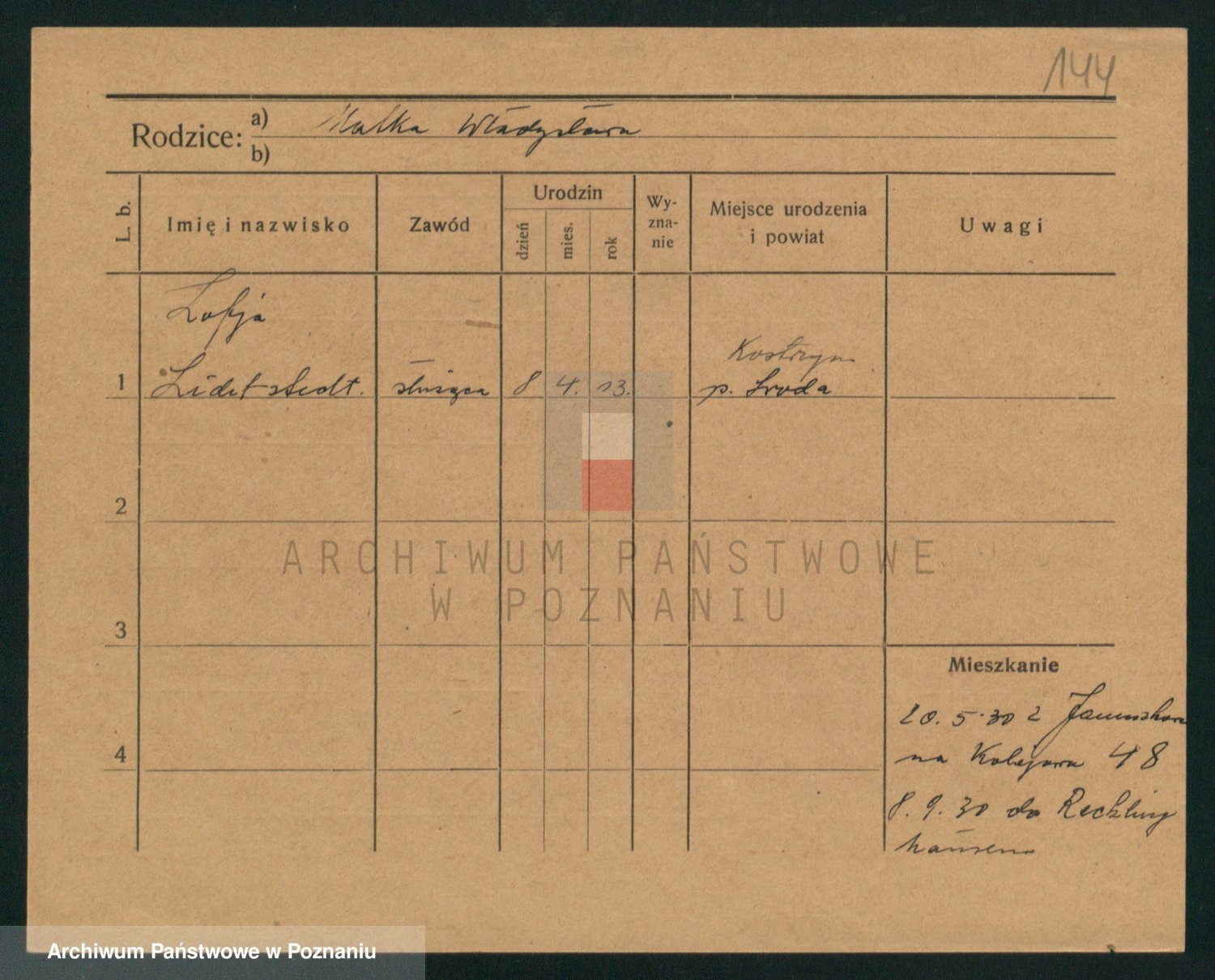 Podgląd karty osobowej dostępny jest po kliknięciu na nazwisko lub ikonkę karty. Można dokonywać powiększenia (ikony na górze) lub przechodzić między kolejnymi skanami (strzałki po bokach).