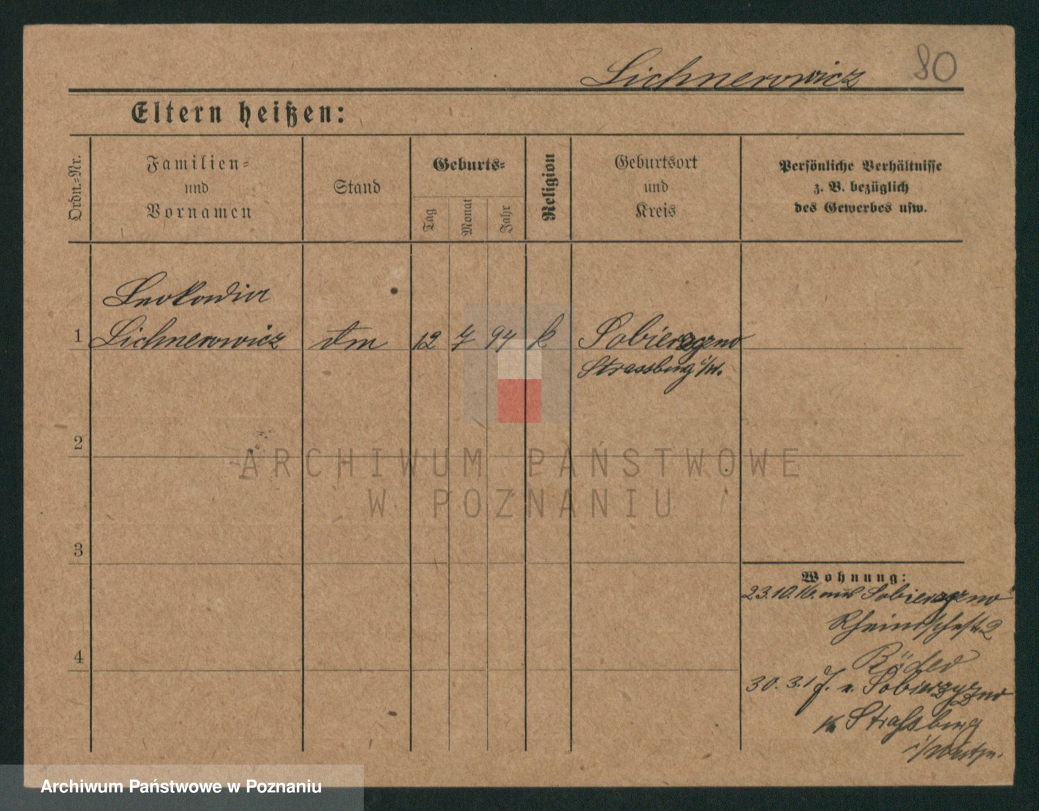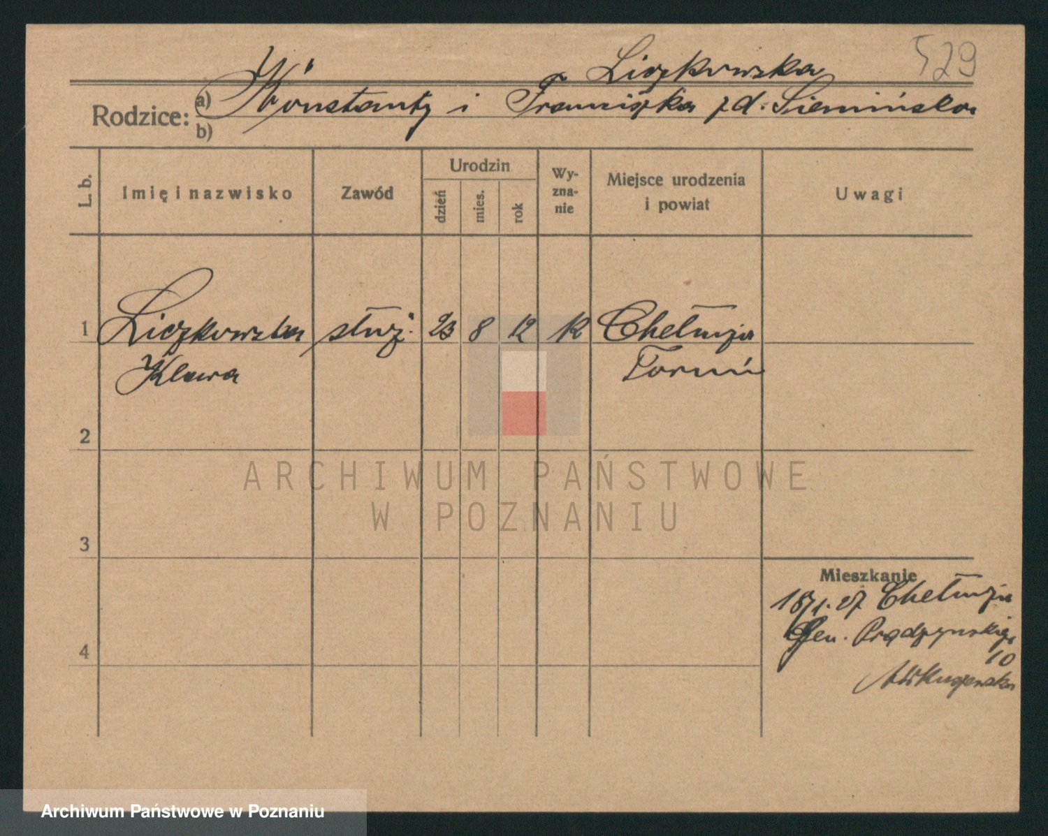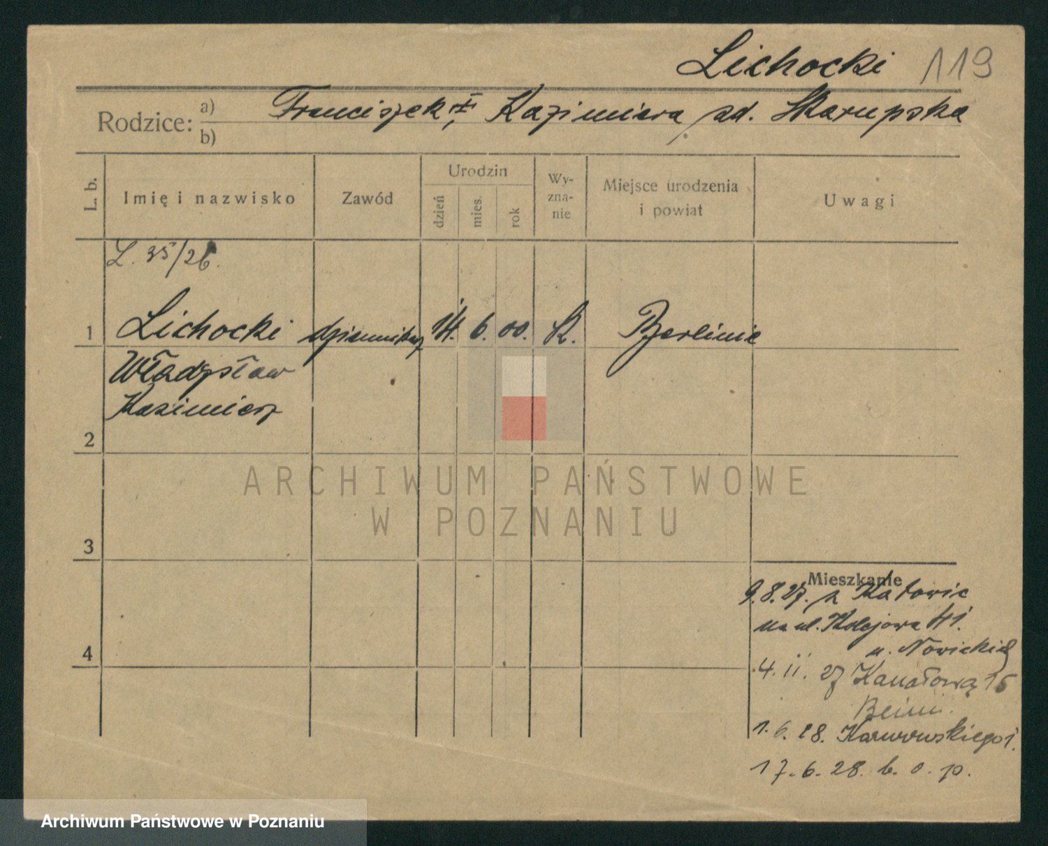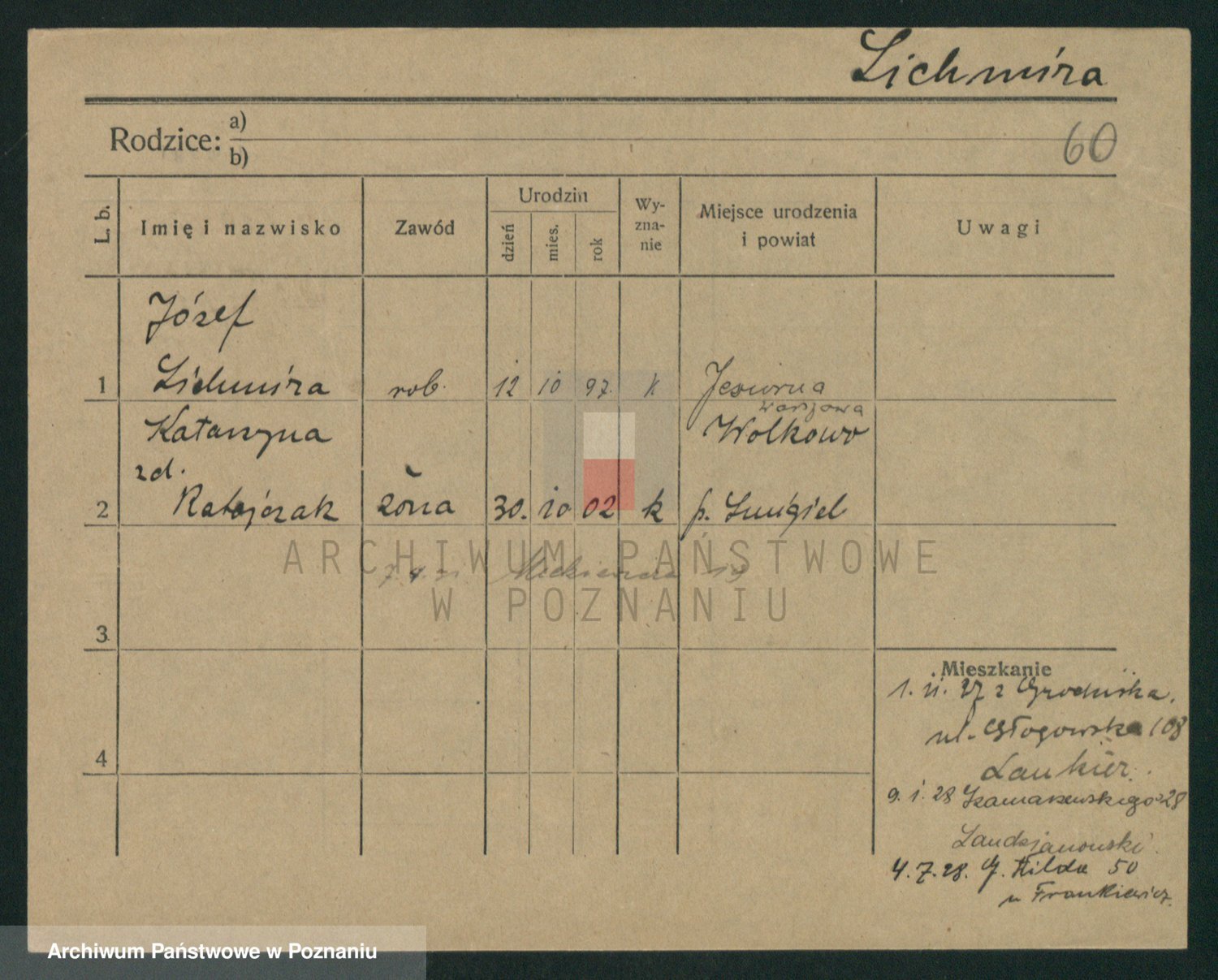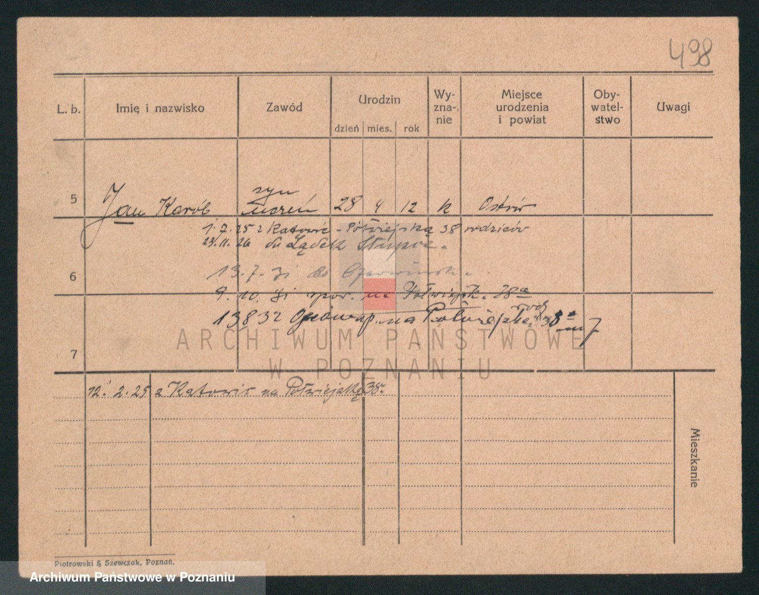 Podgląd karty osobowej dostępny jest po kliknięciu na nazwisko lub ikonkę karty. Można dokonywać powiększenia (ikony na górze) lub przechodzić między kolejnymi skanami (strzałki po bokach).