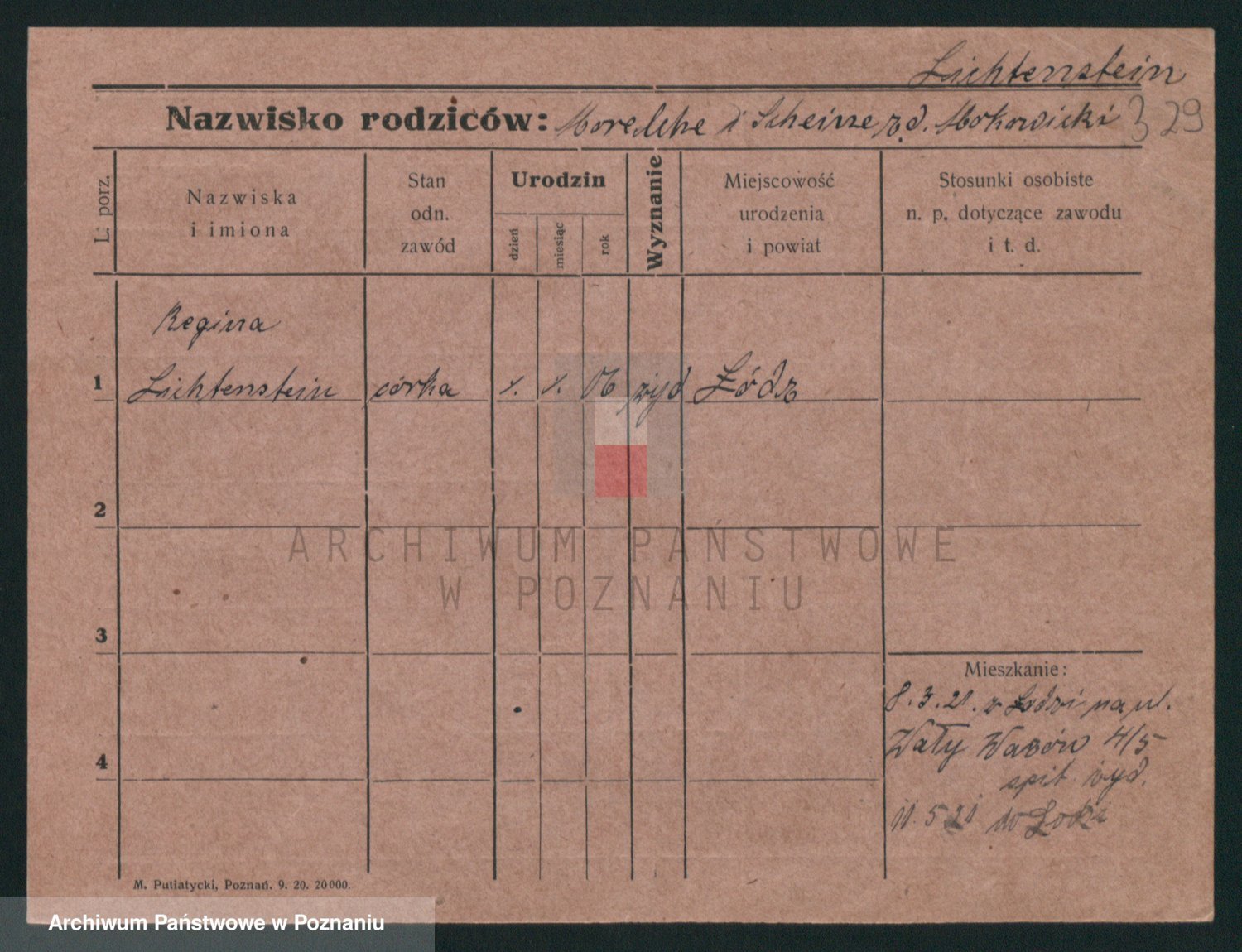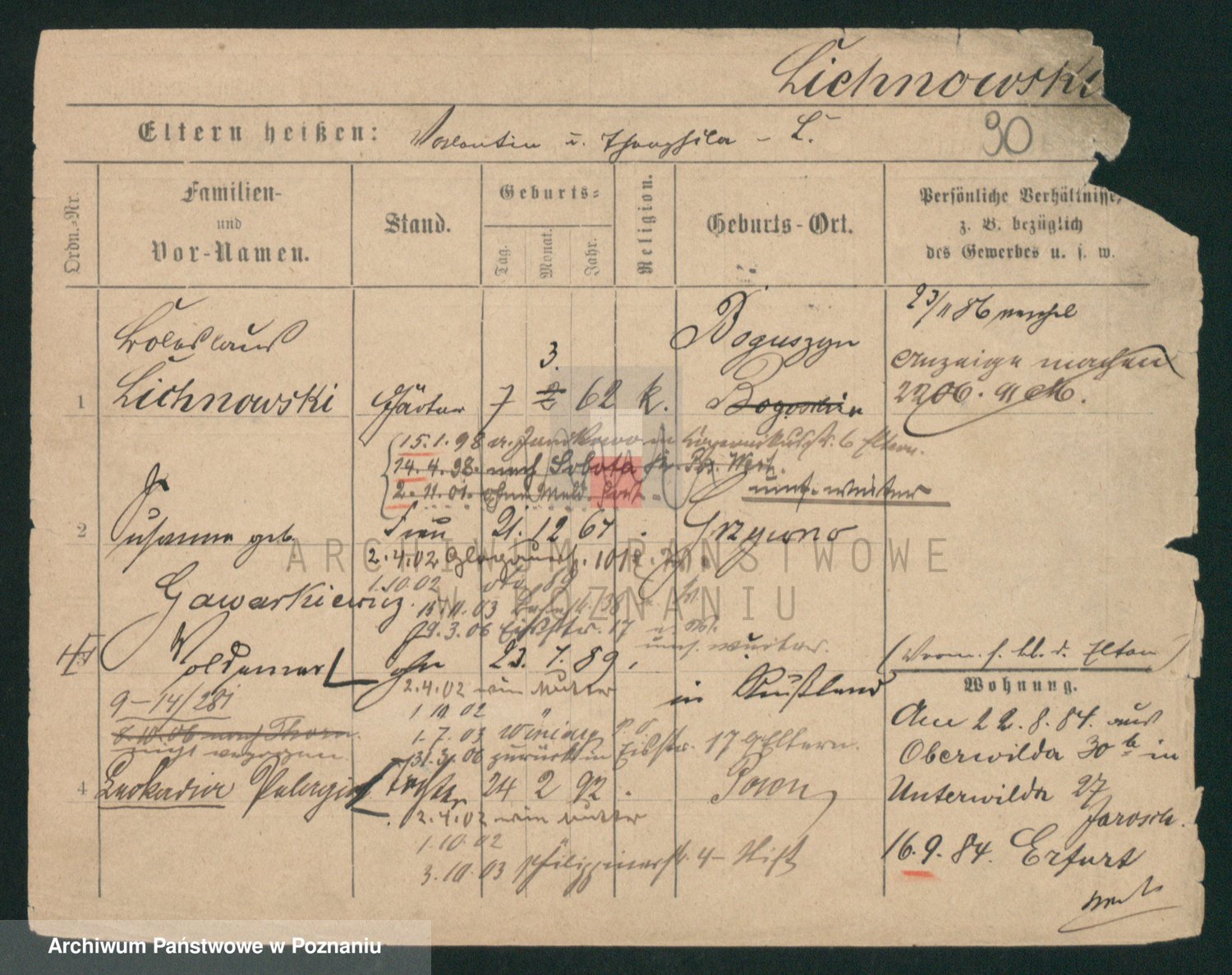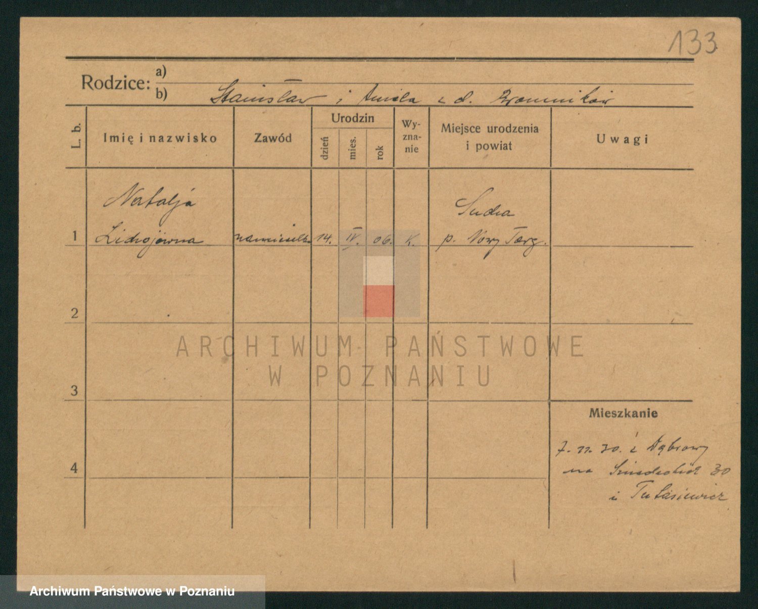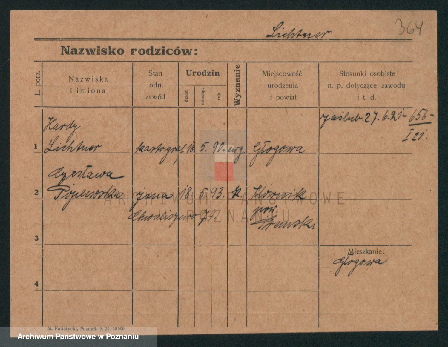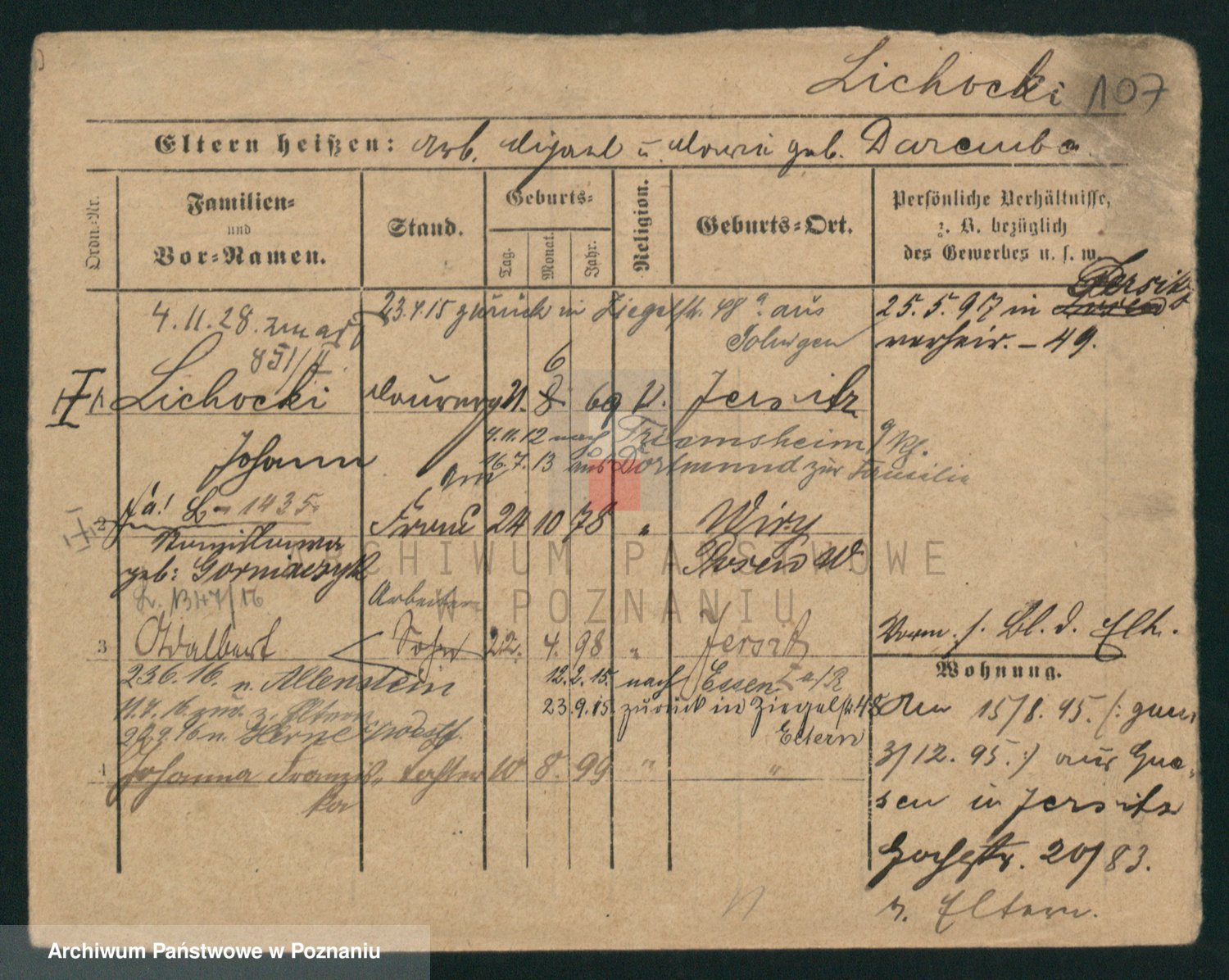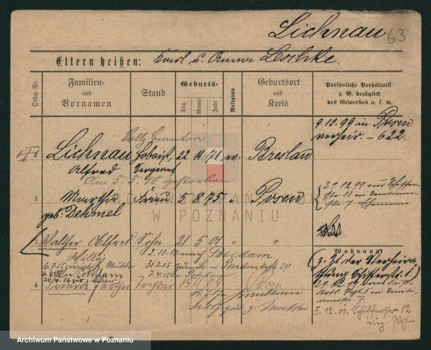 Podgląd karty osobowej dostępny jest po kliknięciu na nazwisko lub ikonkę karty. Można dokonywać powiększenia (ikony na górze) lub przechodzić między kolejnymi skanami (strzałki po bokach).