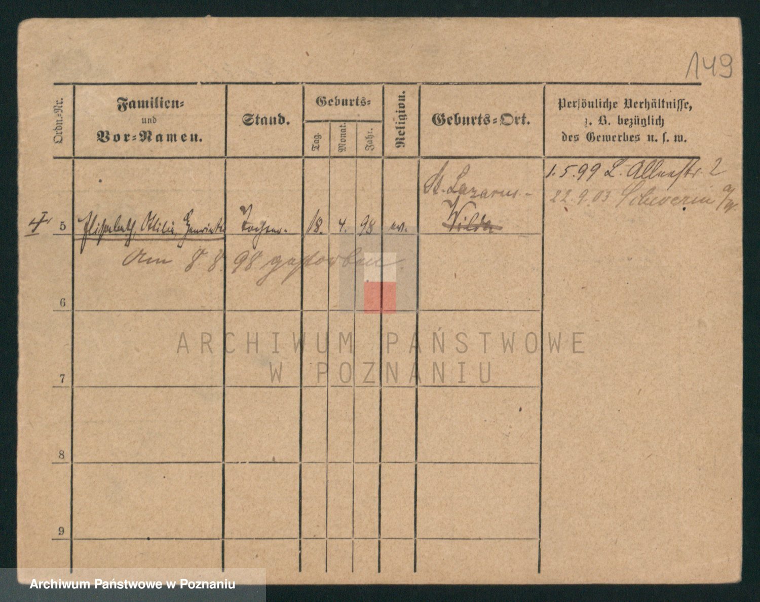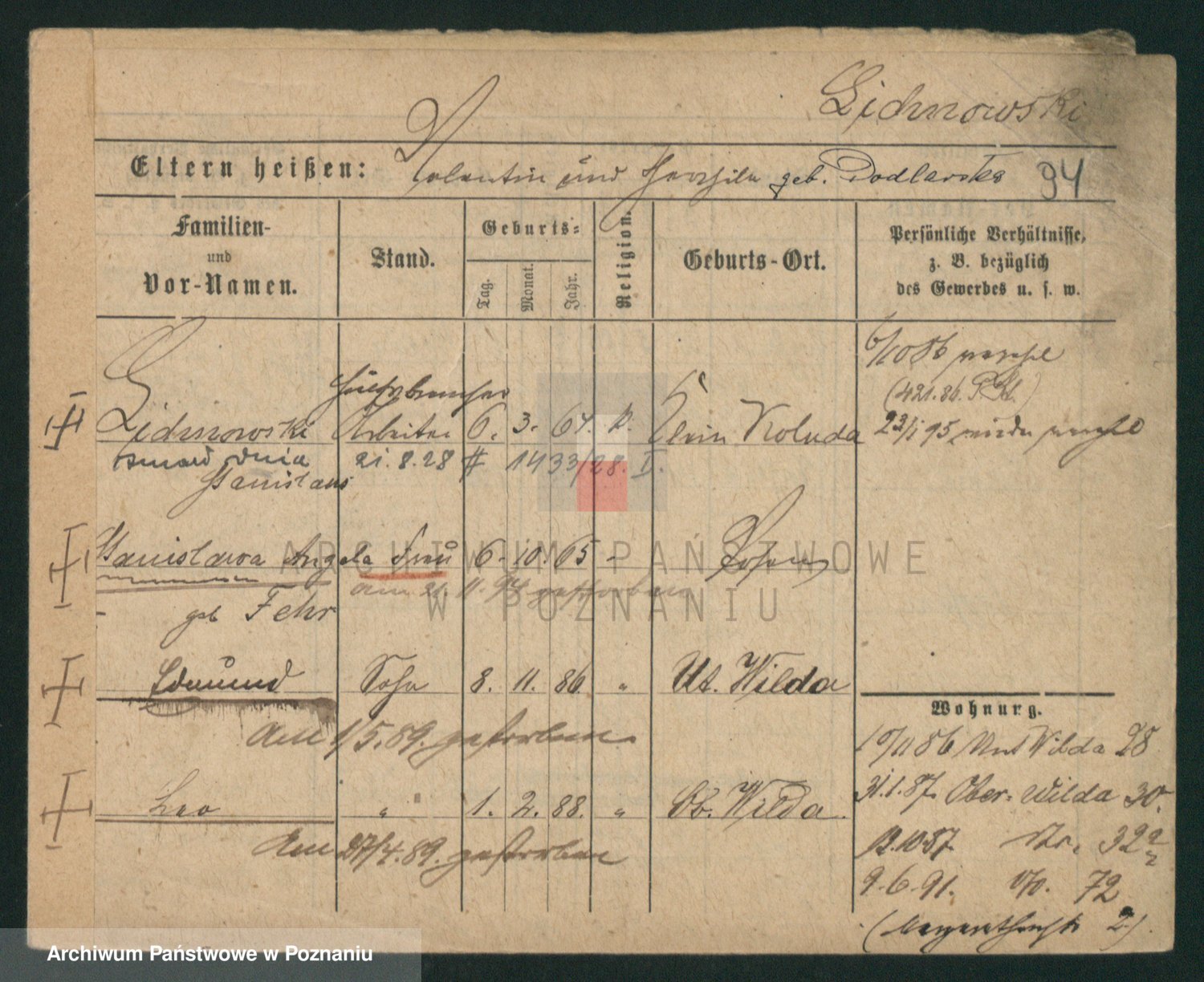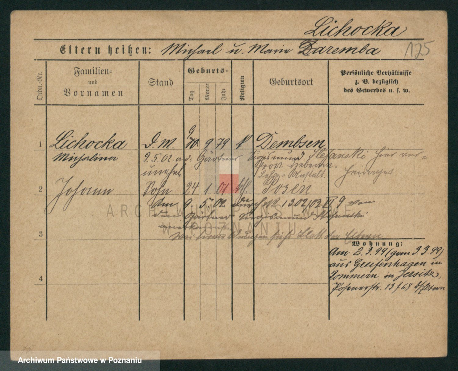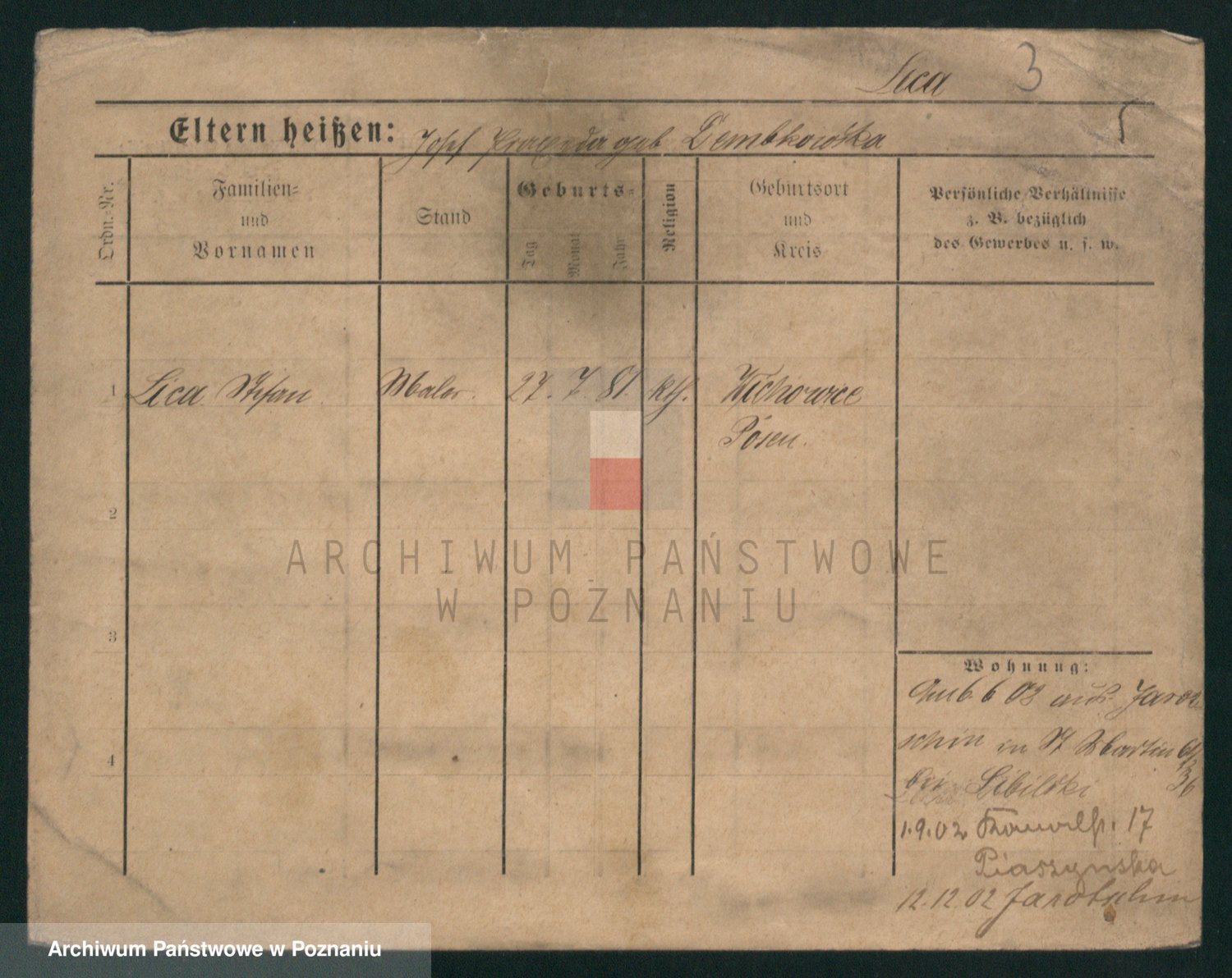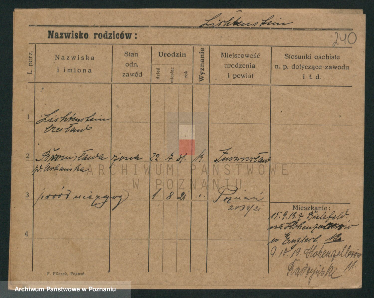 Podgląd karty osobowej dostępny jest po kliknięciu na nazwisko lub ikonkę karty. Można dokonywać powiększenia (ikony na górze) lub przechodzić między kolejnymi skanami (strzałki po bokach).