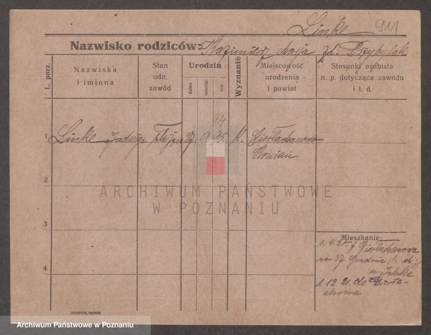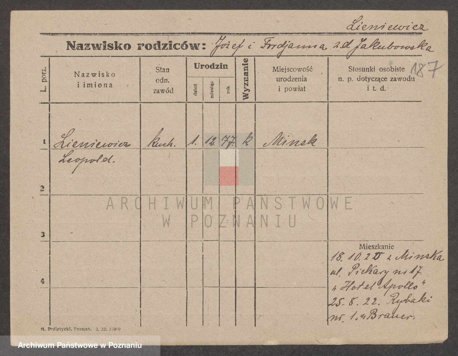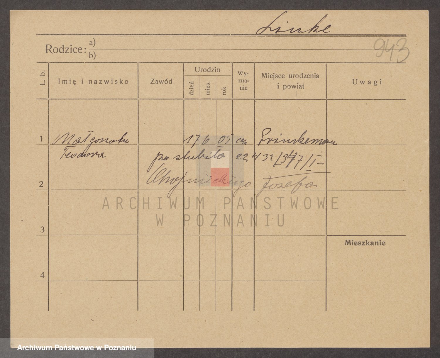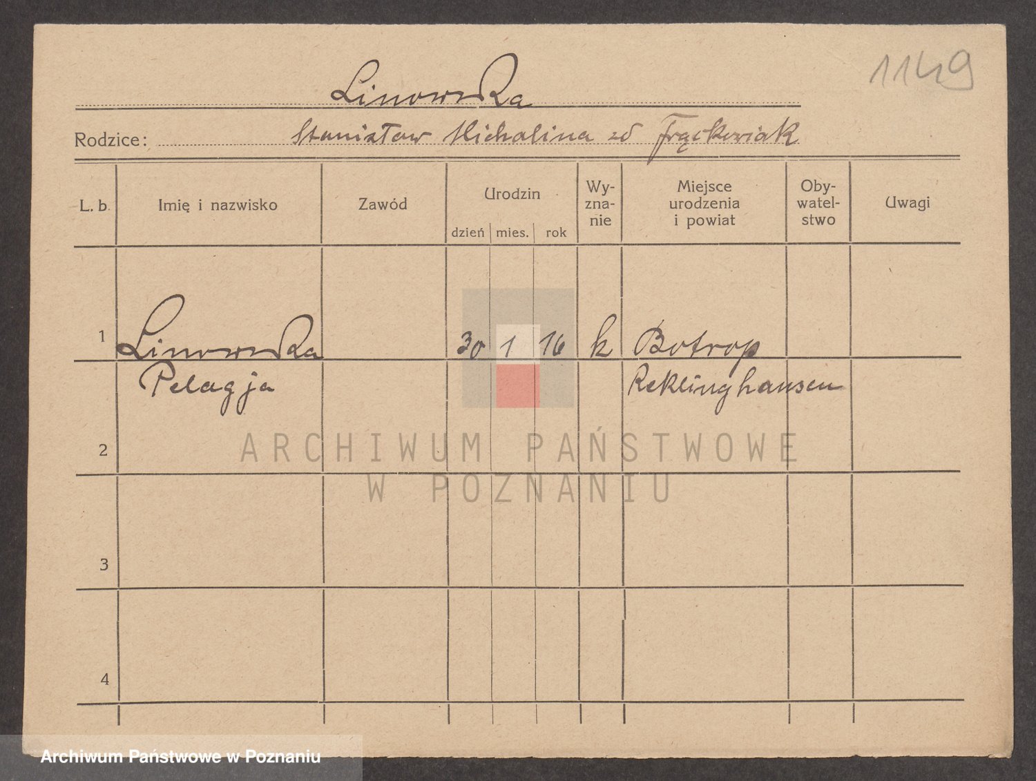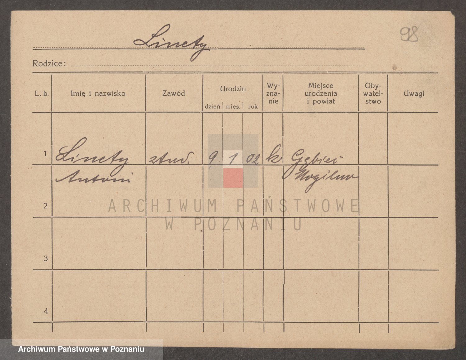 Podgląd karty osobowej dostępny jest po kliknięciu na nazwisko lub ikonkę karty. Można dokonywać powiększenia (ikony na górze) lub przechodzić między kolejnymi skanami (strzałki po bokach).