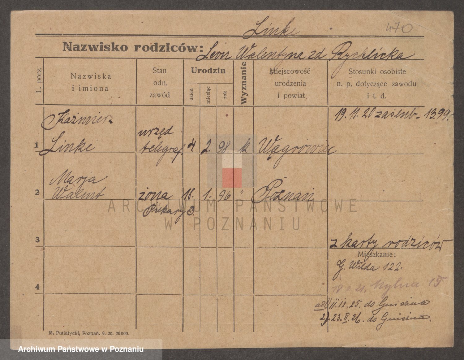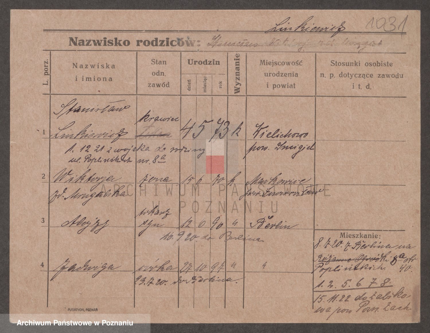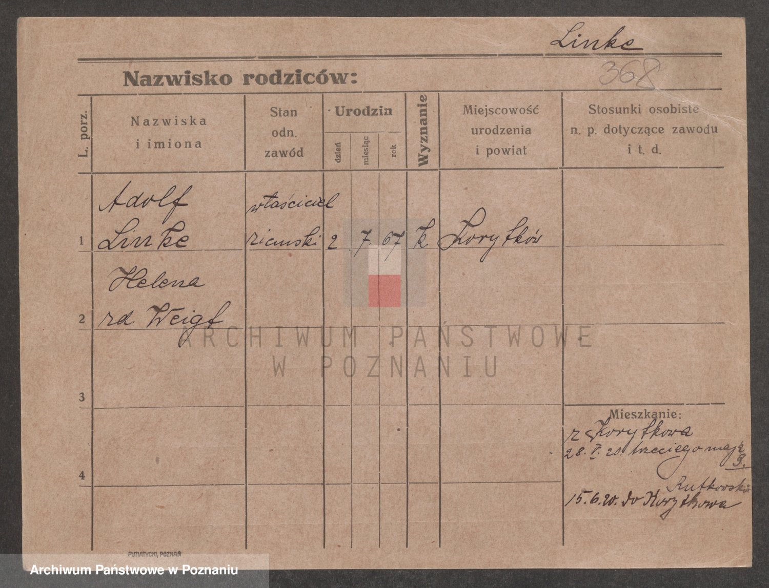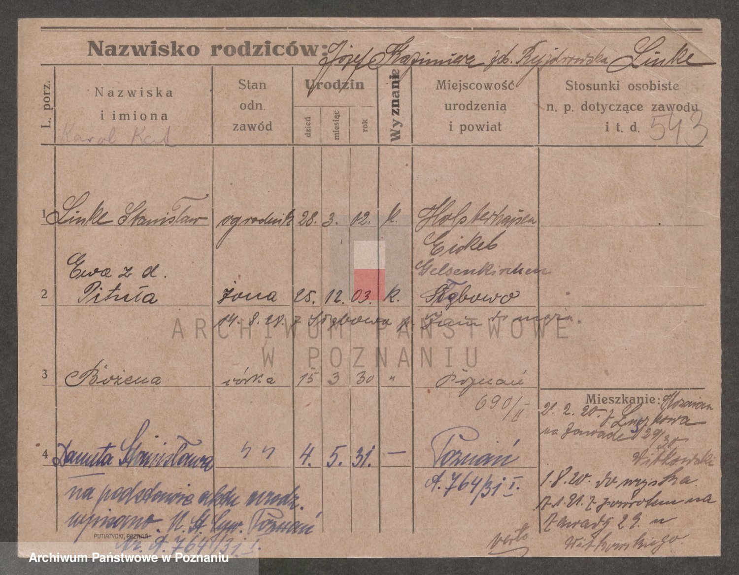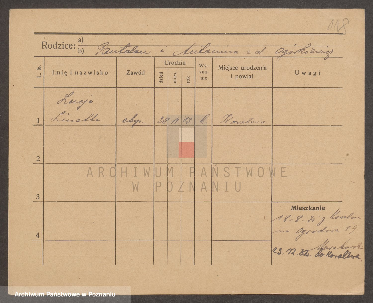 Podgląd karty osobowej dostępny jest po kliknięciu na nazwisko lub ikonkę karty. Można dokonywać powiększenia (ikony na górze) lub przechodzić między kolejnymi skanami (strzałki po bokach).