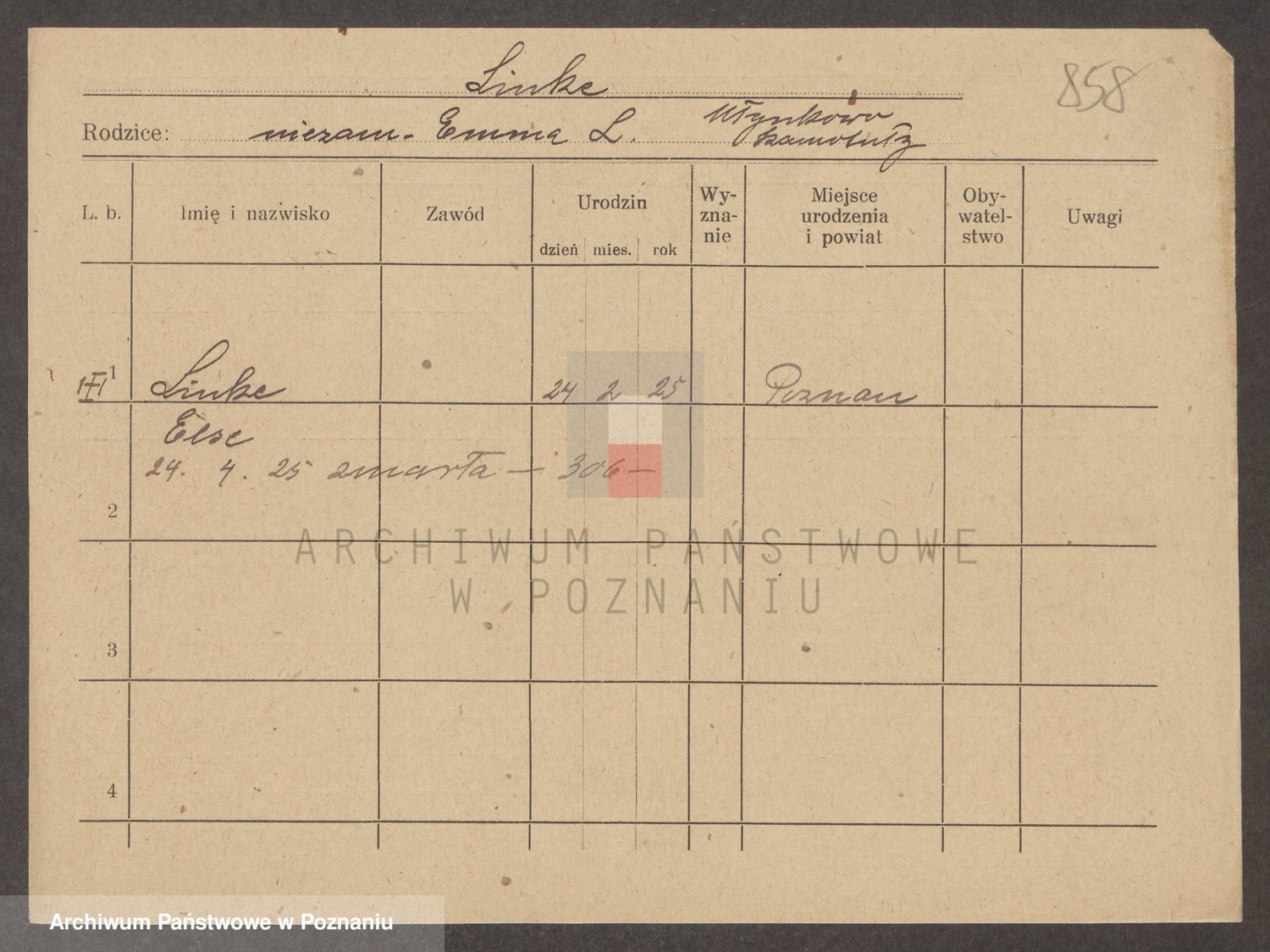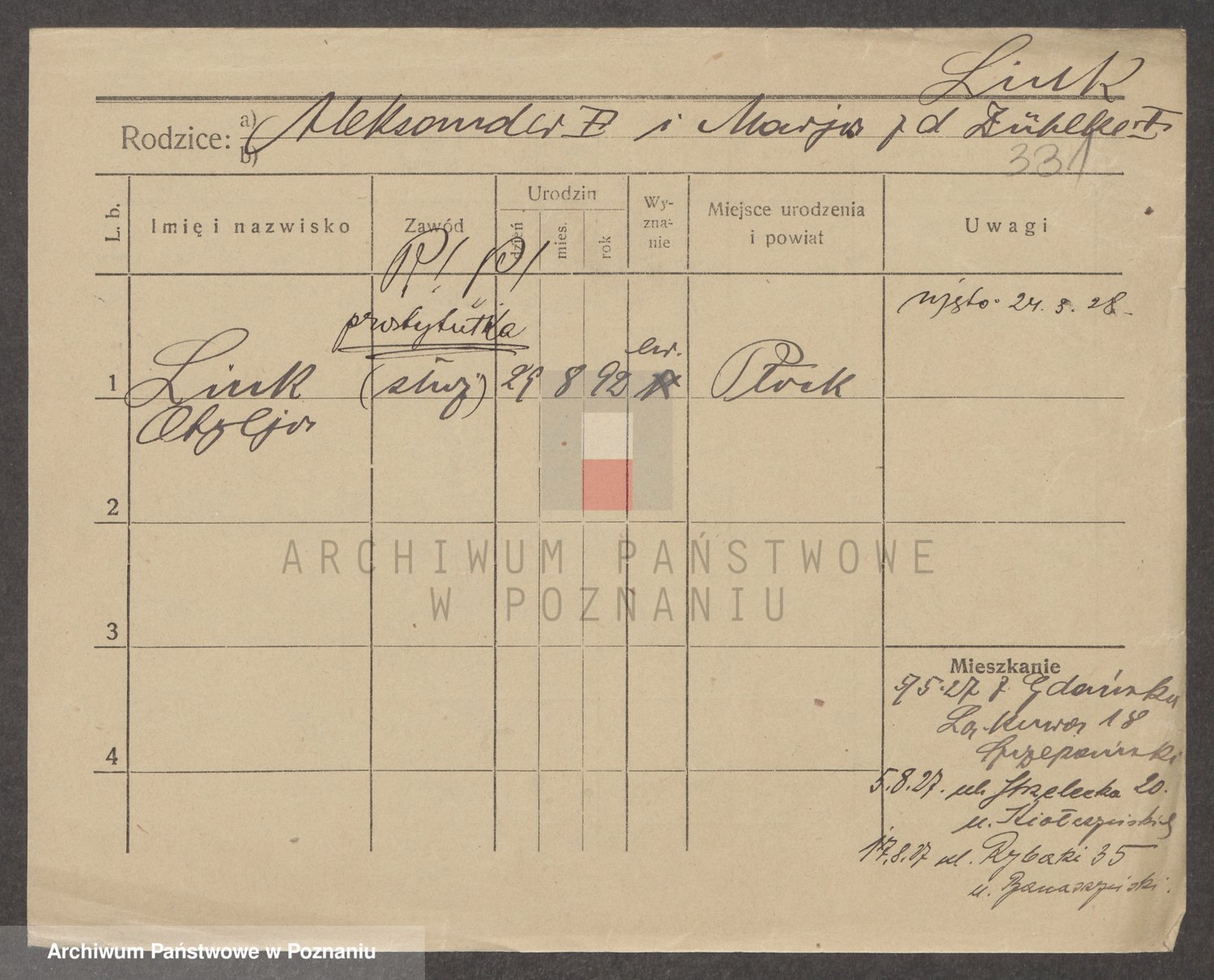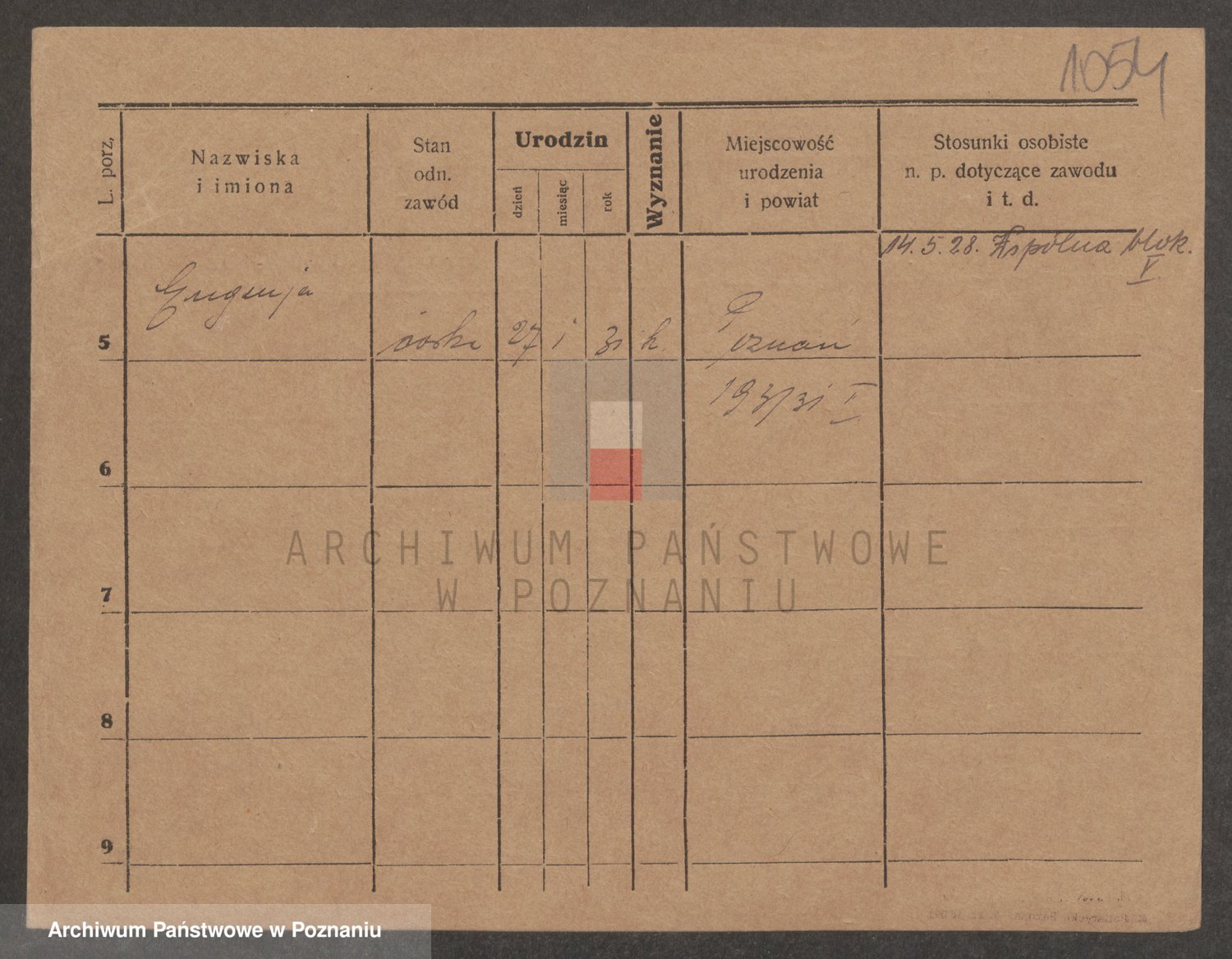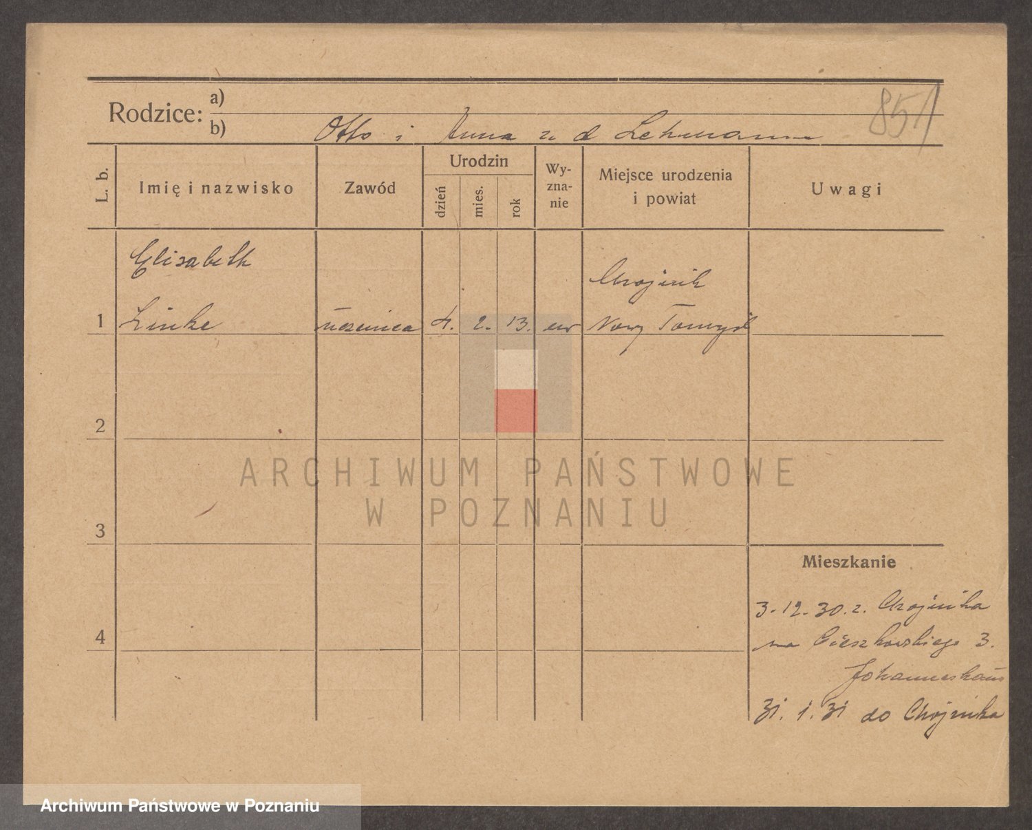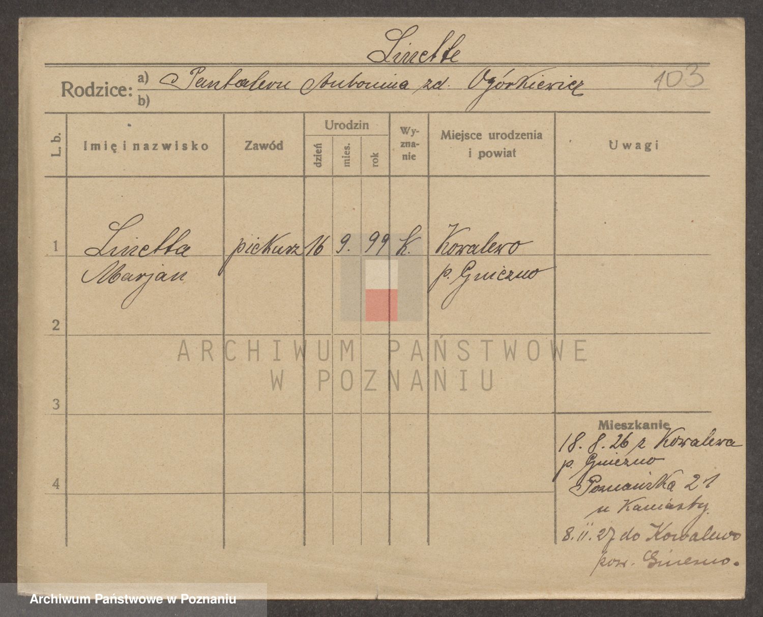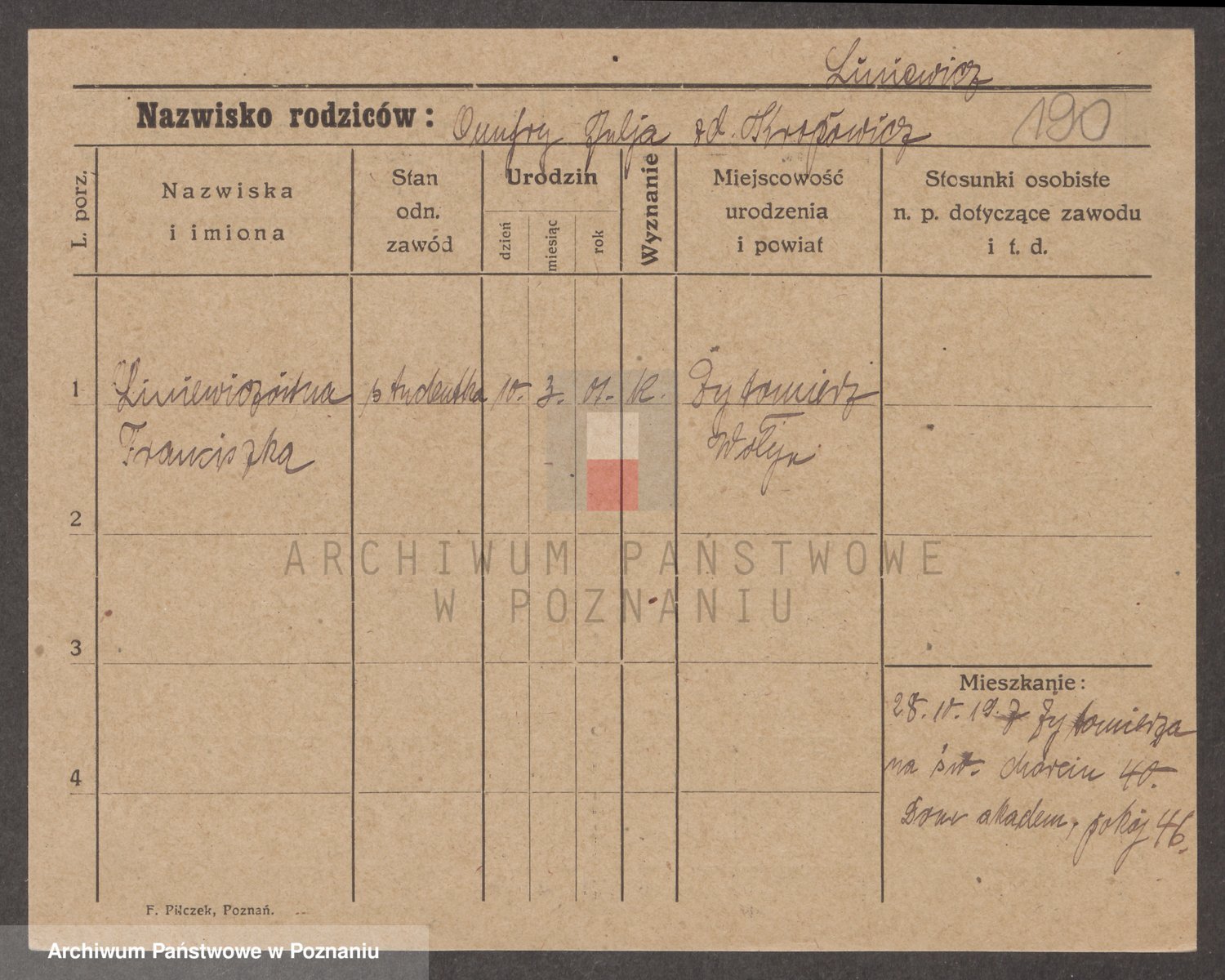 Podgląd karty osobowej dostępny jest po kliknięciu na nazwisko lub ikonkę karty. Można dokonywać powiększenia (ikony na górze) lub przechodzić między kolejnymi skanami (strzałki po bokach).