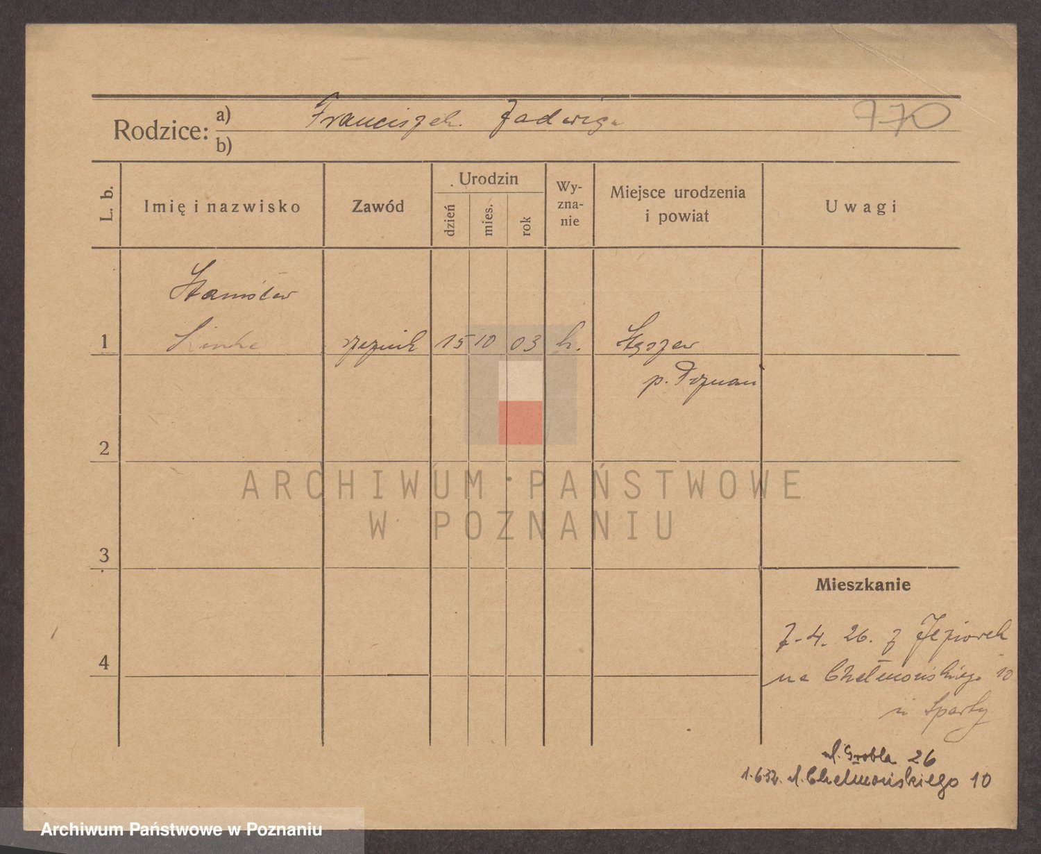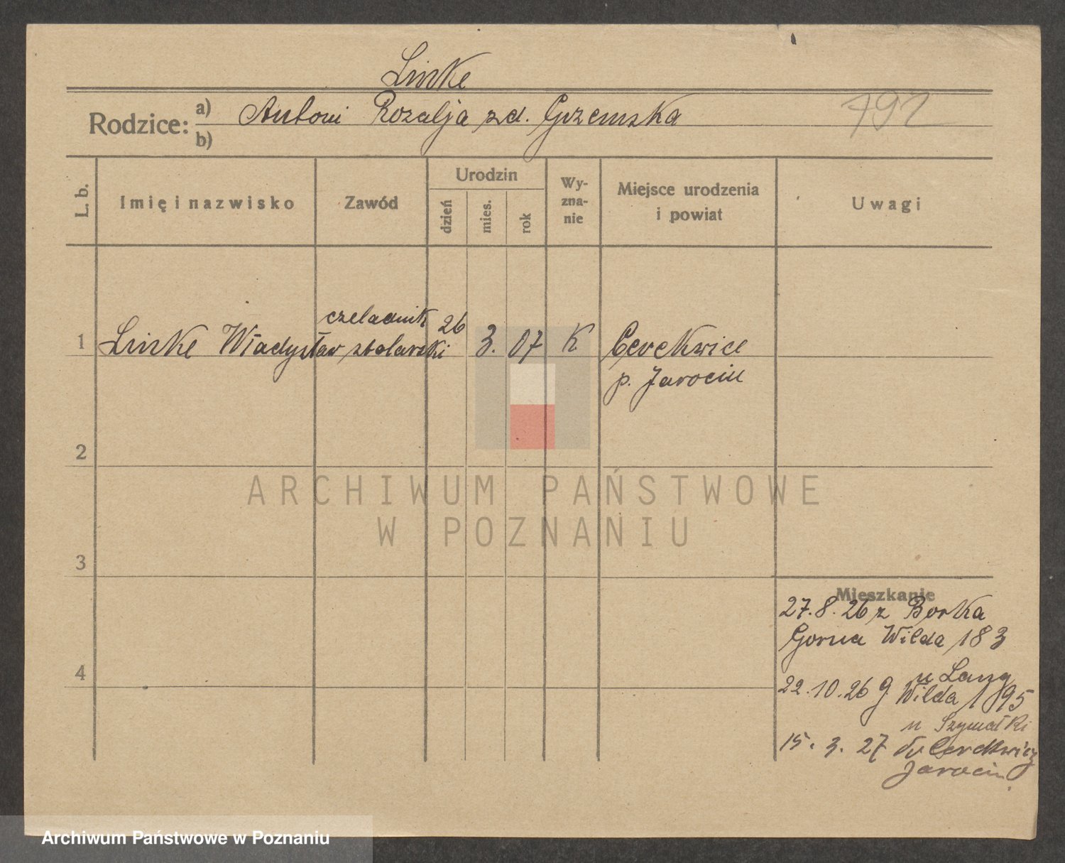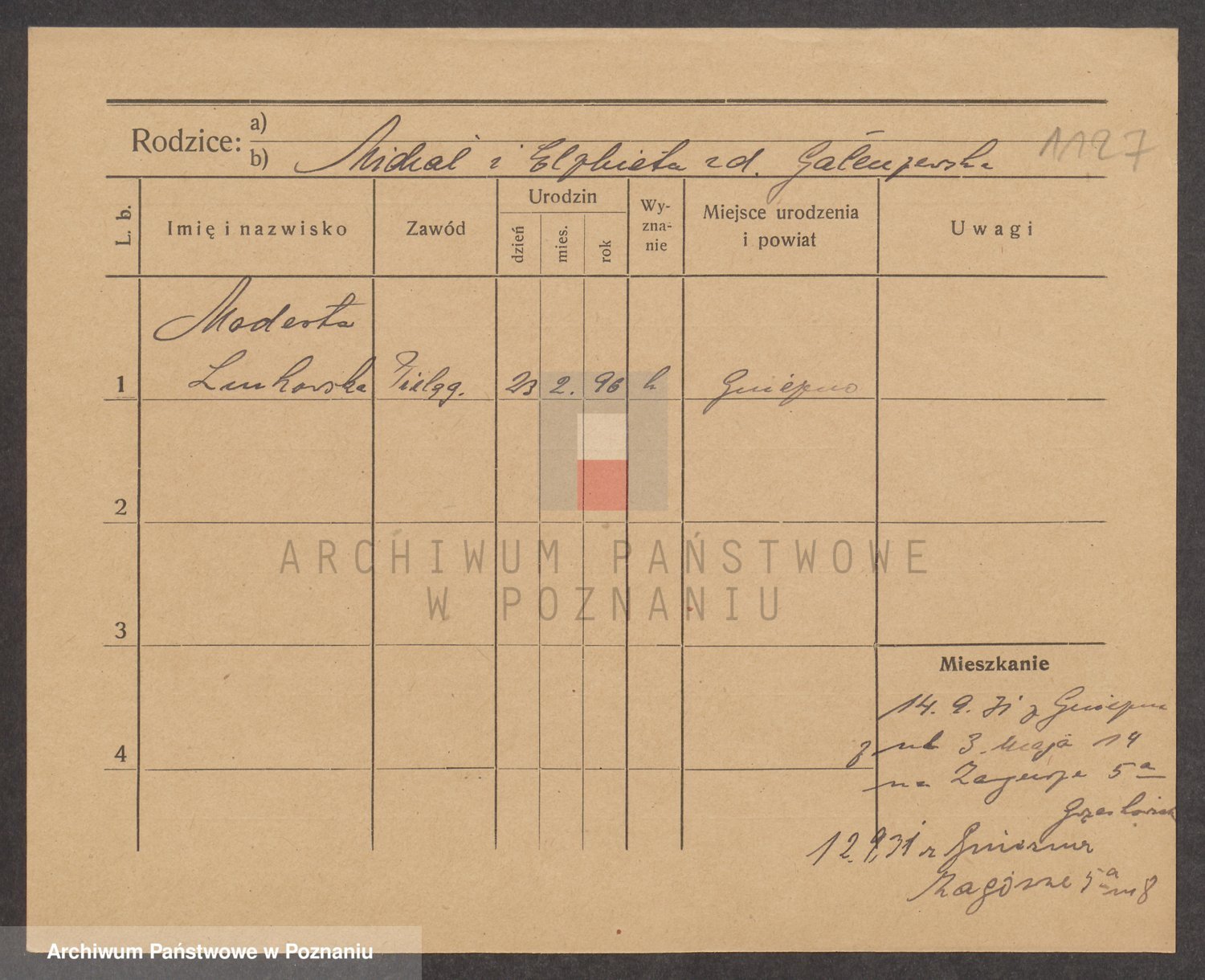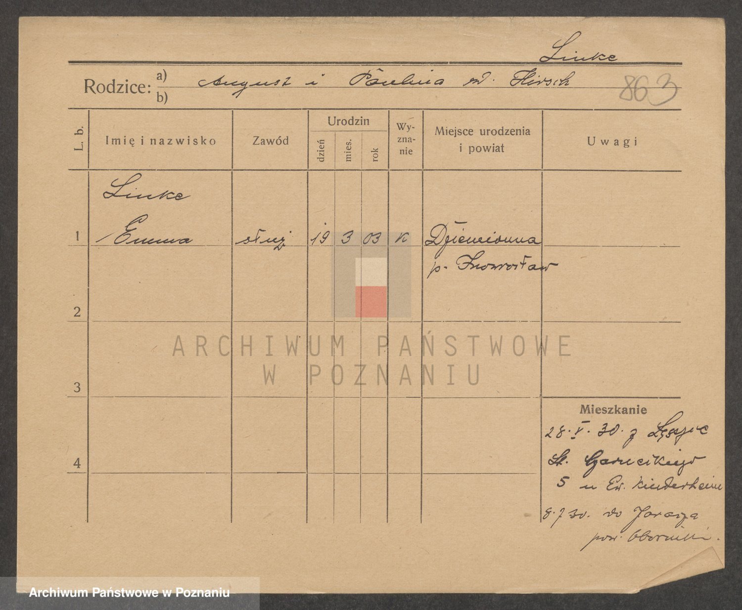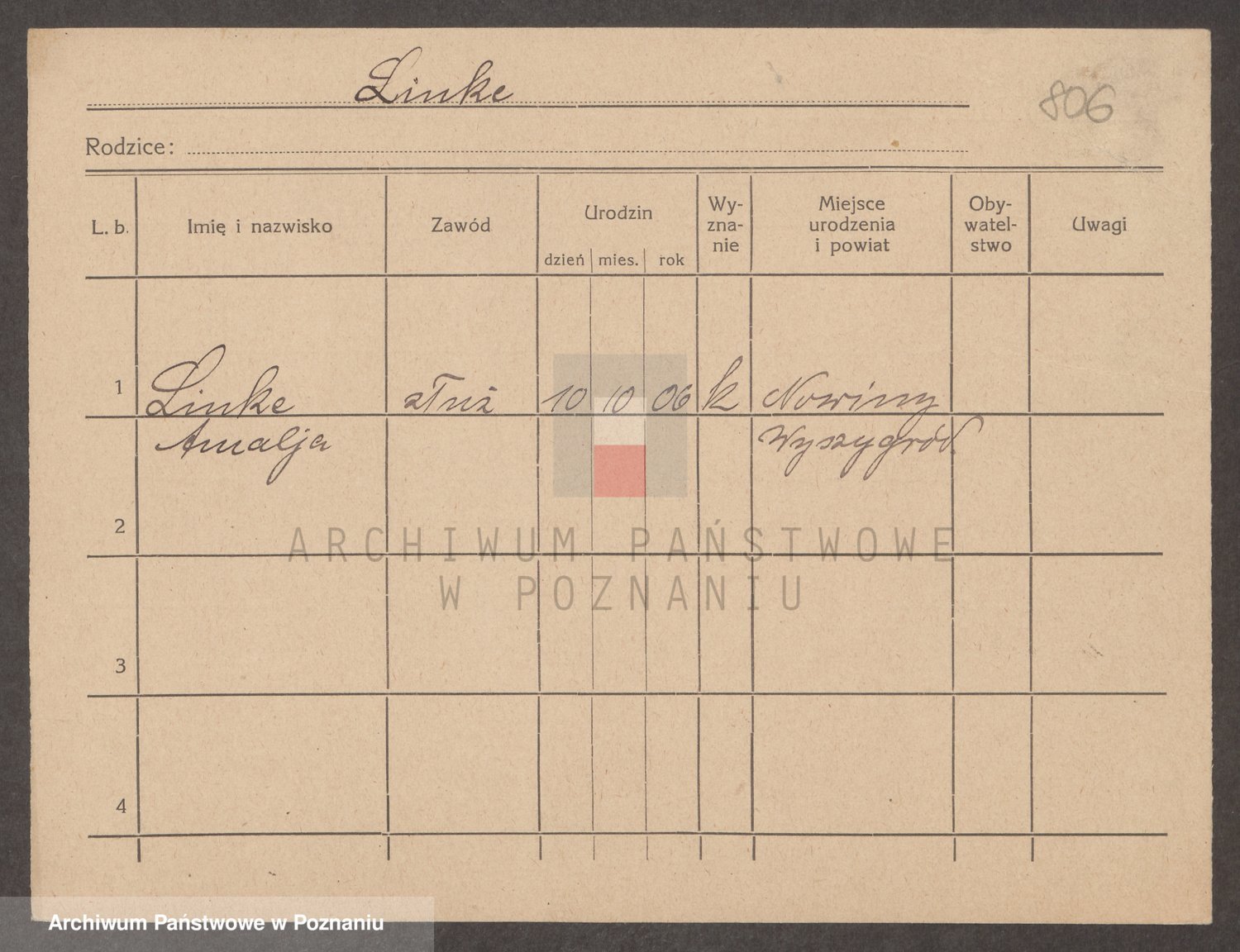 Podgląd karty osobowej dostępny jest po kliknięciu na nazwisko lub ikonkę karty. Można dokonywać powiększenia (ikony na górze) lub przechodzić między kolejnymi skanami (strzałki po bokach).