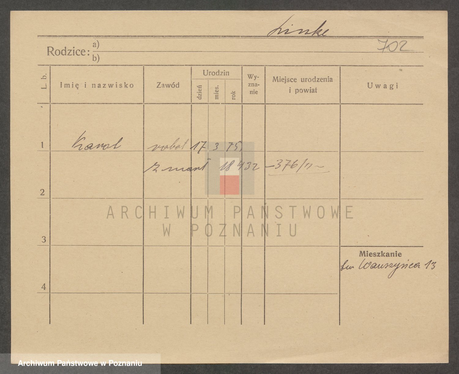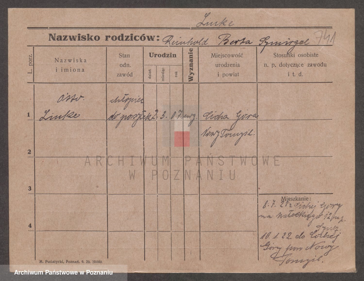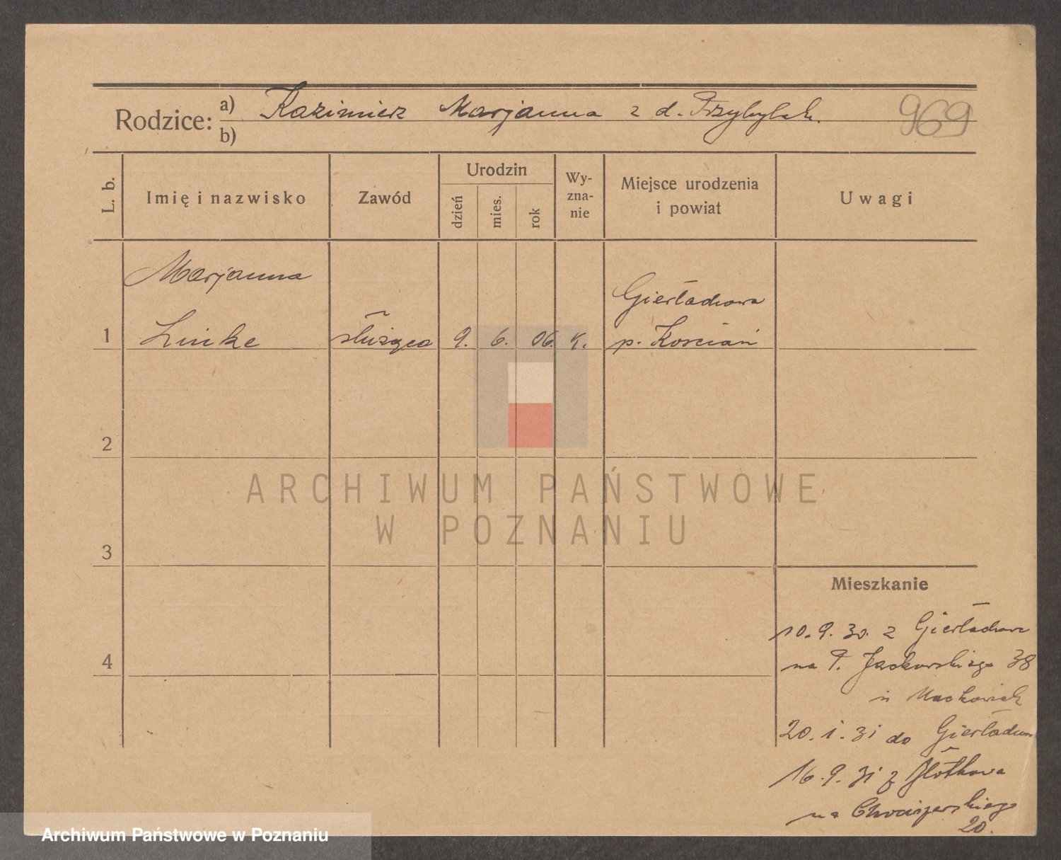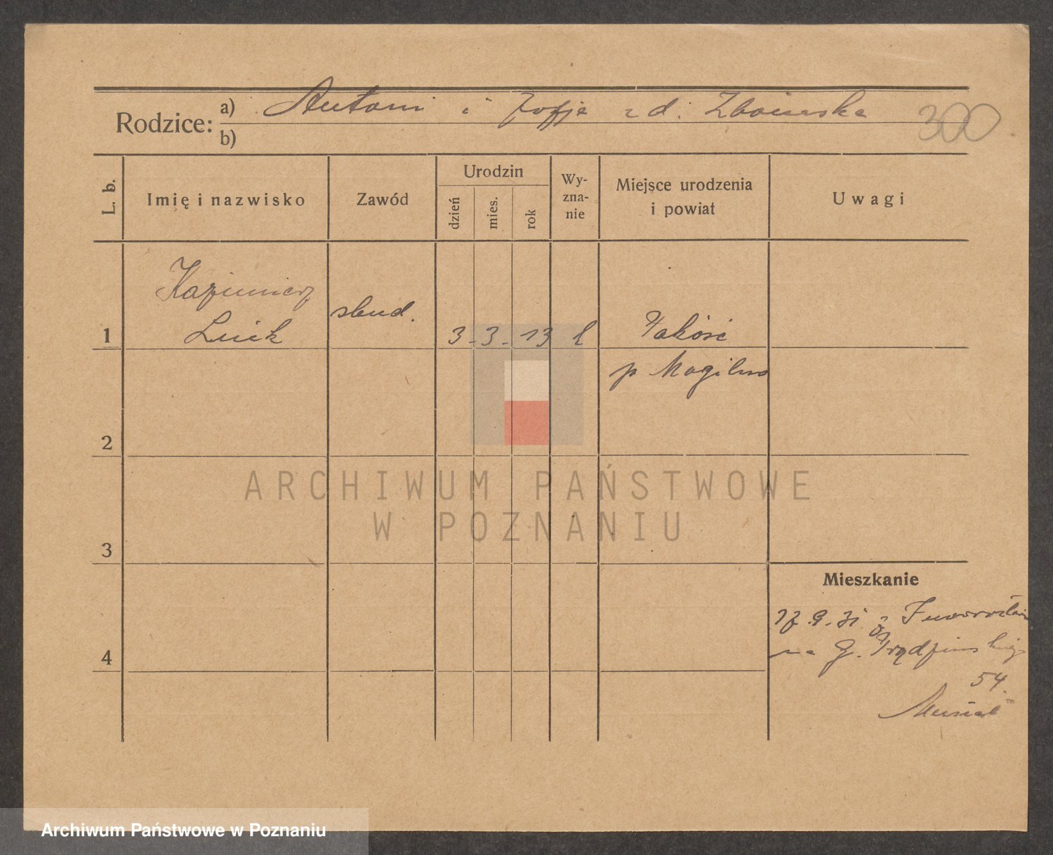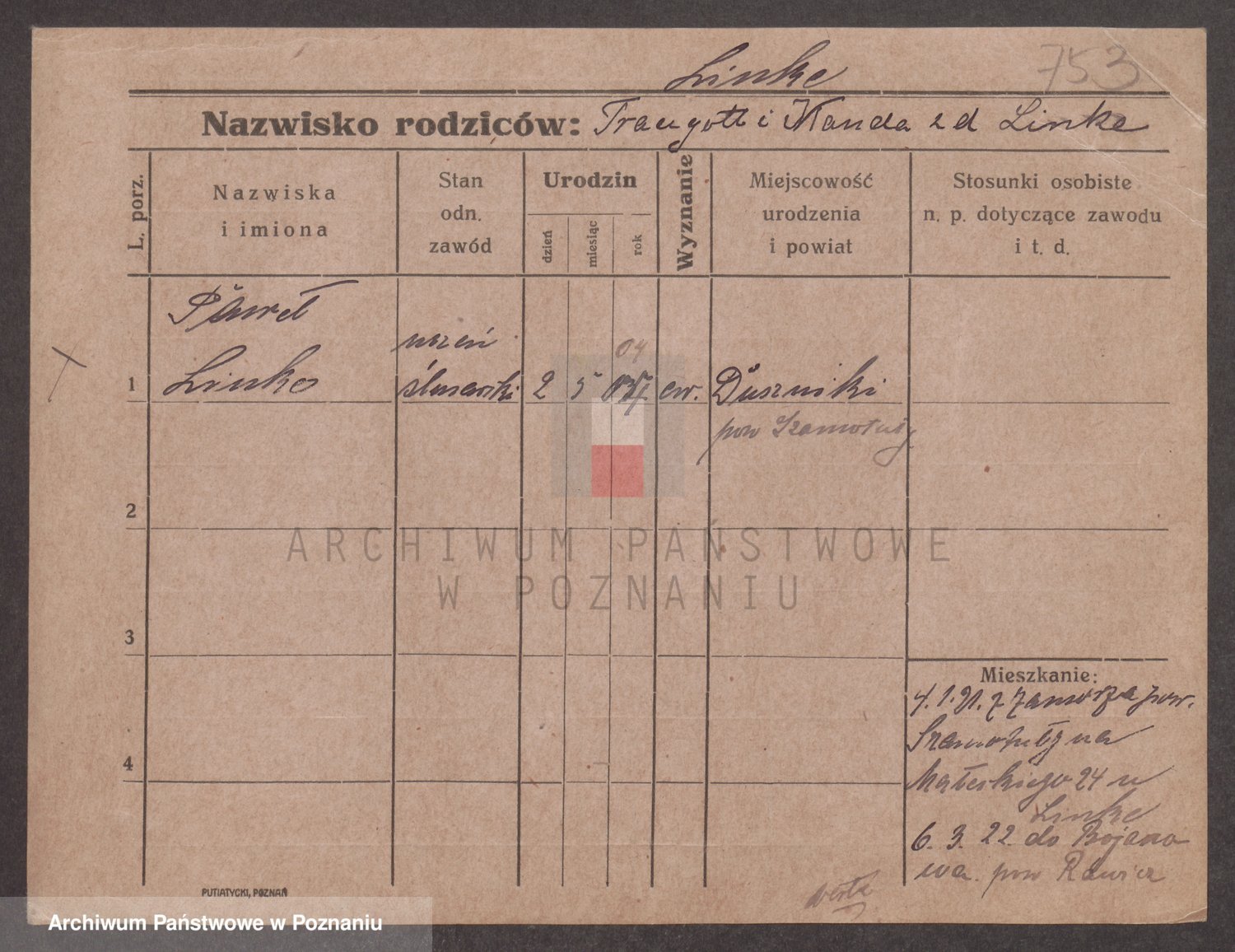 Podgląd karty osobowej dostępny jest po kliknięciu na nazwisko lub ikonkę karty. Można dokonywać powiększenia (ikony na górze) lub przechodzić między kolejnymi skanami (strzałki po bokach).