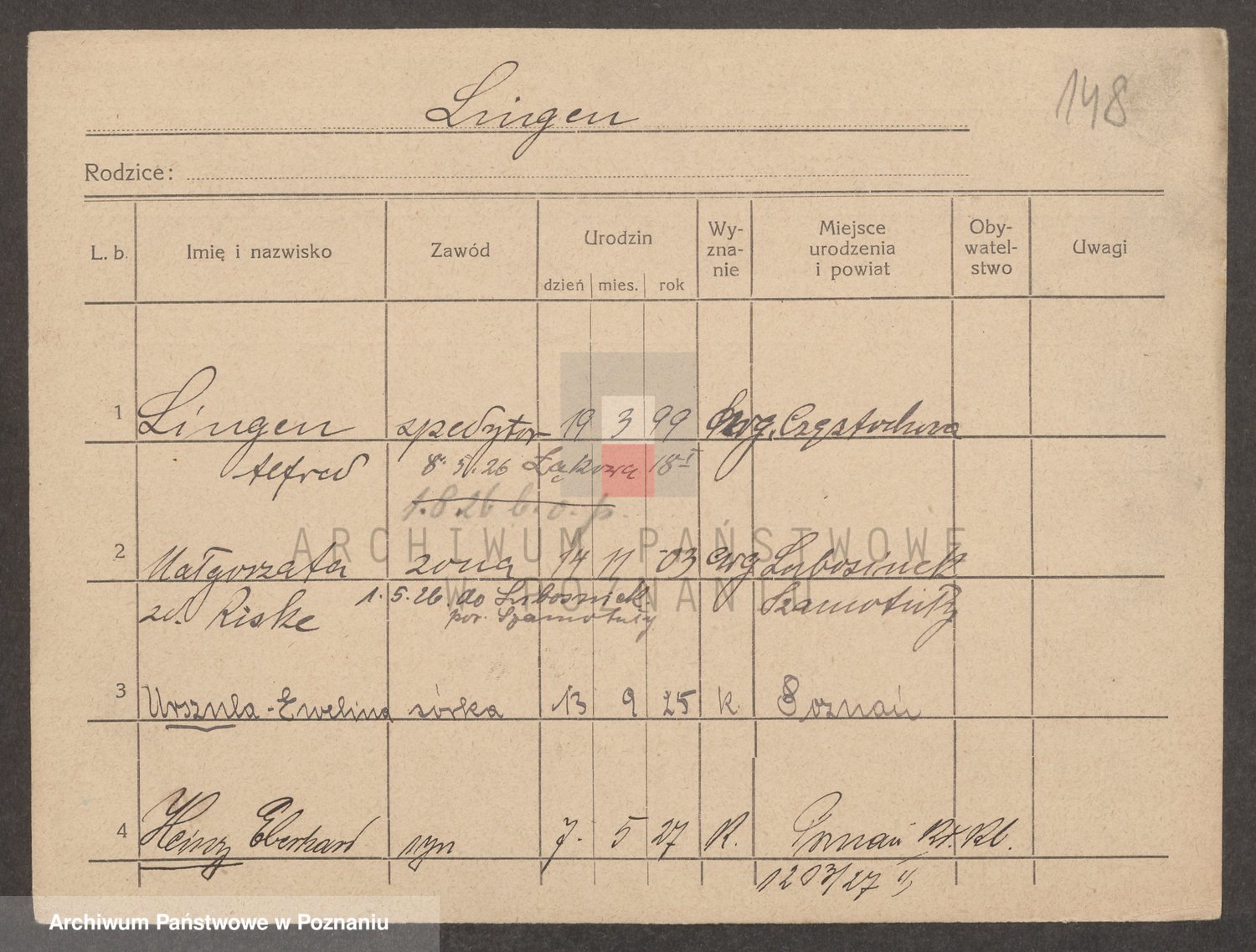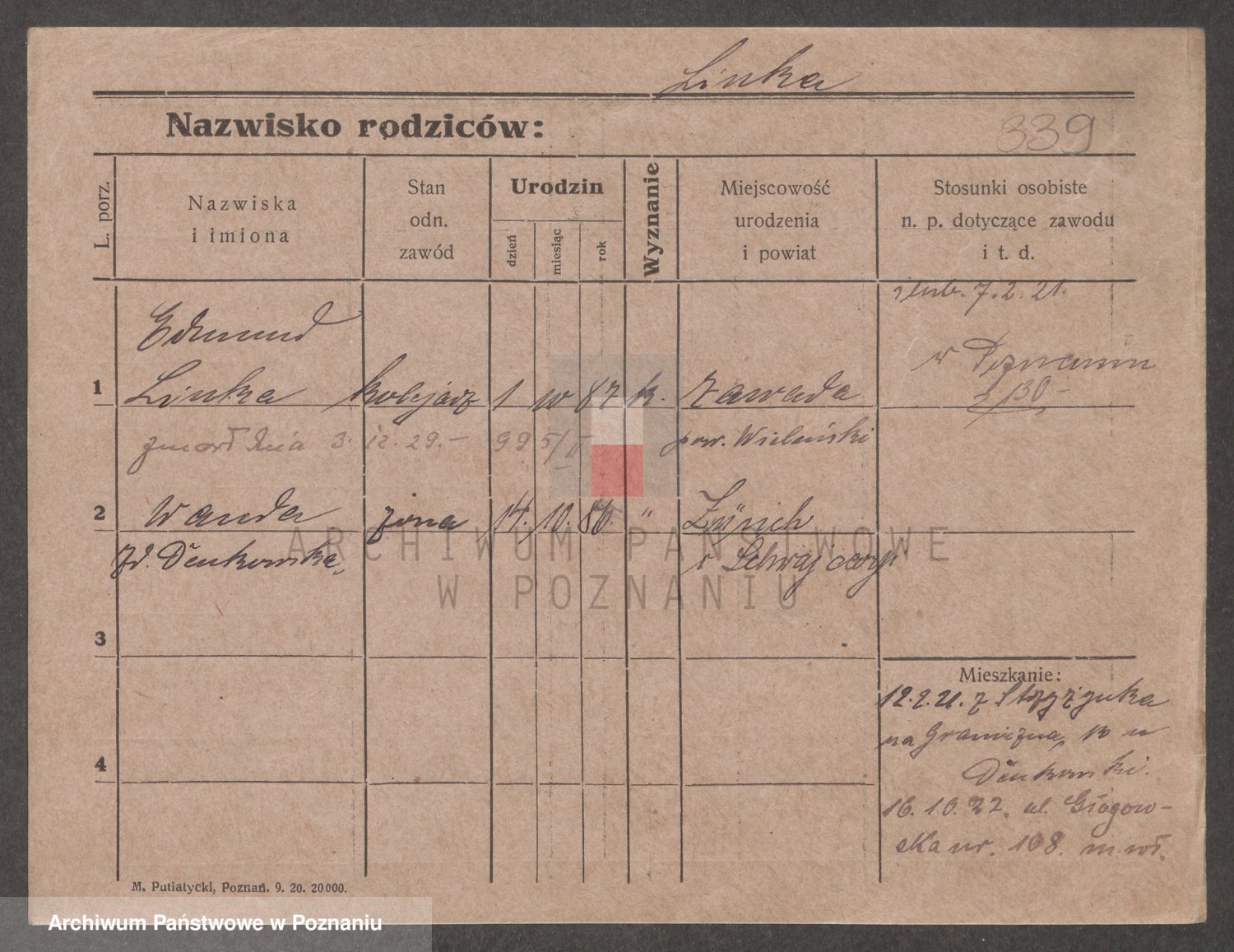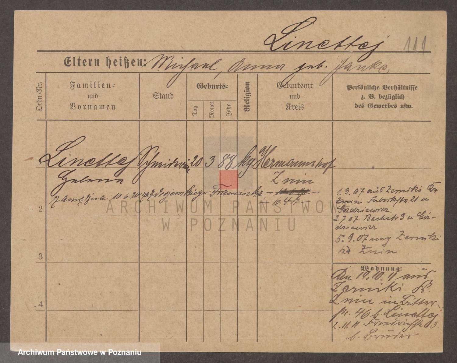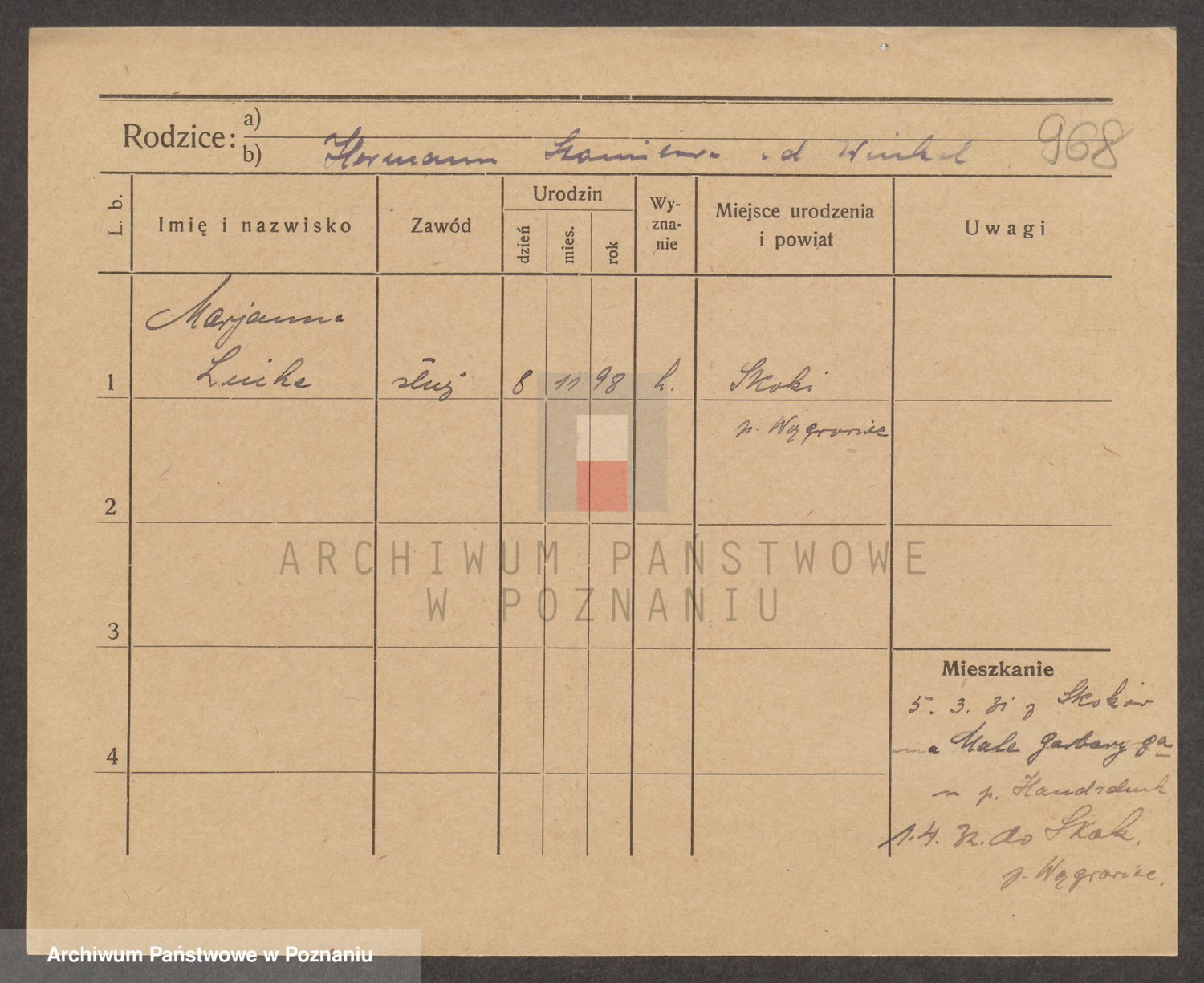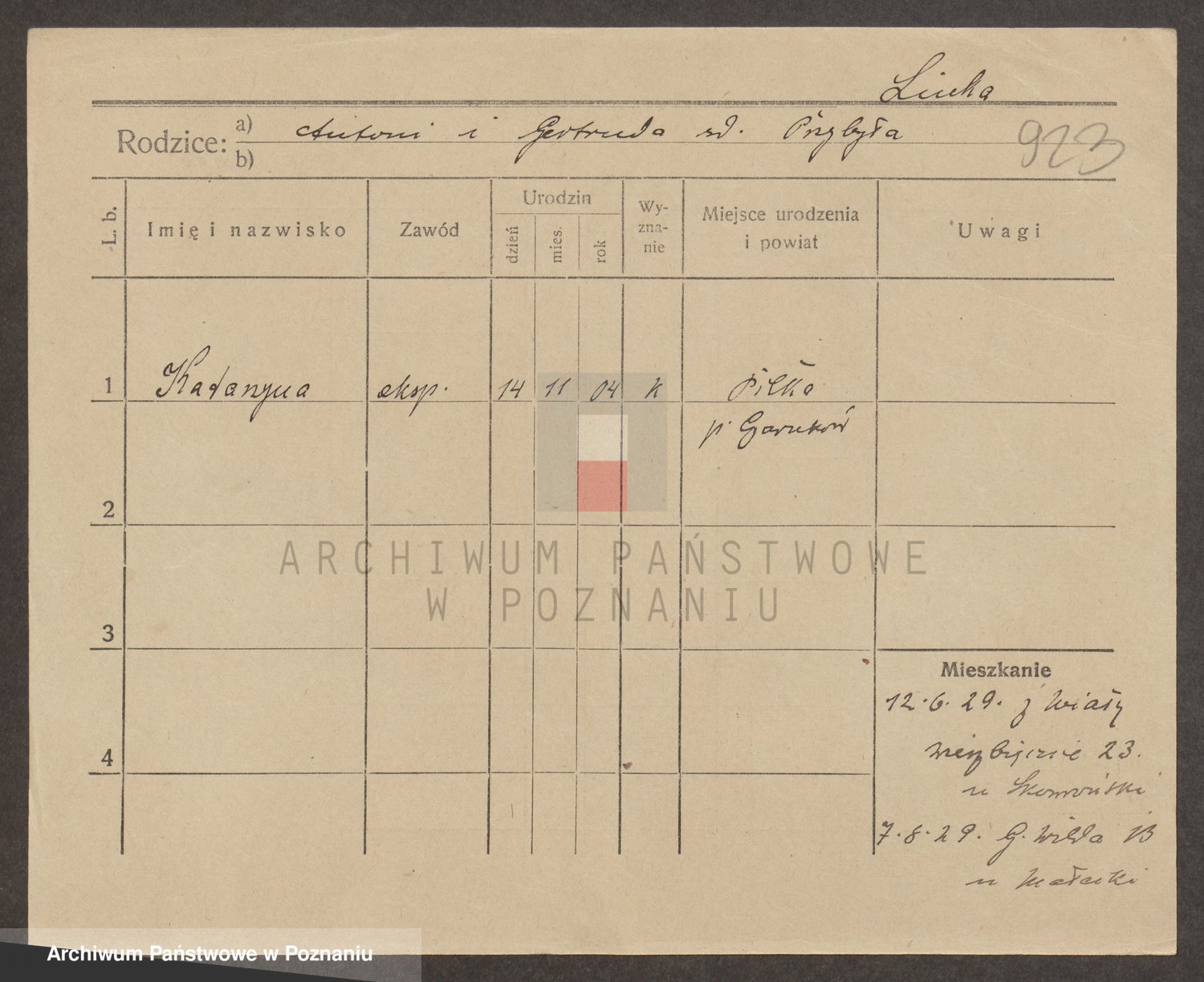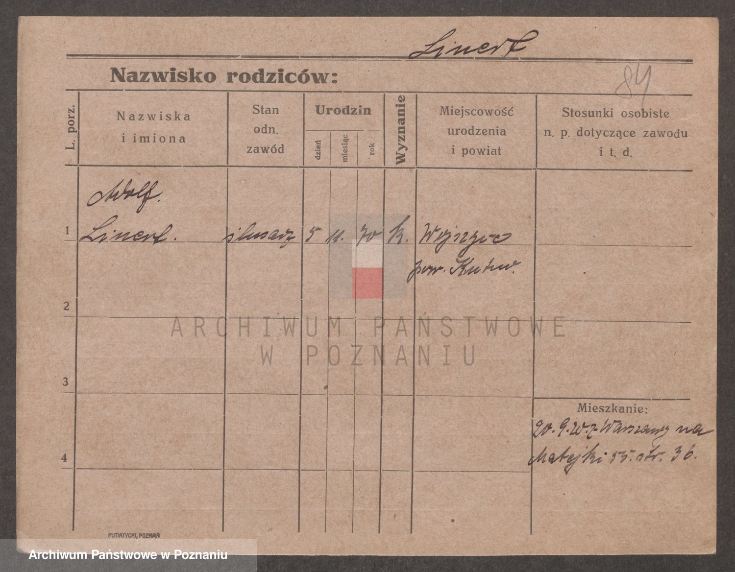 Podgląd karty osobowej dostępny jest po kliknięciu na nazwisko lub ikonkę karty. Można dokonywać powiększenia (ikony na górze) lub przechodzić między kolejnymi skanami (strzałki po bokach).