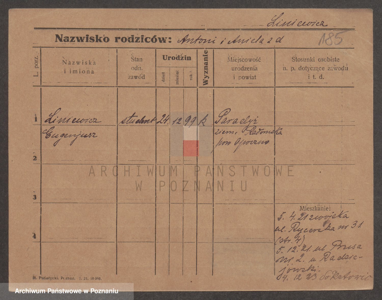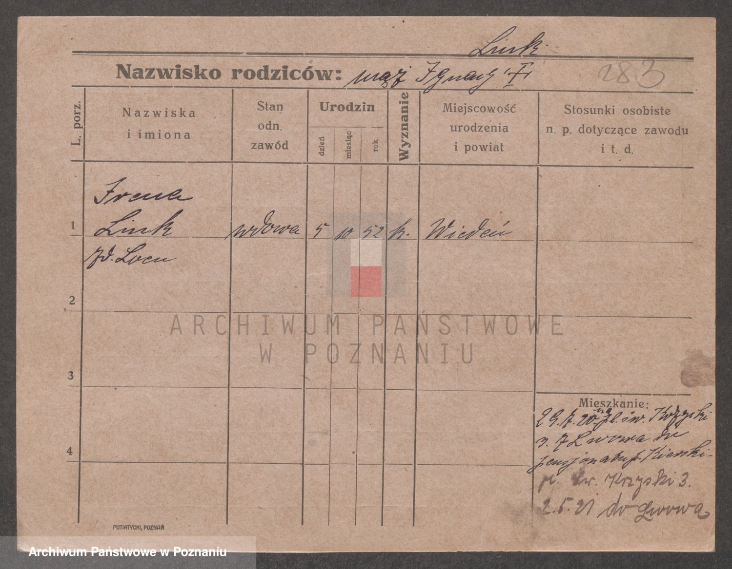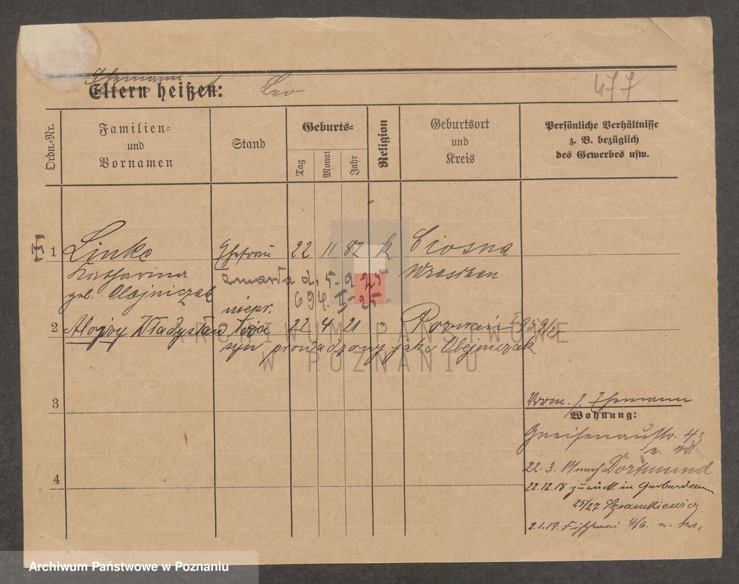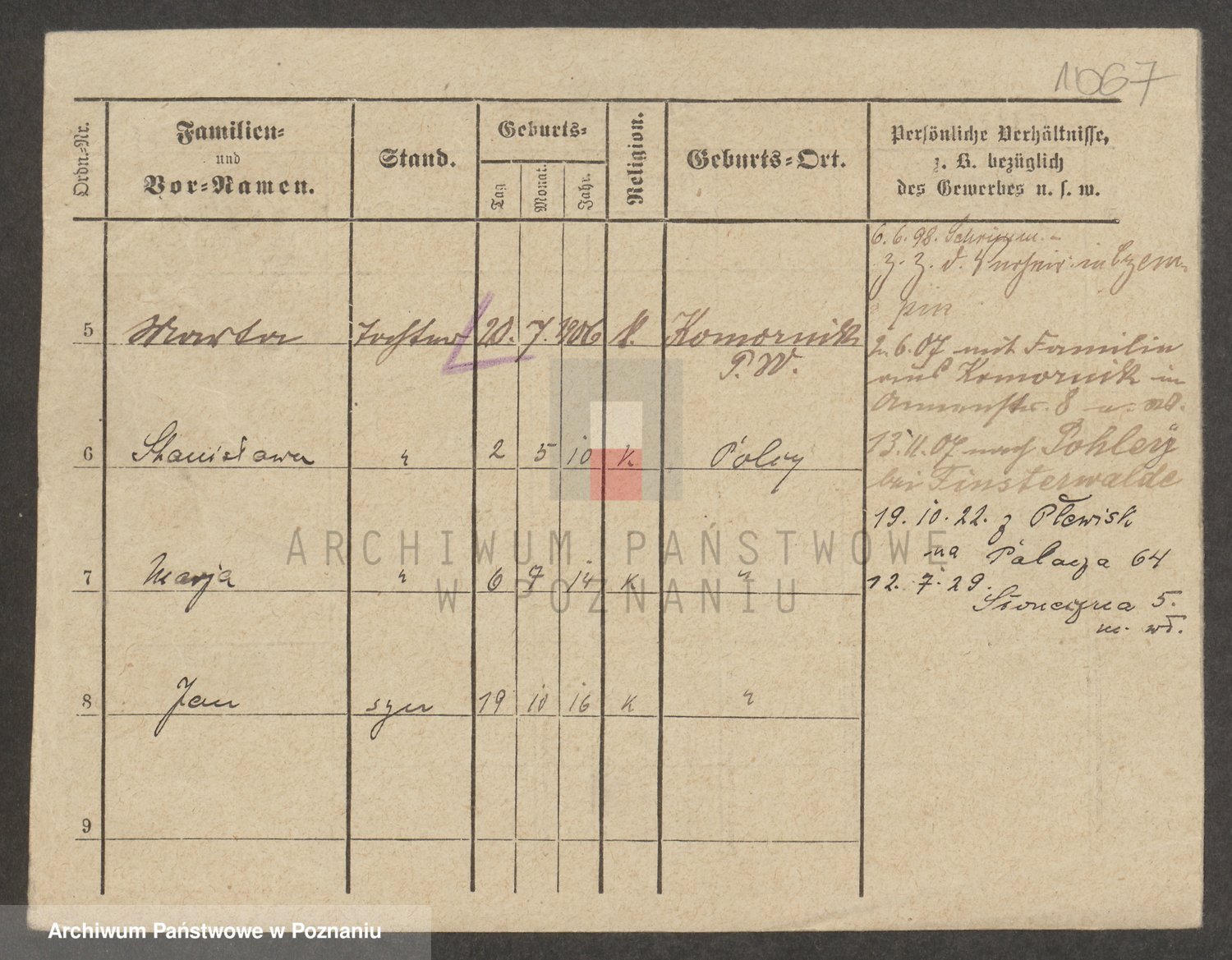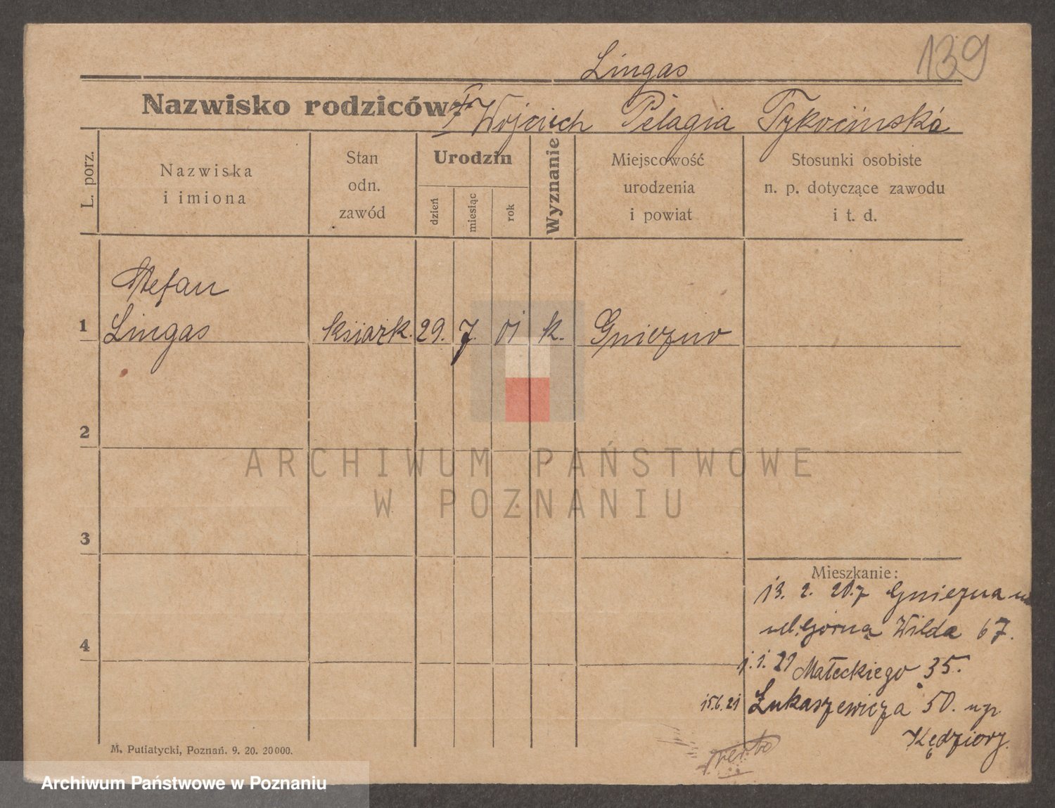 Podgląd karty osobowej dostępny jest po kliknięciu na nazwisko lub ikonkę karty. Można dokonywać powiększenia (ikony na górze) lub przechodzić między kolejnymi skanami (strzałki po bokach).
