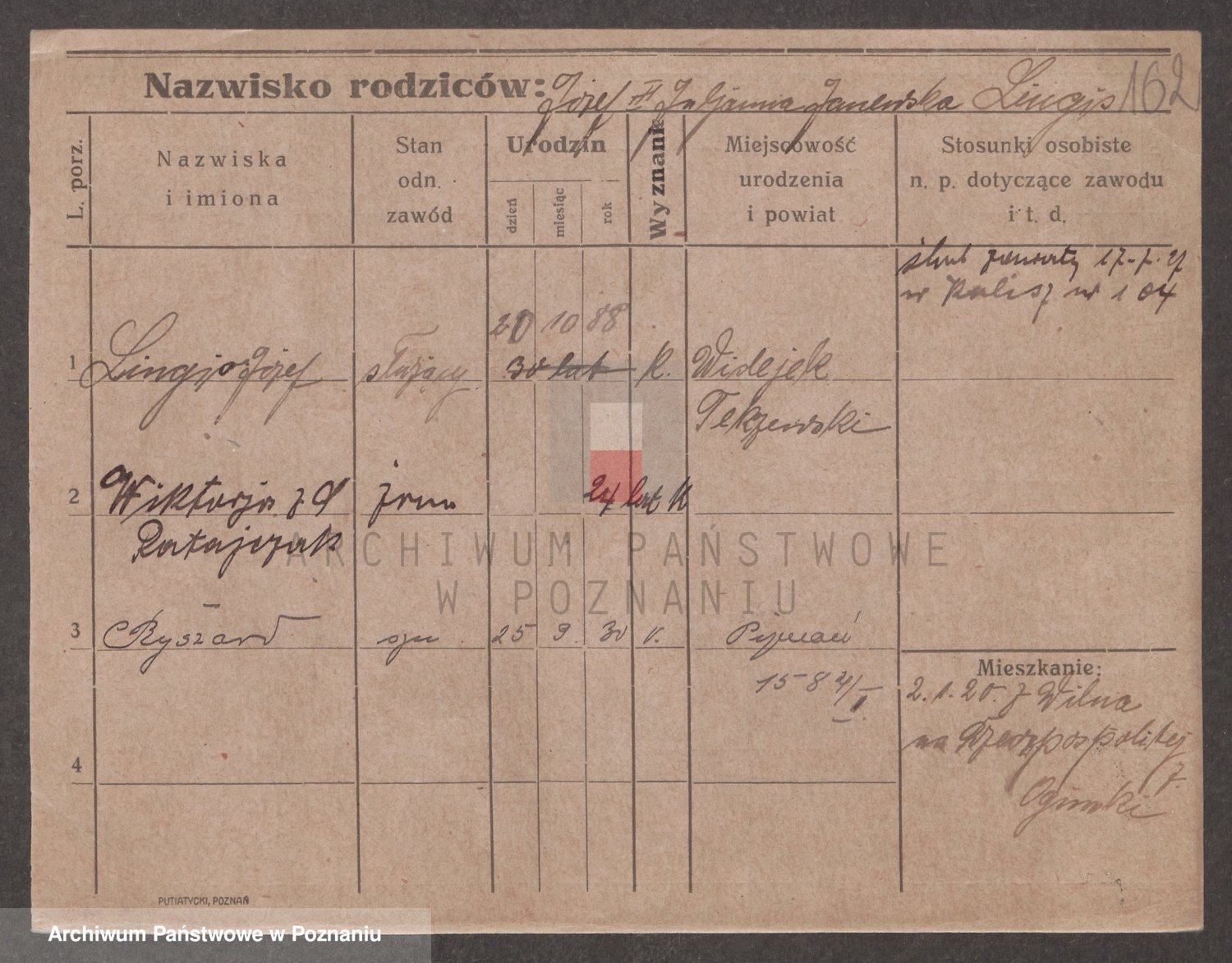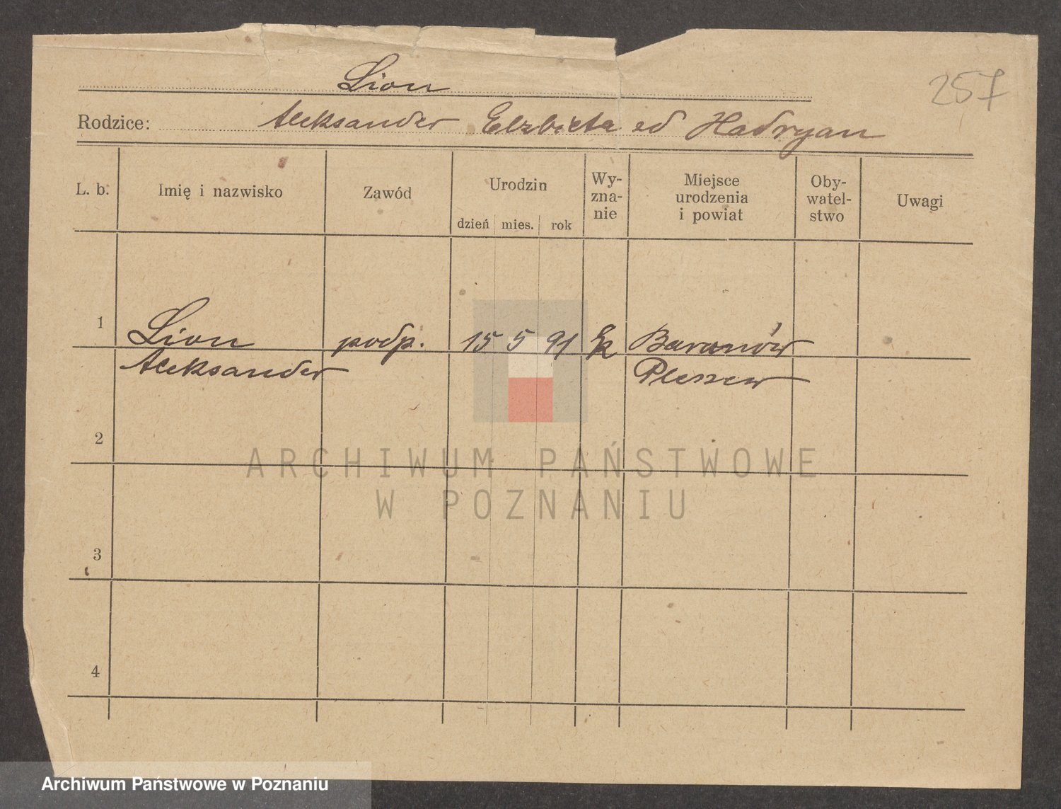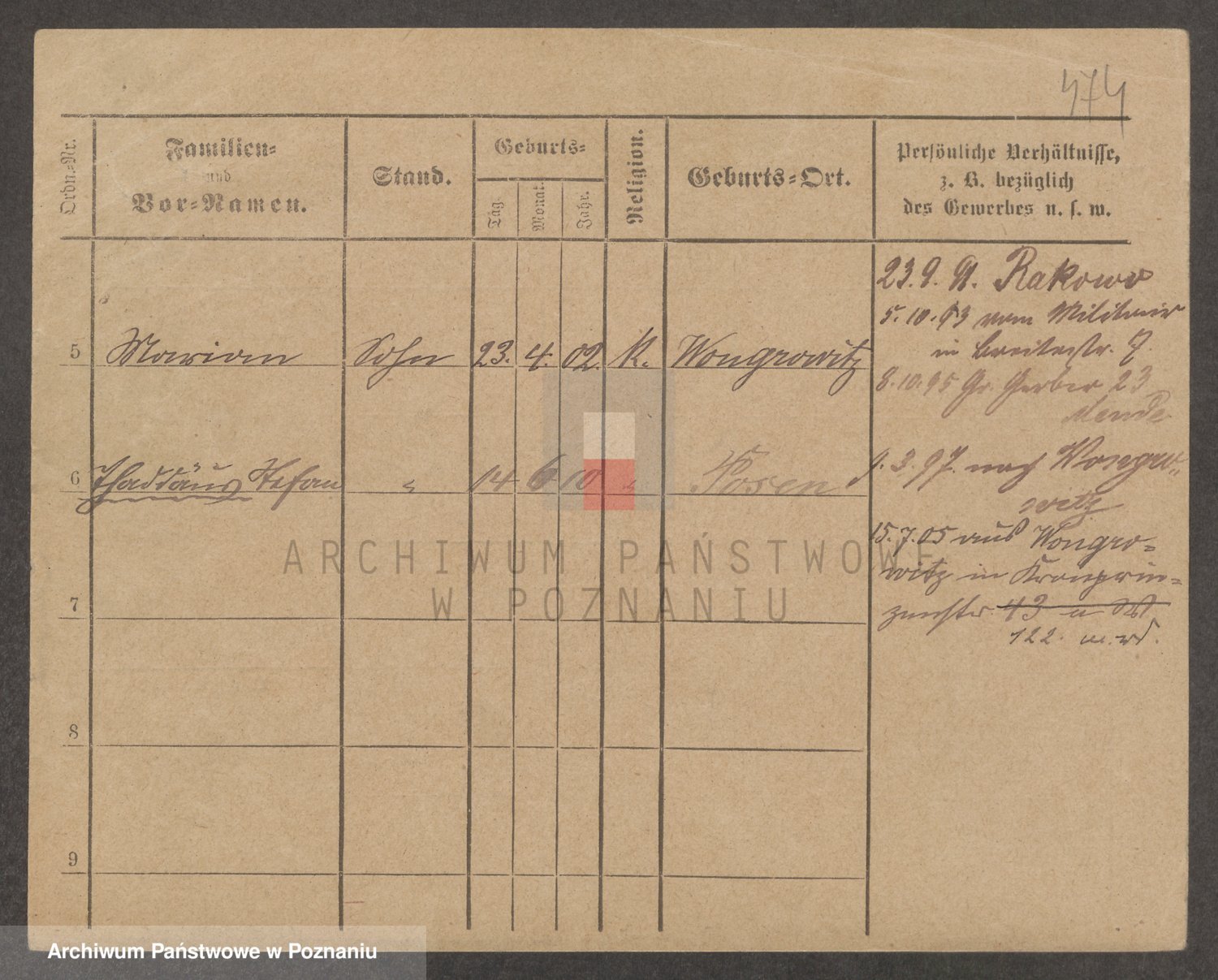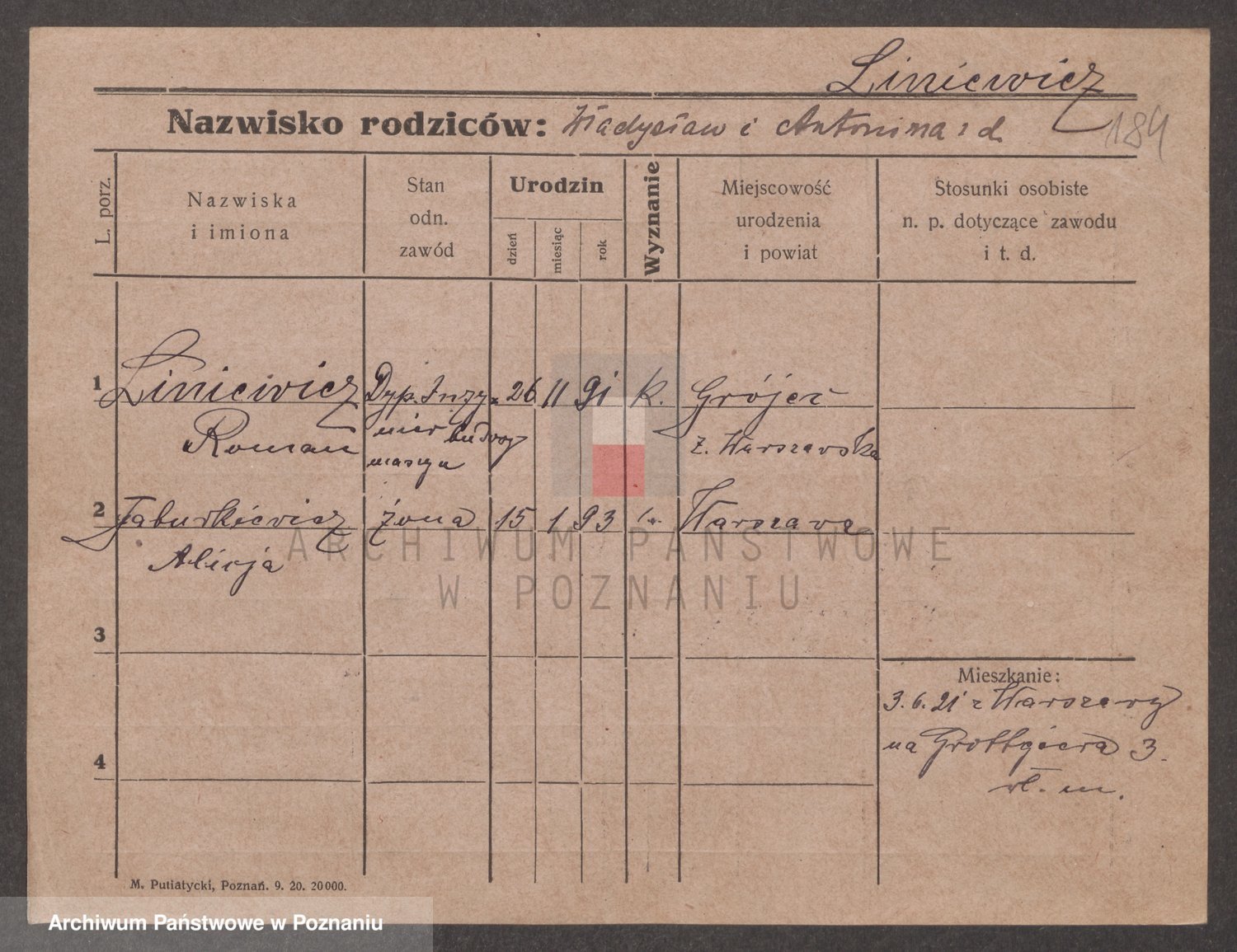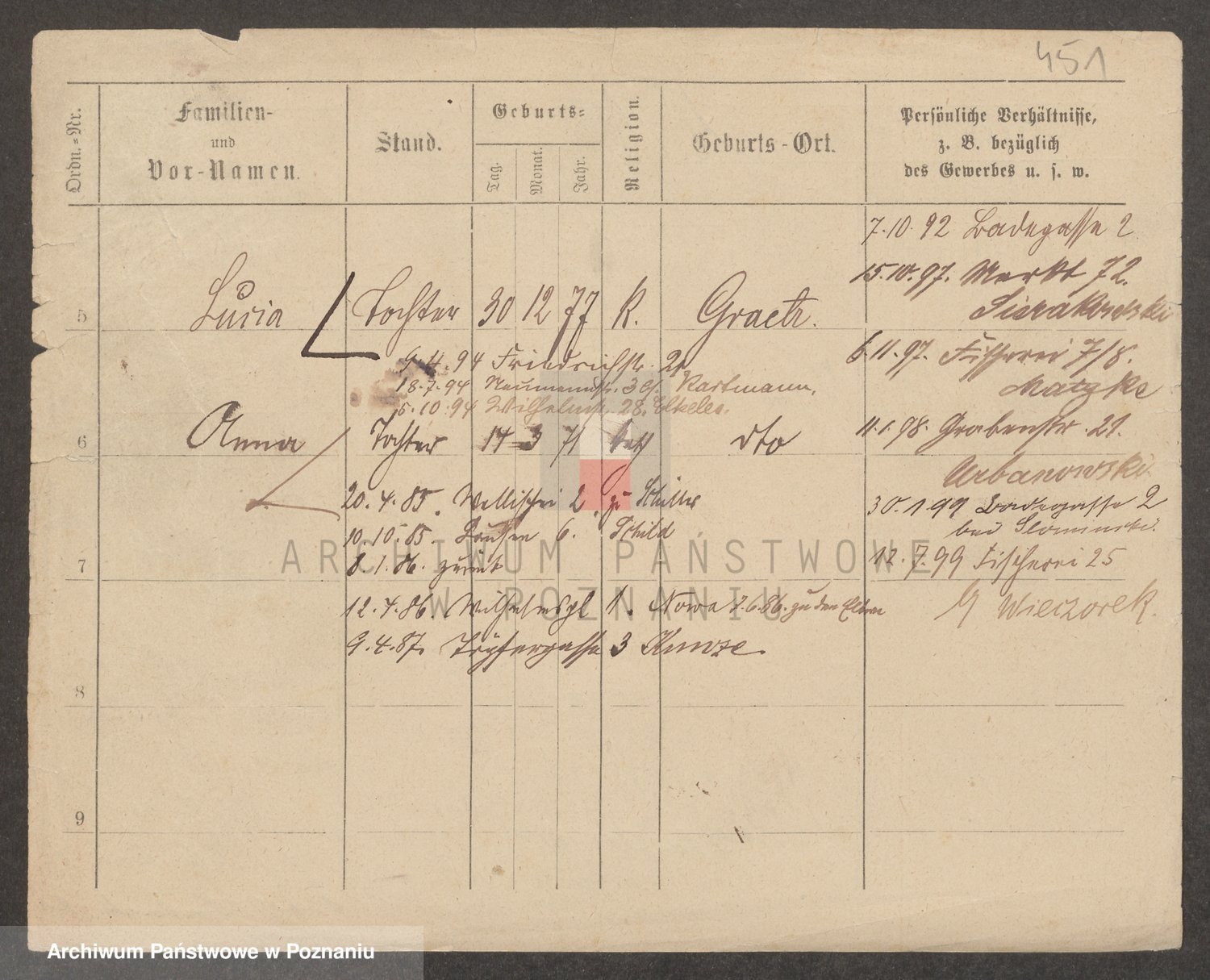 Podgląd karty osobowej dostępny jest po kliknięciu na nazwisko lub ikonkę karty. Można dokonywać powiększenia (ikony na górze) lub przechodzić między kolejnymi skanami (strzałki po bokach).