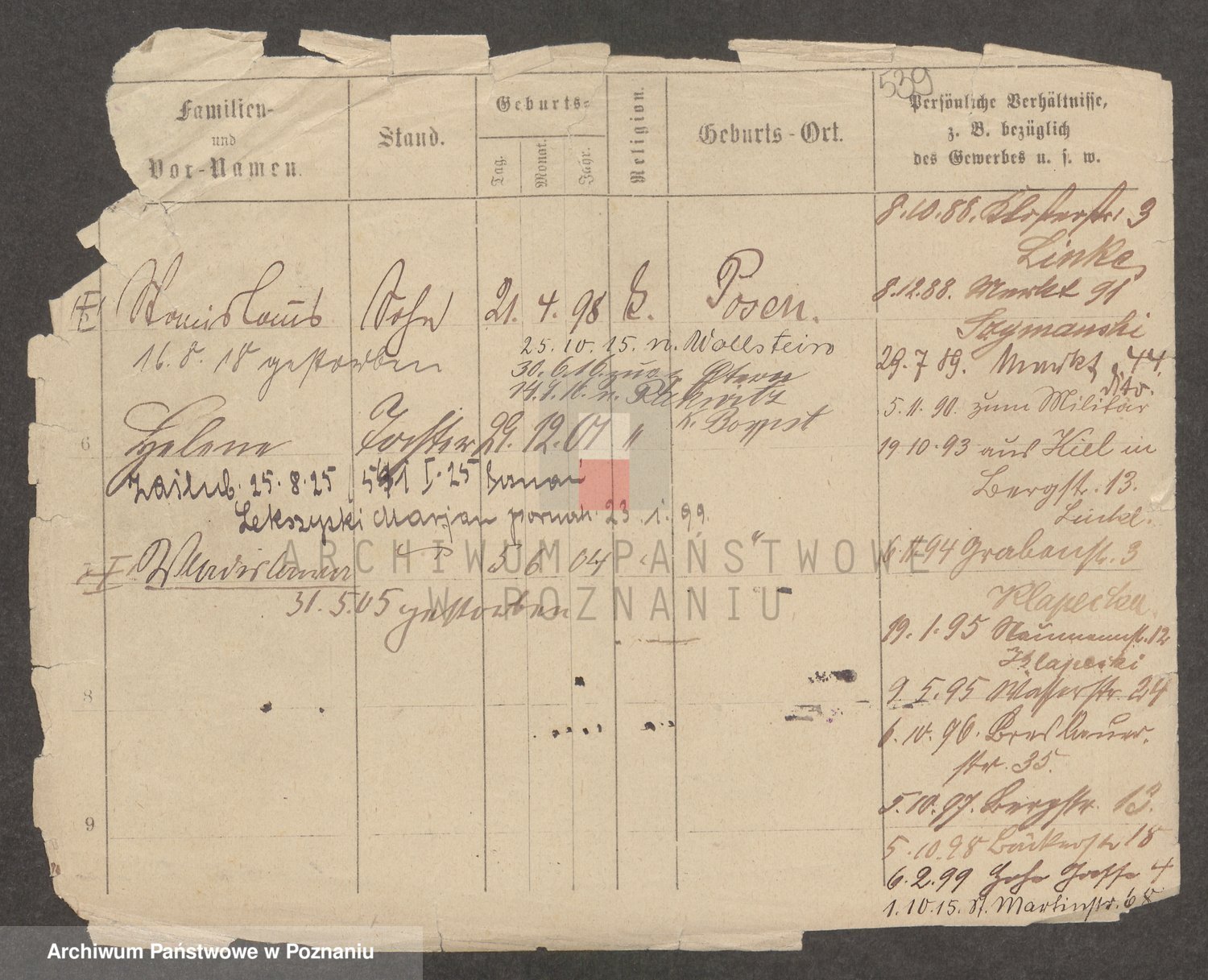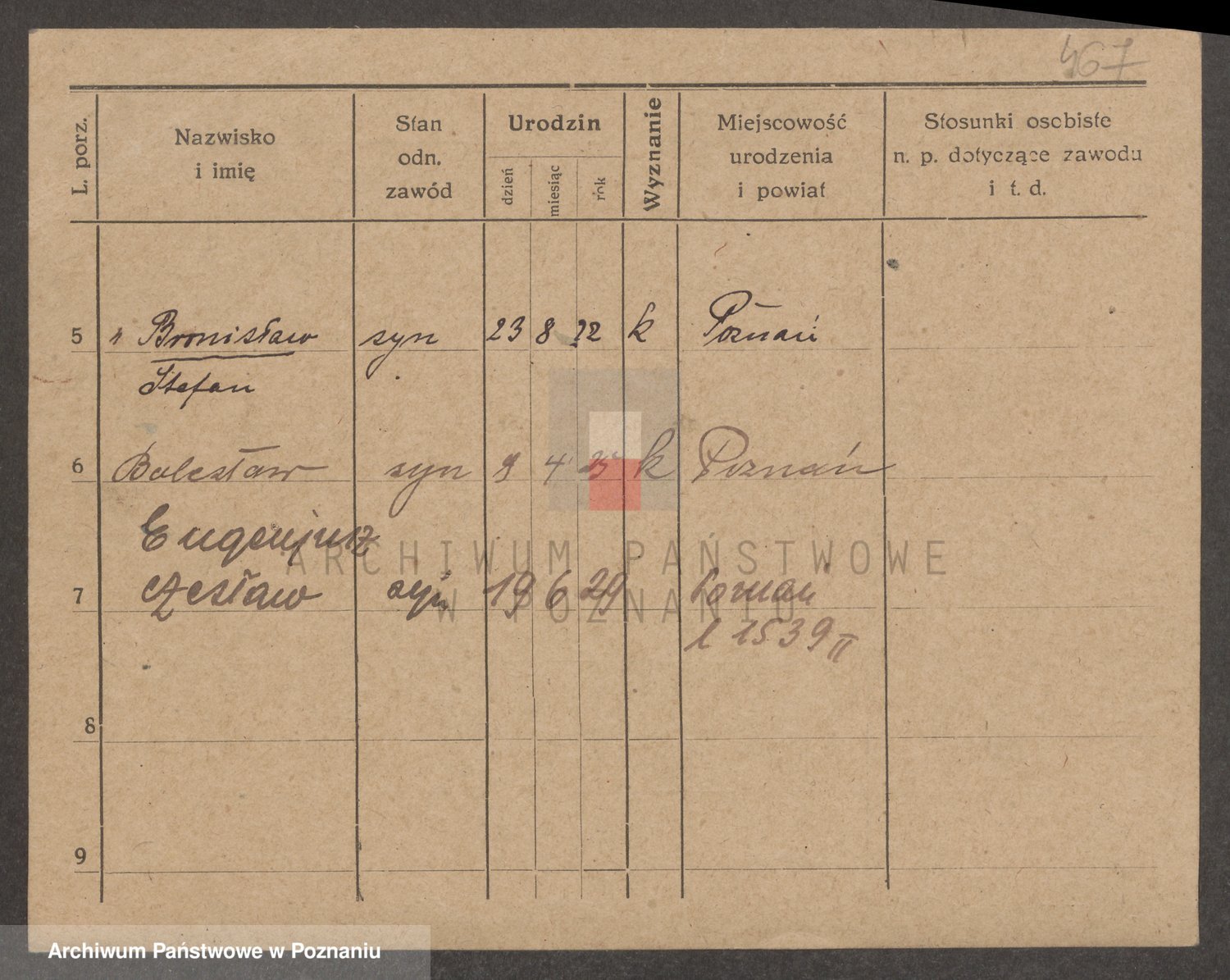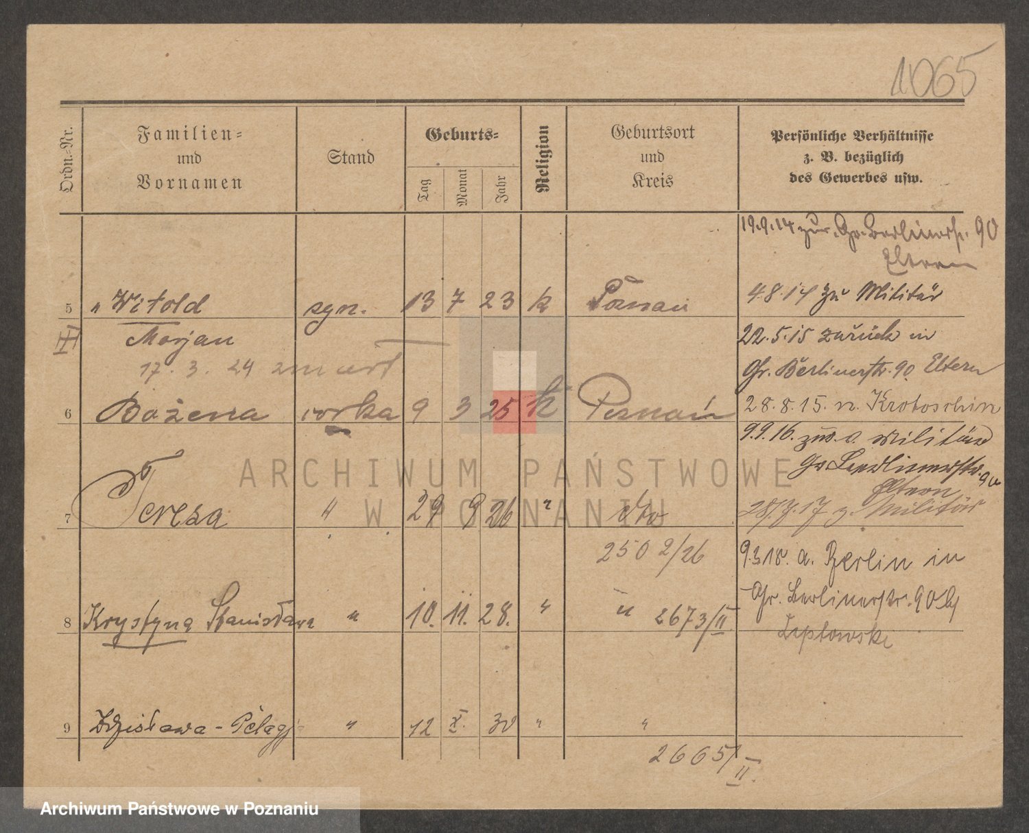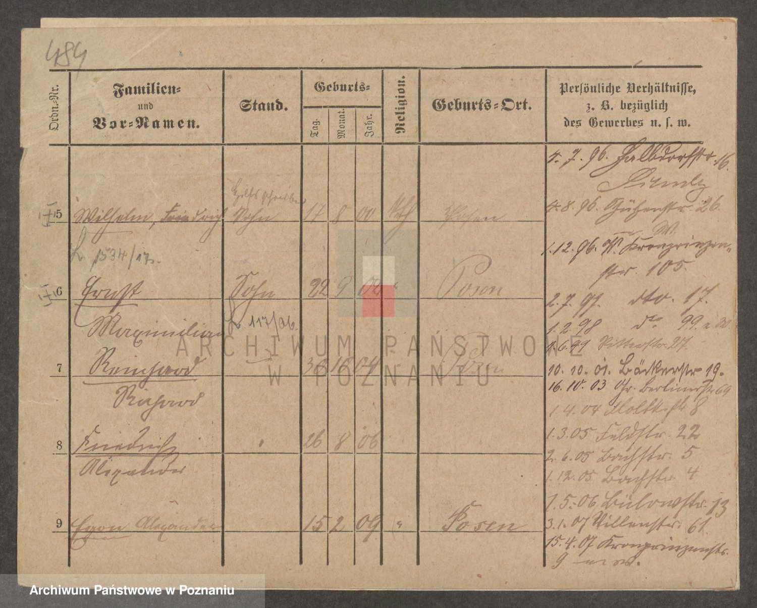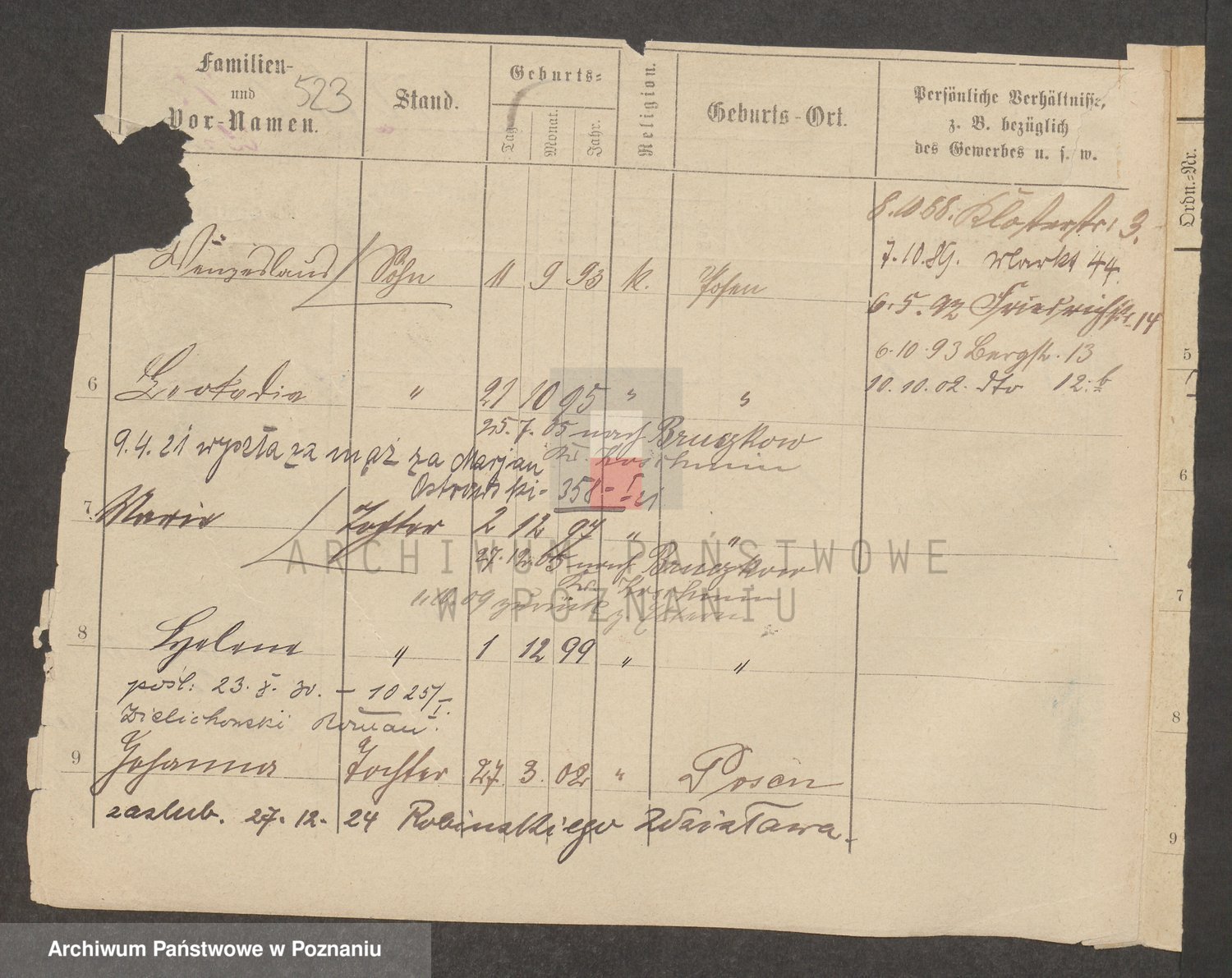 Podgląd karty osobowej dostępny jest po kliknięciu na nazwisko lub ikonkę karty. Można dokonywać powiększenia (ikony na górze) lub przechodzić między kolejnymi skanami (strzałki po bokach).