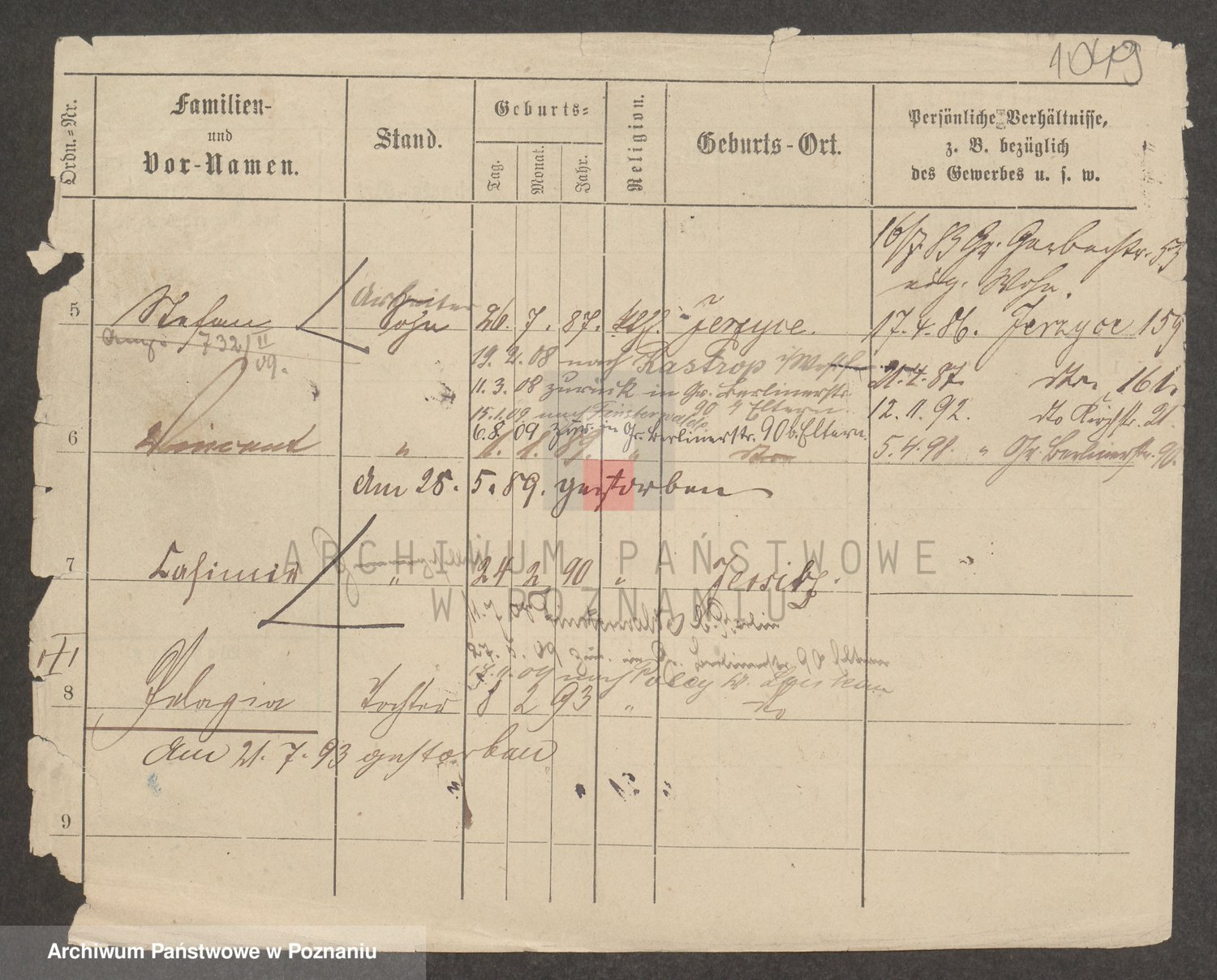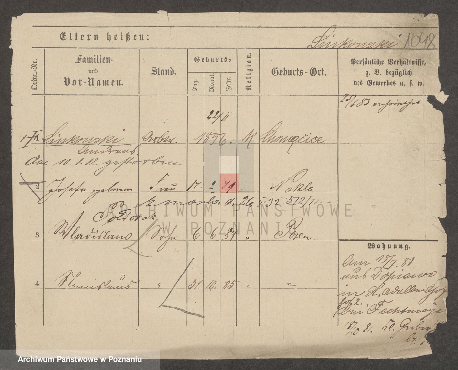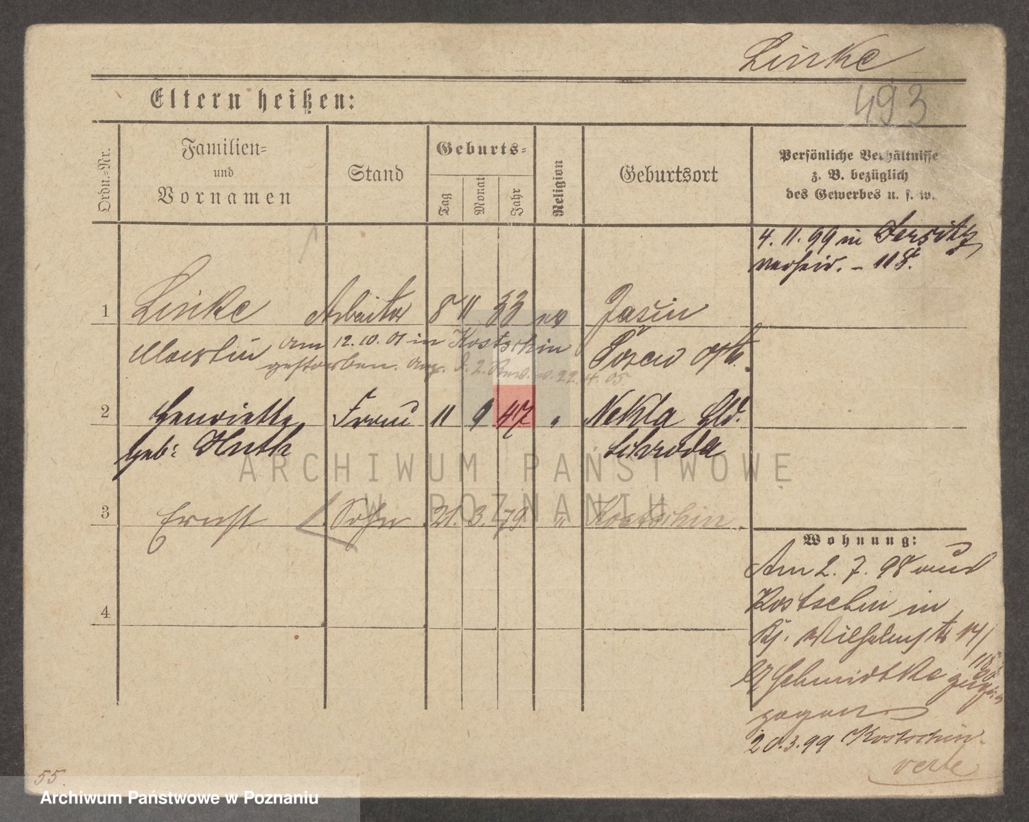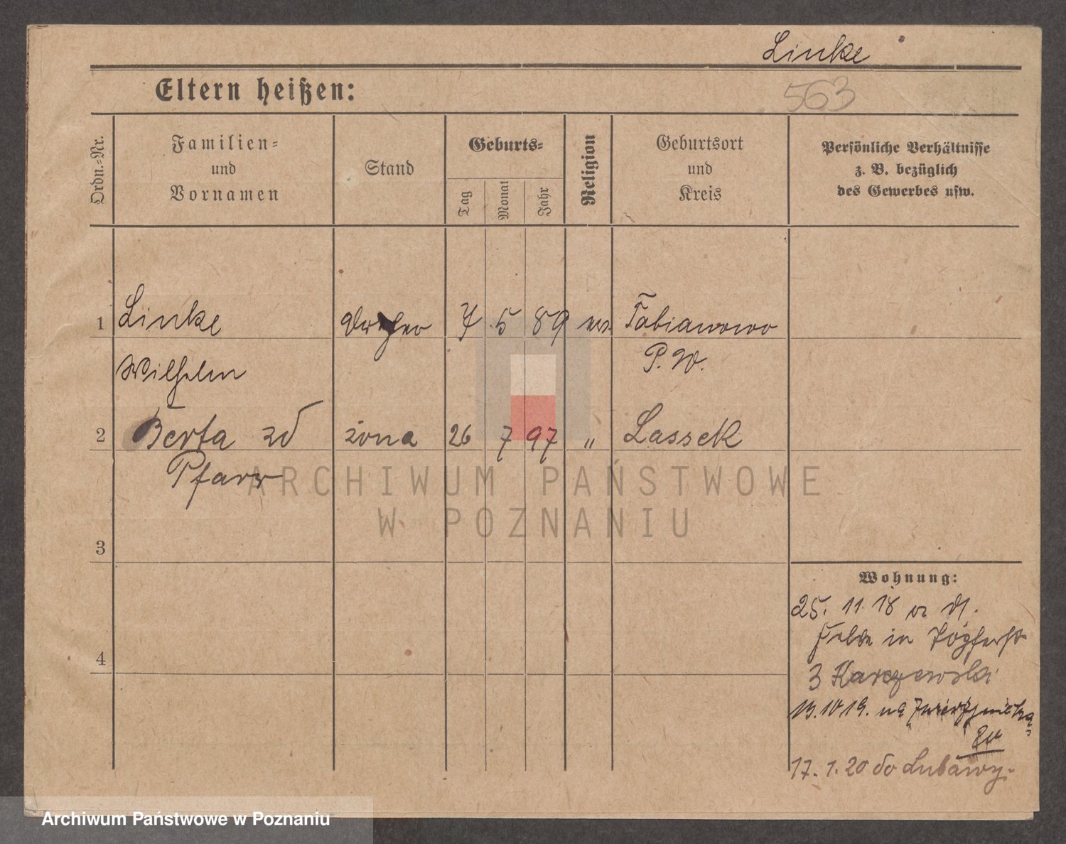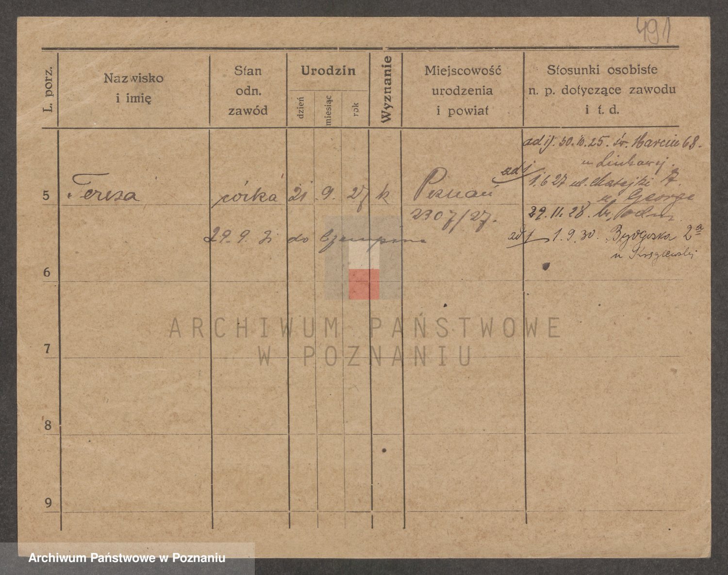 Podgląd karty osobowej dostępny jest po kliknięciu na nazwisko lub ikonkę karty. Można dokonywać powiększenia (ikony na górze) lub przechodzić między kolejnymi skanami (strzałki po bokach).