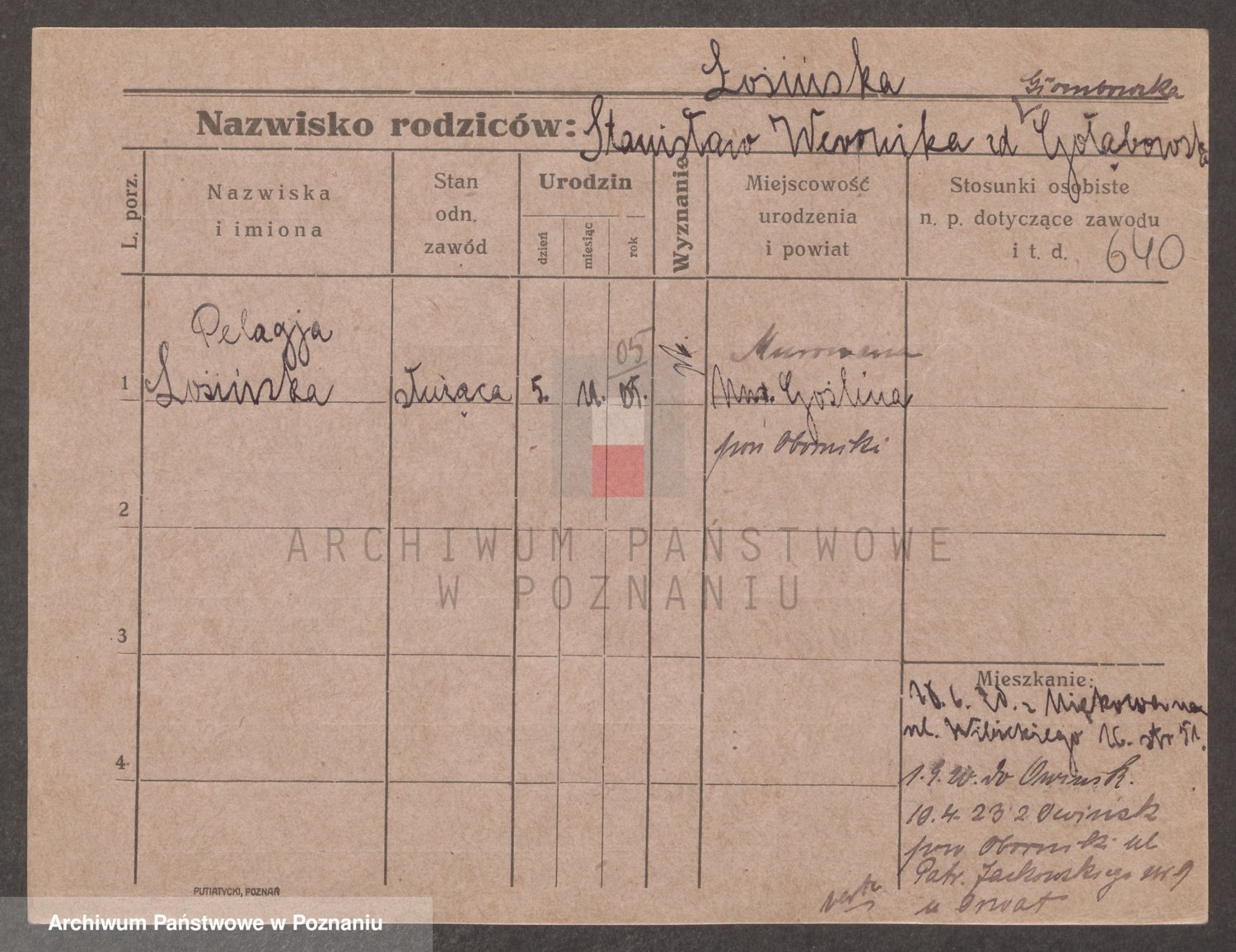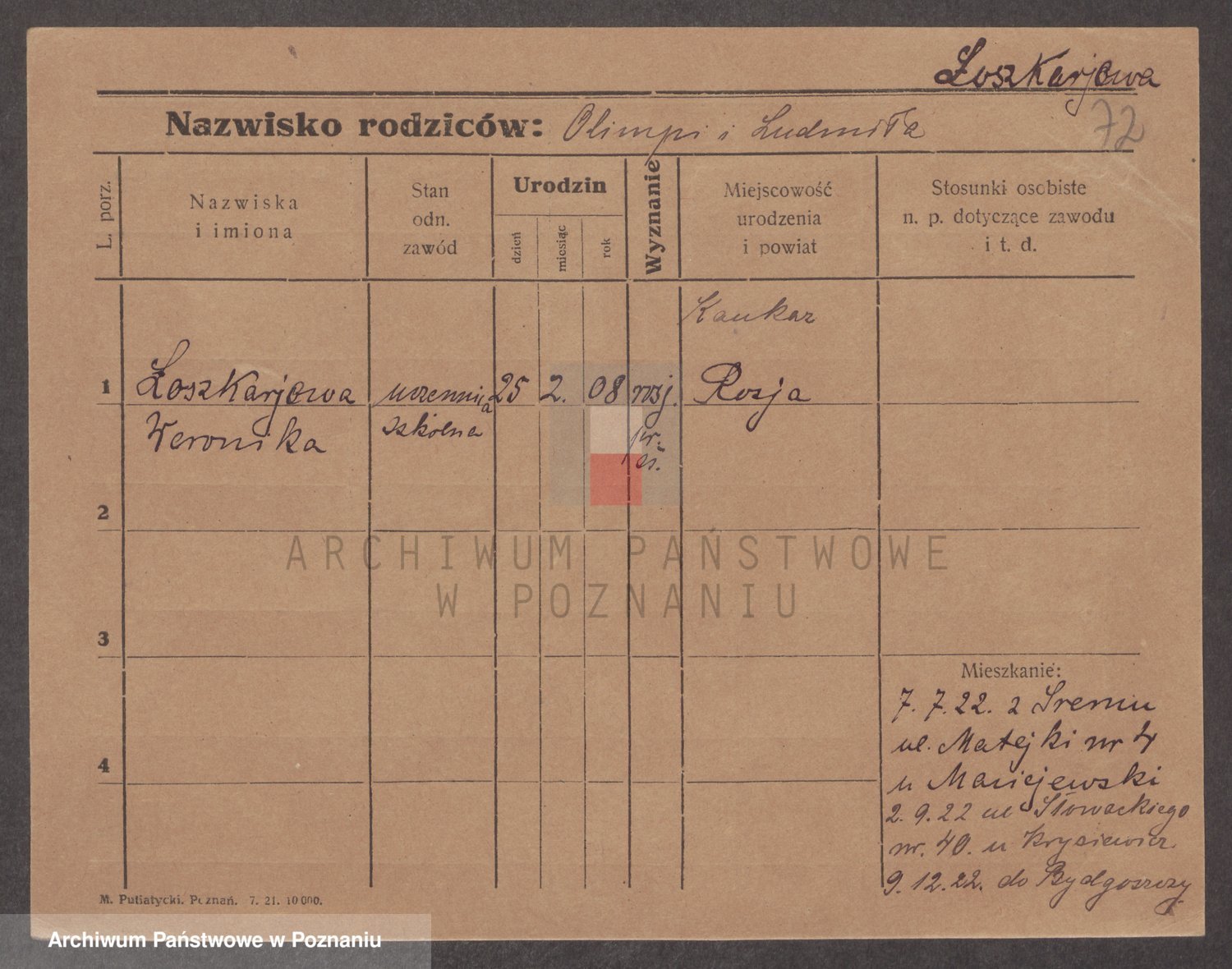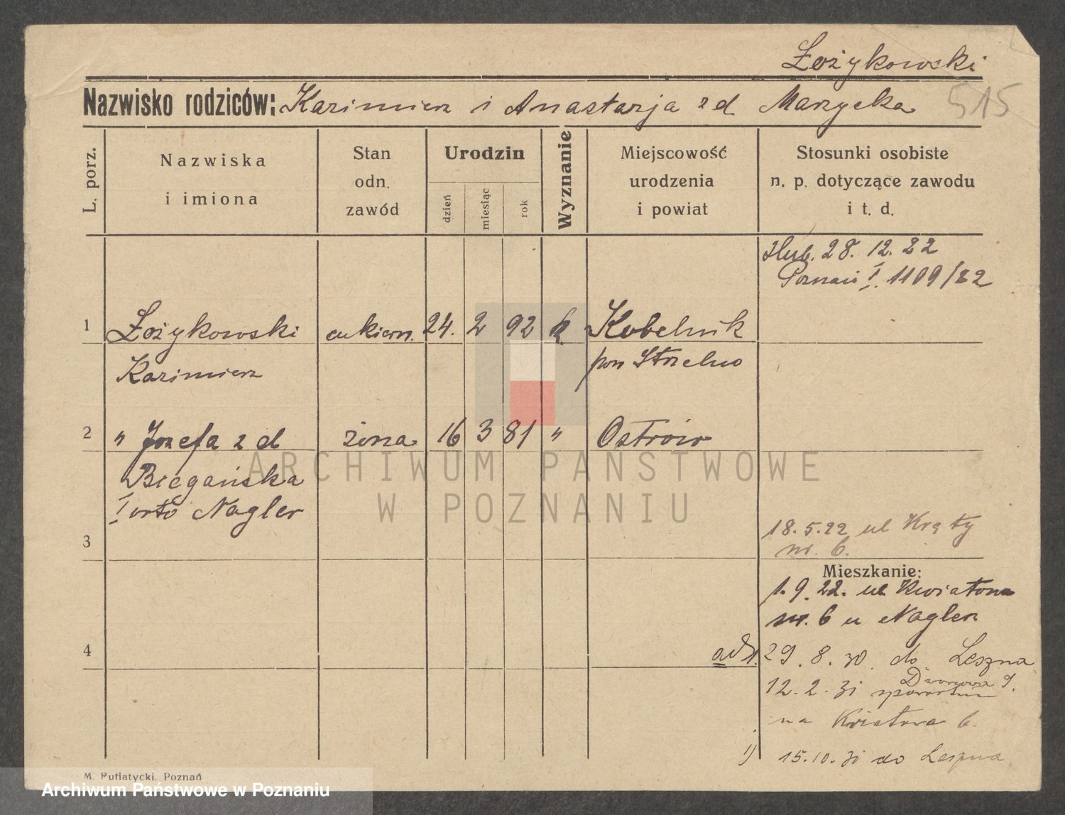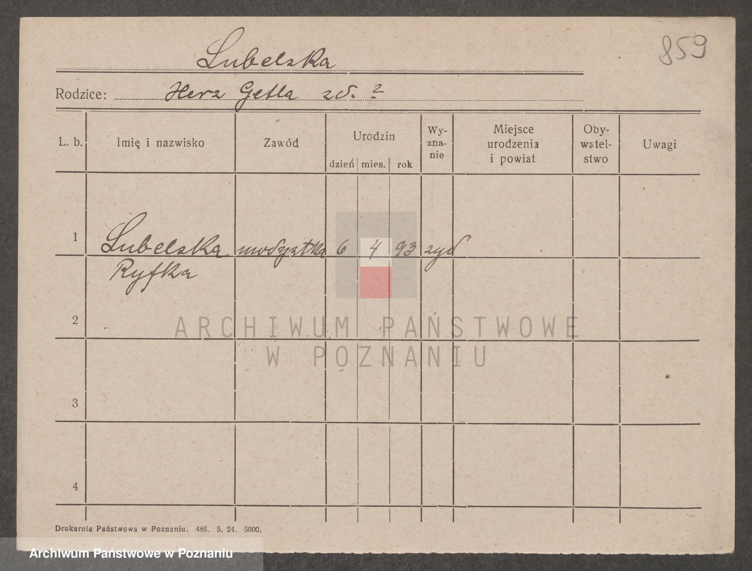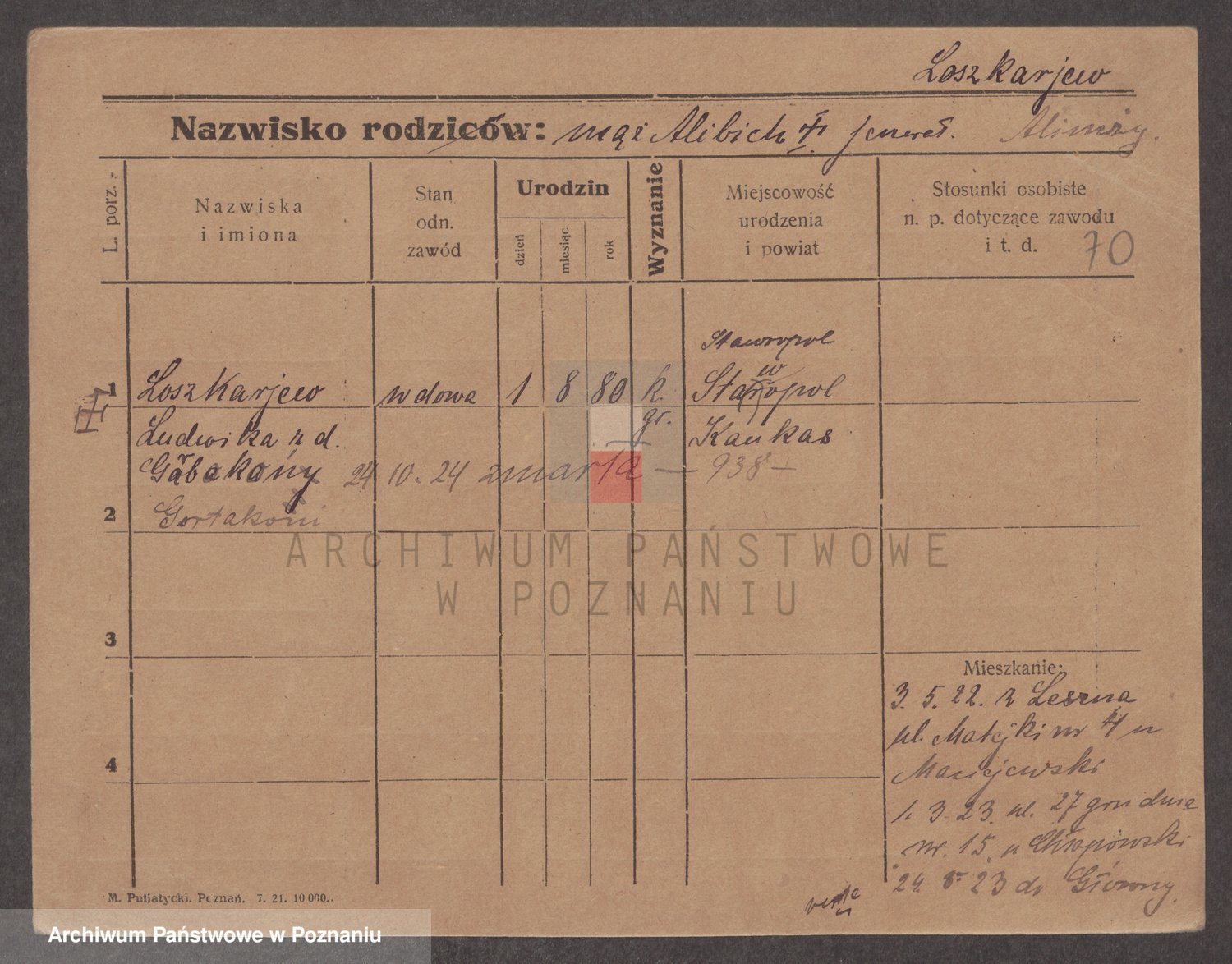 Podgląd karty osobowej dostępny jest po kliknięciu na nazwisko lub ikonkę karty. Można dokonywać powiększenia (ikony na górze) lub przechodzić między kolejnymi skanami (strzałki po bokach).