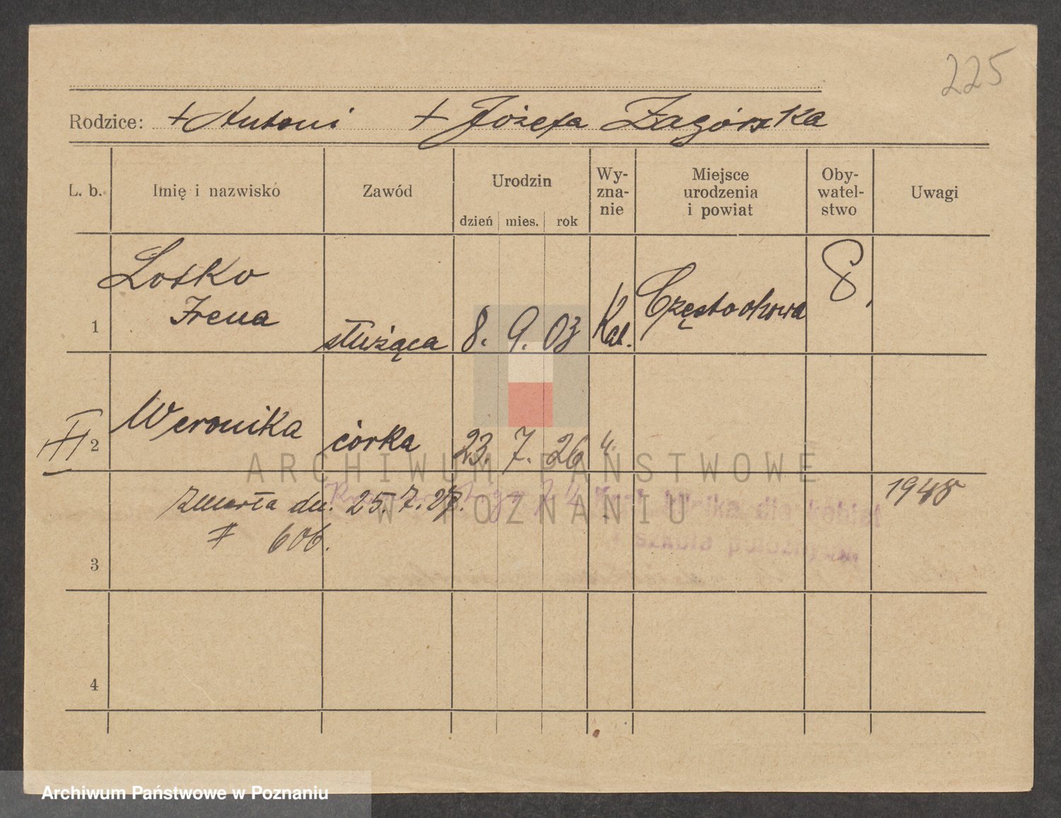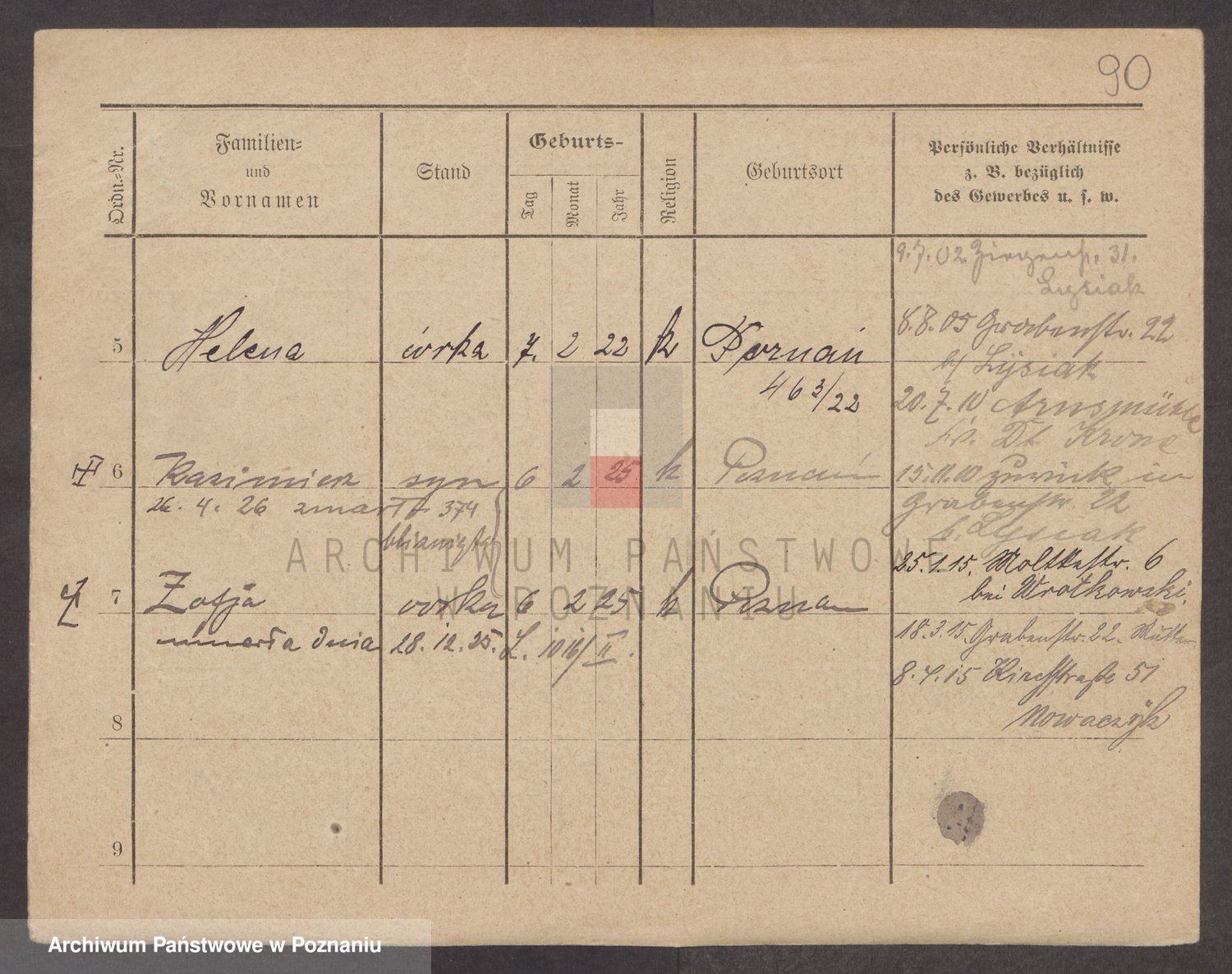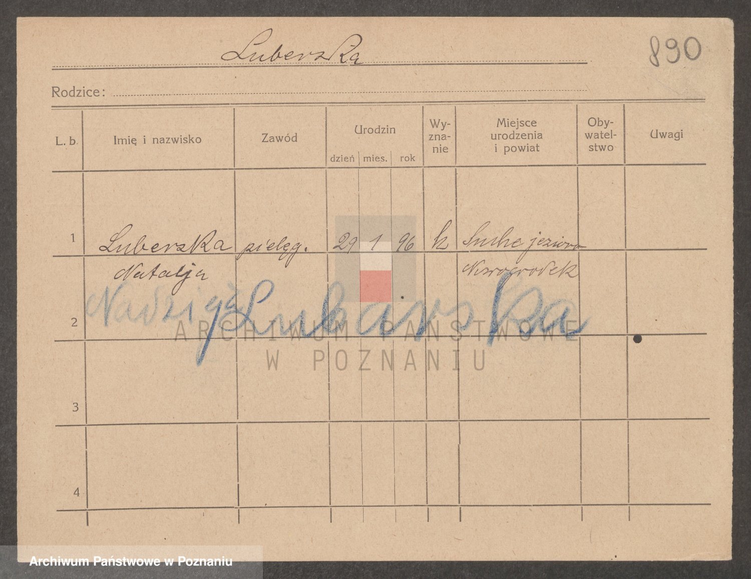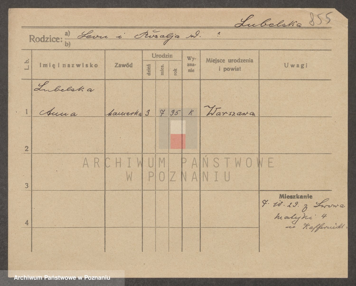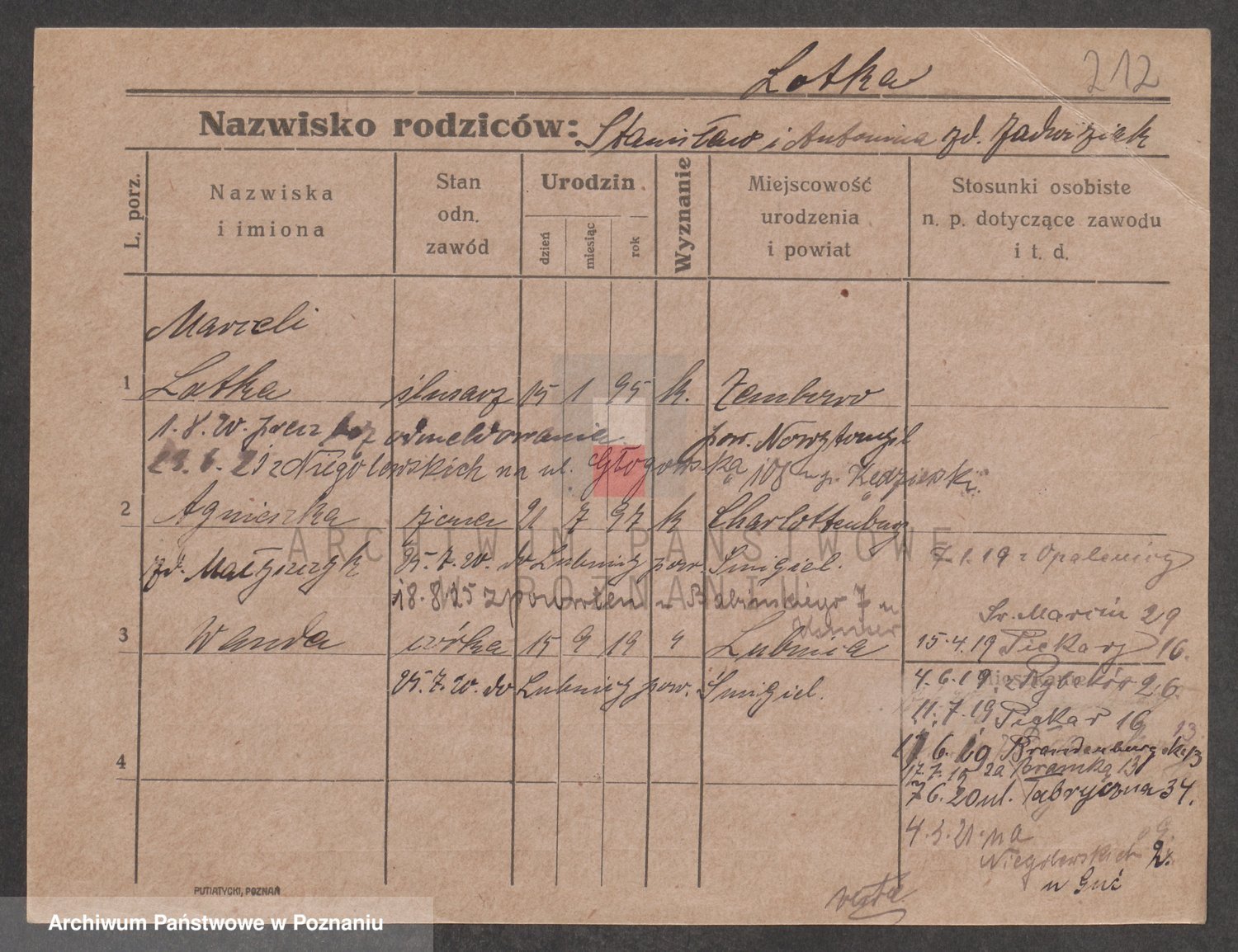 Podgląd karty osobowej dostępny jest po kliknięciu na nazwisko lub ikonkę karty. Można dokonywać powiększenia (ikony na górze) lub przechodzić między kolejnymi skanami (strzałki po bokach).