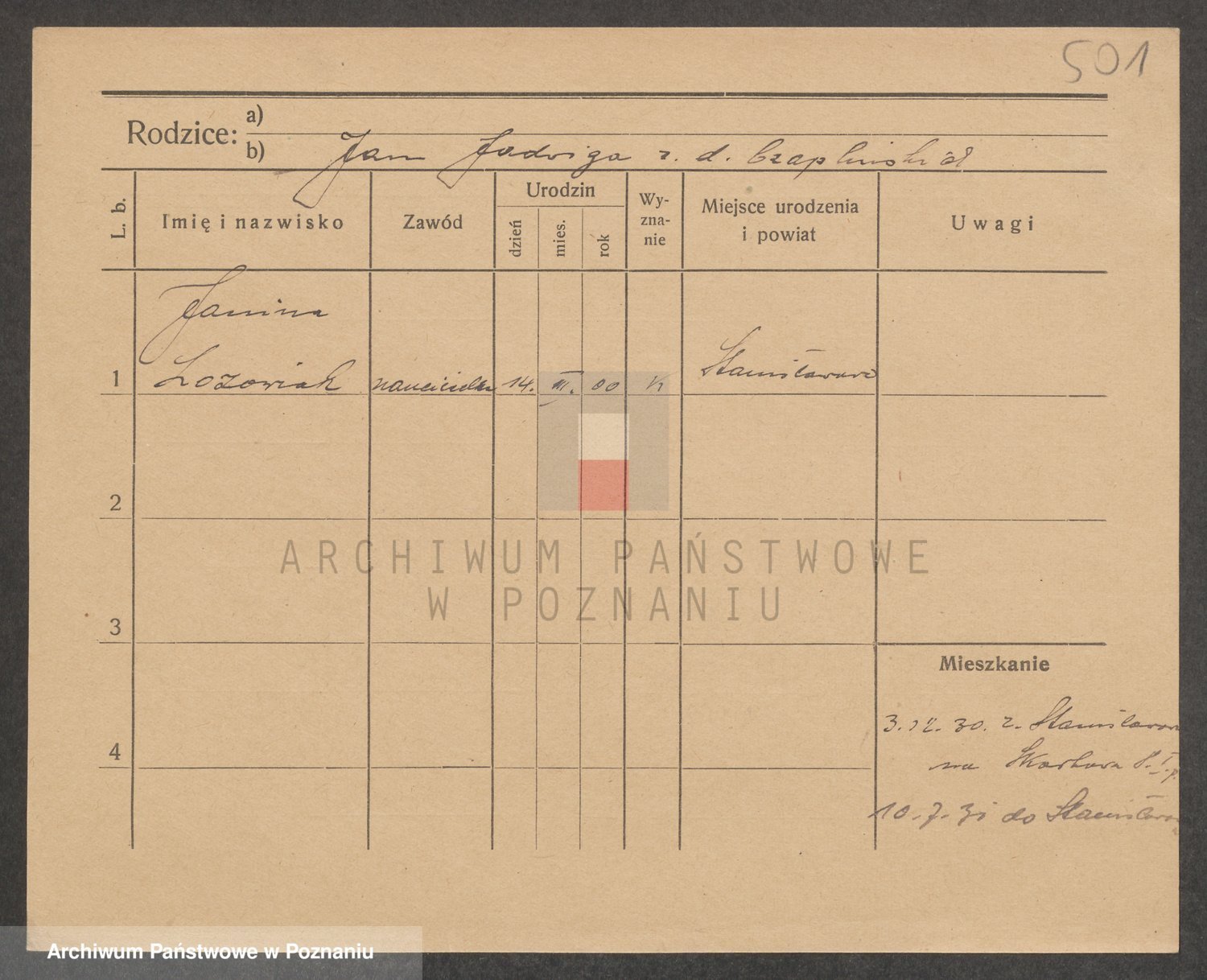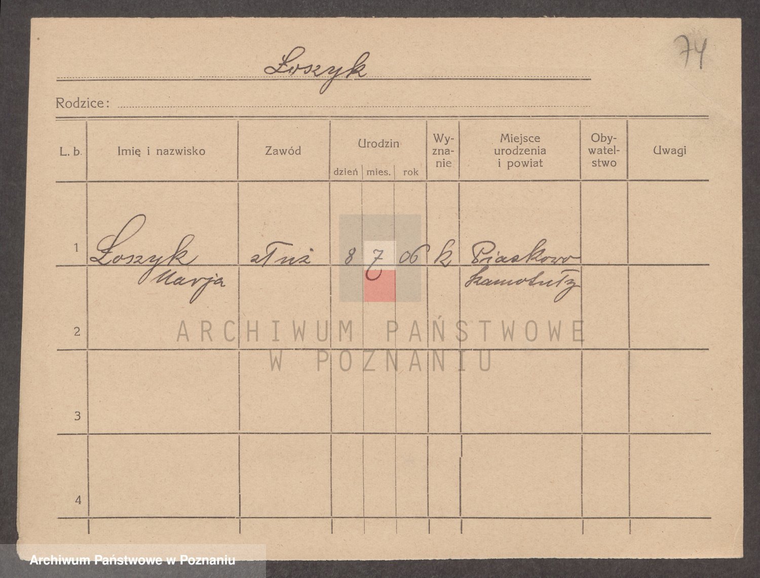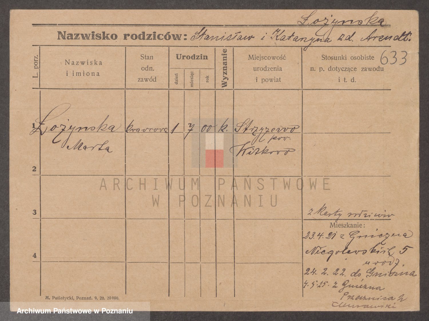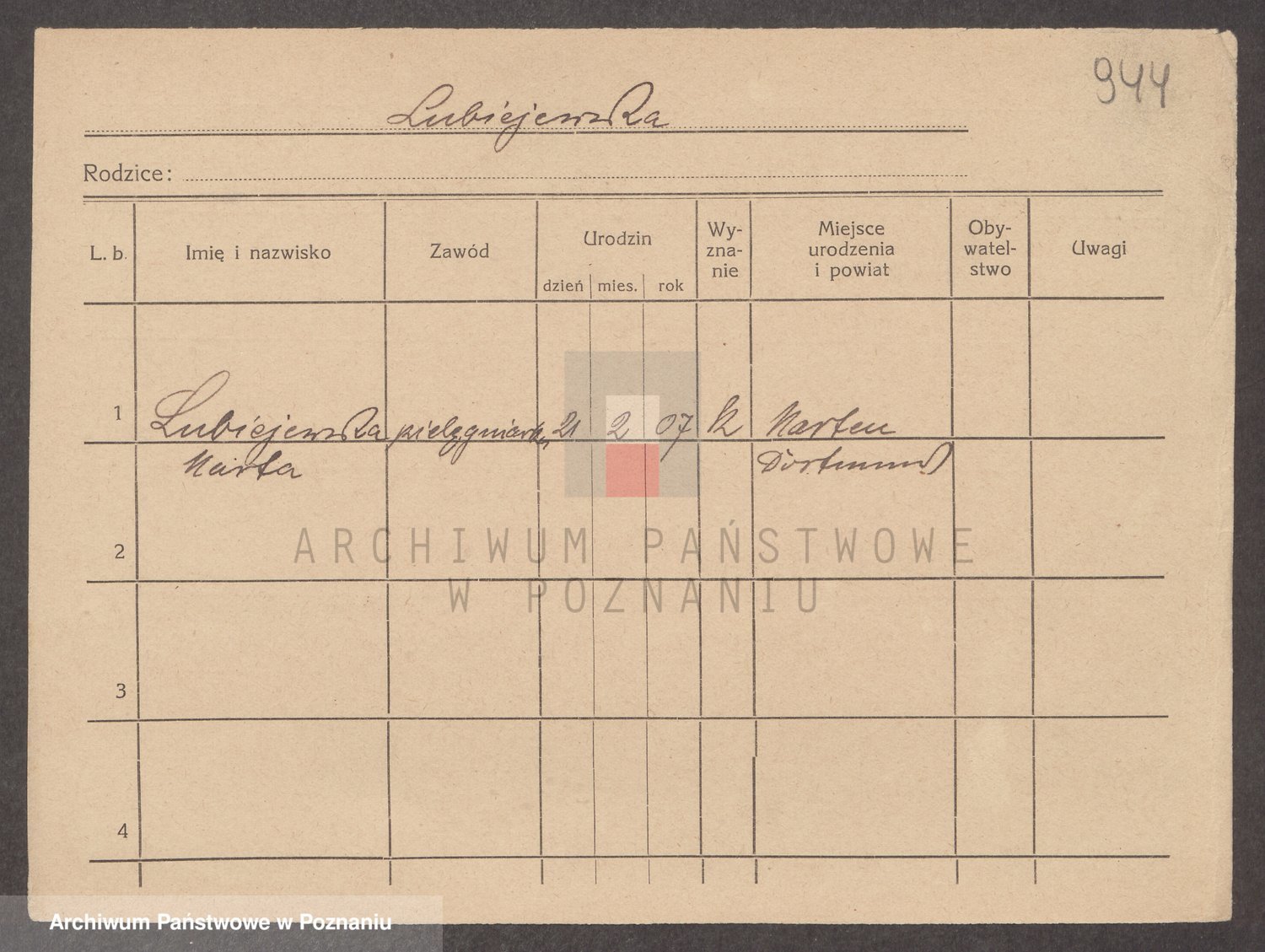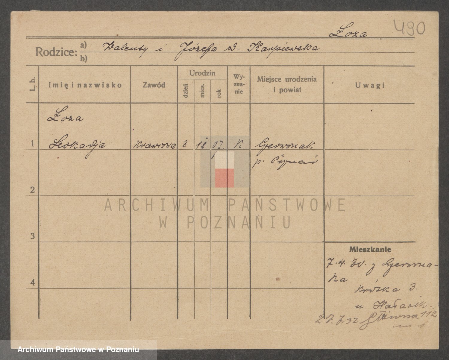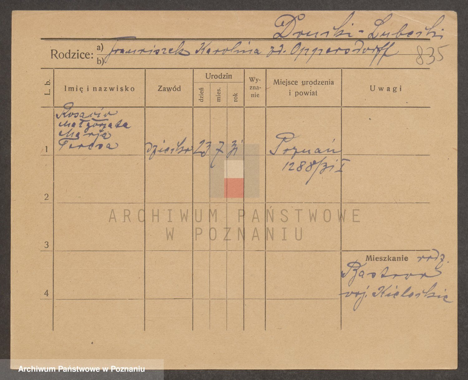 Podgląd karty osobowej dostępny jest po kliknięciu na nazwisko lub ikonkę karty. Można dokonywać powiększenia (ikony na górze) lub przechodzić między kolejnymi skanami (strzałki po bokach).