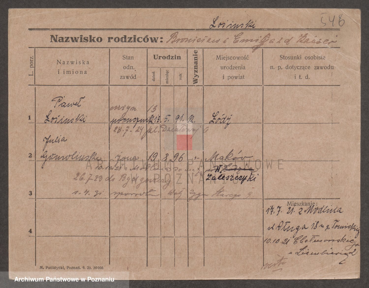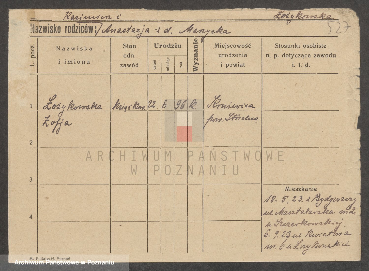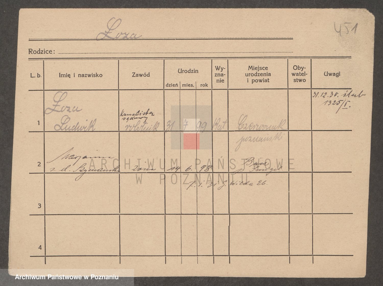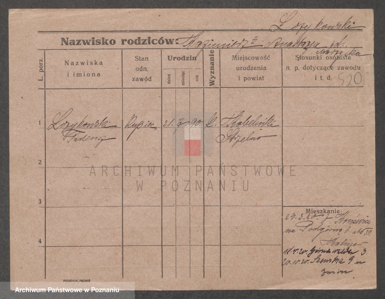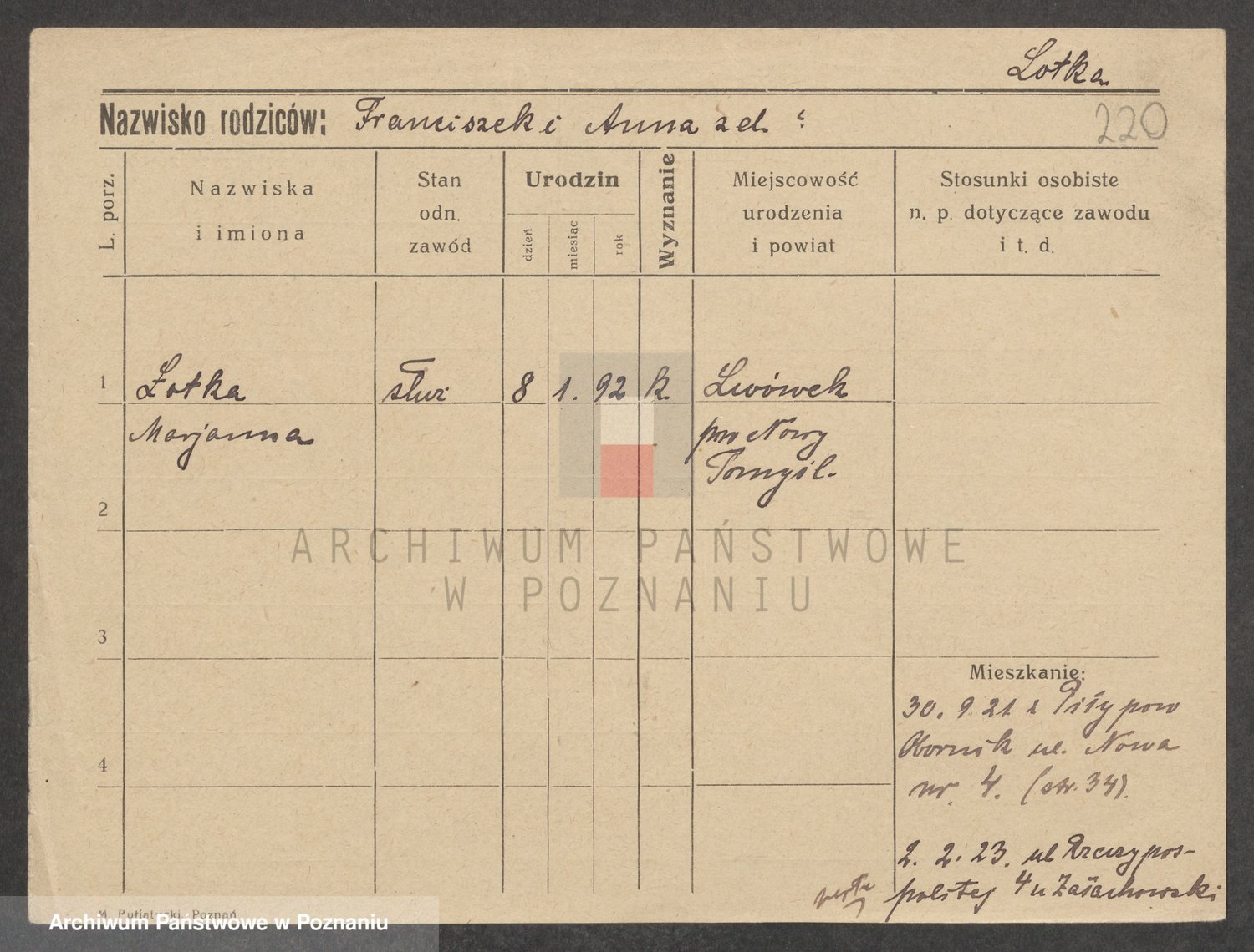 Podgląd karty osobowej dostępny jest po kliknięciu na nazwisko lub ikonkę karty. Można dokonywać powiększenia (ikony na górze) lub przechodzić między kolejnymi skanami (strzałki po bokach).