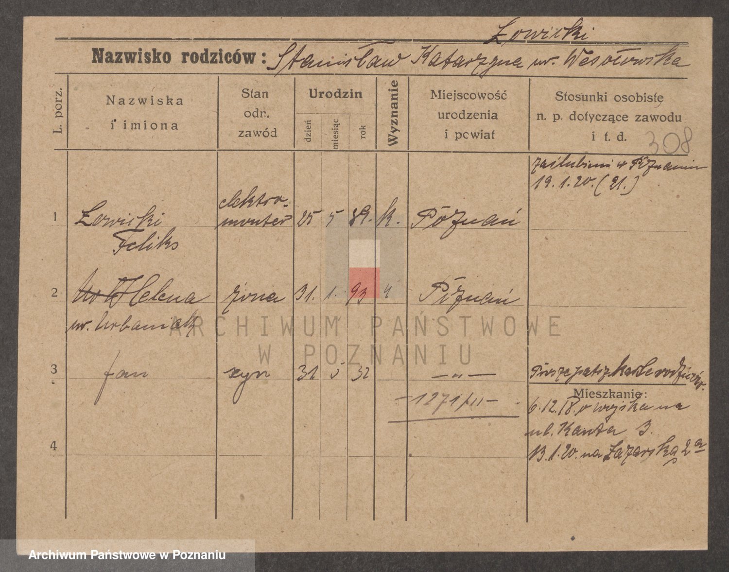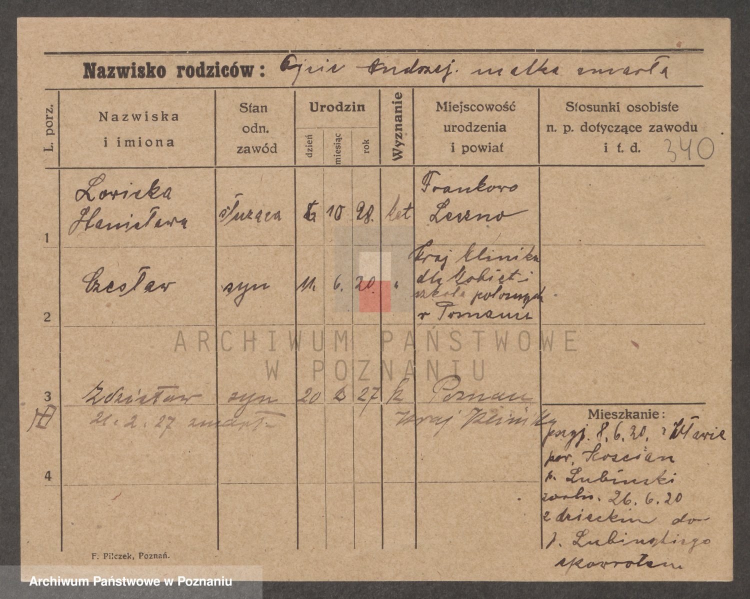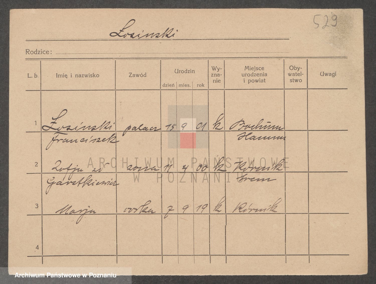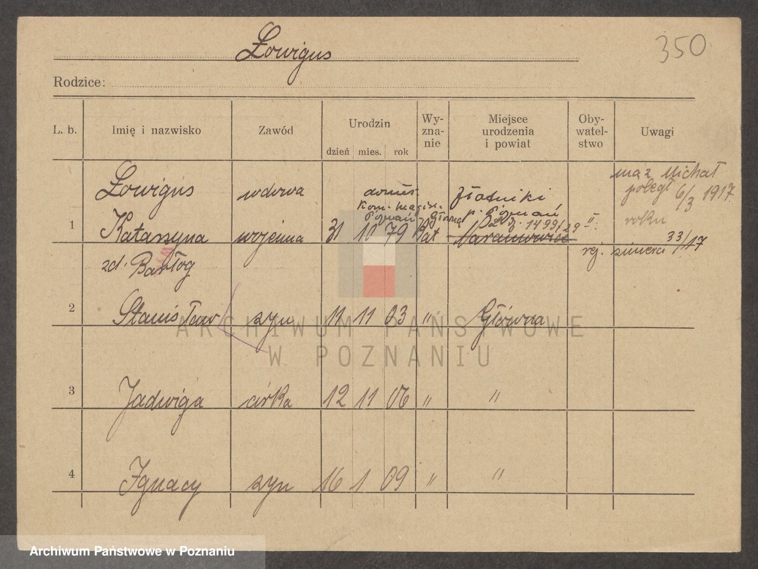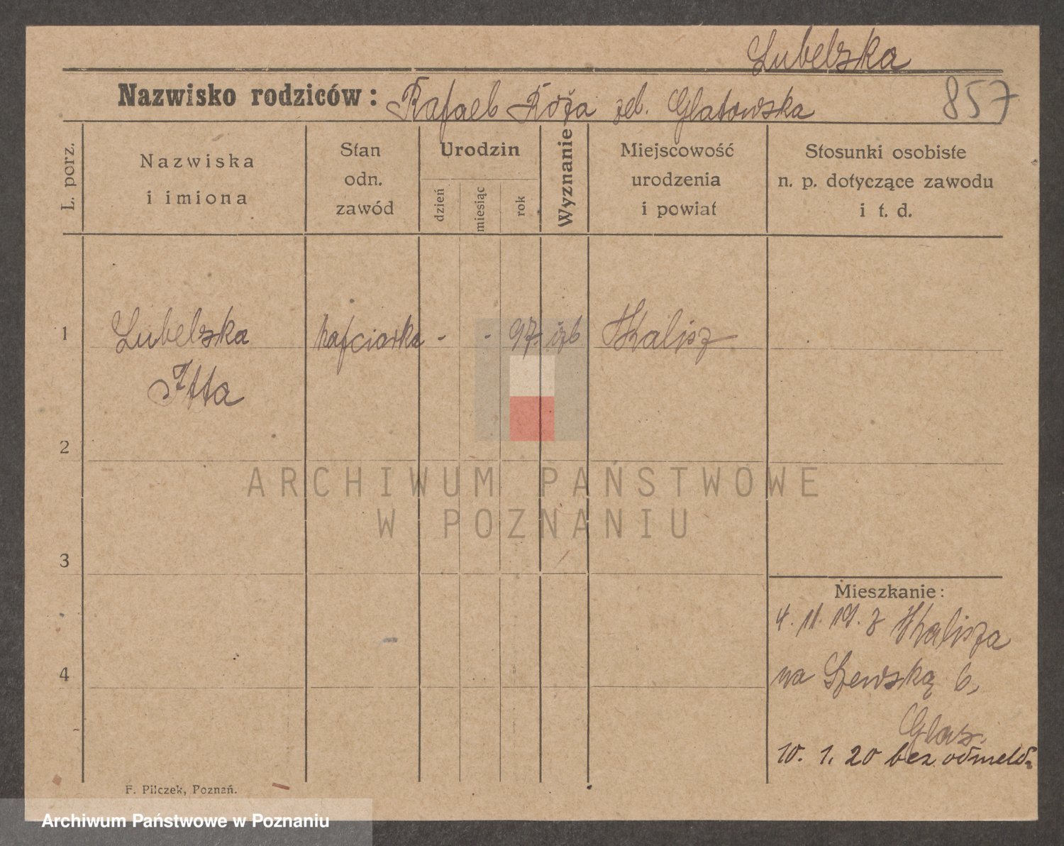Podgląd karty osobowej dostępny jest po kliknięciu na nazwisko lub ikonkę karty. Można dokonywać powiększenia (ikony na górze) lub przechodzić między kolejnymi skanami (strzałki po bokach).