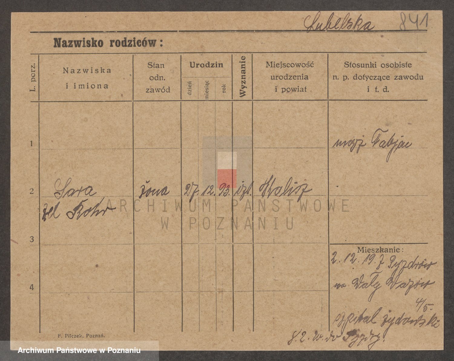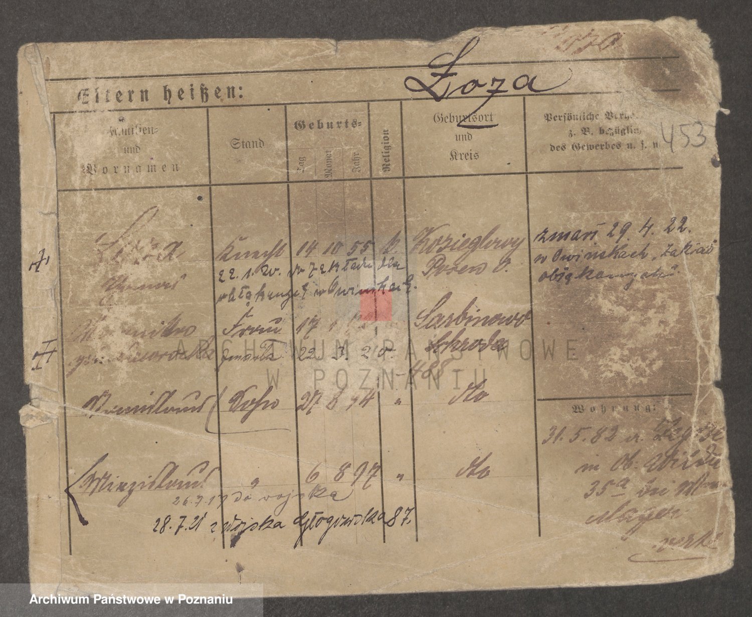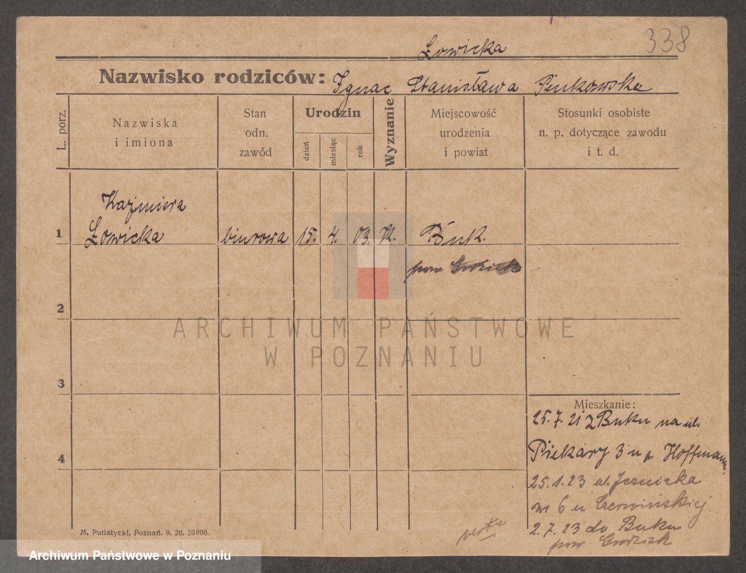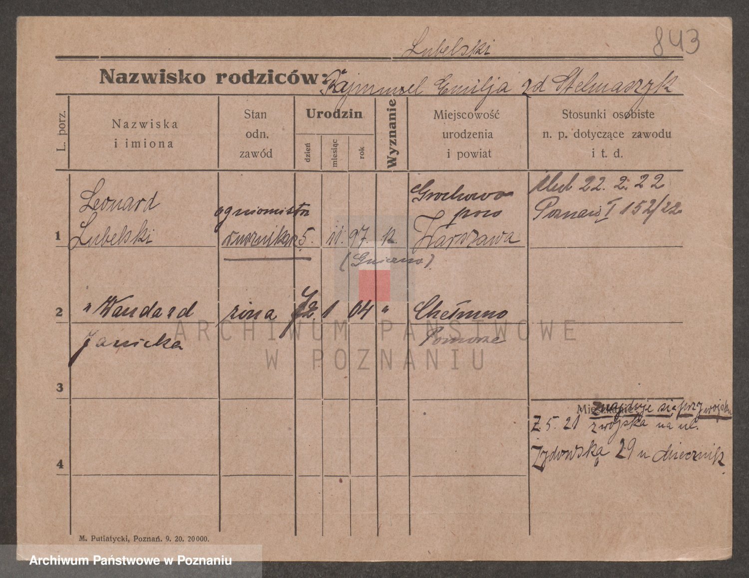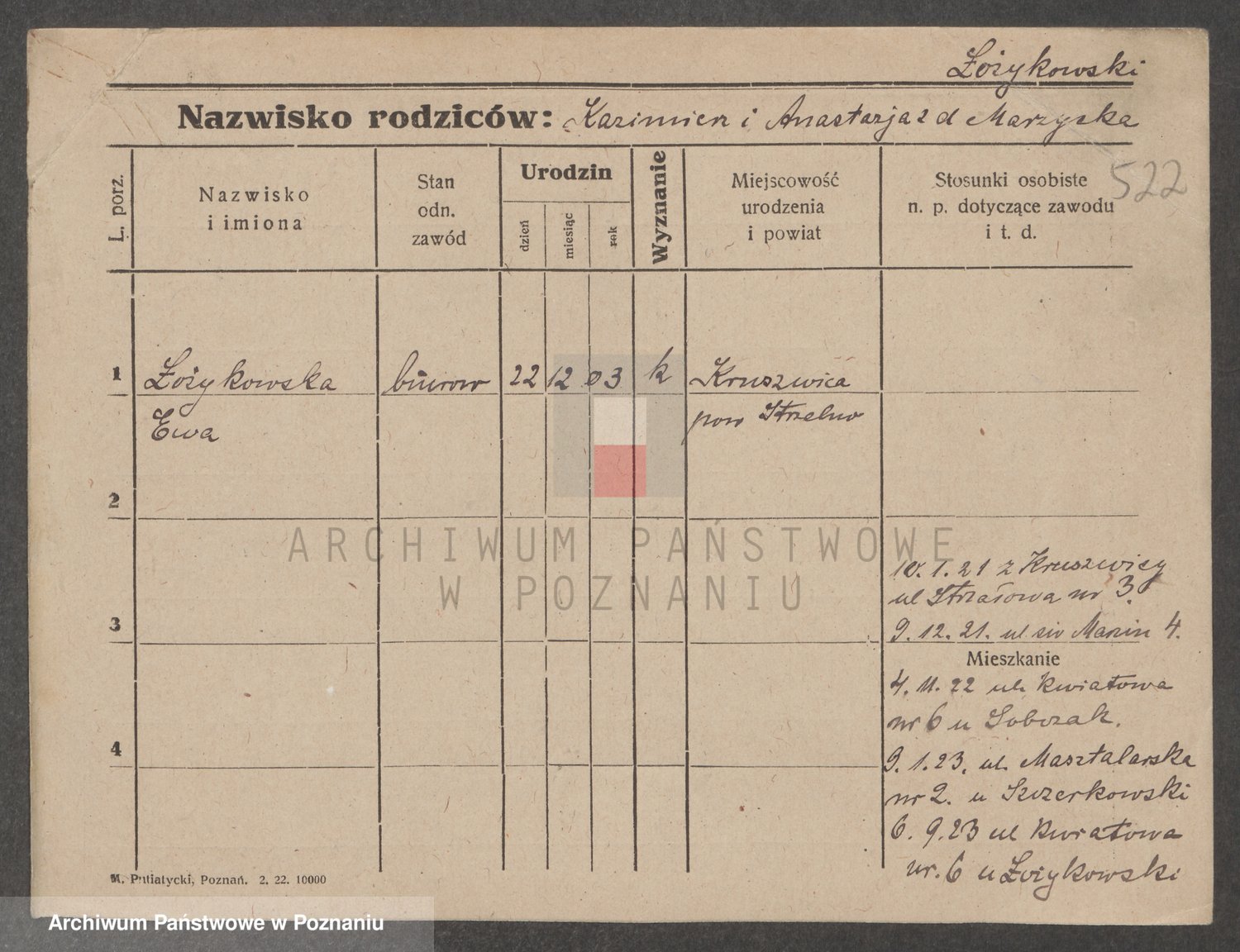 Podgląd karty osobowej dostępny jest po kliknięciu na nazwisko lub ikonkę karty. Można dokonywać powiększenia (ikony na górze) lub przechodzić między kolejnymi skanami (strzałki po bokach).