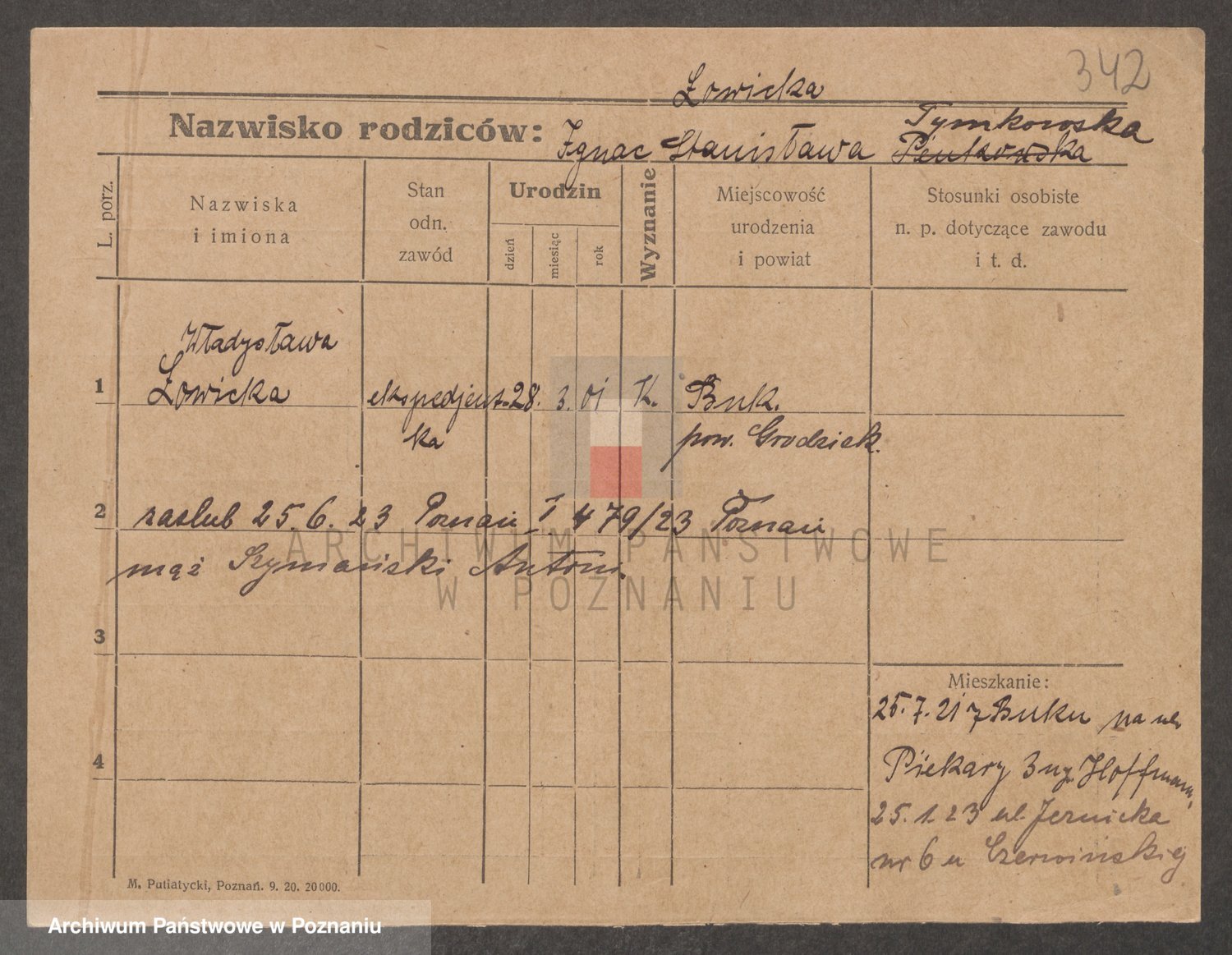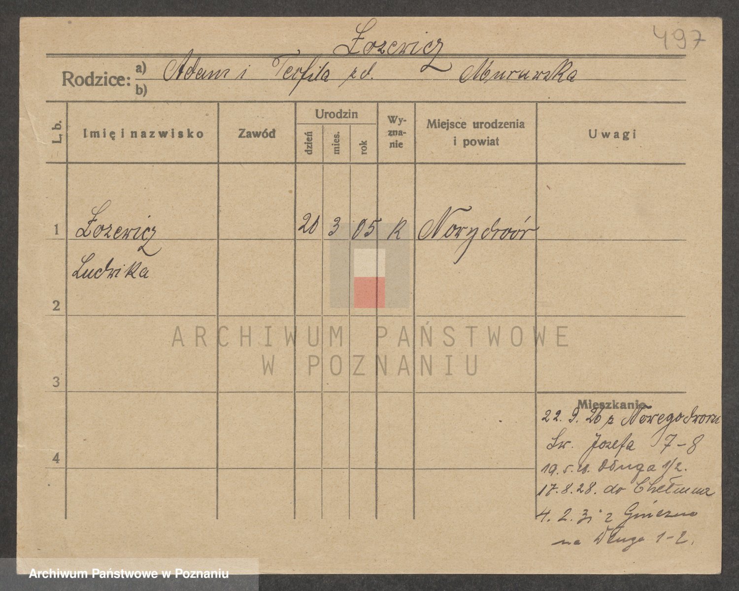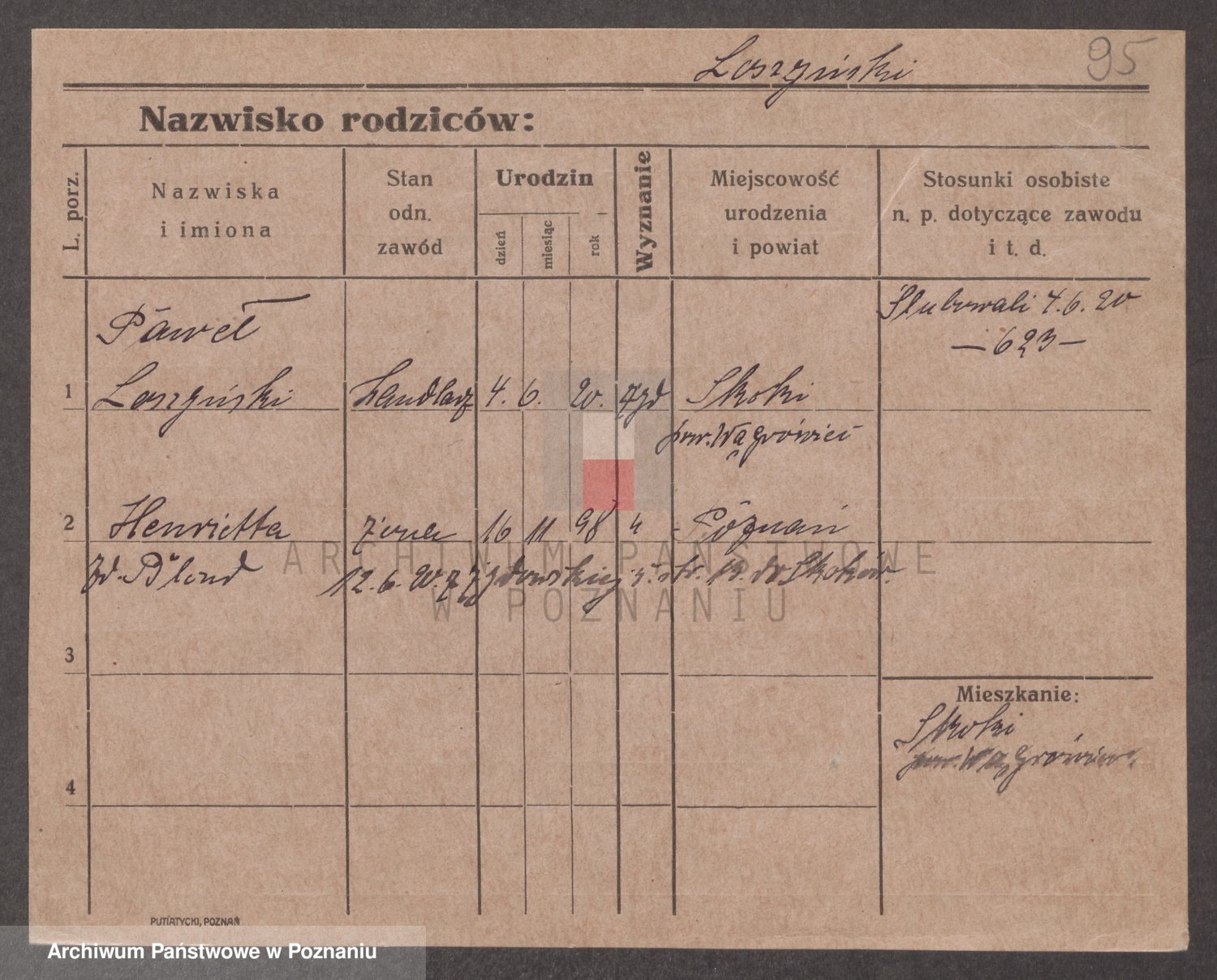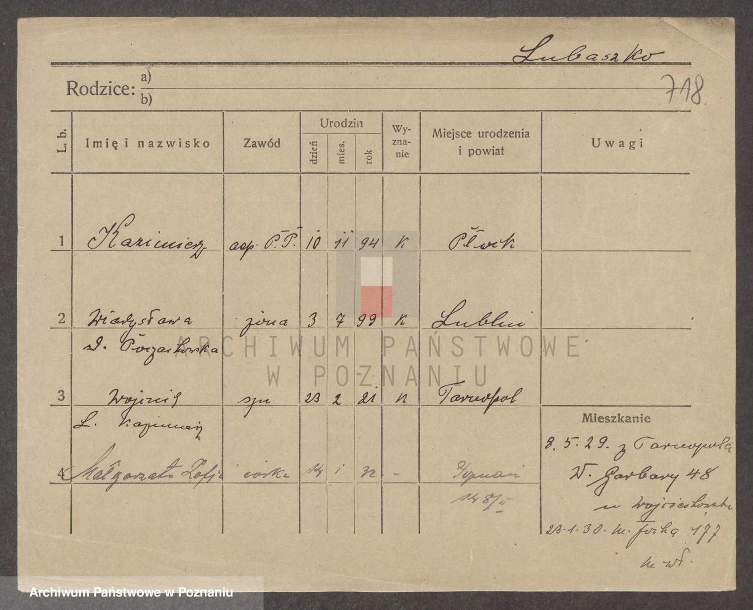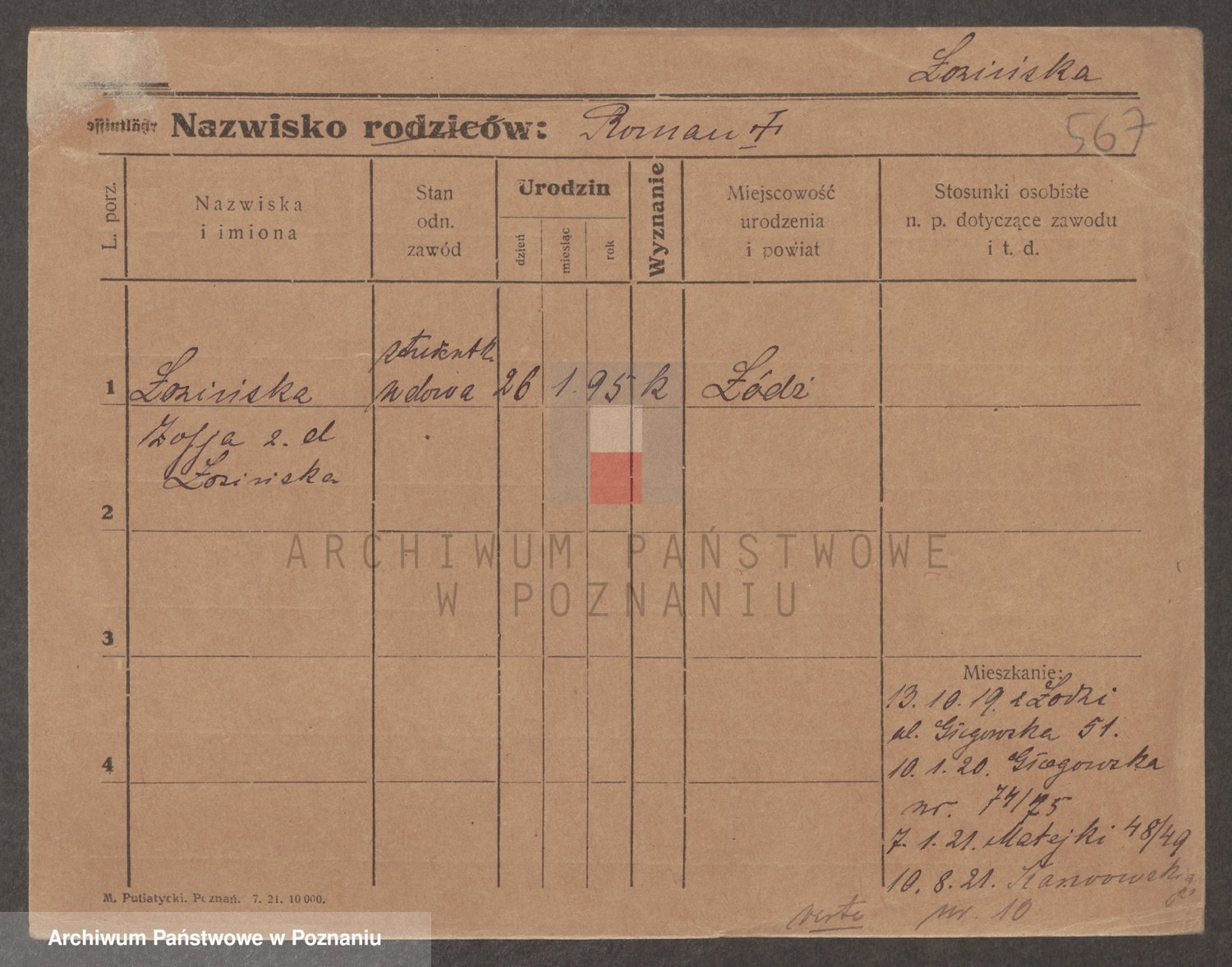 Podgląd karty osobowej dostępny jest po kliknięciu na nazwisko lub ikonkę karty. Można dokonywać powiększenia (ikony na górze) lub przechodzić między kolejnymi skanami (strzałki po bokach).
