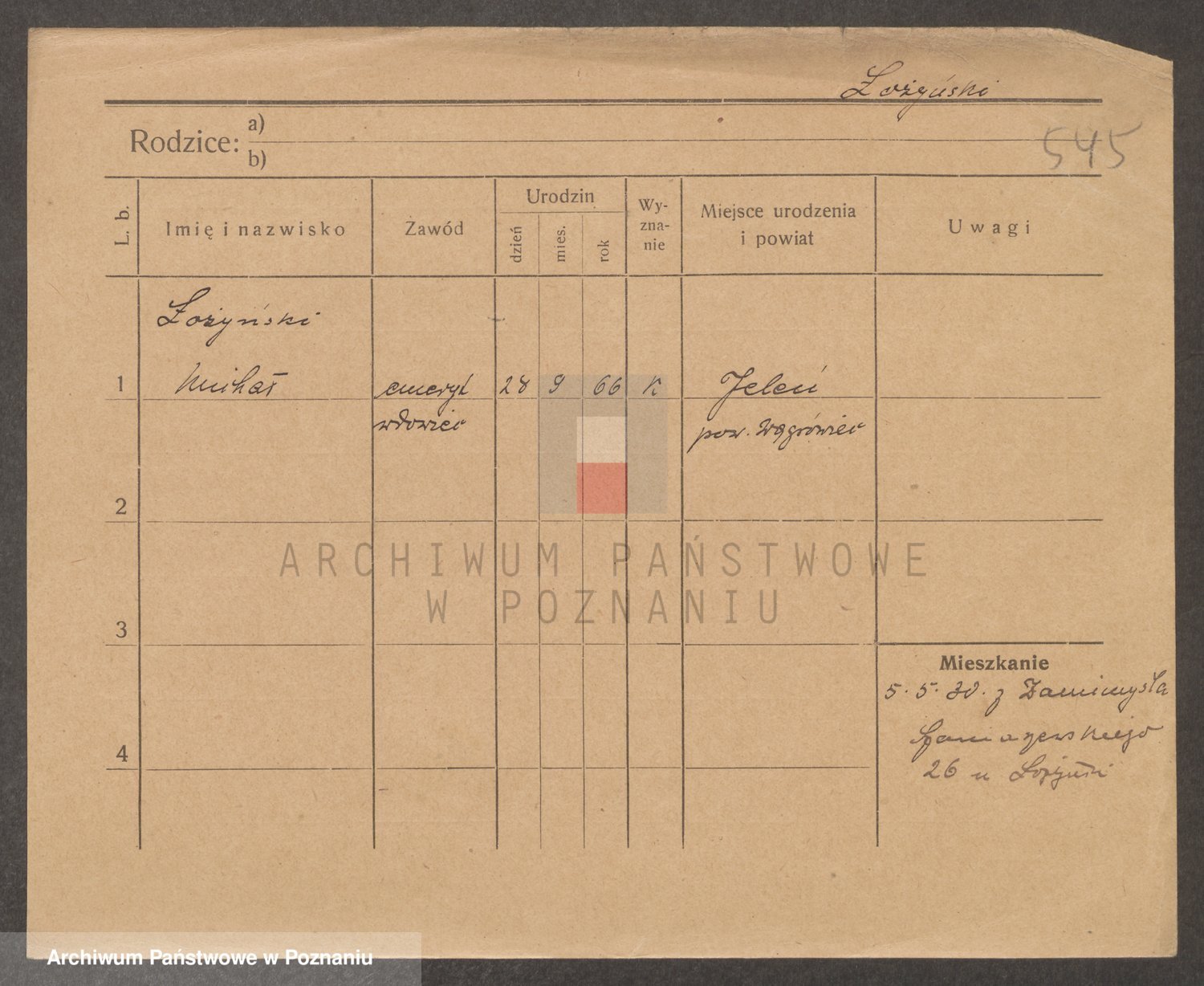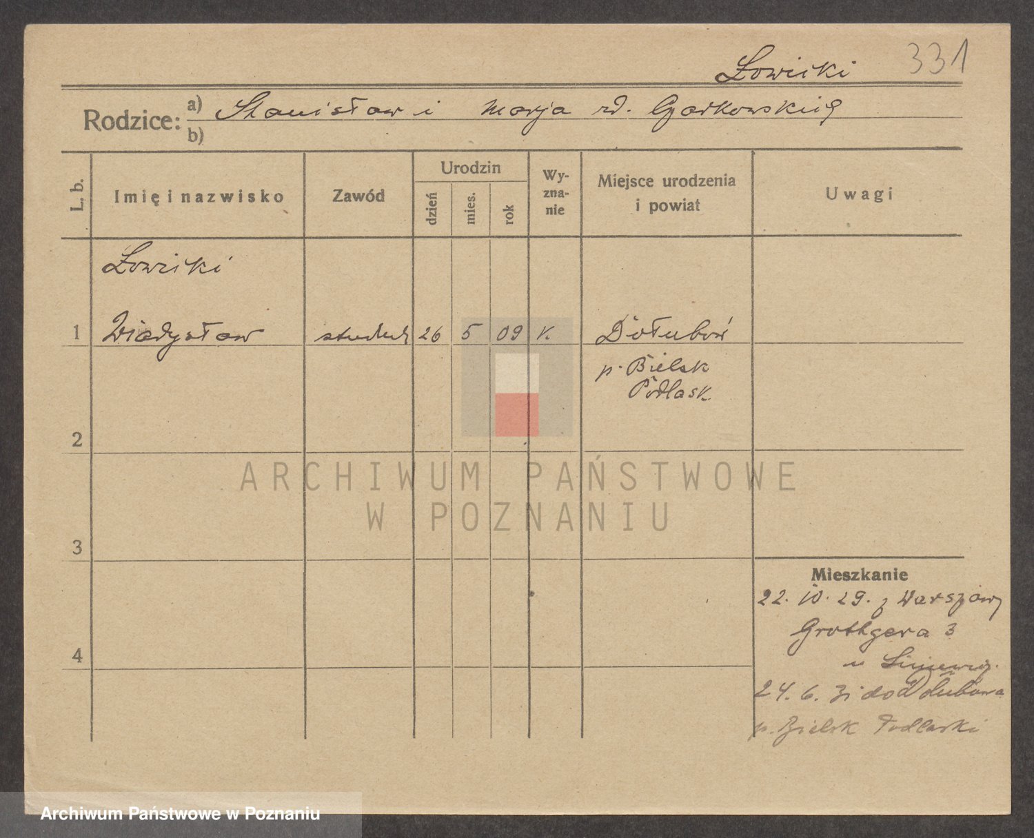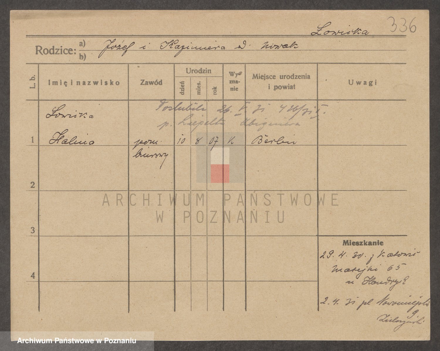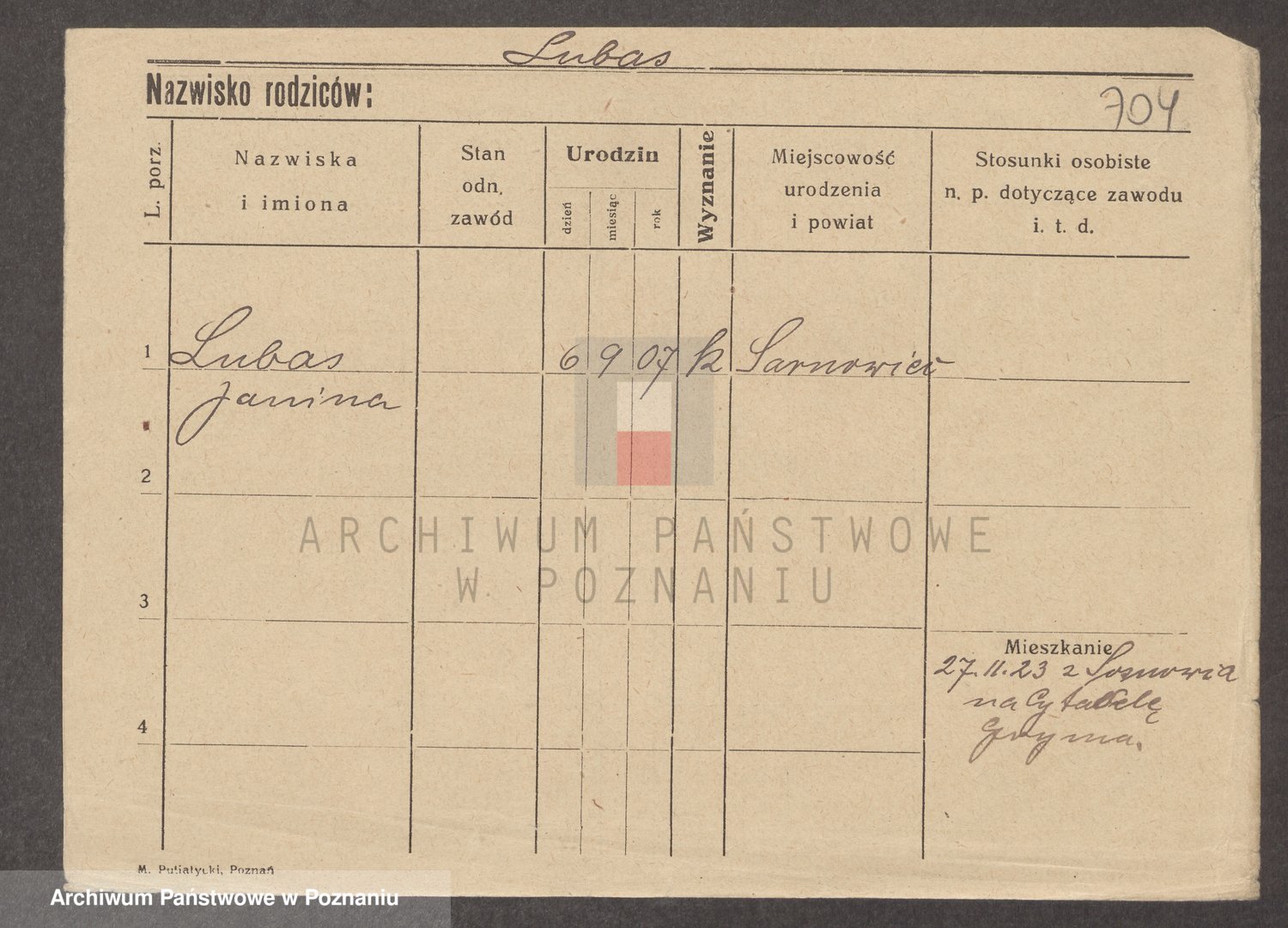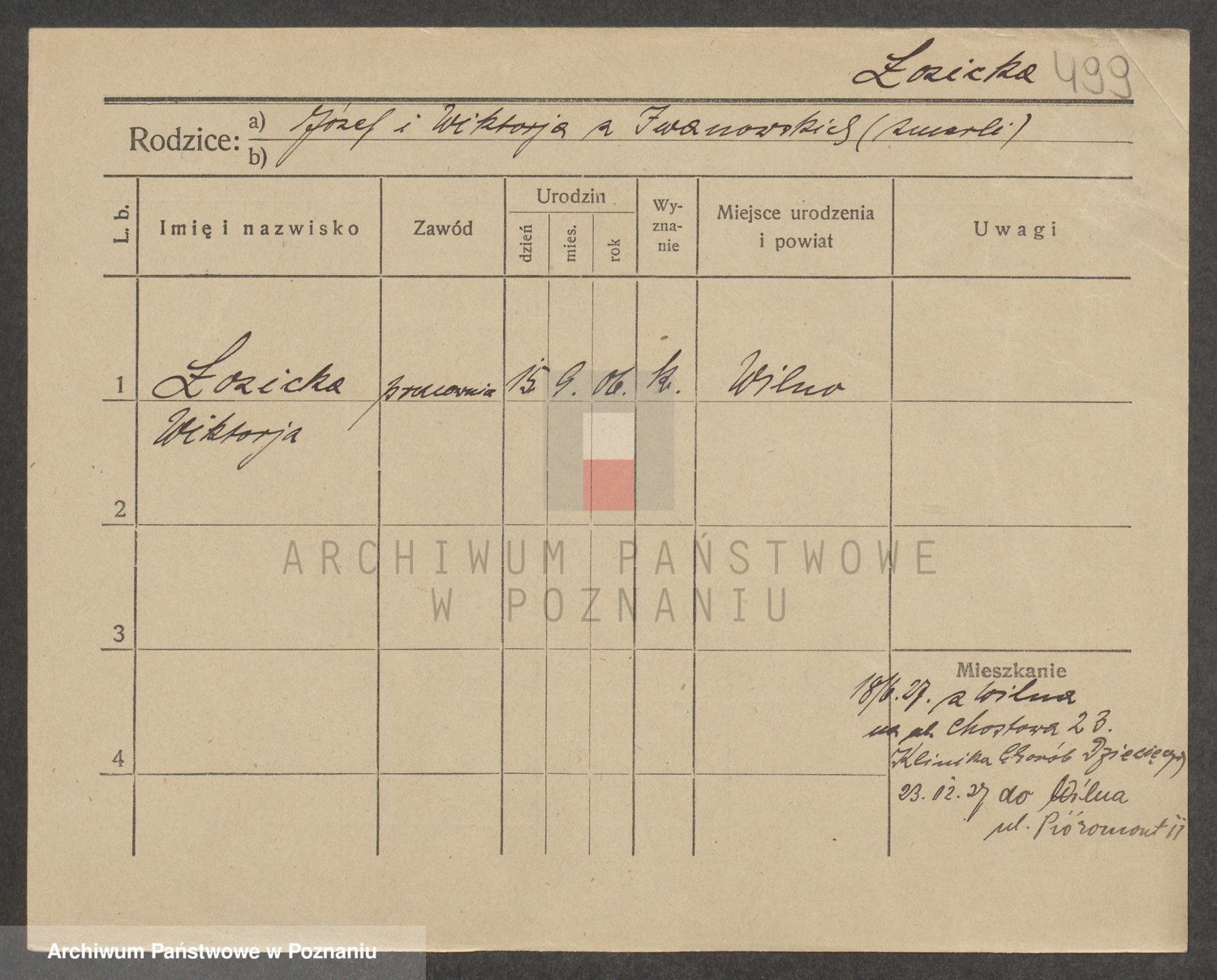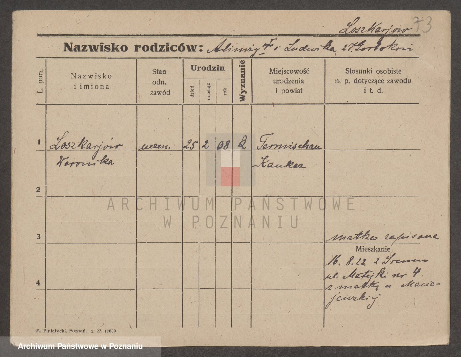 Podgląd karty osobowej dostępny jest po kliknięciu na nazwisko lub ikonkę karty. Można dokonywać powiększenia (ikony na górze) lub przechodzić między kolejnymi skanami (strzałki po bokach).